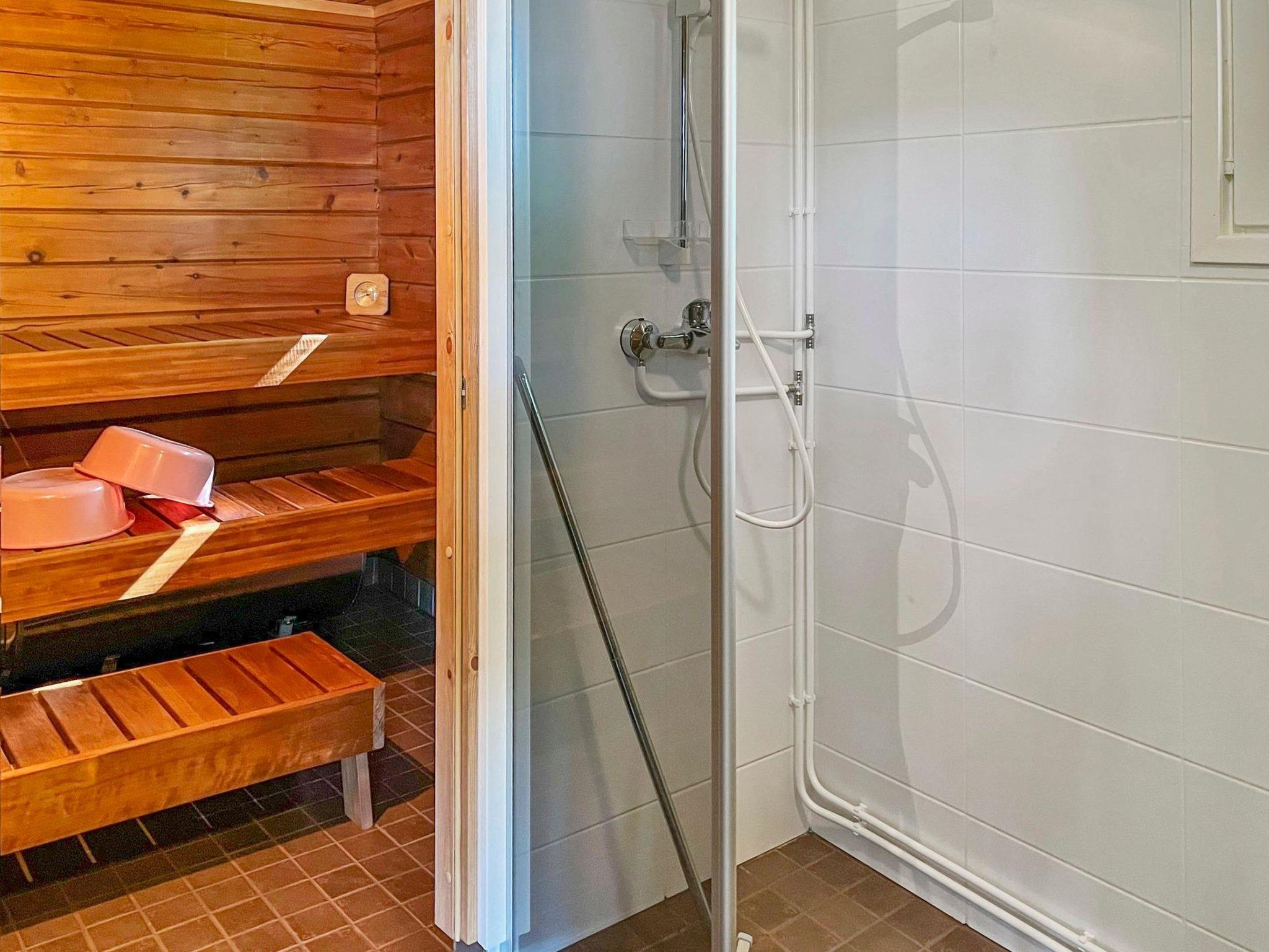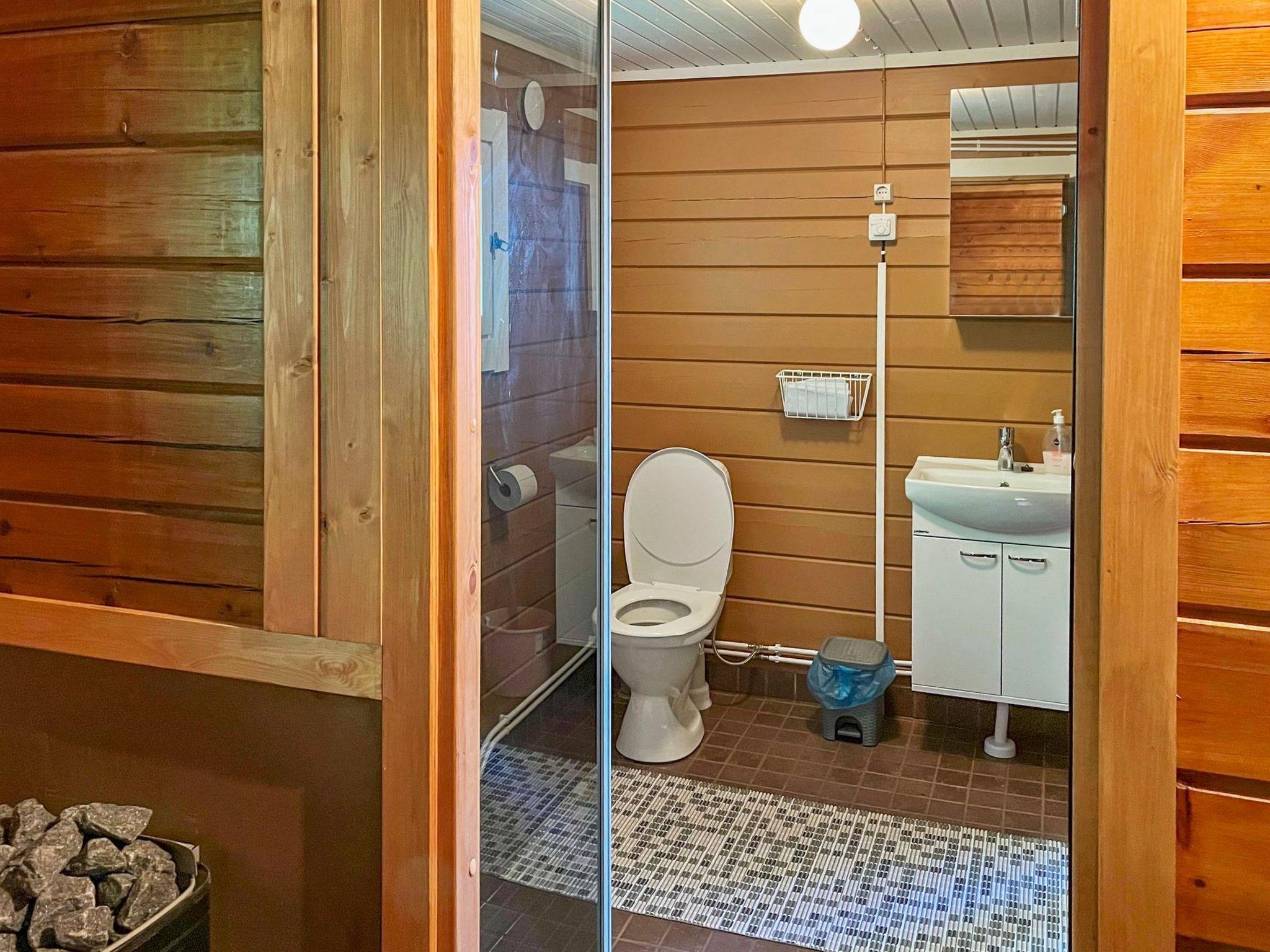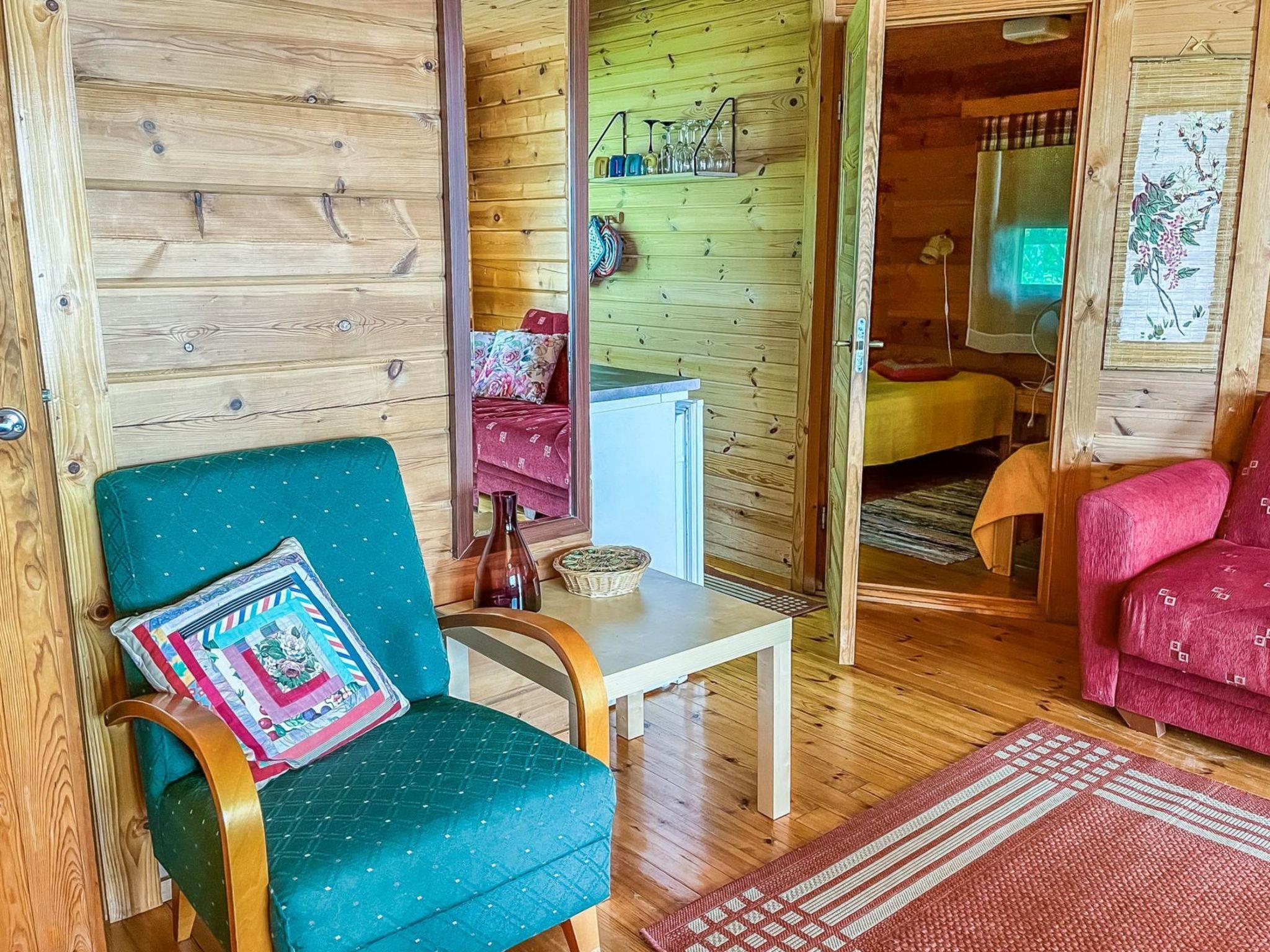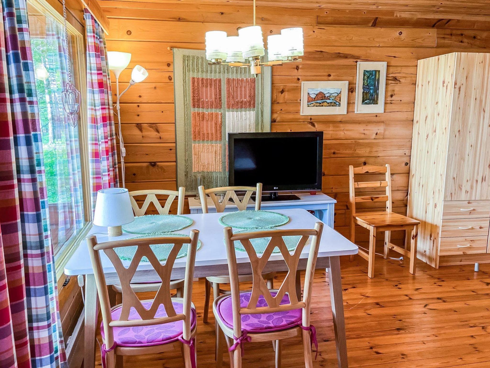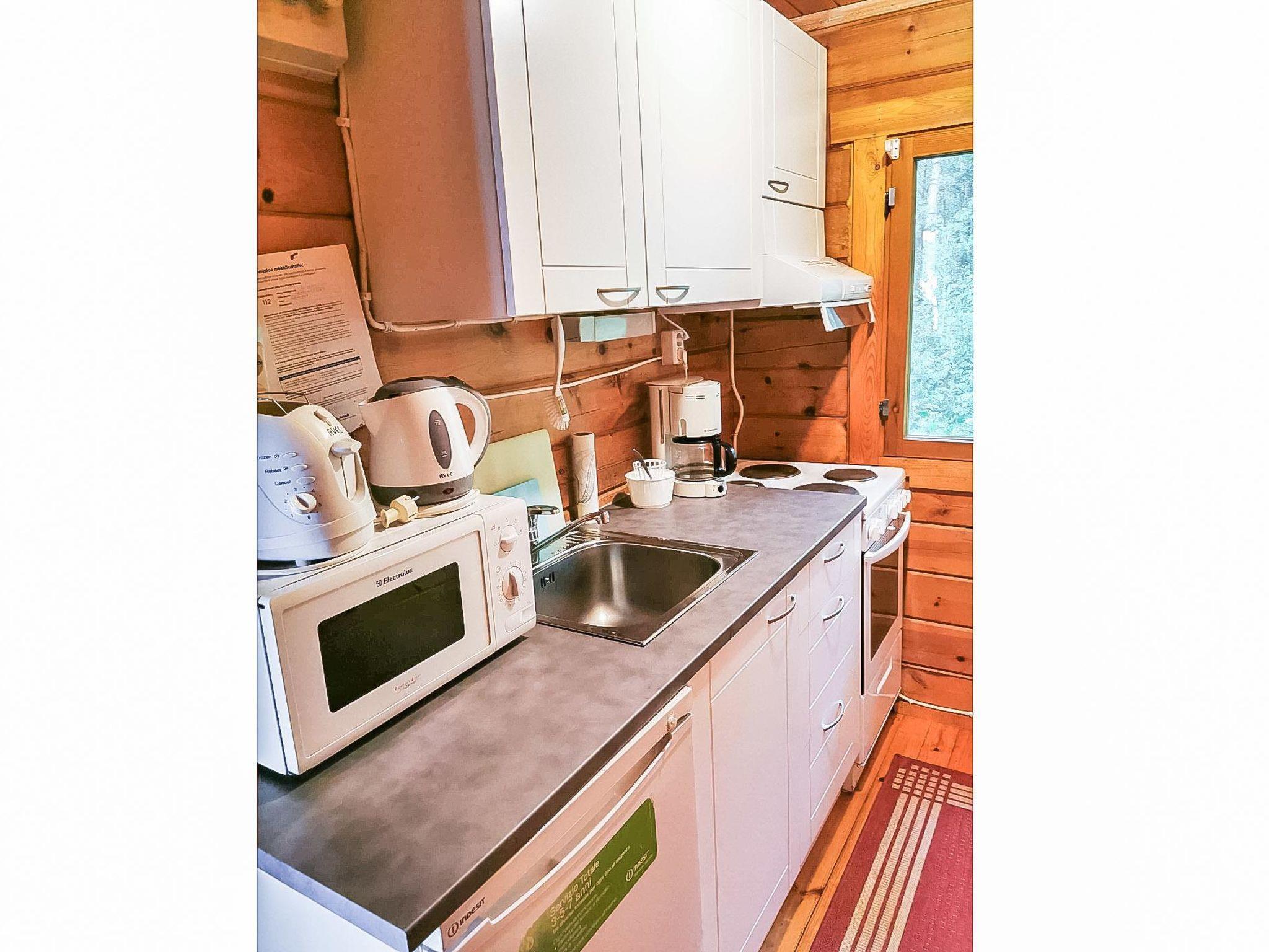 Log cabin 1983, kitchenette (renovated 2021), 2 bedrooms with 2 beds in each, living room with 1 bed, washroom, sauna (electric sauna stove), open veranda. Sauna and washroom renovated 2022.