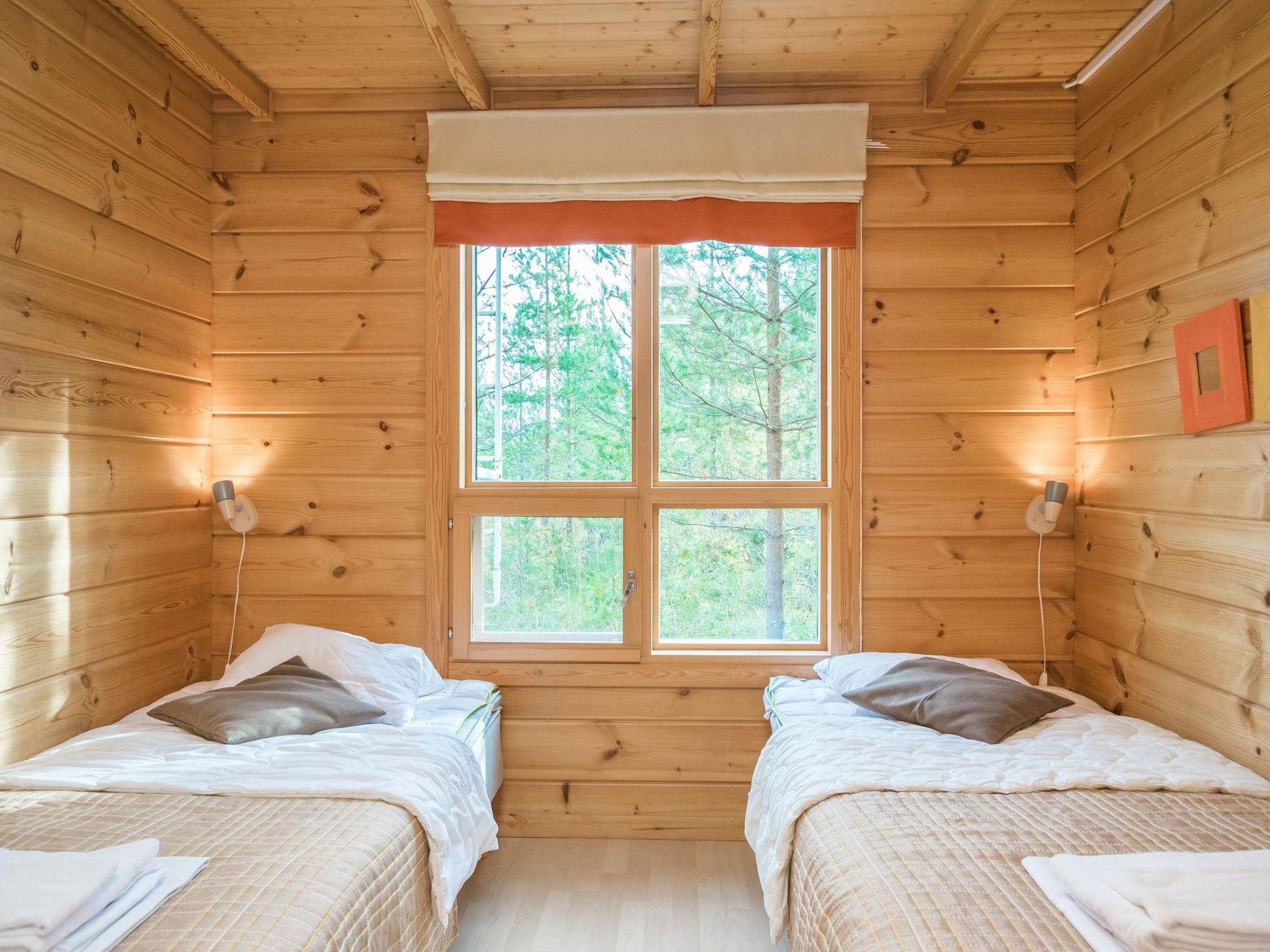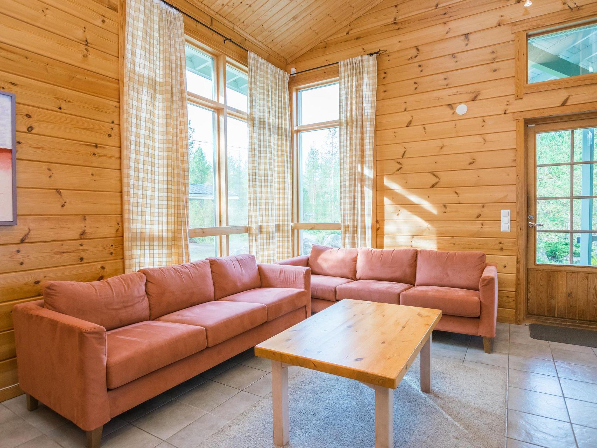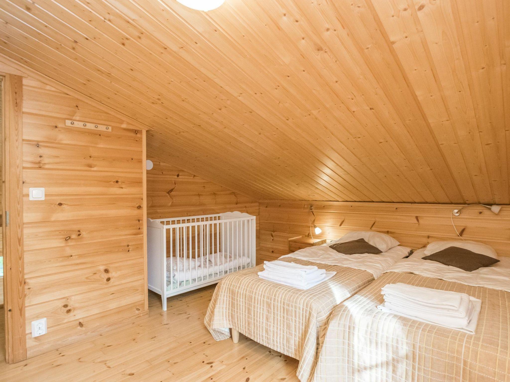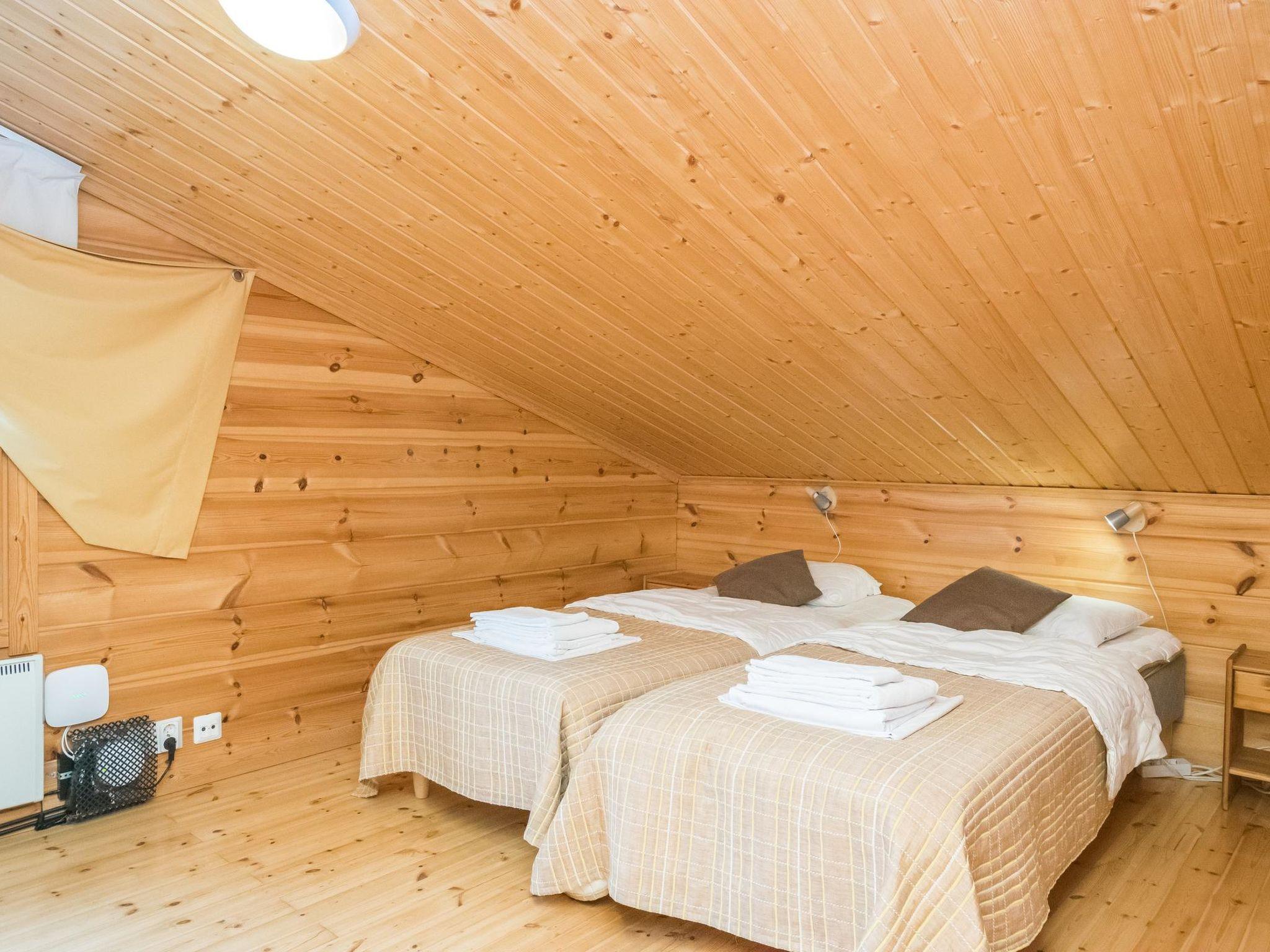 Log chalet 2003, living room/kitchen. Downstairs 2 bedrooms with 2 beds in each, WC. Upstairs 2 bedrooms with 2 beds in each, WC. Separate sauna area with the dressing room, washroom (2 showers), sauna (electric stove), WC. Entrance to sauna department through porch.