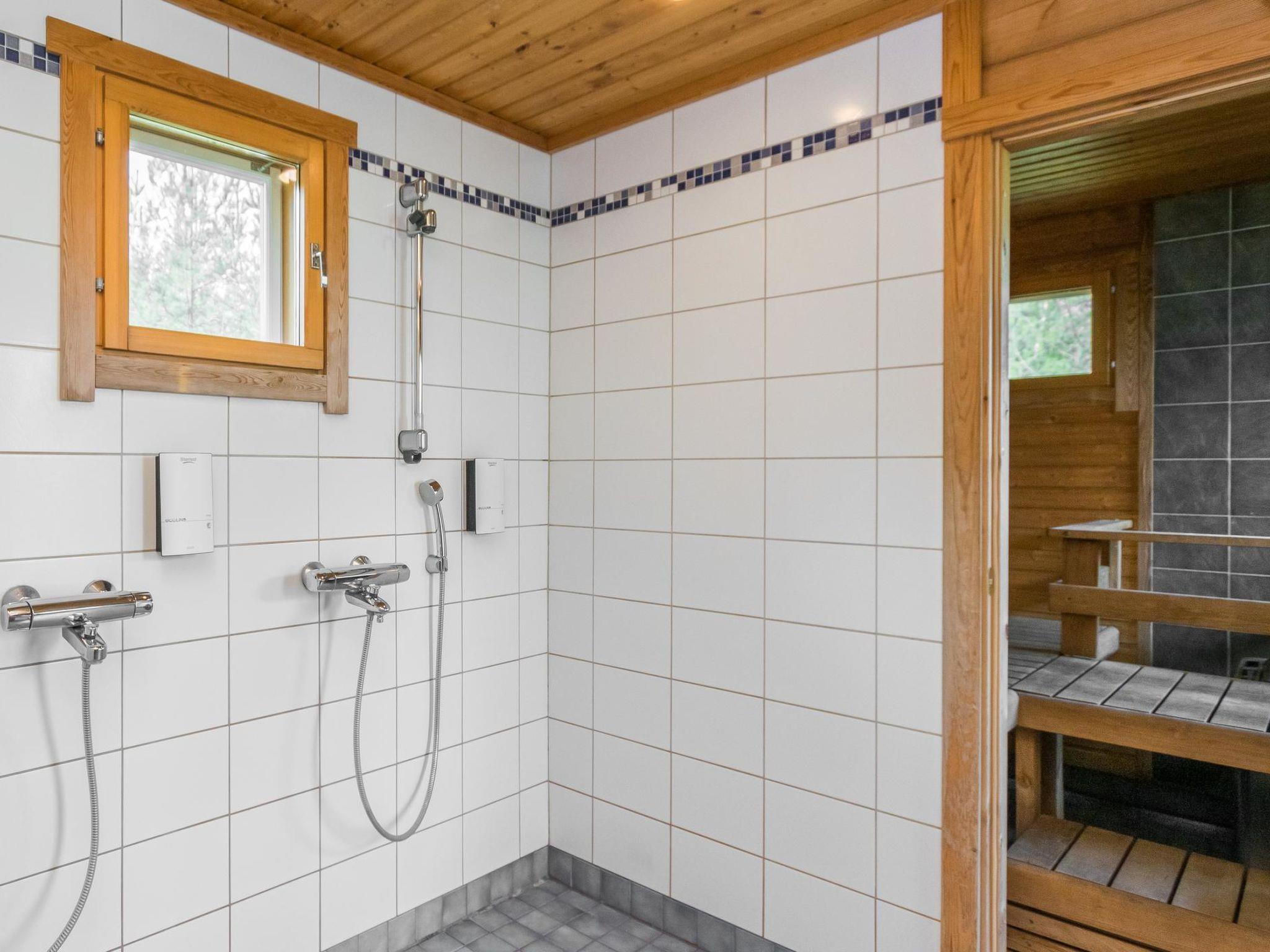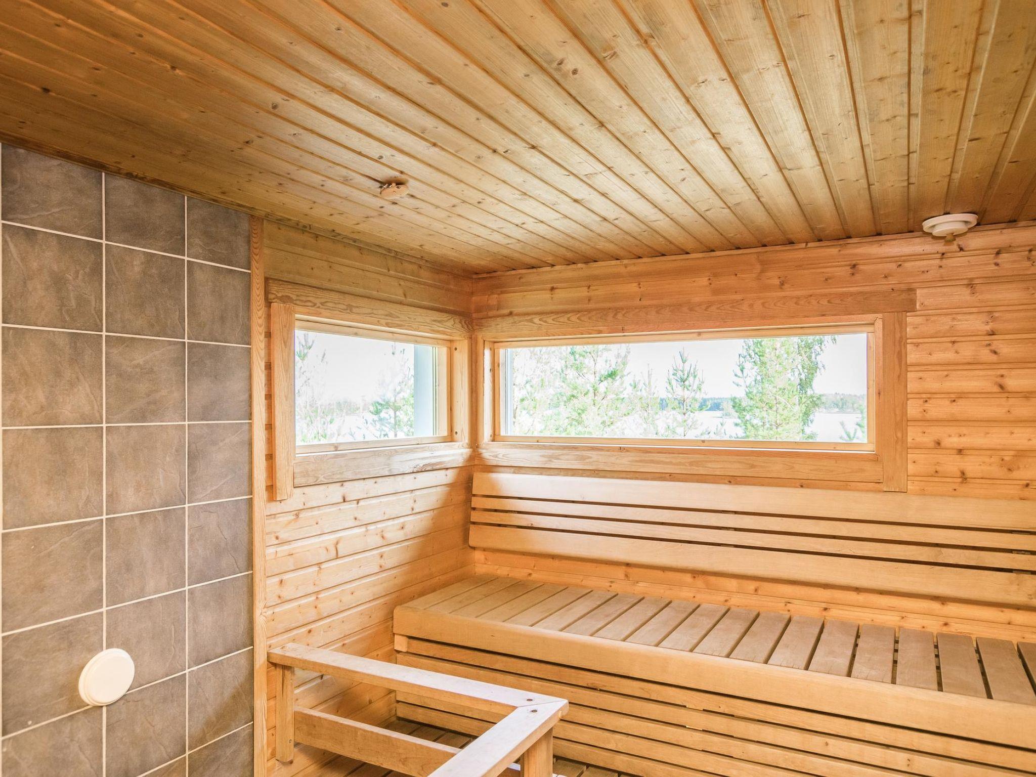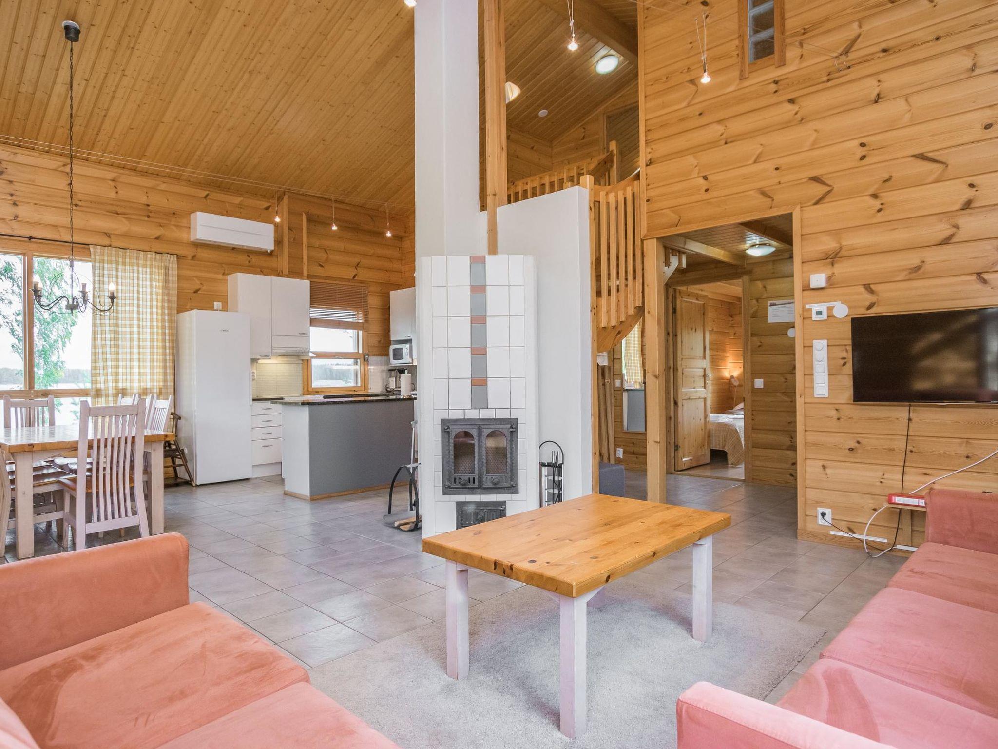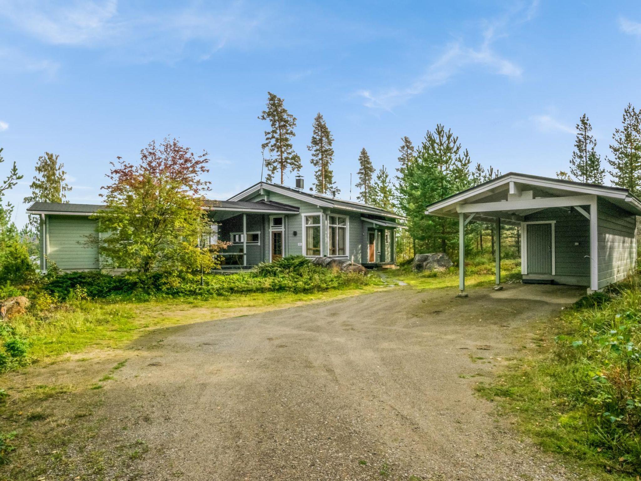 Log chalet 2003, living room/kitchen. Downstairs 2 bedrooms with 2 beds in each, WC. Upstairs 2 bedrooms with 2 beds in each, WC. Separate sauna area with the dressing room, washroom (2 showers), sauna (electric stove), WC. Entrance to sauna department through porch.