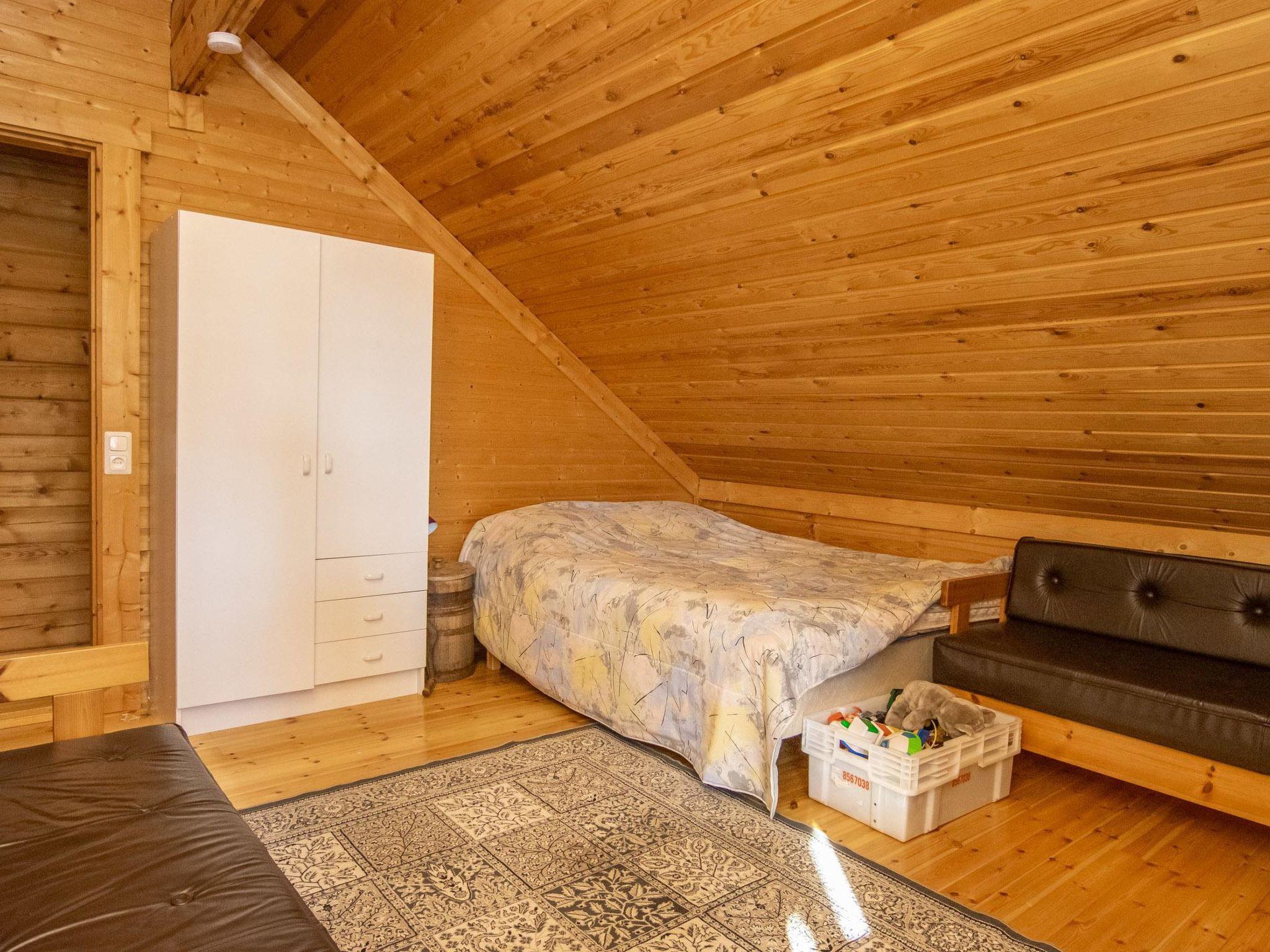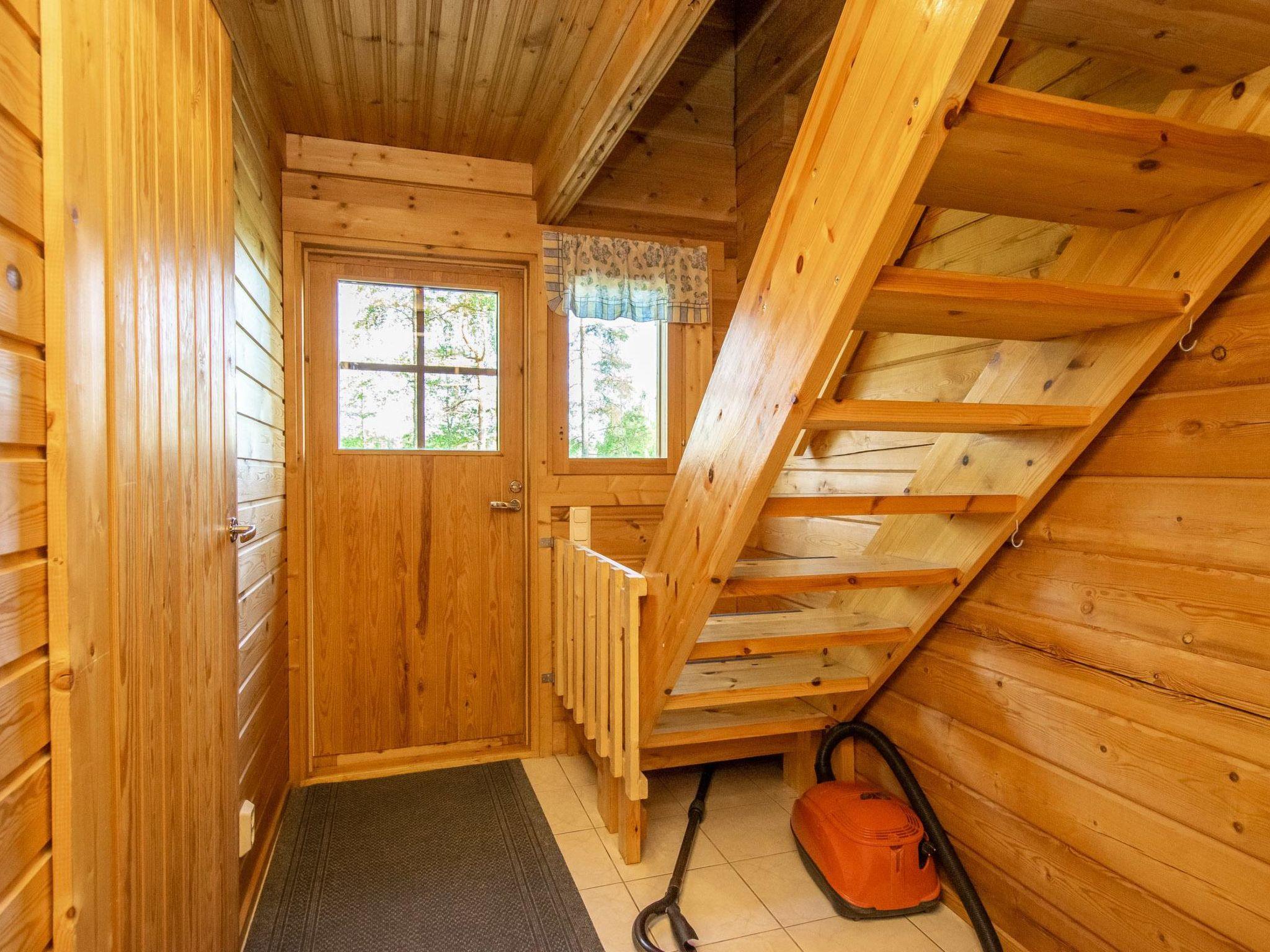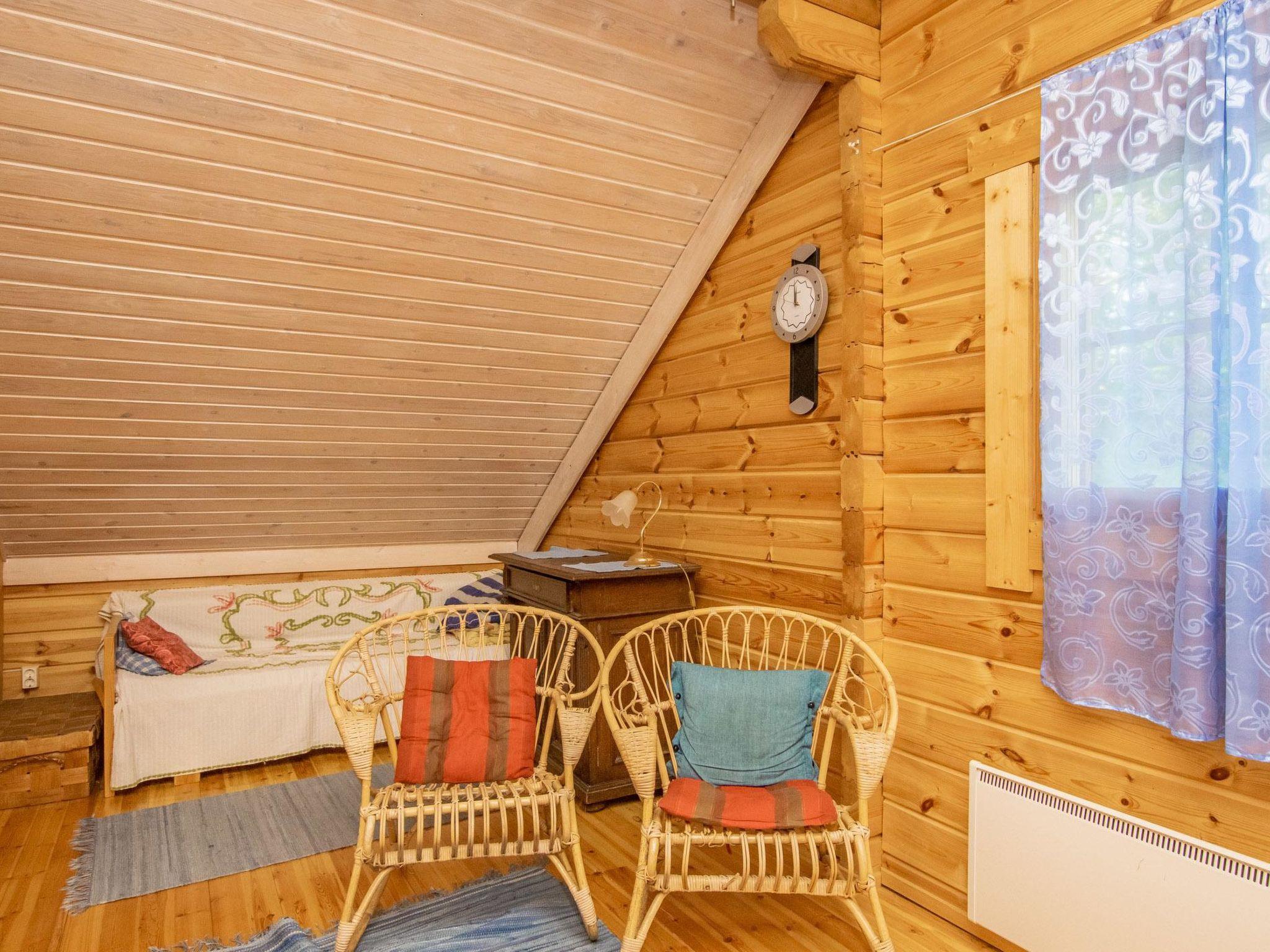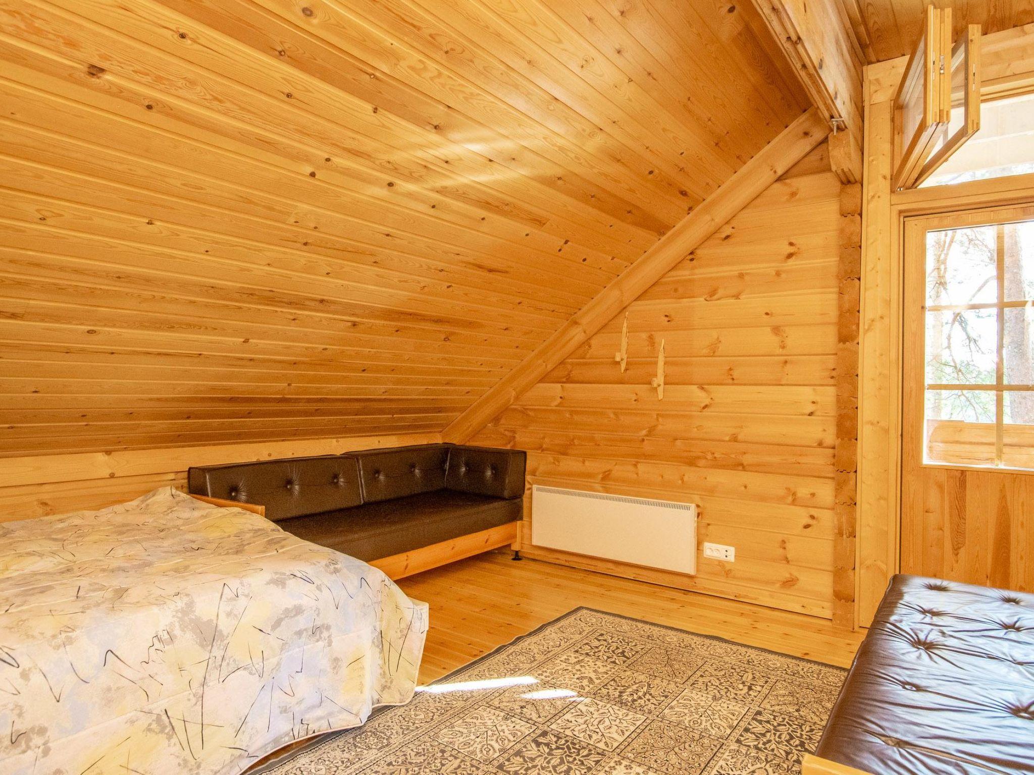 Log cabin 1994, living room/kitchen (30 m²), bedroom (7 m²) double bed, washroom, sauna (wood-burning sauna stove), separate WC. On the upper floor bedroom (12 m²) with double bed and two sofas, another bedroom (14 m²) with double bed and travel bed, third bedroom (20 m²) with two beds and spreadable bed (two extra beds) and balcony.