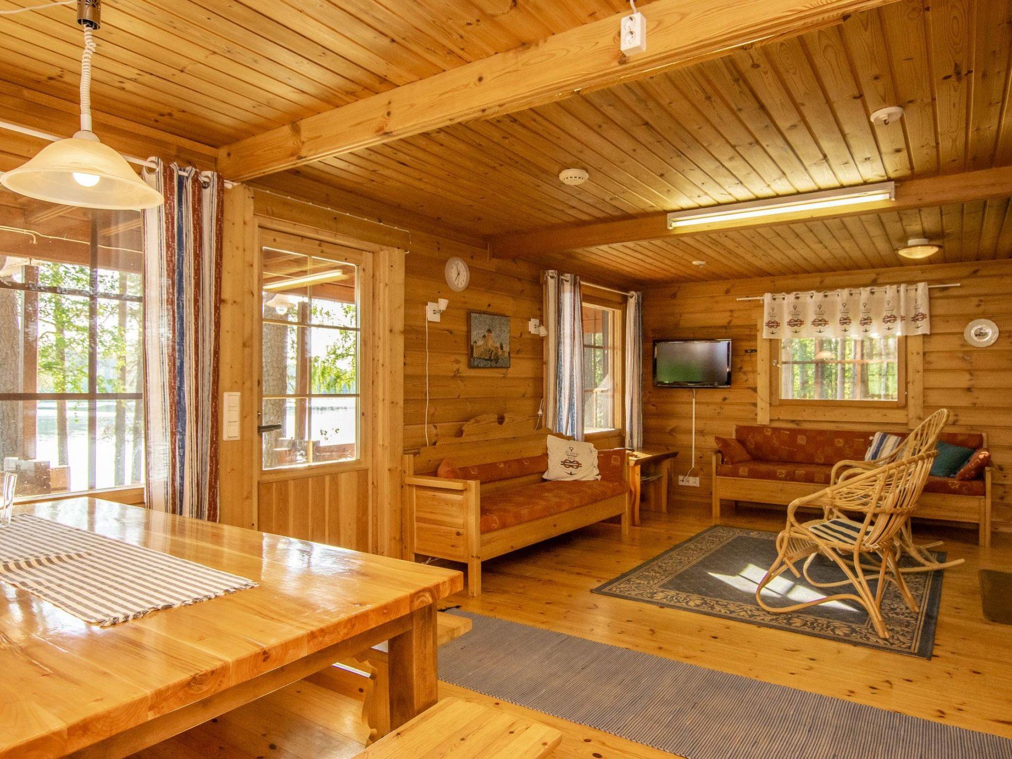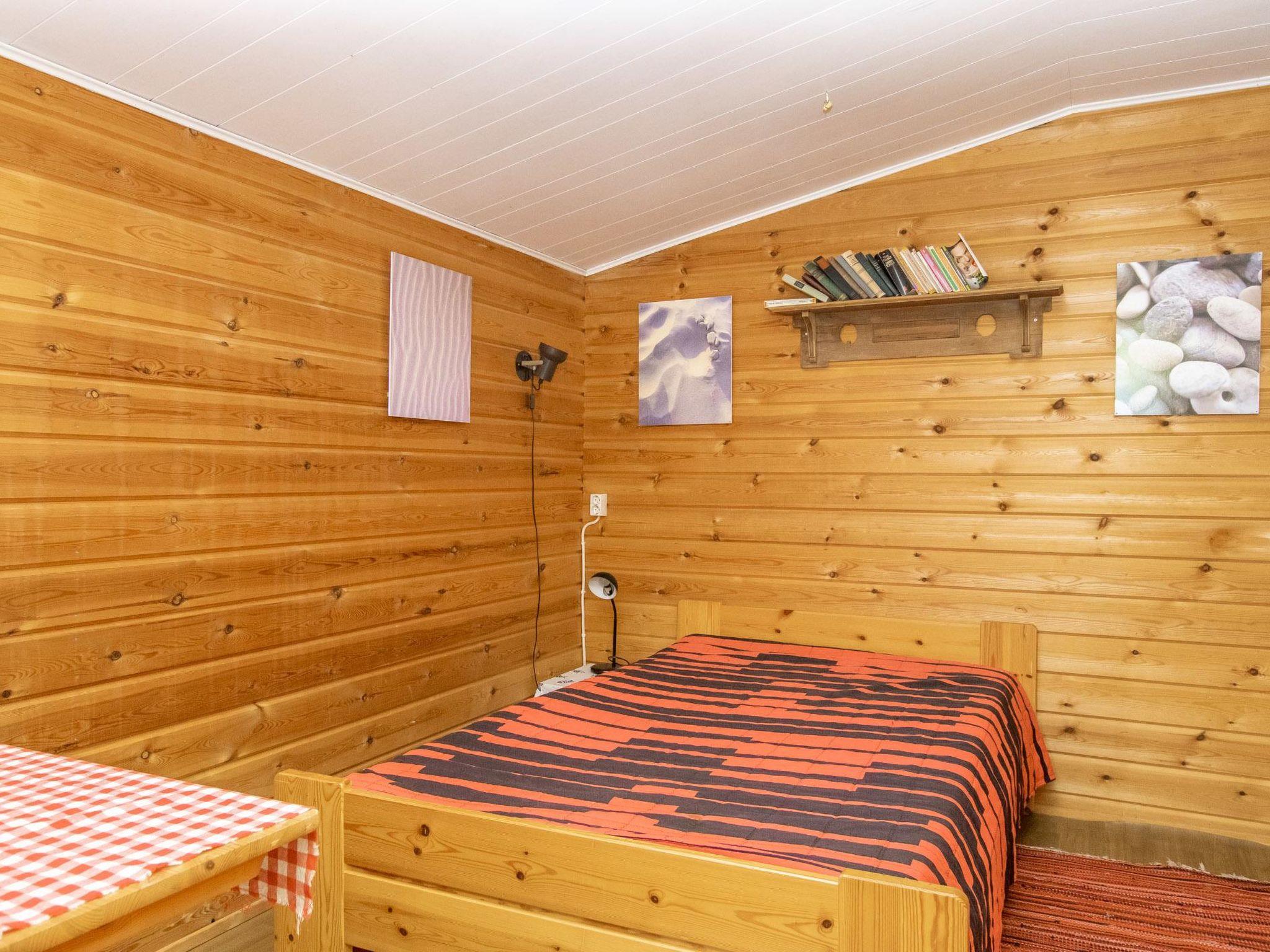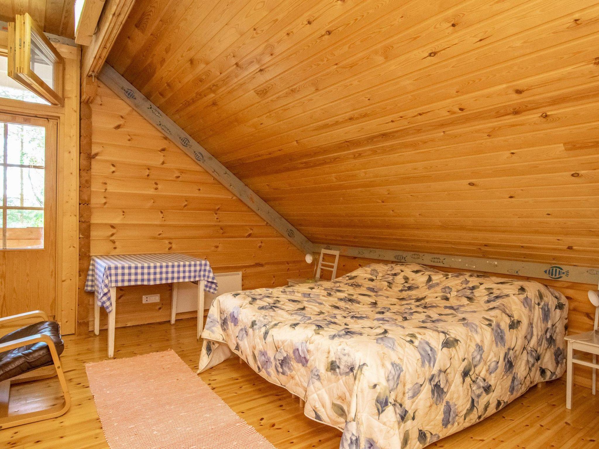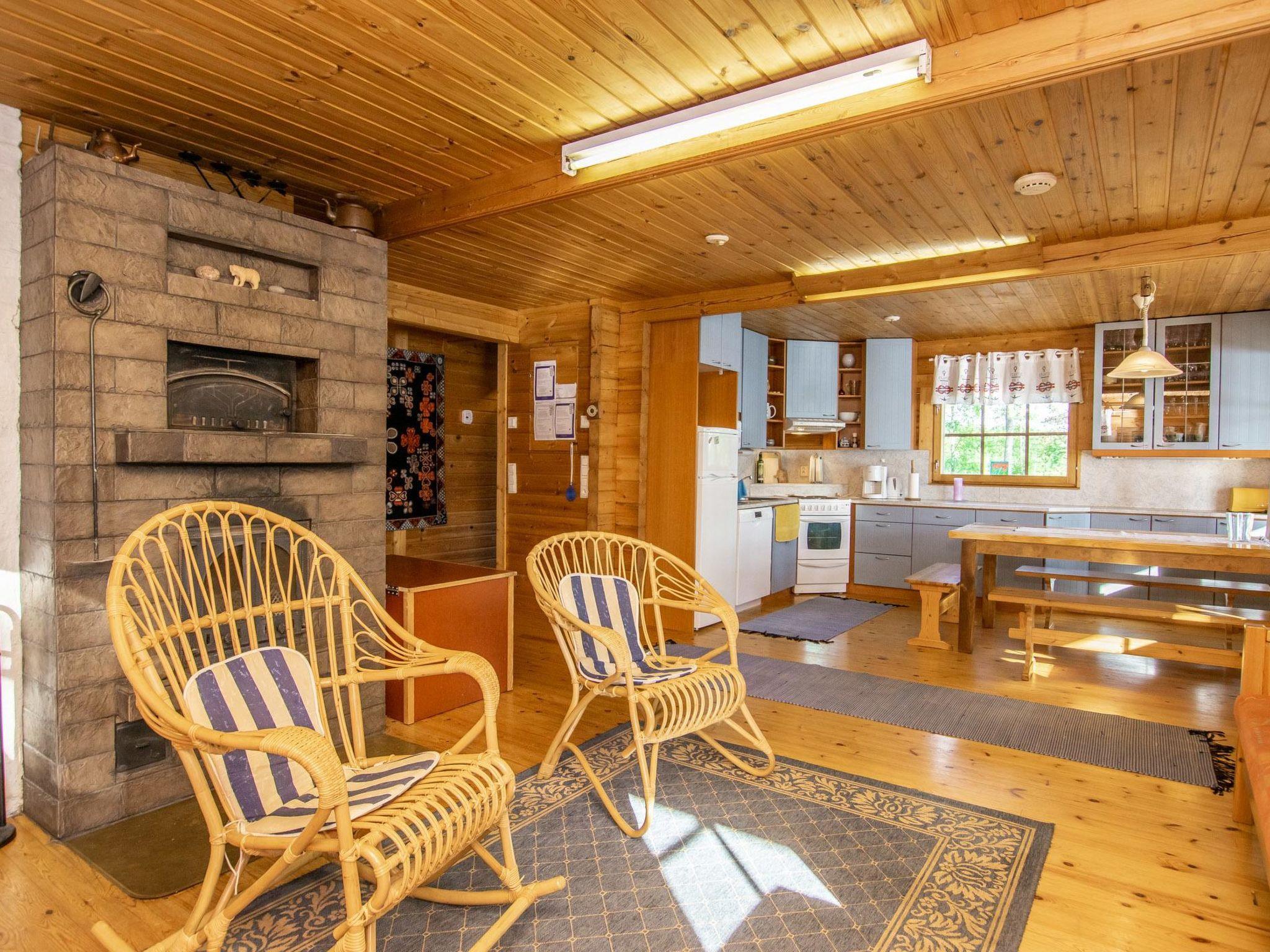 Log cabin 1994, living room/kitchen (30 m²), bedroom (7 m²) double bed, washroom, sauna (wood-burning sauna stove), separate WC. On the upper floor bedroom (12 m²) with double bed and two sofas, another bedroom (14 m²) with double bed and travel bed, third bedroom (20 m²) with two beds and spreadable bed (two extra beds) and balcony.
