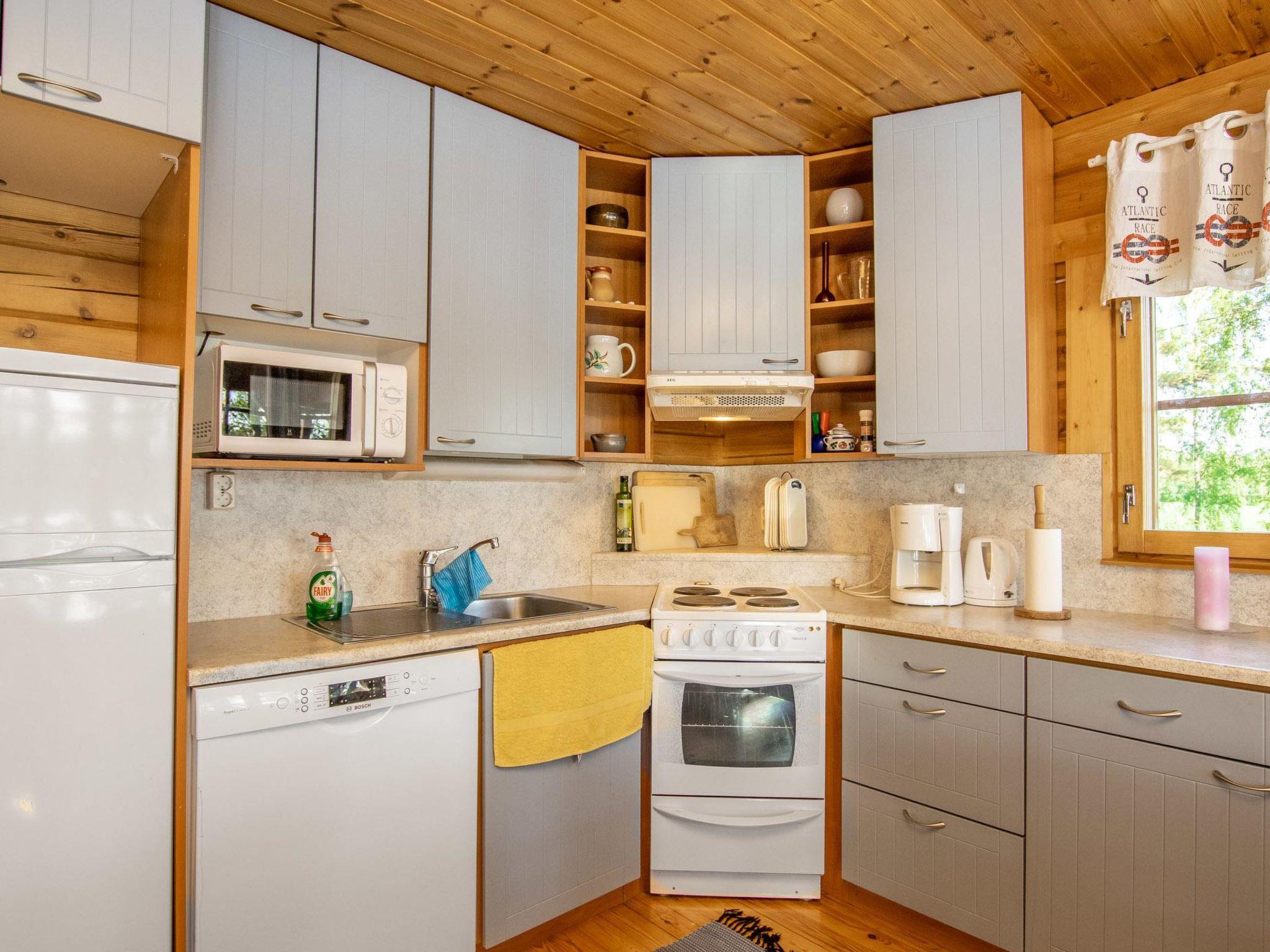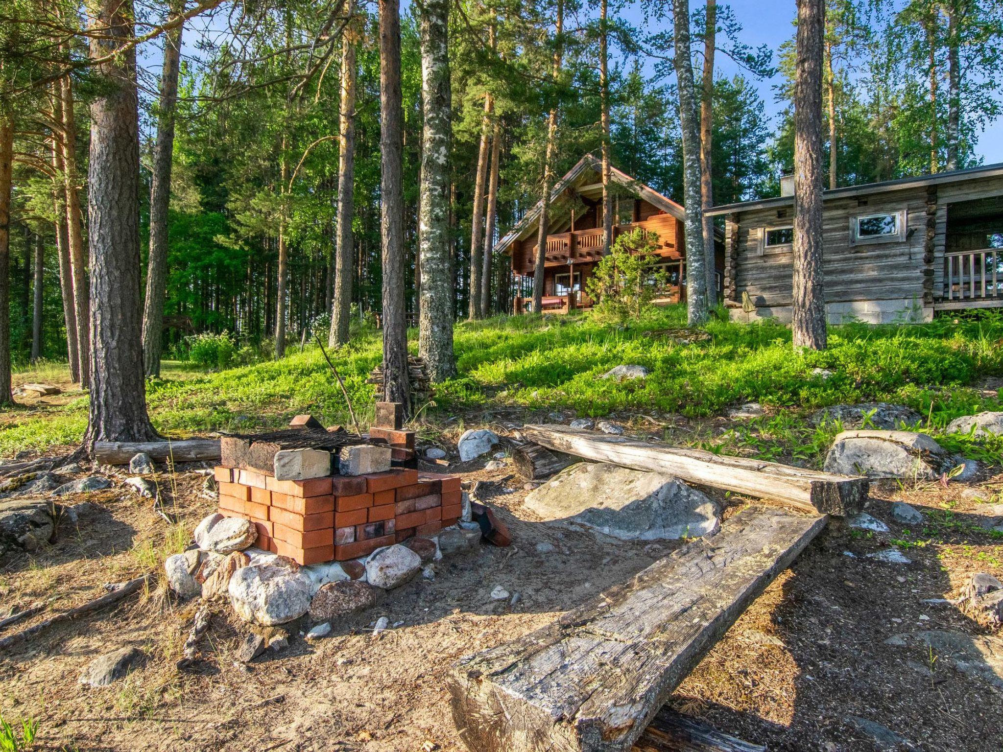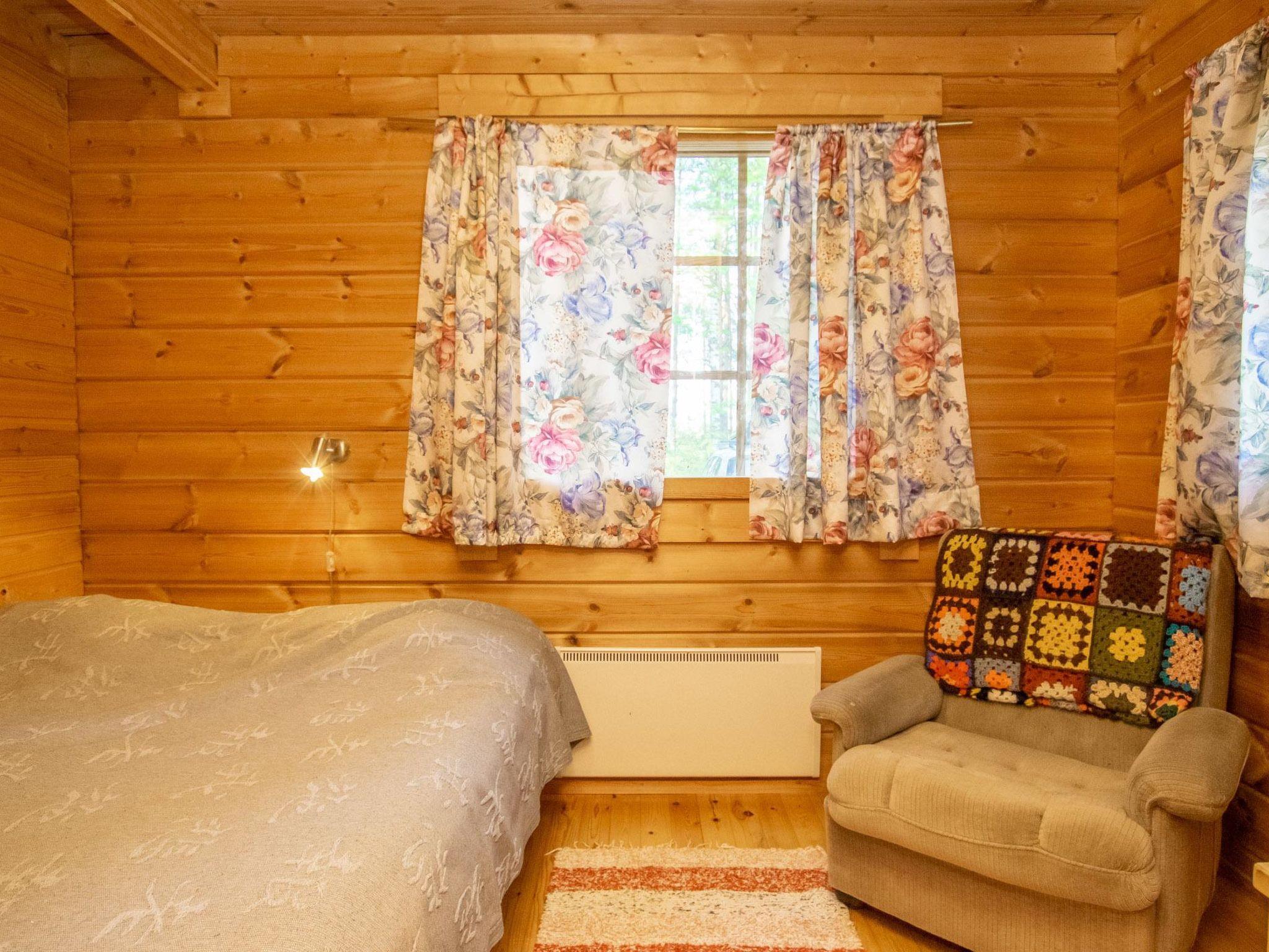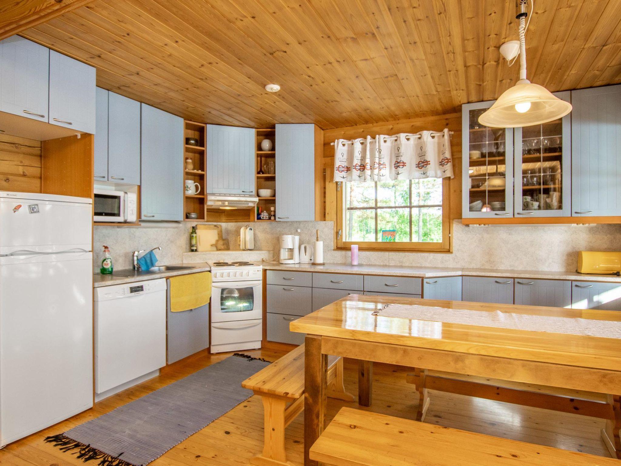 Log cabin 1994, living room/kitchen (30 m²), bedroom (7 m²) double bed, washroom, sauna (wood-burning sauna stove), separate WC. On the upper floor bedroom (12 m²) with double bed and two sofas, another bedroom (14 m²) with double bed and travel bed, third bedroom (20 m²) with two beds and spreadable bed (two extra beds) and balcony.