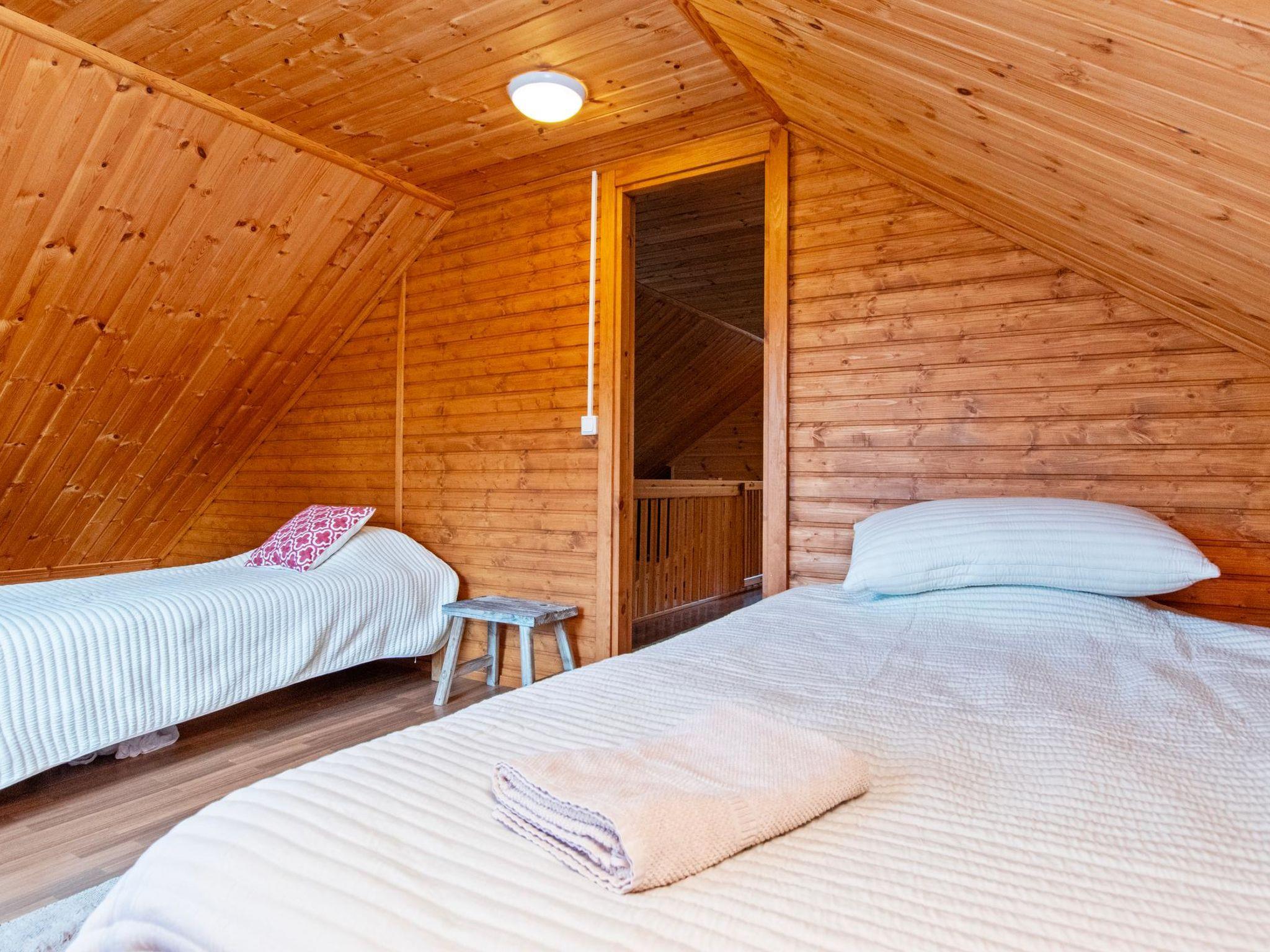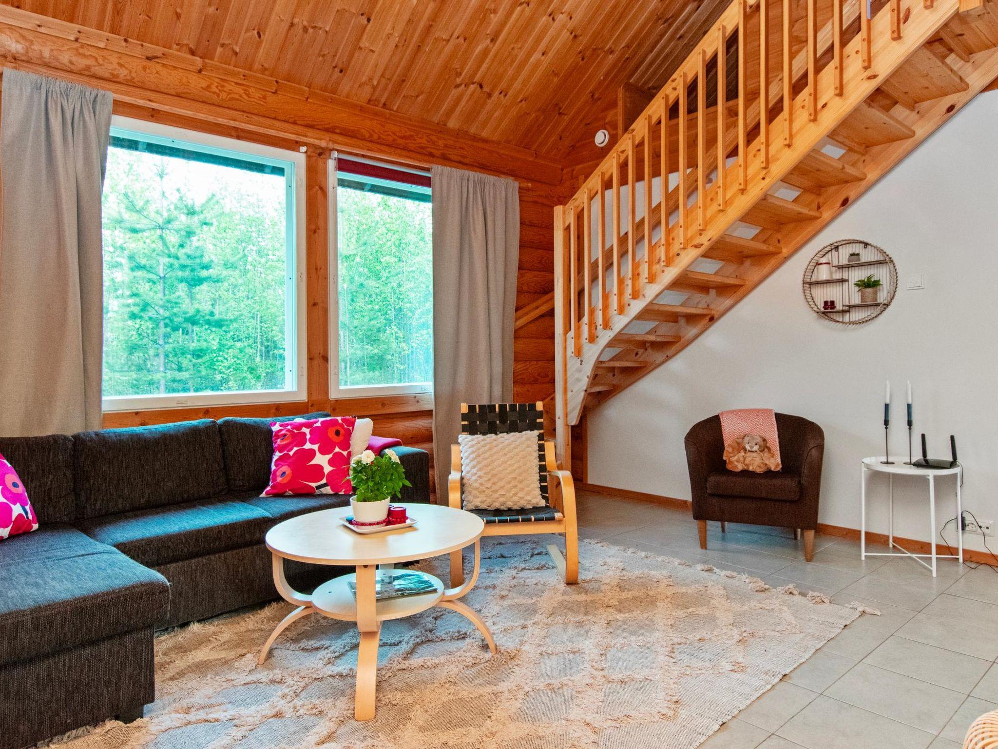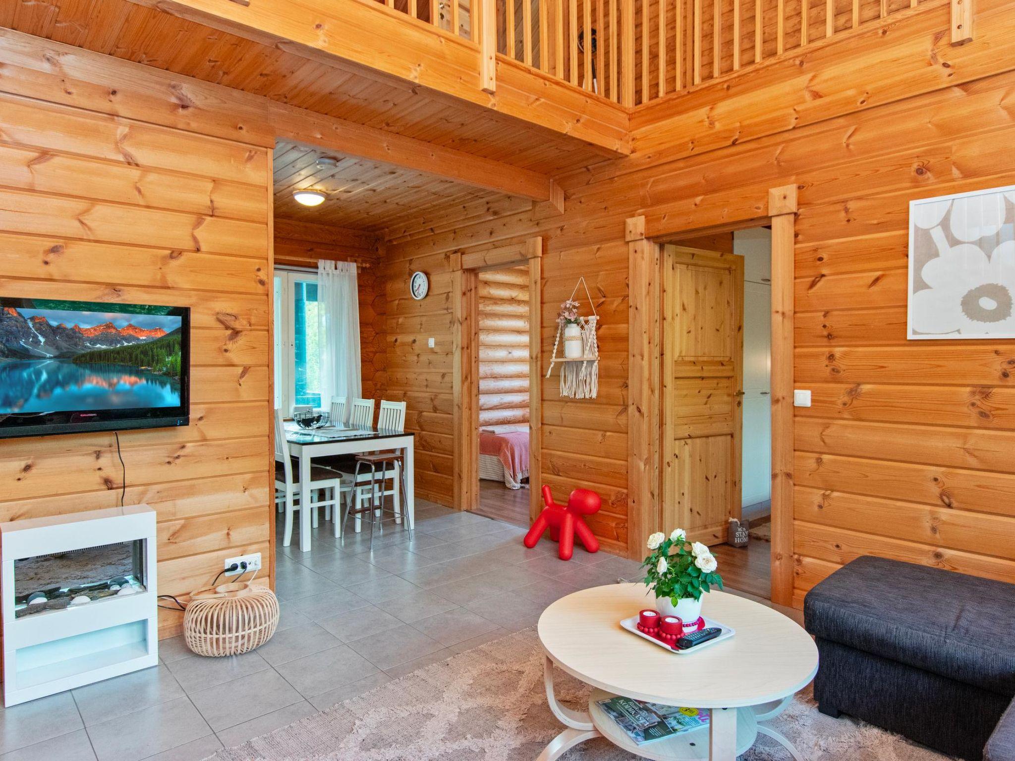 Log villa built in 2011. The ground floor features a living room, kitchen, two bedrooms—one with a double bed and the other with two single beds. Bathroom with WC and shower, electric sauna. Covered porch.