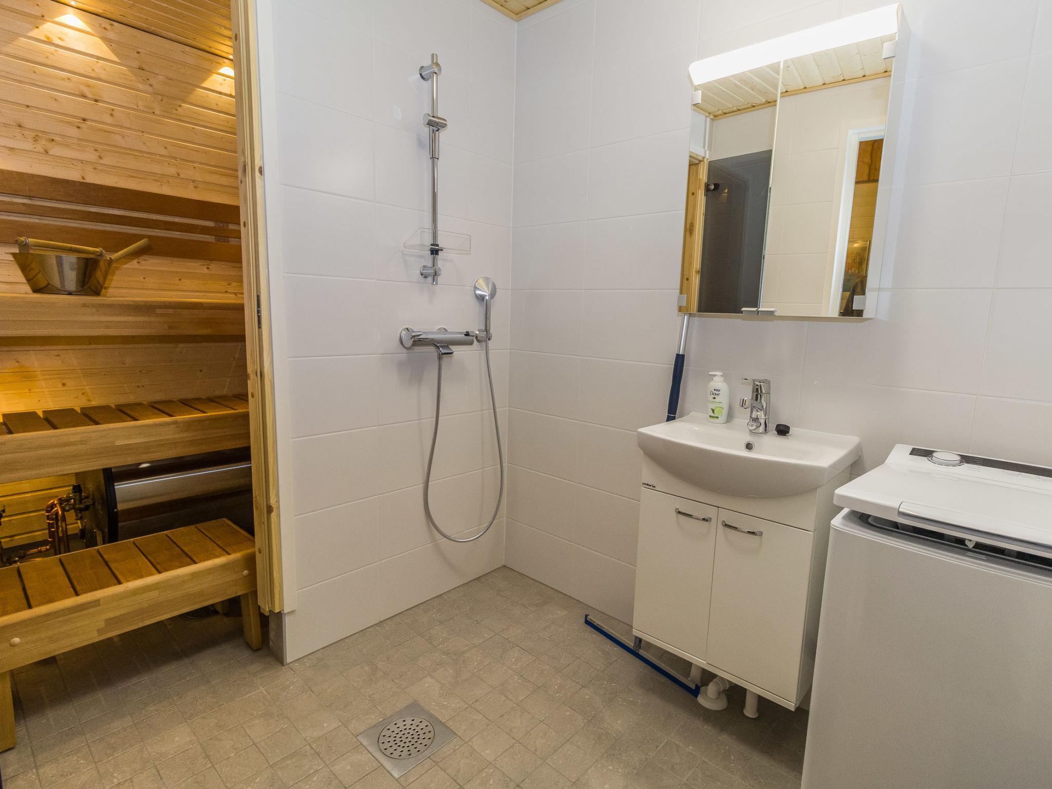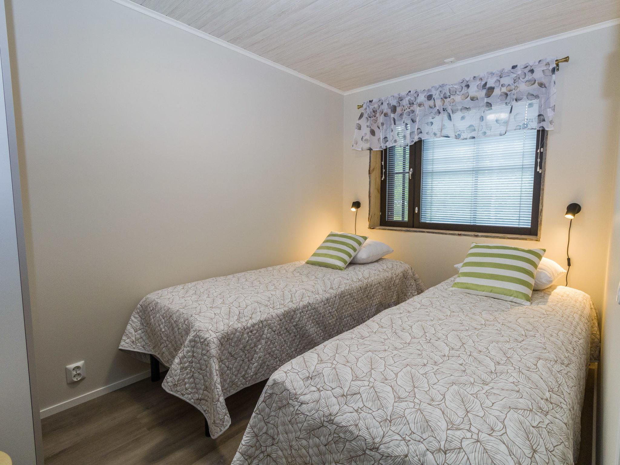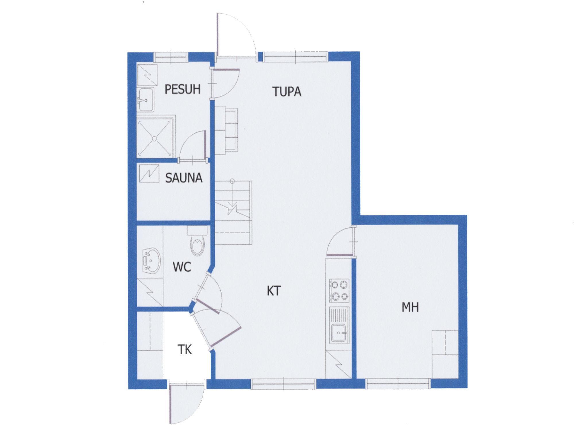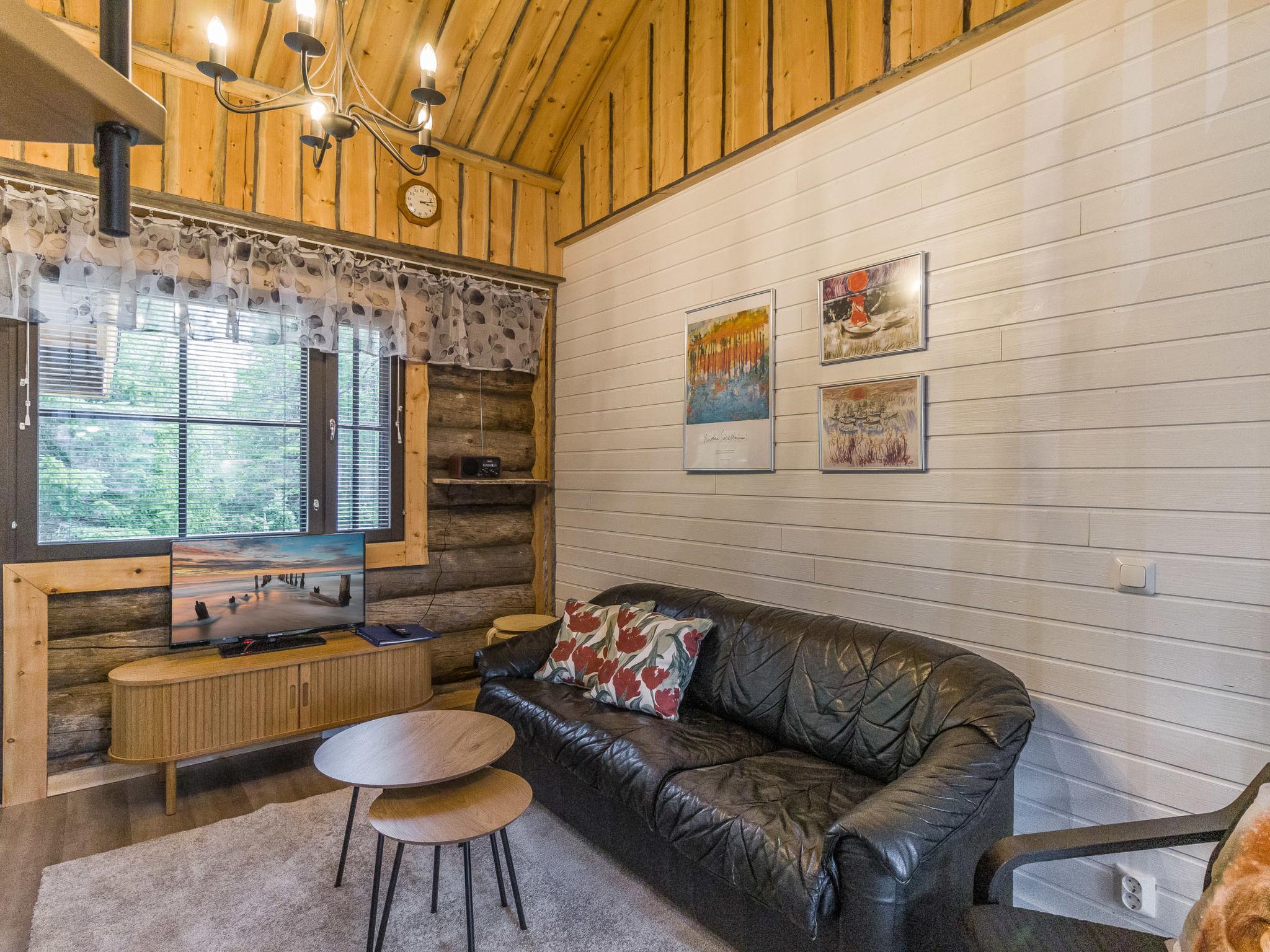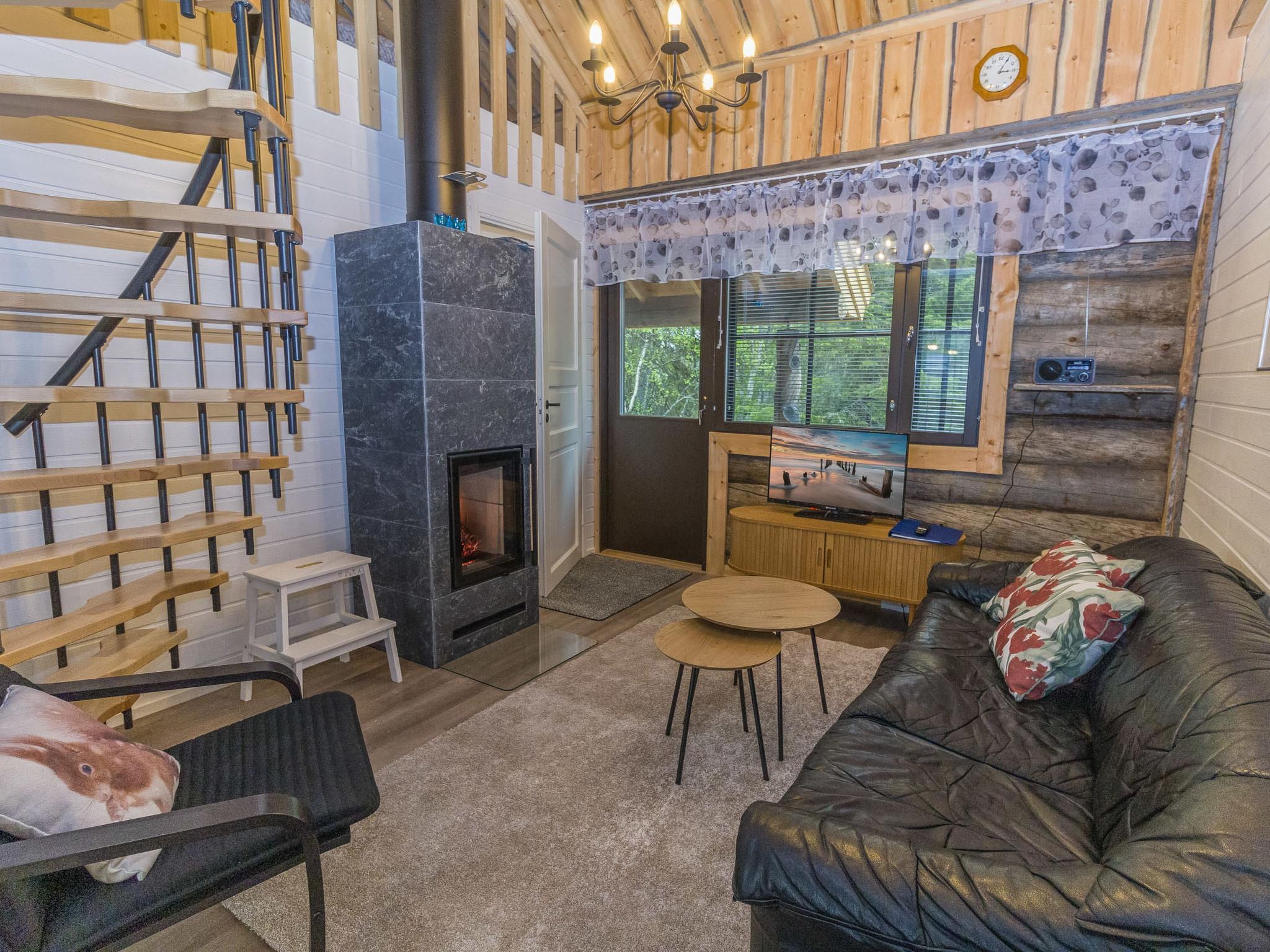 Kitchen-living room, bedroom with 2 beds, upstairs bedroom with 2 beds, loft with two beds, steep staircase to loft. Sauna (electric stove), bathroom and toilet. Small covered terrace.