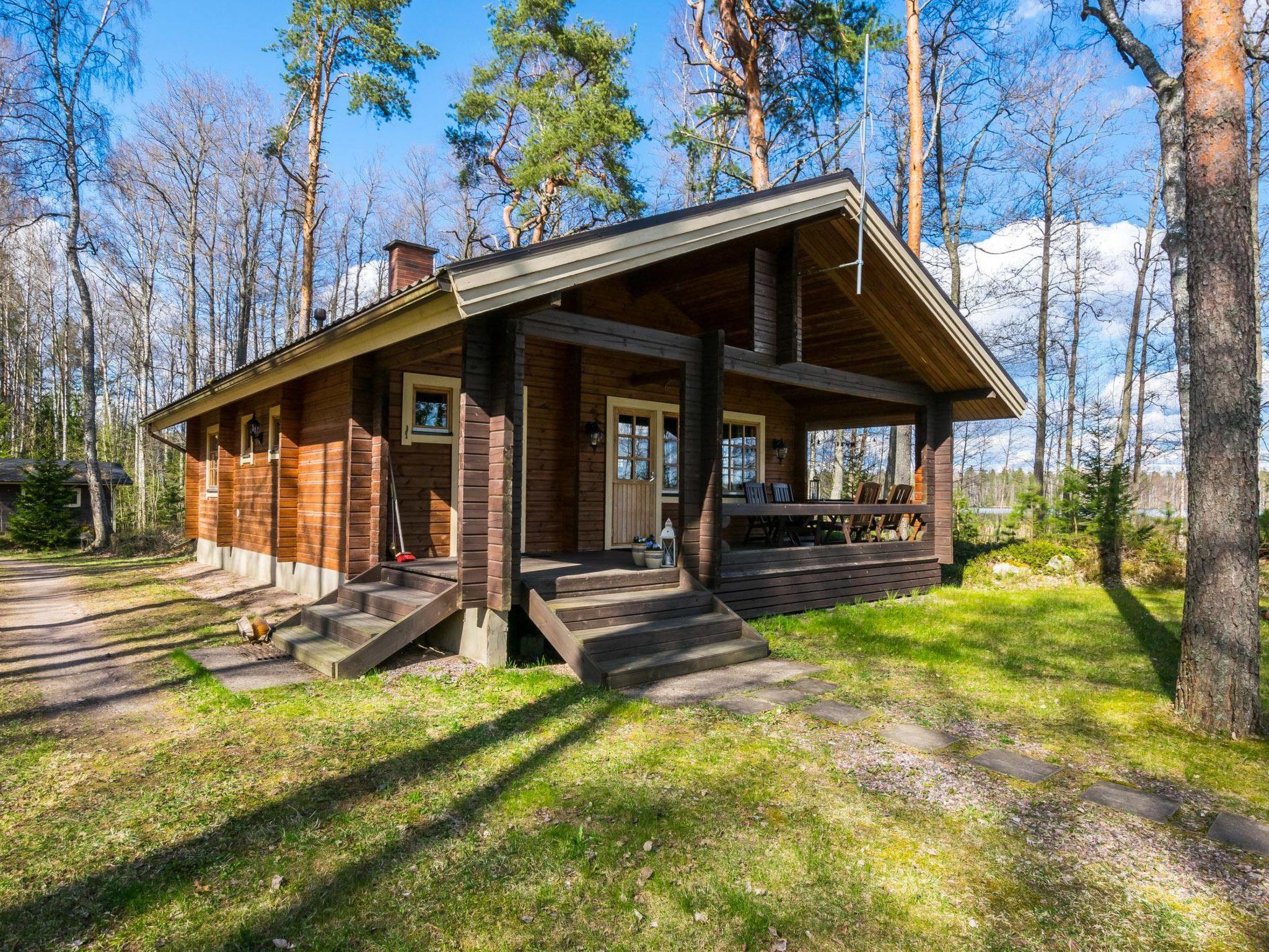95 km northwest of Helsinki, L.Halkjärvi 30 m, (length 1.5 km, width 1 km), shallow, rocky, hard clay bottom, own boat. Log cottage 2005, living room/ kitchen convertible sofa, 2 bedrooms 2 beds in each, sauna, washroom, dressing room, open porch.