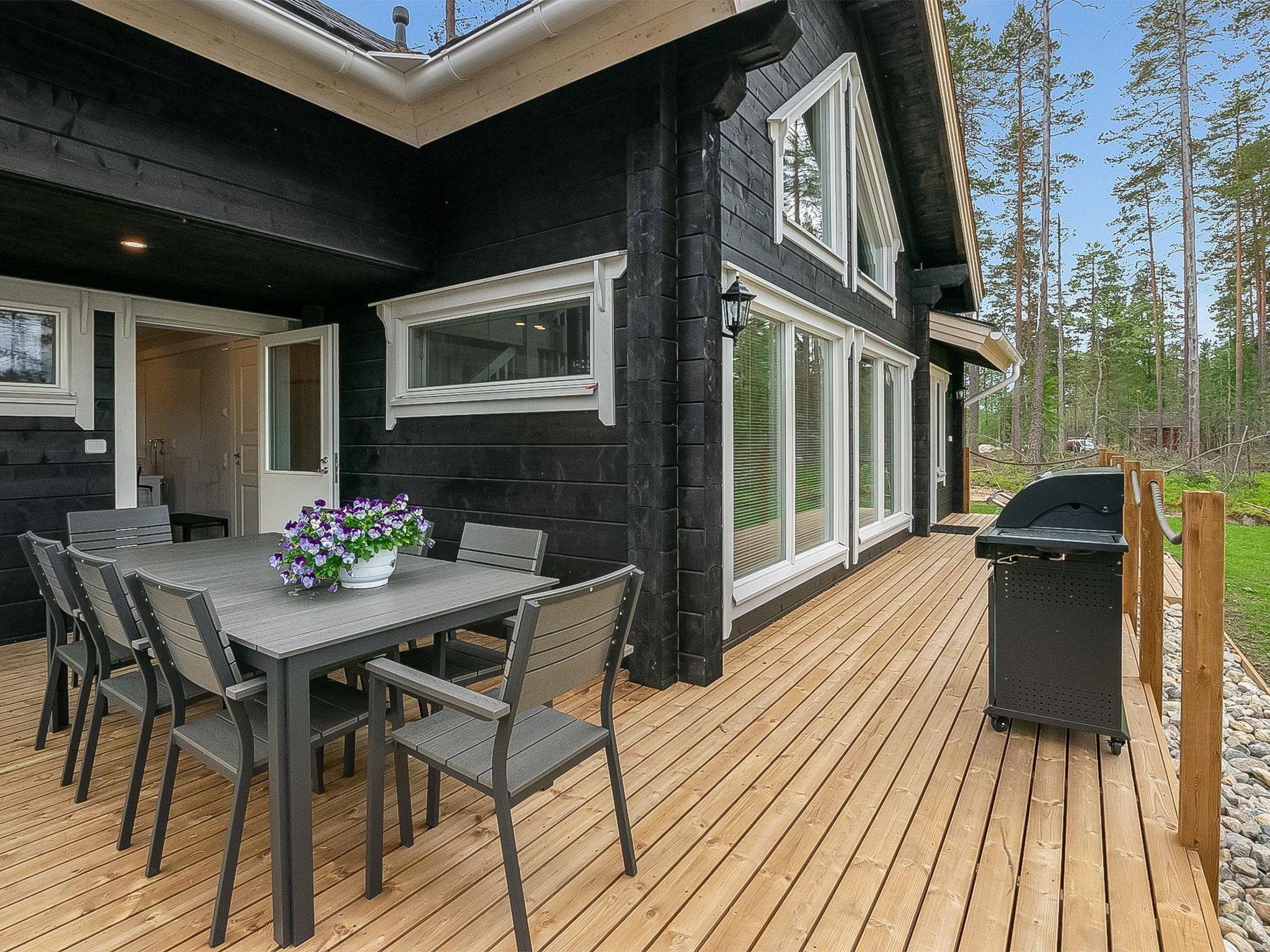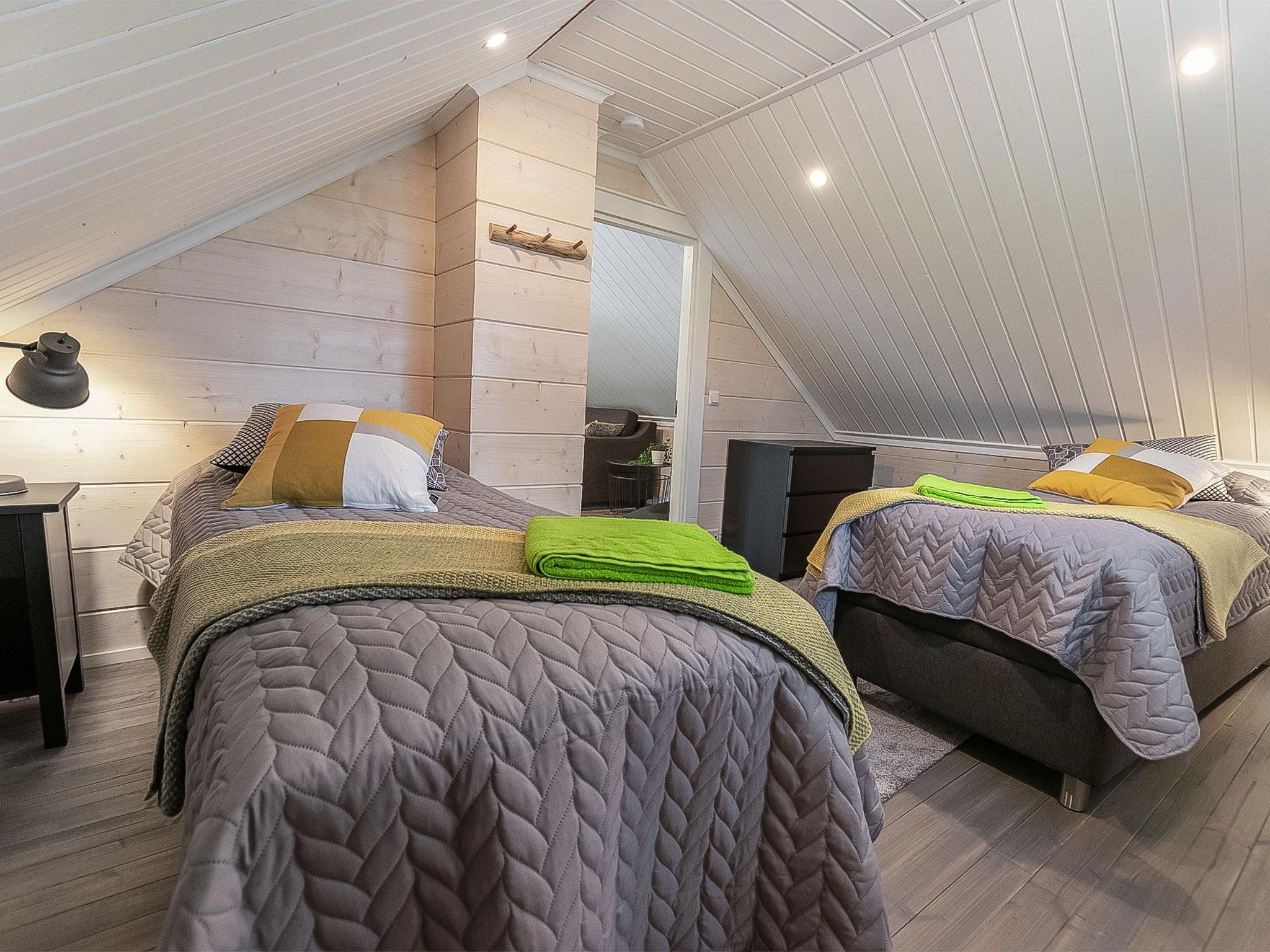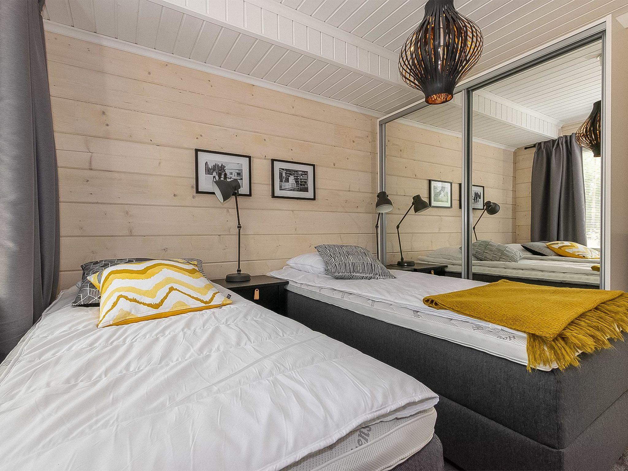 Log cabin 2019, bedroom 1: two 80 x 200 cm beds, bedroom 2: 120 x 200 cm bed, bedroom 3: two 80 x 200 cm beds, bedroom 4: two 80 x 200 cm beds, sofa bed (140 x 190 cm spare bed) in the lobby on the upper floor. Living room with wood-burning stove, dining group which can be extended (for 10 people group), well-equipped kitchen corner, sauna (electric sauna stove), washroom, terrace with gas grill and garden furniture.