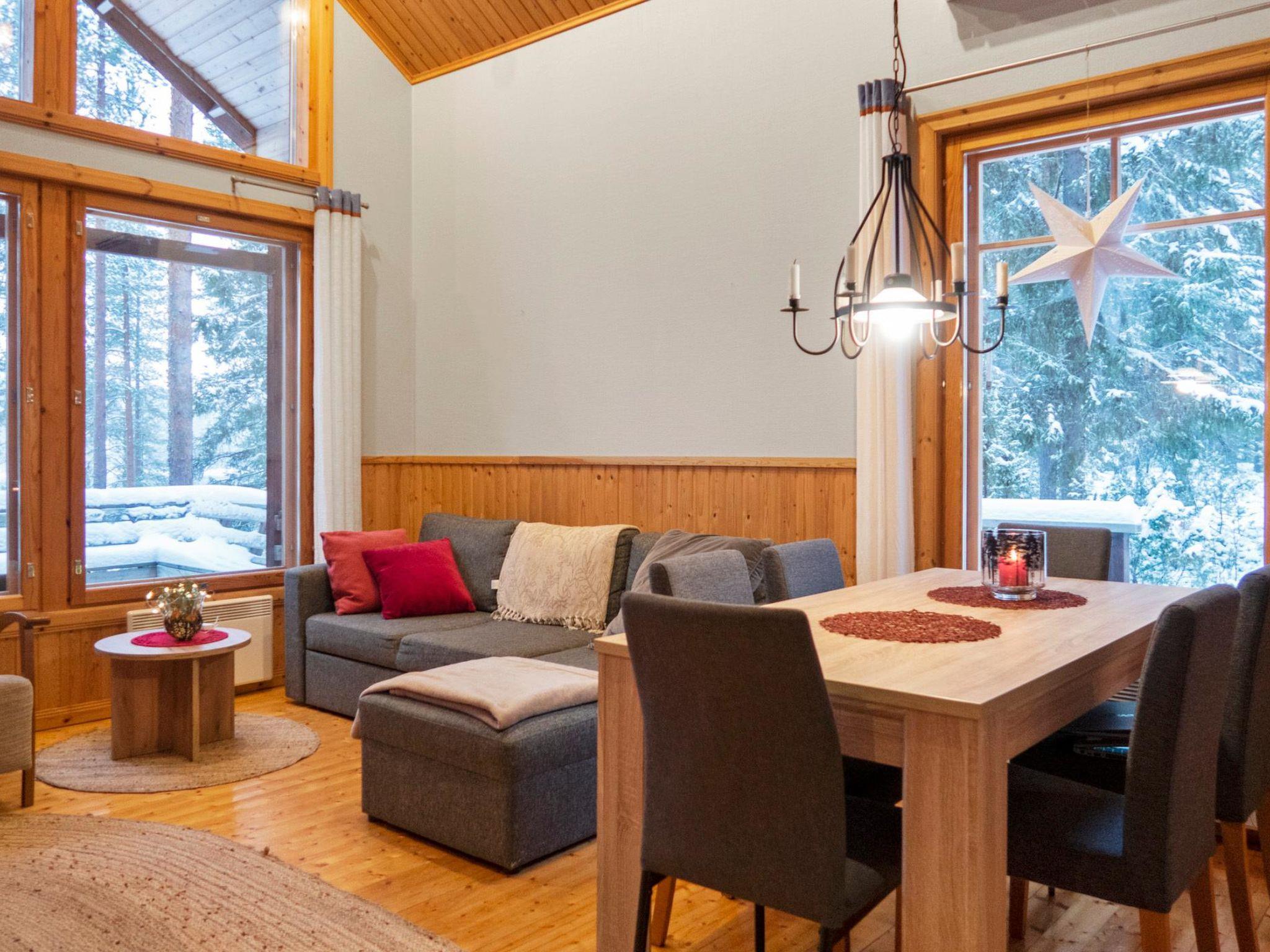 The cabin has 2 floors, total area is 74 m². On the ground floor, a bright living room/kitchen with high windows facing the river, heat reserving fireplace, a small bedroom with a sofa bed for 1-2, sauna (wood-burning stove), shower/WC, from the utility room access to covered terrace, gas grill/furniture in the summer.