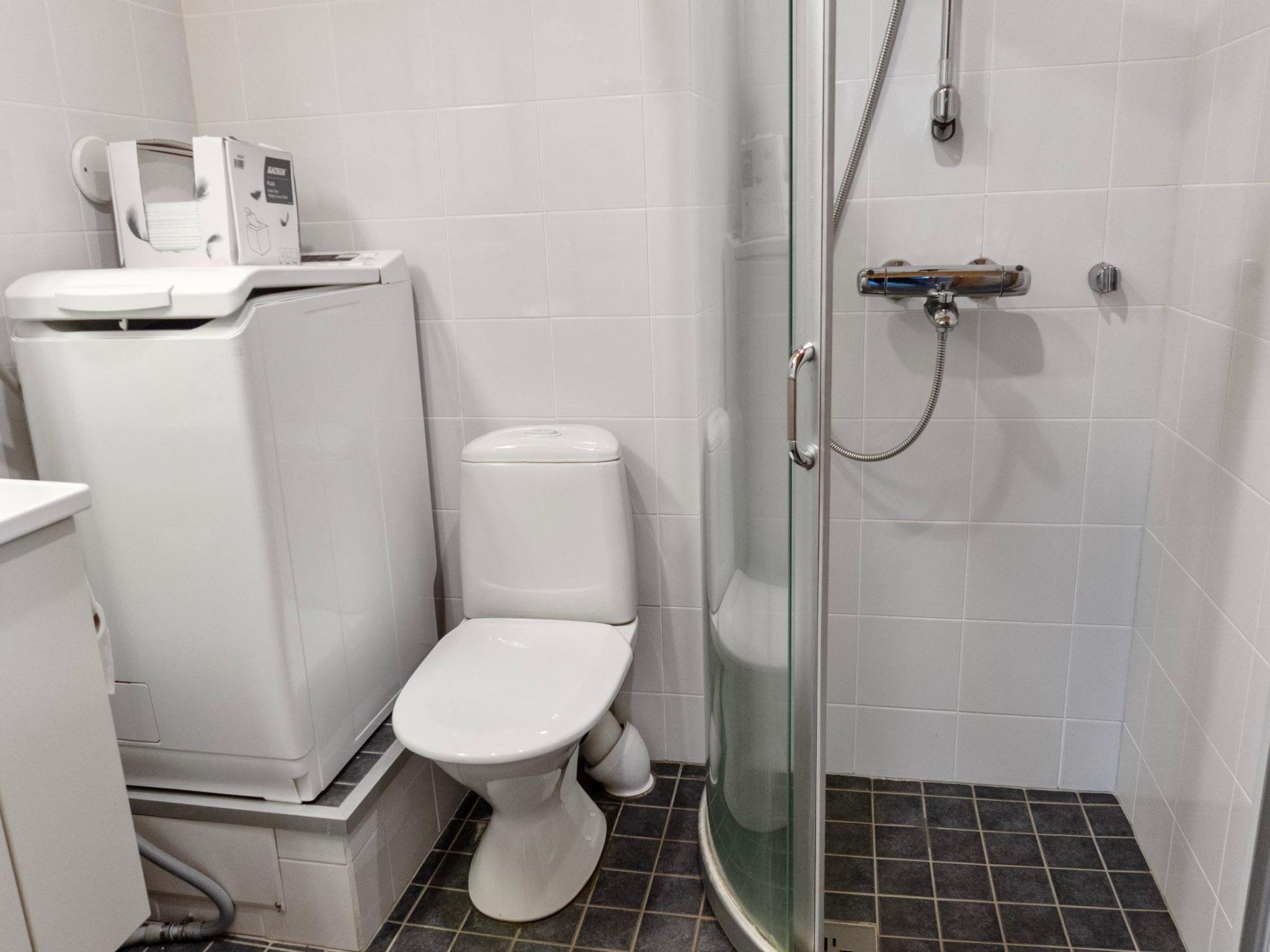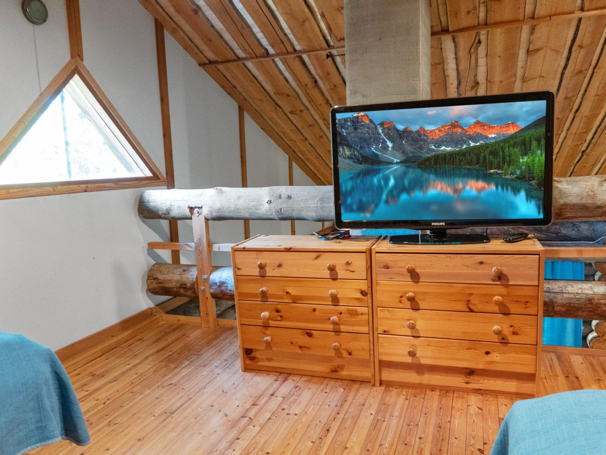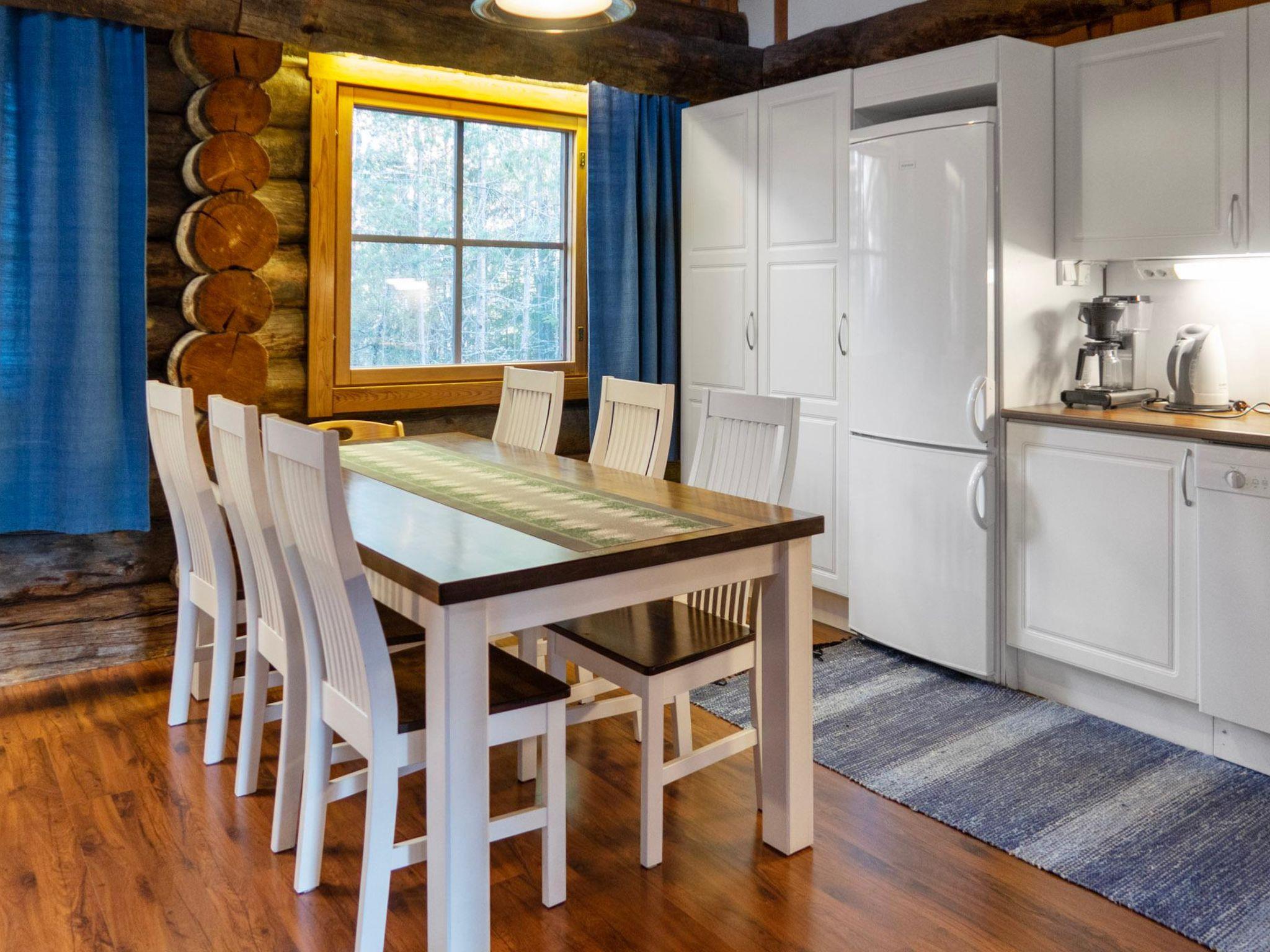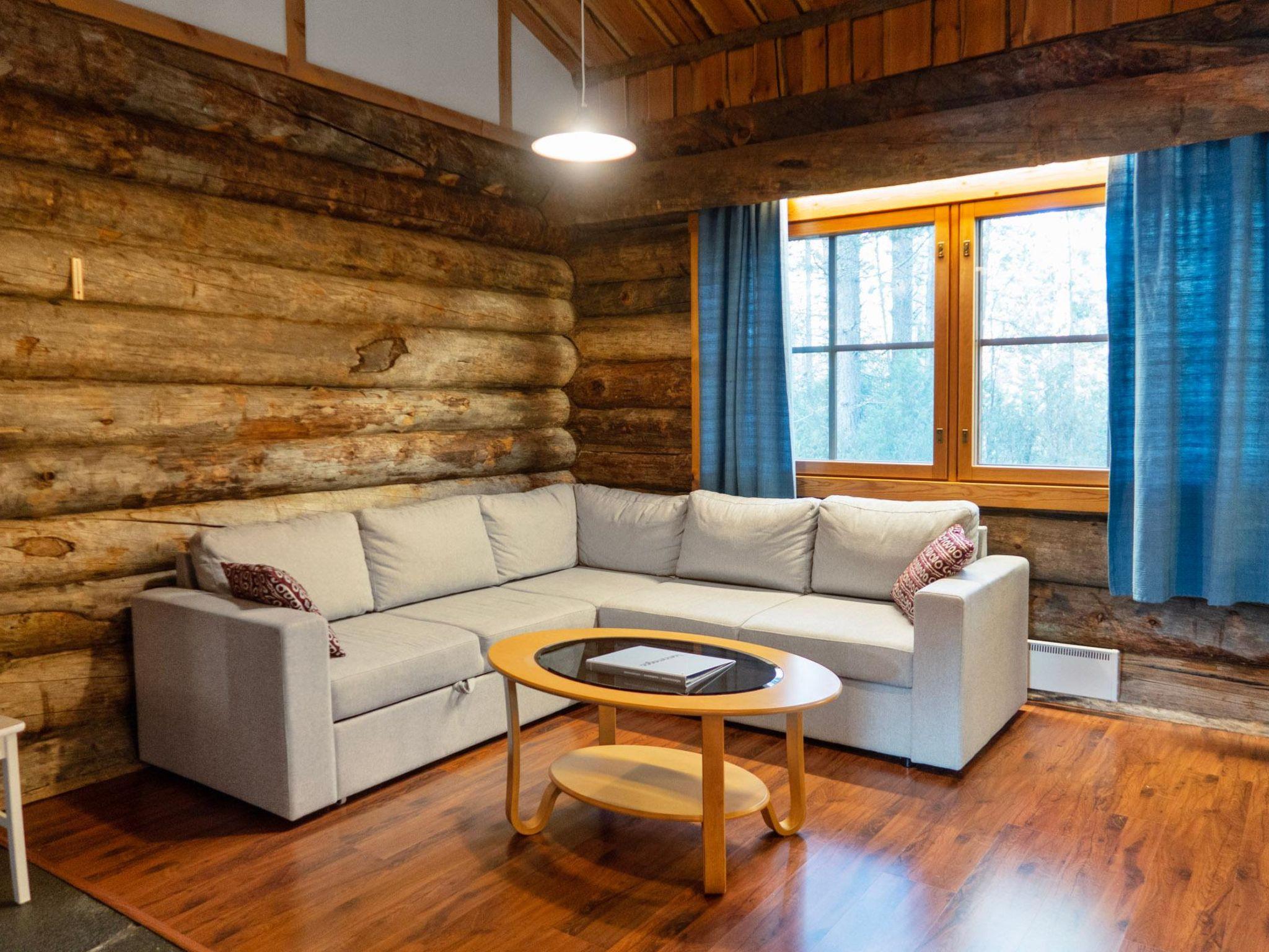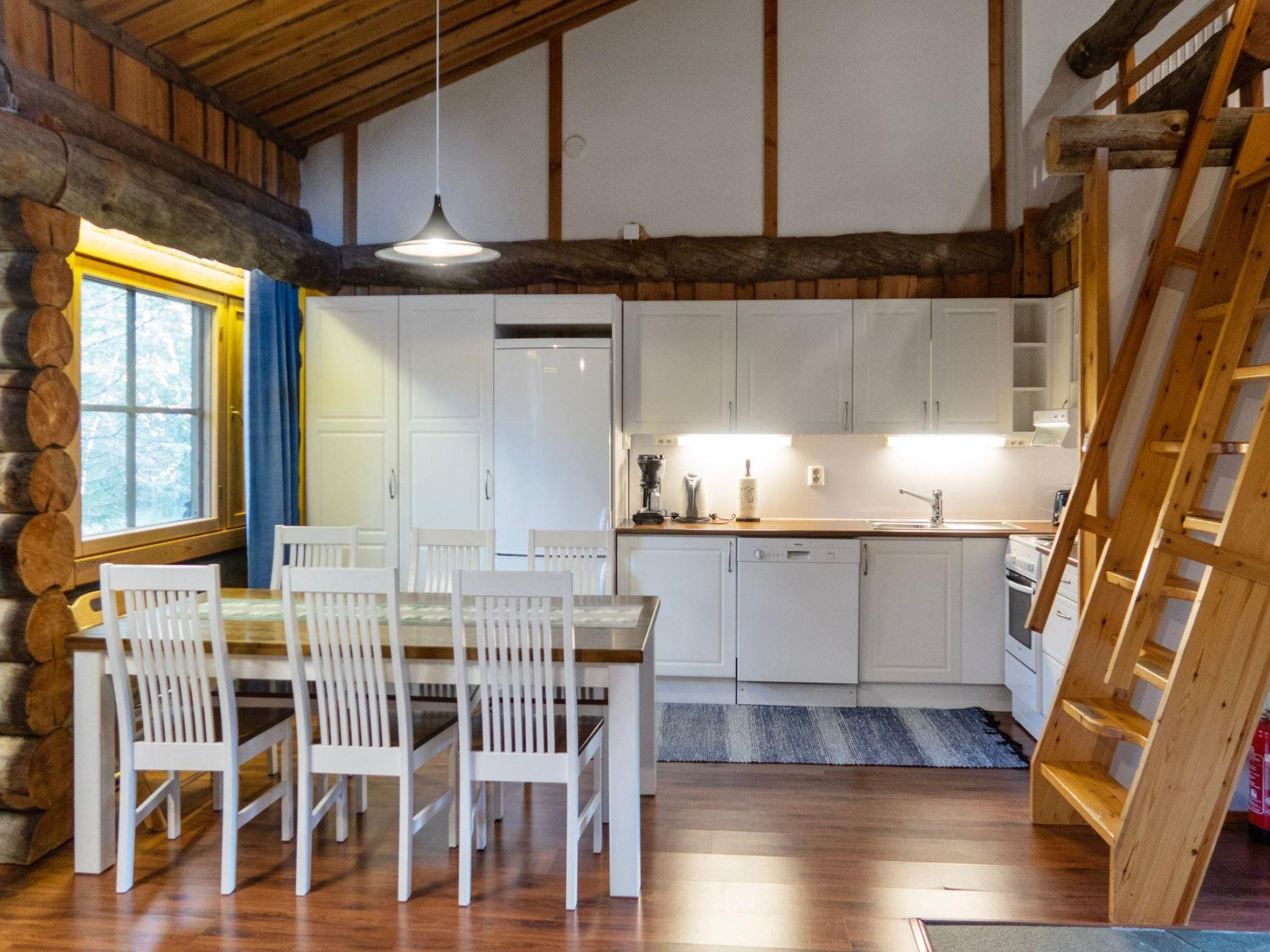 Living area of ??Lemminkäinen is 52 m² + 15 m² loft. Open kitchen, windows facing the forest. In living room, there is a dining set for 6 and the natural stone open fireplace adds to the atmosphere. Downstairs is a bedroom with two separate beds. Steep stairs to the loft with four separate beds. The space is divided by a partition, so it offers privacy for the sleepers. Harvia - electric heater in the sauna, and a washroom/toilet. On the porch, there is a cold outdoor storage for firewood and storage space for, for example, sports equipment.