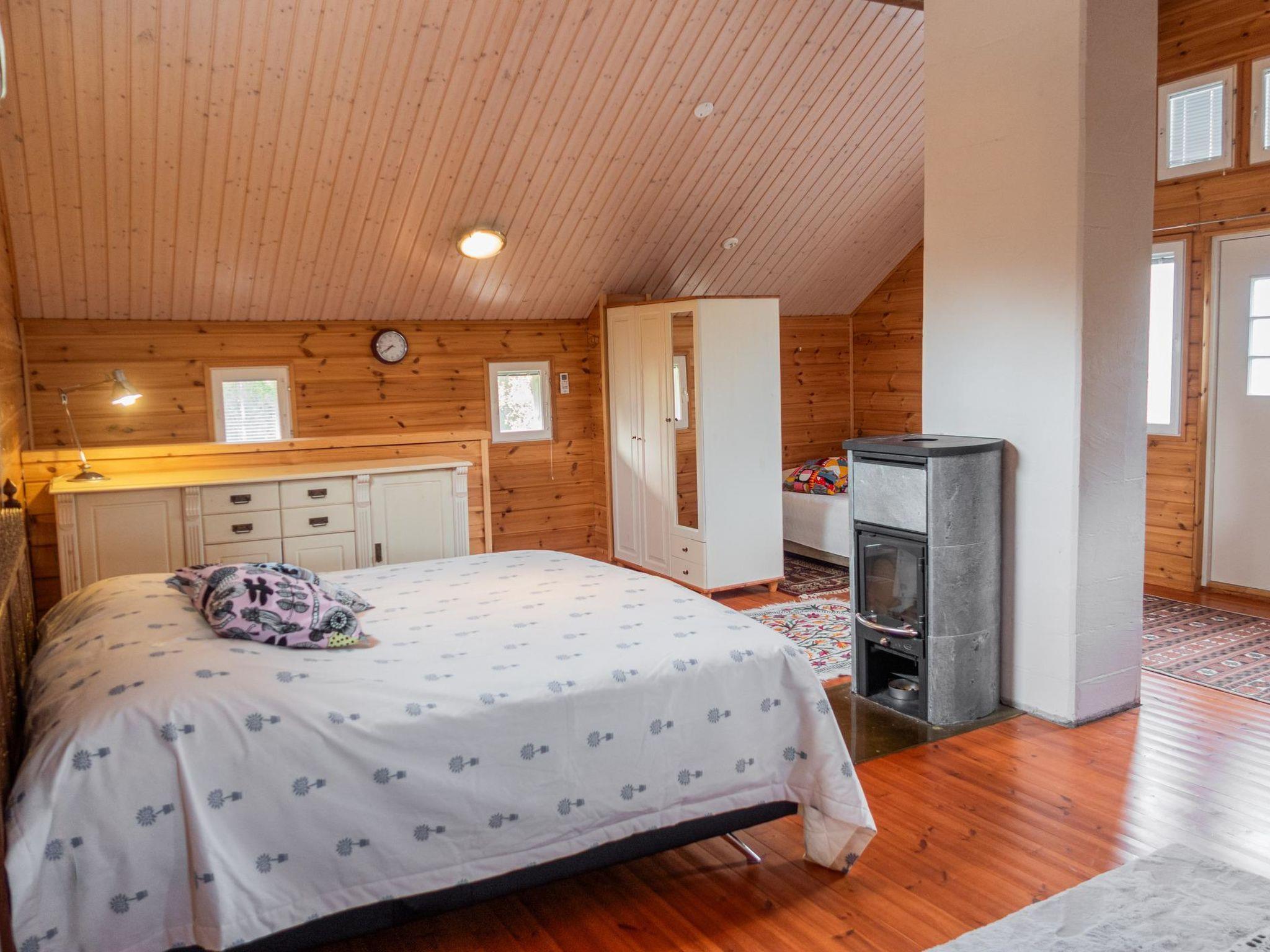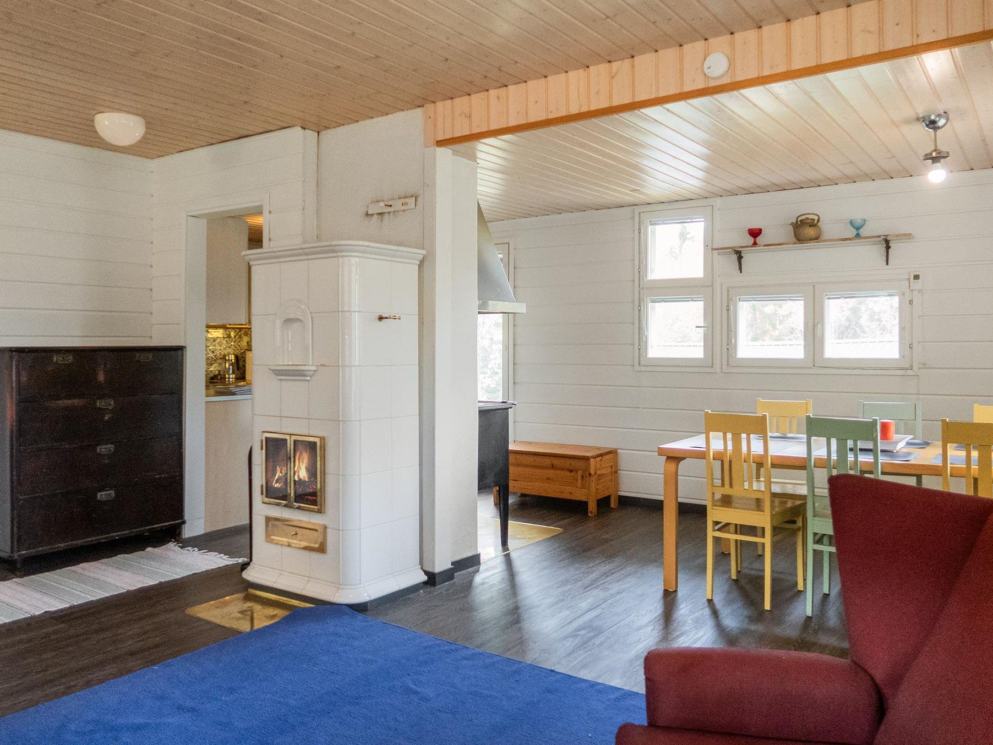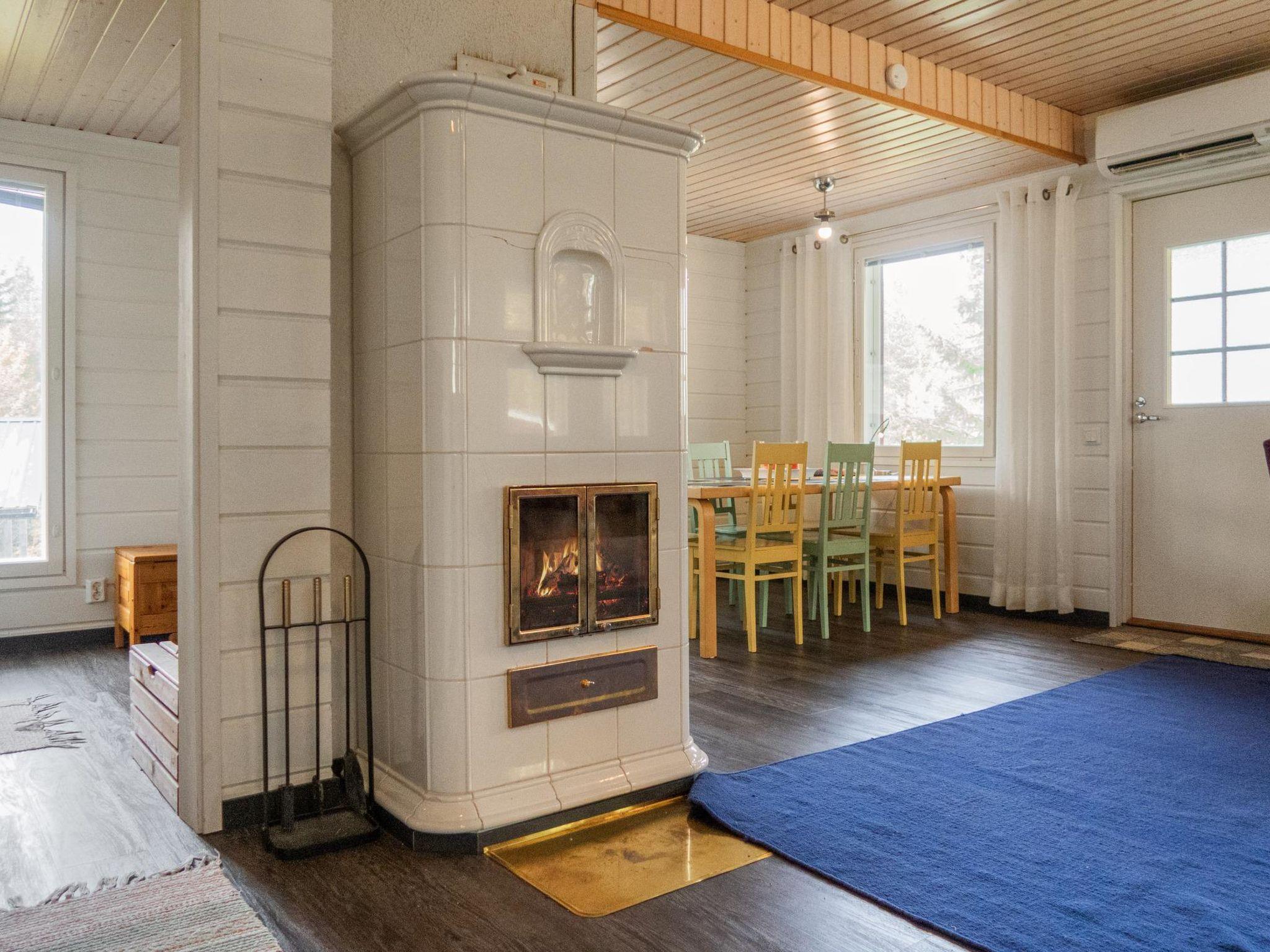 The cottage built in 2002, living space of 60 m² on the ground floor and 60 m² on upper floor. A separate kitchen corner with an atmospheric wood stove. In the living room kitchen there is a fireplace and a dining set for 6 people. In the living room, a good-sized sofa and an armchair. Upstairs, a motor bed (as a double bed), and 2 x 120 cm wide separate beds, in the same space, but partly demarcated into a sleeping space with wardrobe. From the upper floor there is access to a small balcony, with a view of the courtyard sauna and the stream.