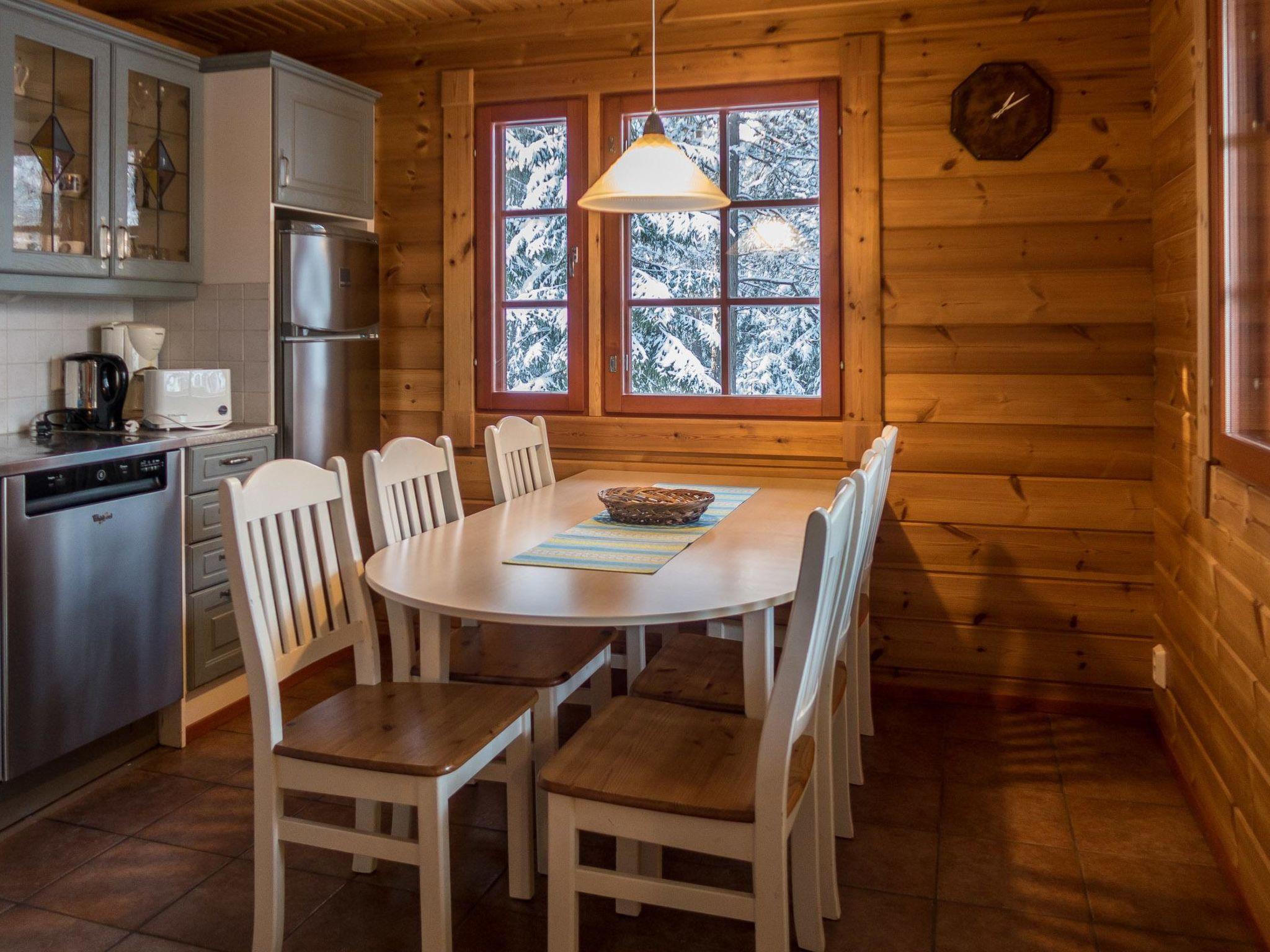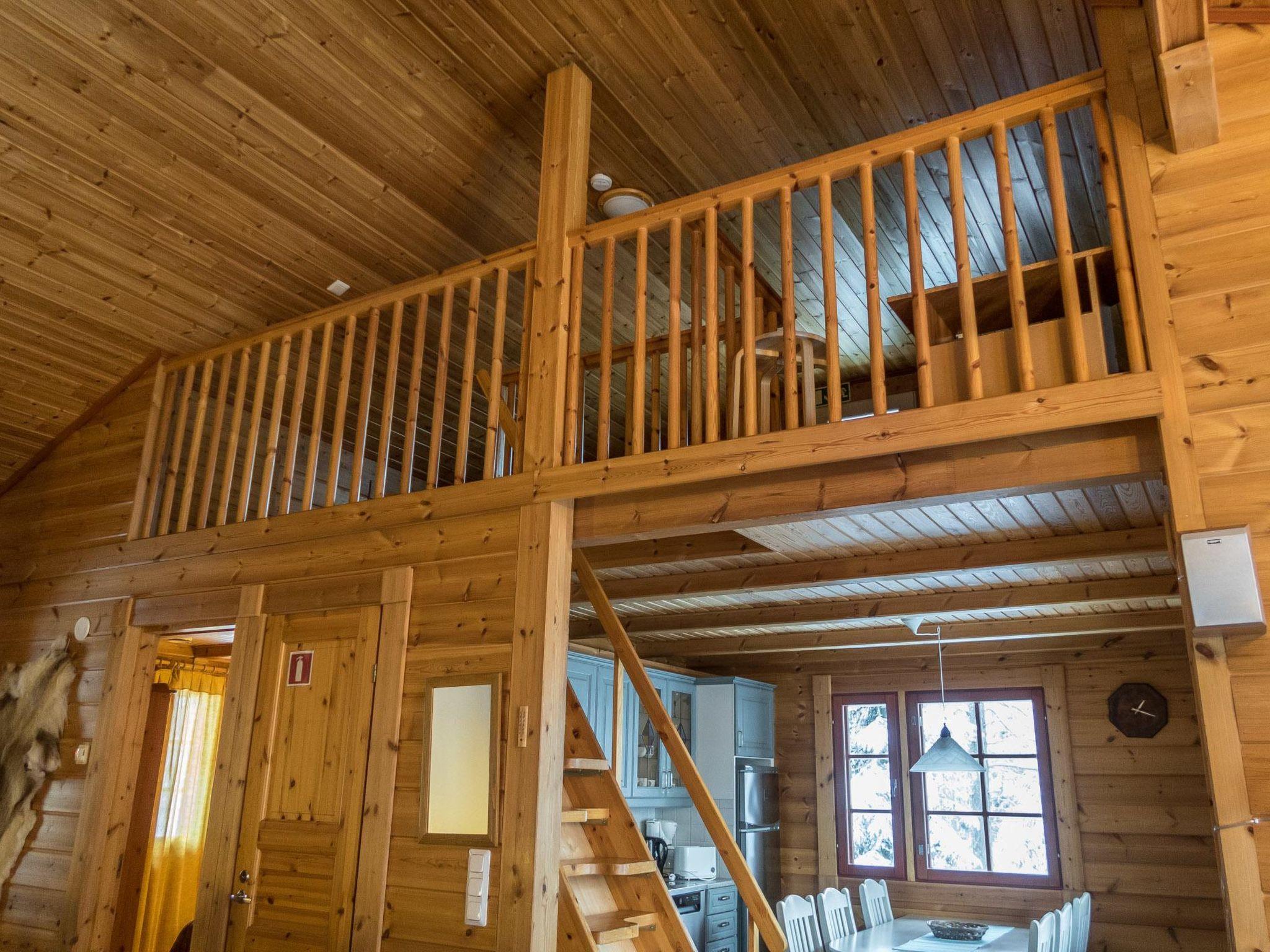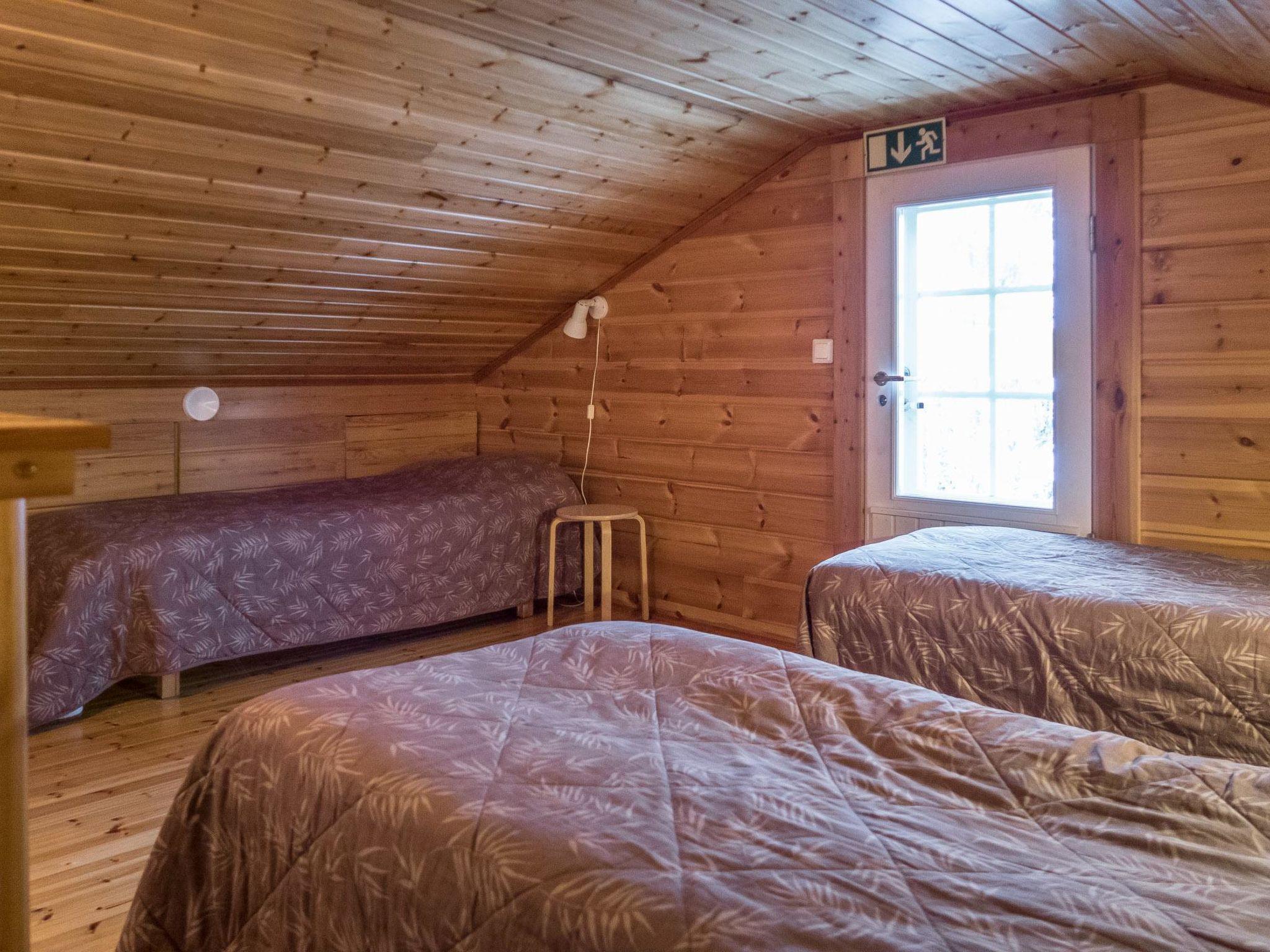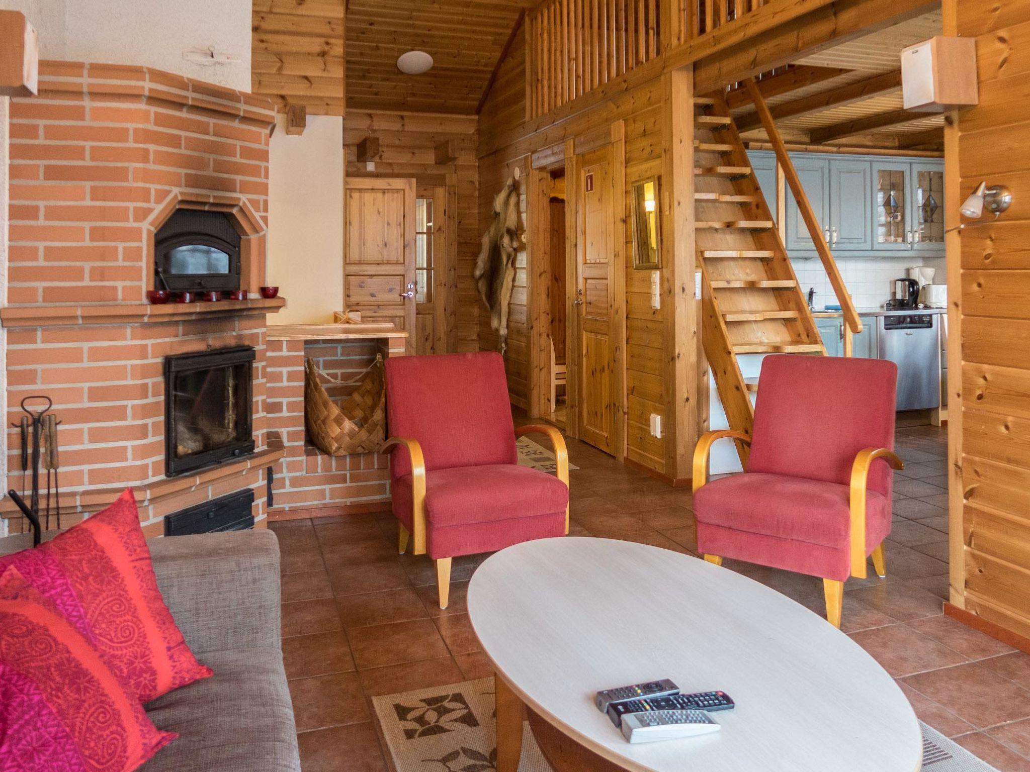This apartment in log-made semi-detached house in Vuokatti ski slope area was completed in 1999. Floor area 90 m², loft 20 m². On the ground floor there is fireroom with sofa bed for 1-2 persons and bedroom for three persons with bunkbed (lower bed can be enlarged for two). Sauna (electric heating), washroom, toilet. Upstairs there is kitchen, living room, one bedroom with twin bed and shower/toilet. Loft with separate beds for three. Balcony. Wifi.