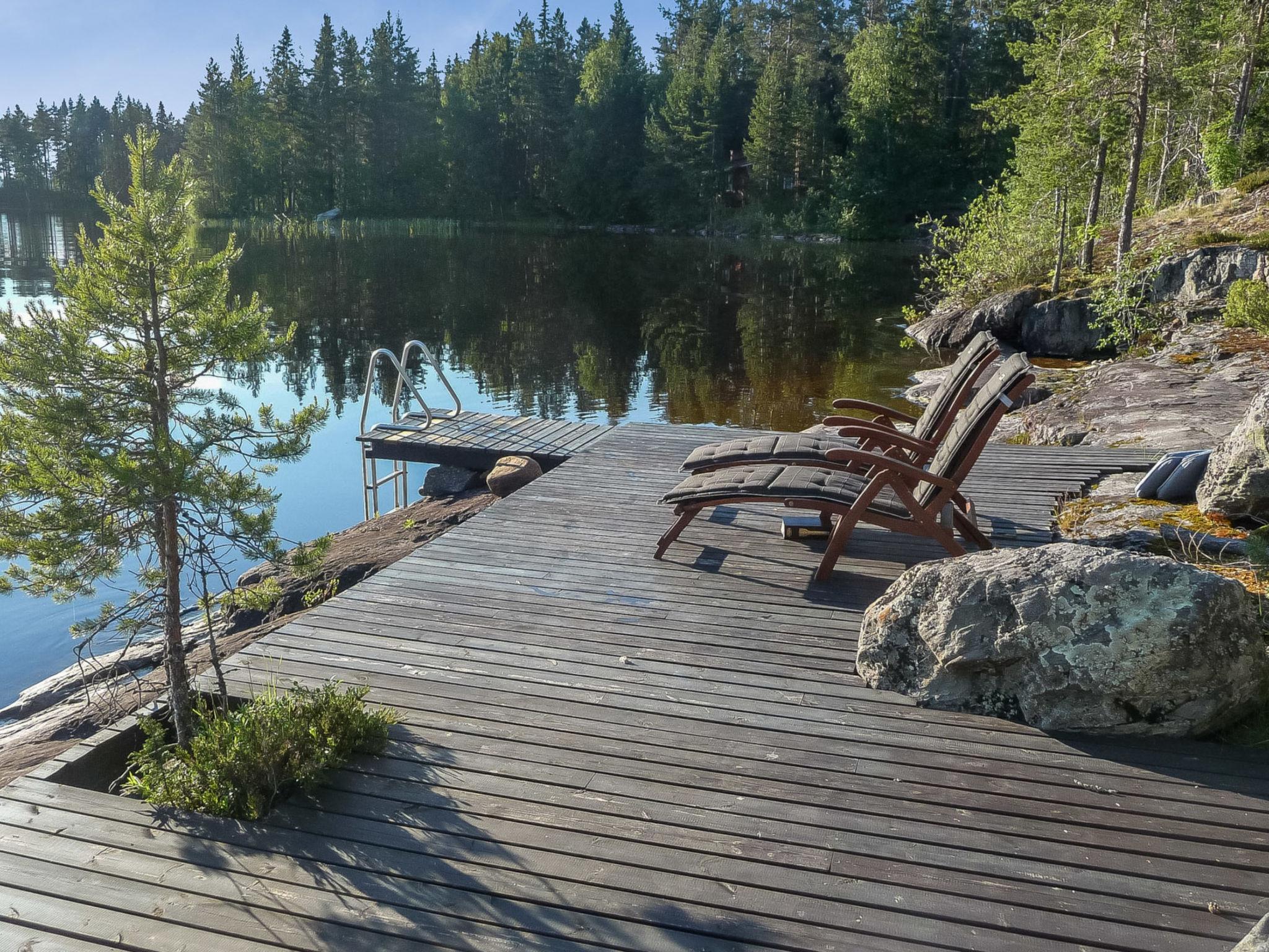 A terrace surrounds the house. The beach is 15 meters away. On the beach in summer, patio, lounge chairs, a stone wall/smoking area on the rock, dining table and benches. The apartment is on a rocky plot with 80 meters of its own shoreline. Swimming is possible from the rock or using a ladder. Access to the beach may be difficult for people with reduced mobility. You can get around the steep climb along the path and rock.