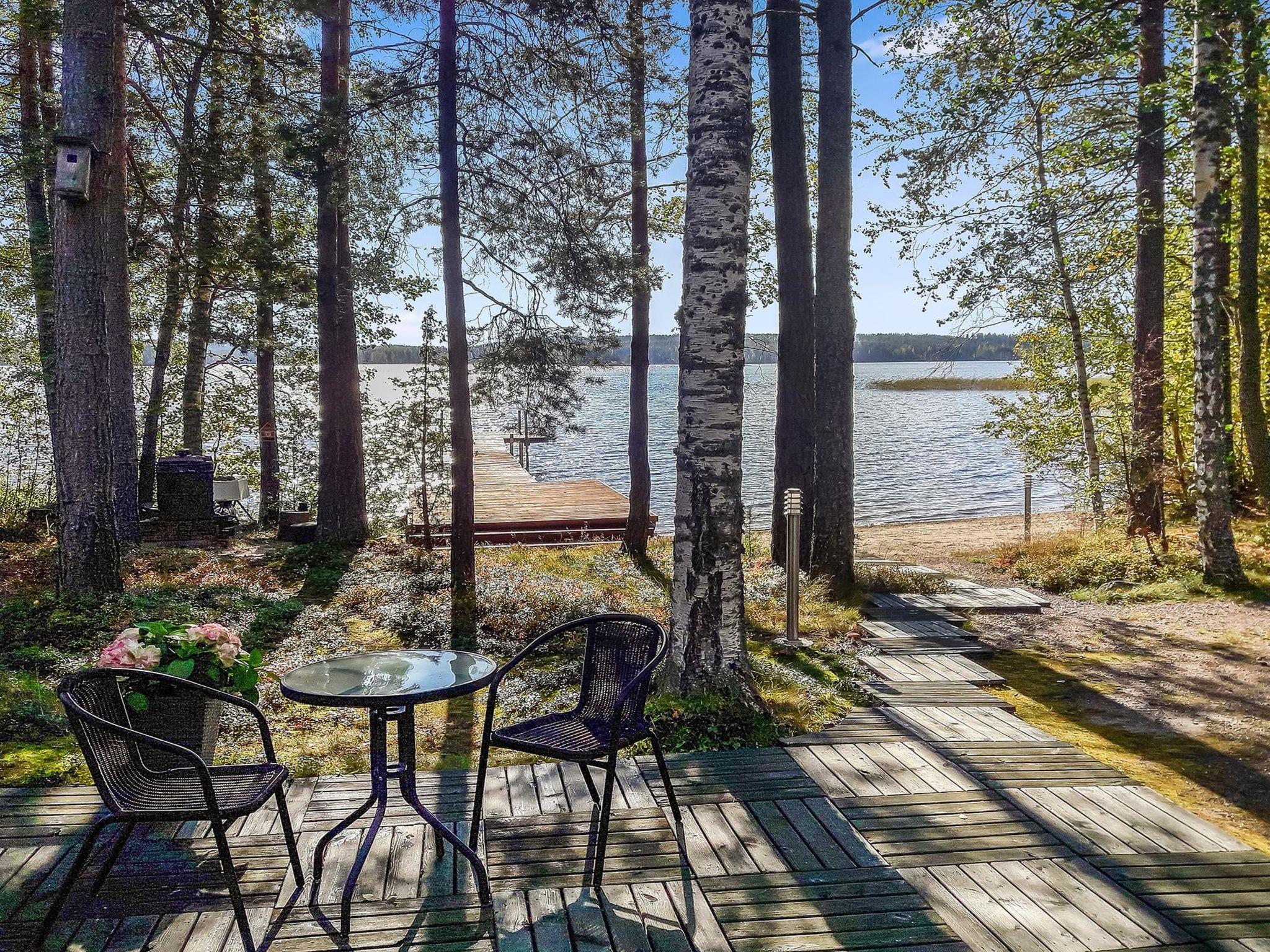 29 km to the northeast from Puumala, lake Saimaa 20 m, shallow sand beach, own pier and rowing boat, wooden cabin with boarded outer walls (built in 2000), spacious living room and living room/kitchen, two bedrooms (both with double bed), WC, sauna (wood-burning sauna stove), washroom, dressing room. In the yard there is a spacious sleeping shed (built in 2021), the shed has 2 beds, electricity and heating. Air source heat pump in the cabin. 2 refrigerators, one with freezer compartment.