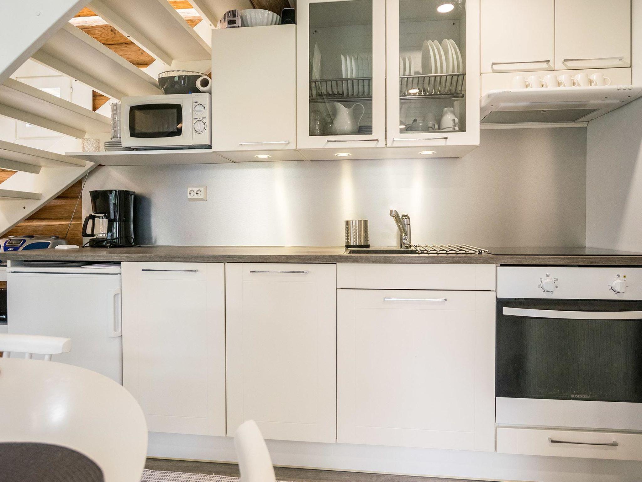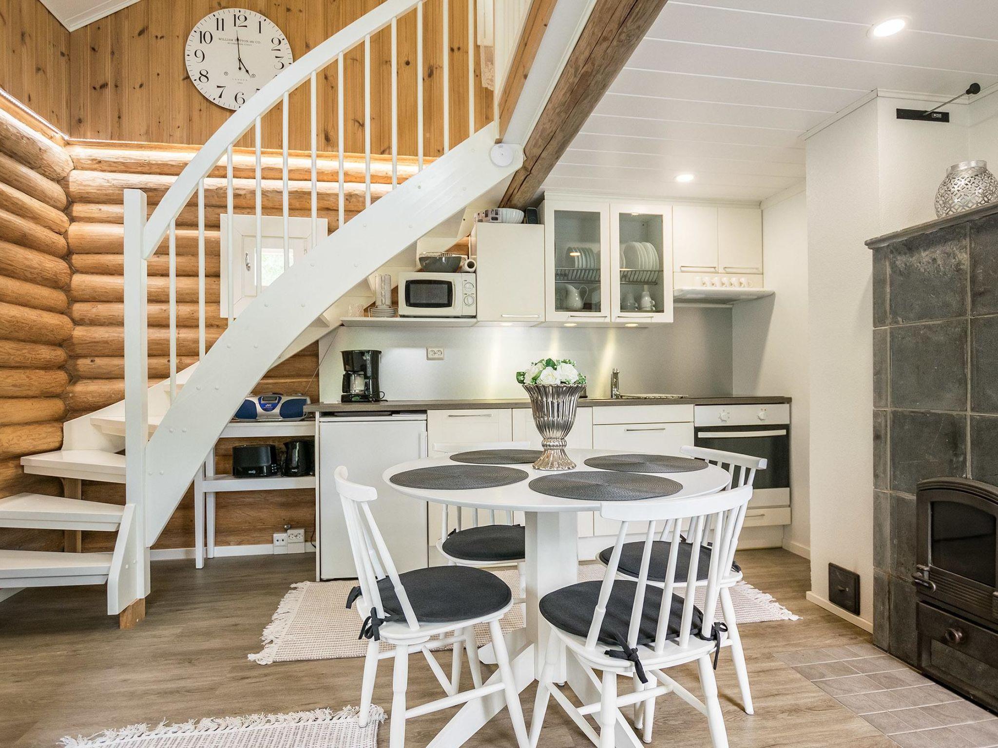 Log-built cabin 2021, living room with kitchen, dining group, TV and sofa bed (135x200 cm bed). Double bed and extra bed (140 x 196 cm) for one in the loft.
