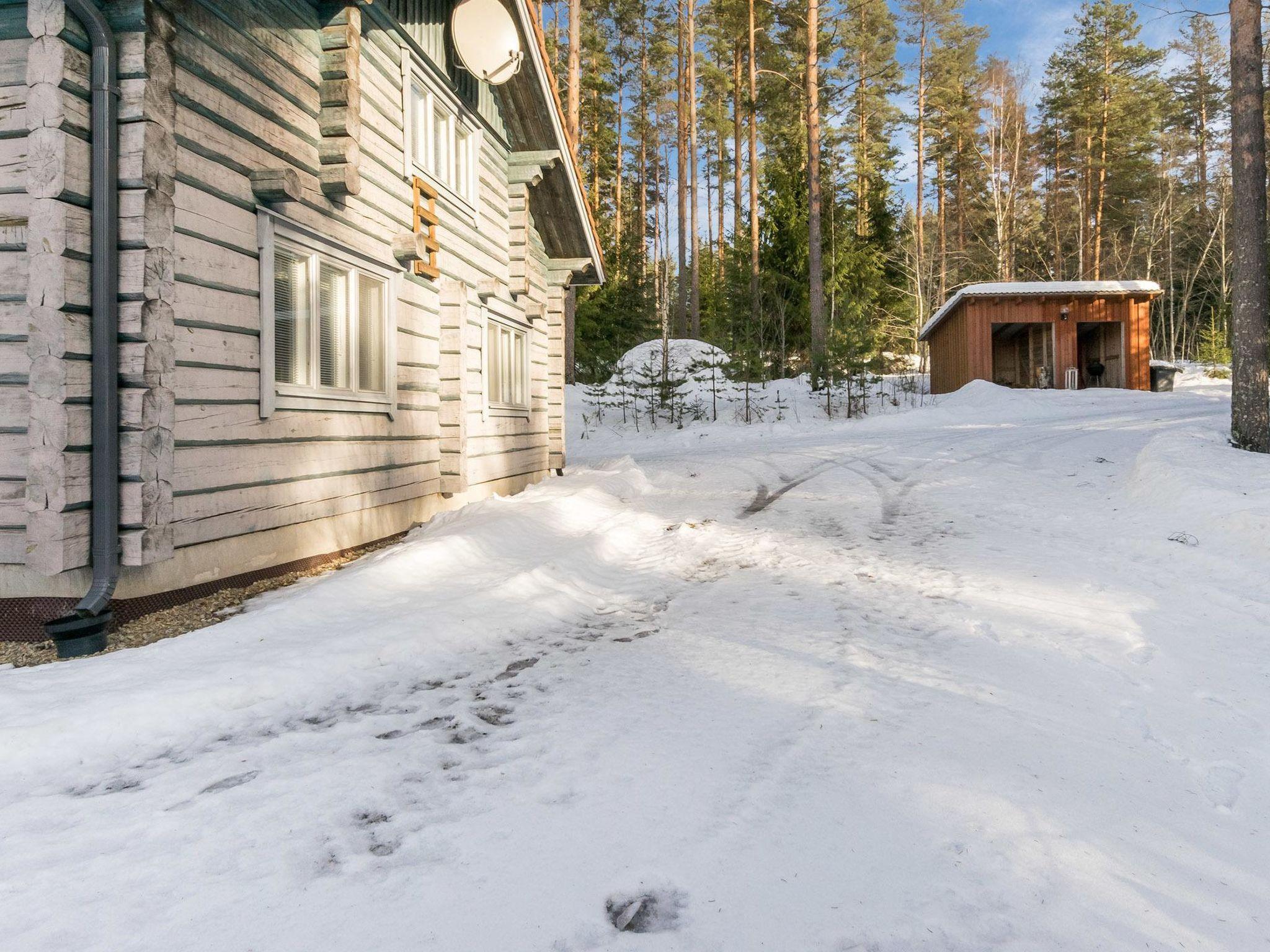 Hand-carved log villa 2006, living room-kitchen, bedroom with double bed, sauna, washroom, dressing room / utility room, hall, wc, terrace. Upstairs bedroom with 2 beds, bedroom with two beds and a children's bed, convertible extra bed for two in the lobby, balcony. 2 x wc, washroom/shower, sauna (wooden heated). Child gate upstairs and downstairs.