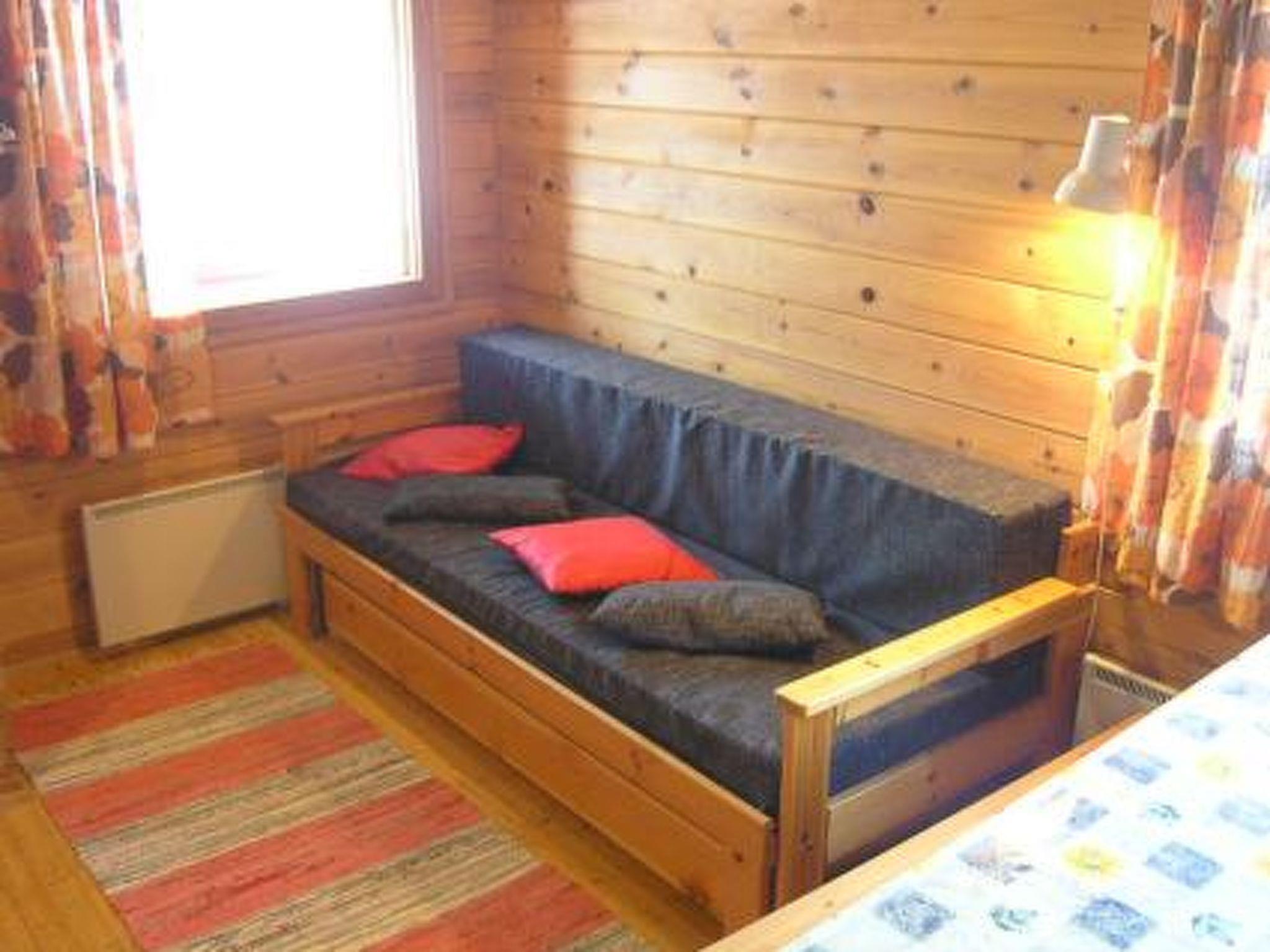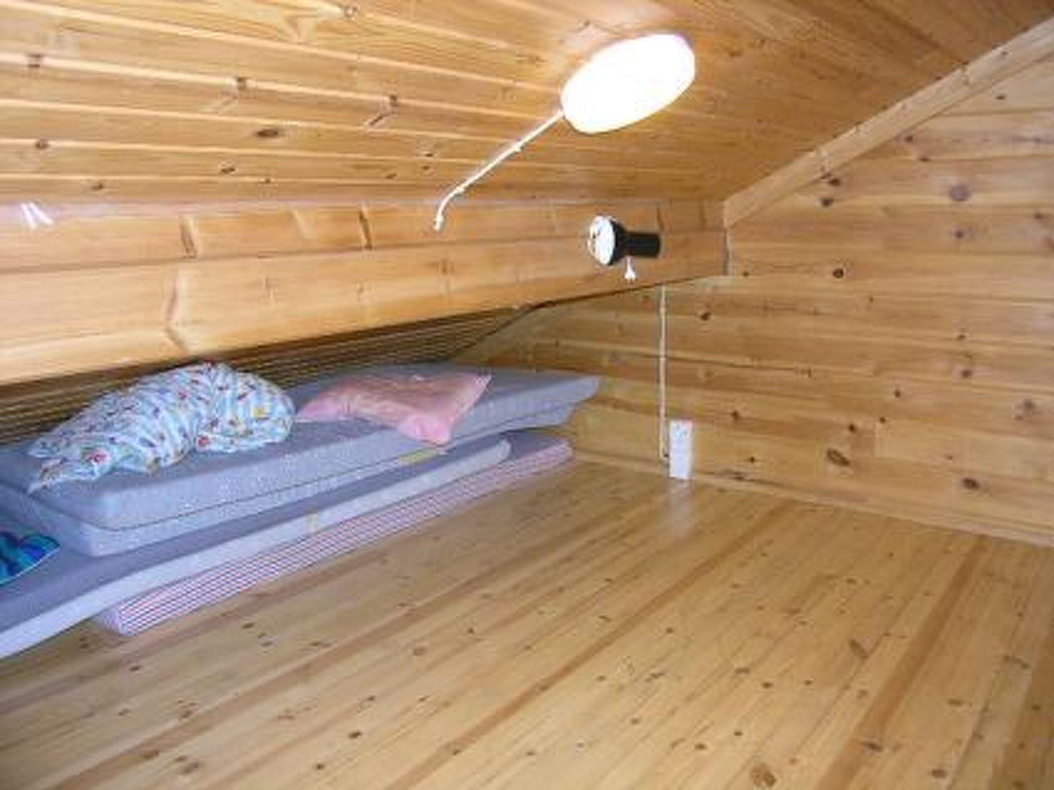Log cabin, paneded inside, built in 1991, livingroom with bunk bed for two, four mattresses on the loft (steep stairs to loft, max. height of 1.35 m), sauna with electric stove, bathroom, separate toilet, covered porch.