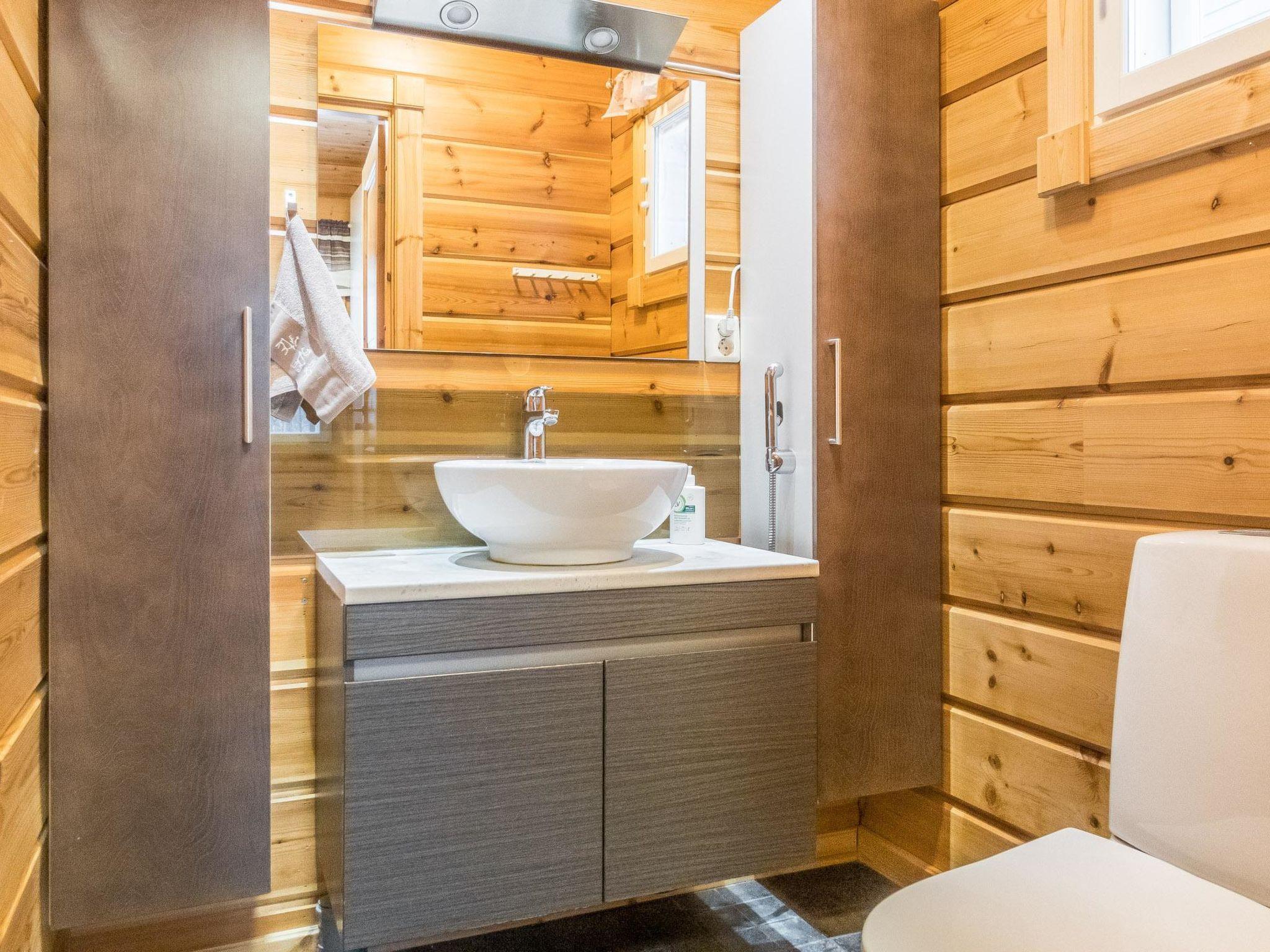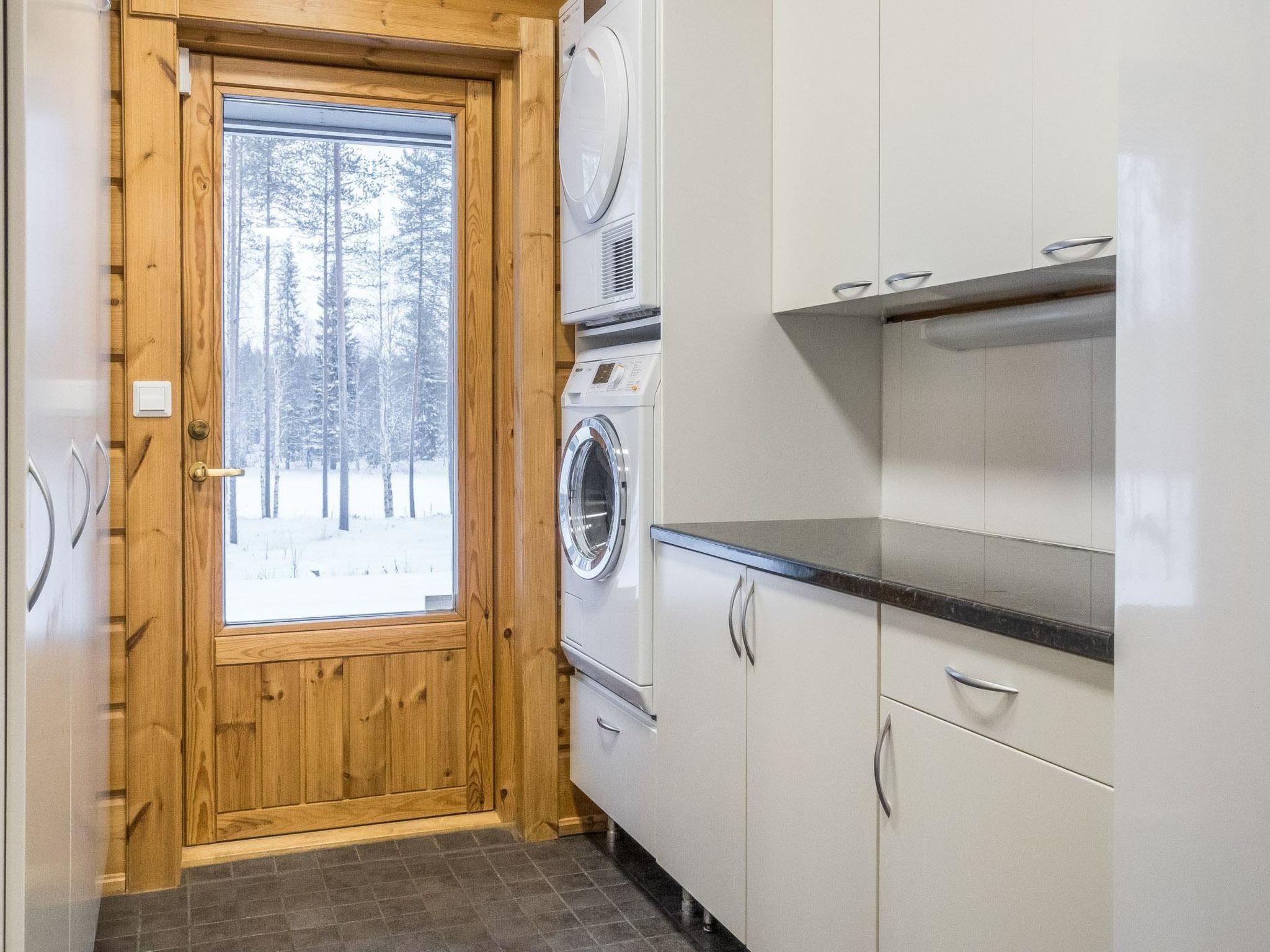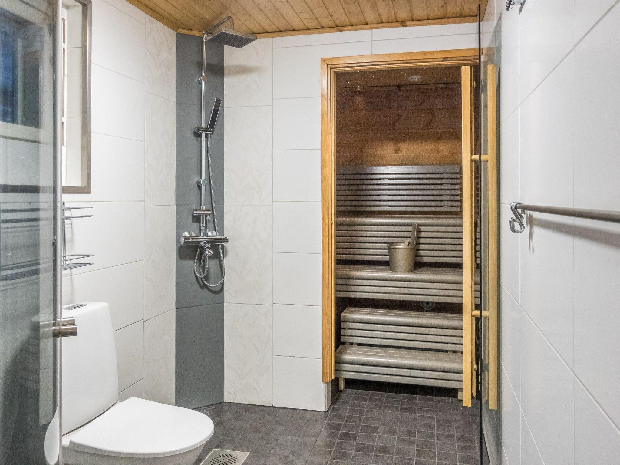 The sauna section includes a spacious sauna, while the bathroom has two showers and a WC. Additionally, the house includes a utility room and another separate WC, making holiday chores easier.