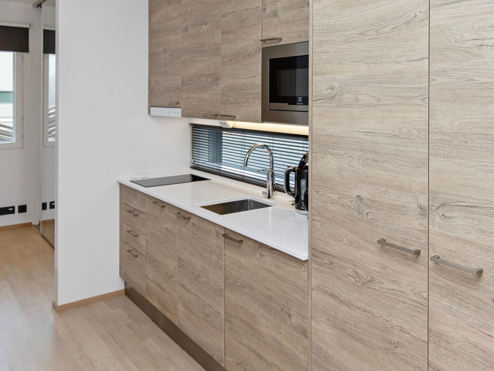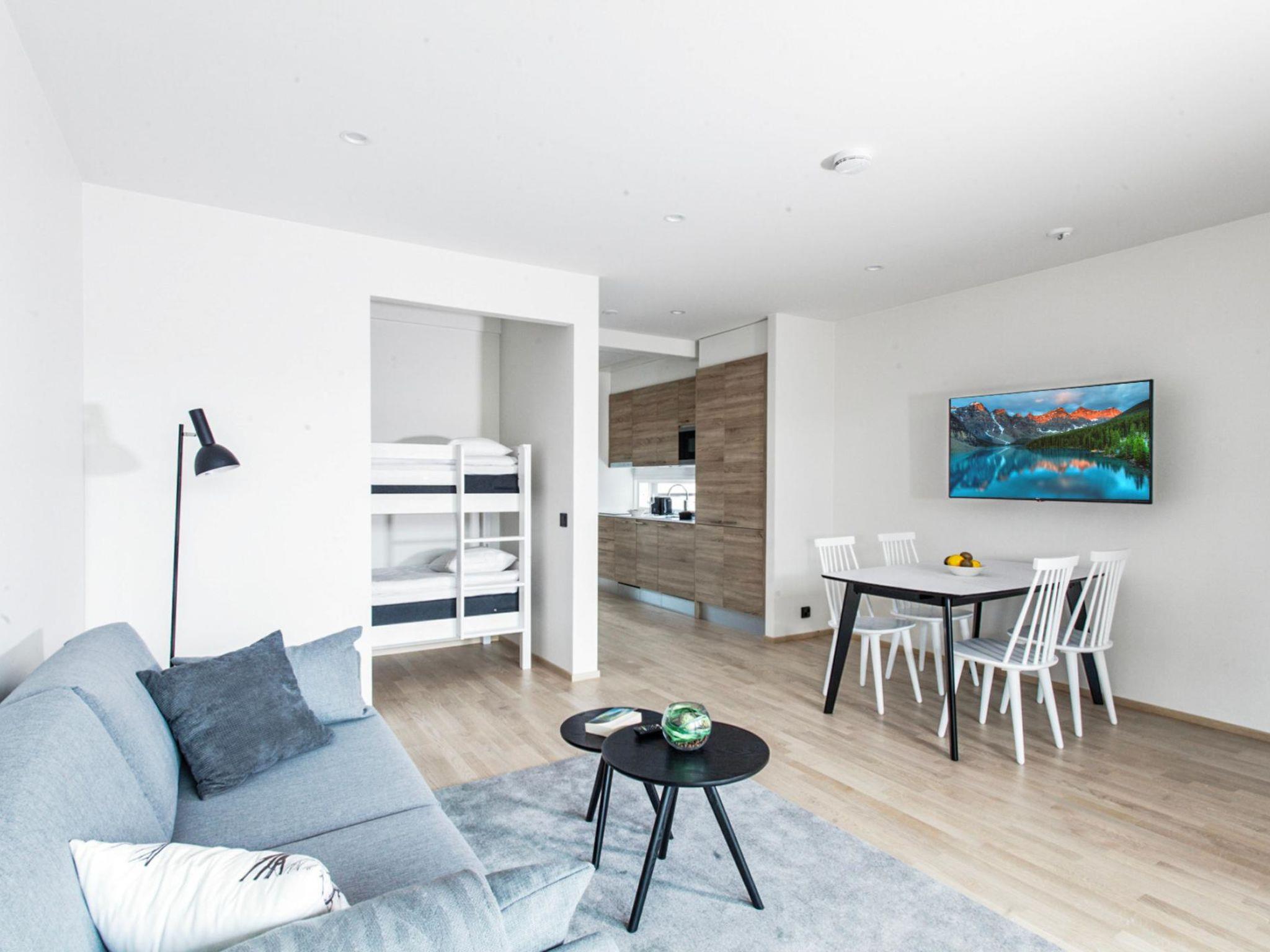 The apartment features a living room/kitchen, a washroom with WC, a bedroom with two separate 80 cm wide beds, a sleeping alcove with an 80 cm wide bunk bed. The apartment does not have its own sauna, but guests have free access to the sauna in the main building’s gym every evening. Lakeside saunas are also available for rental at an extra charge. Access to the gym is included in the price.