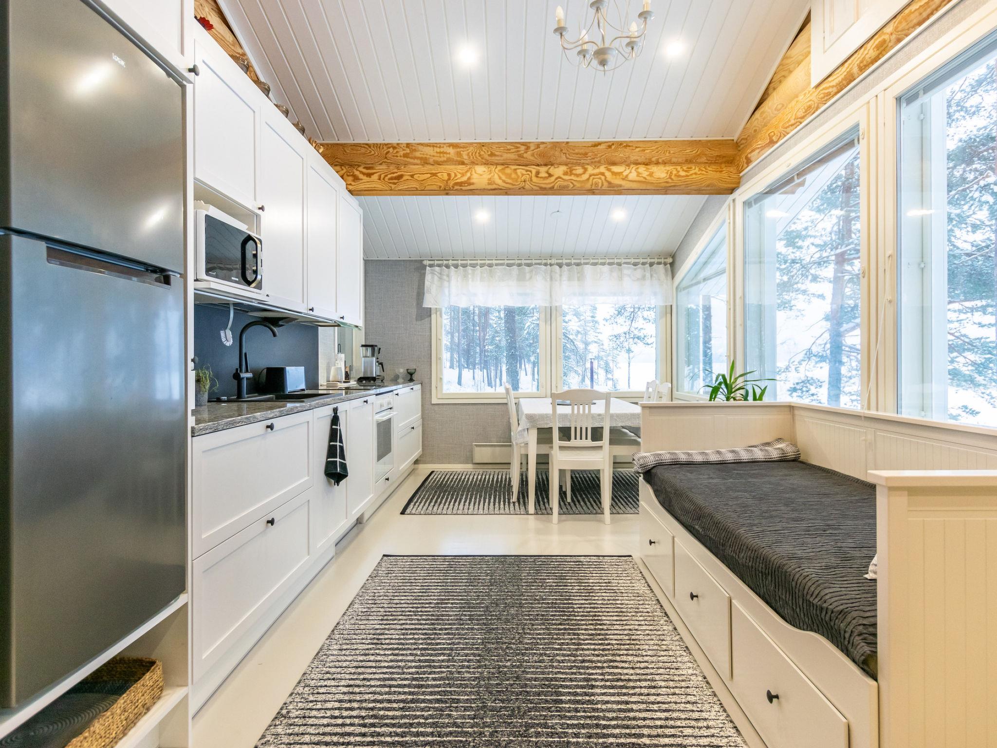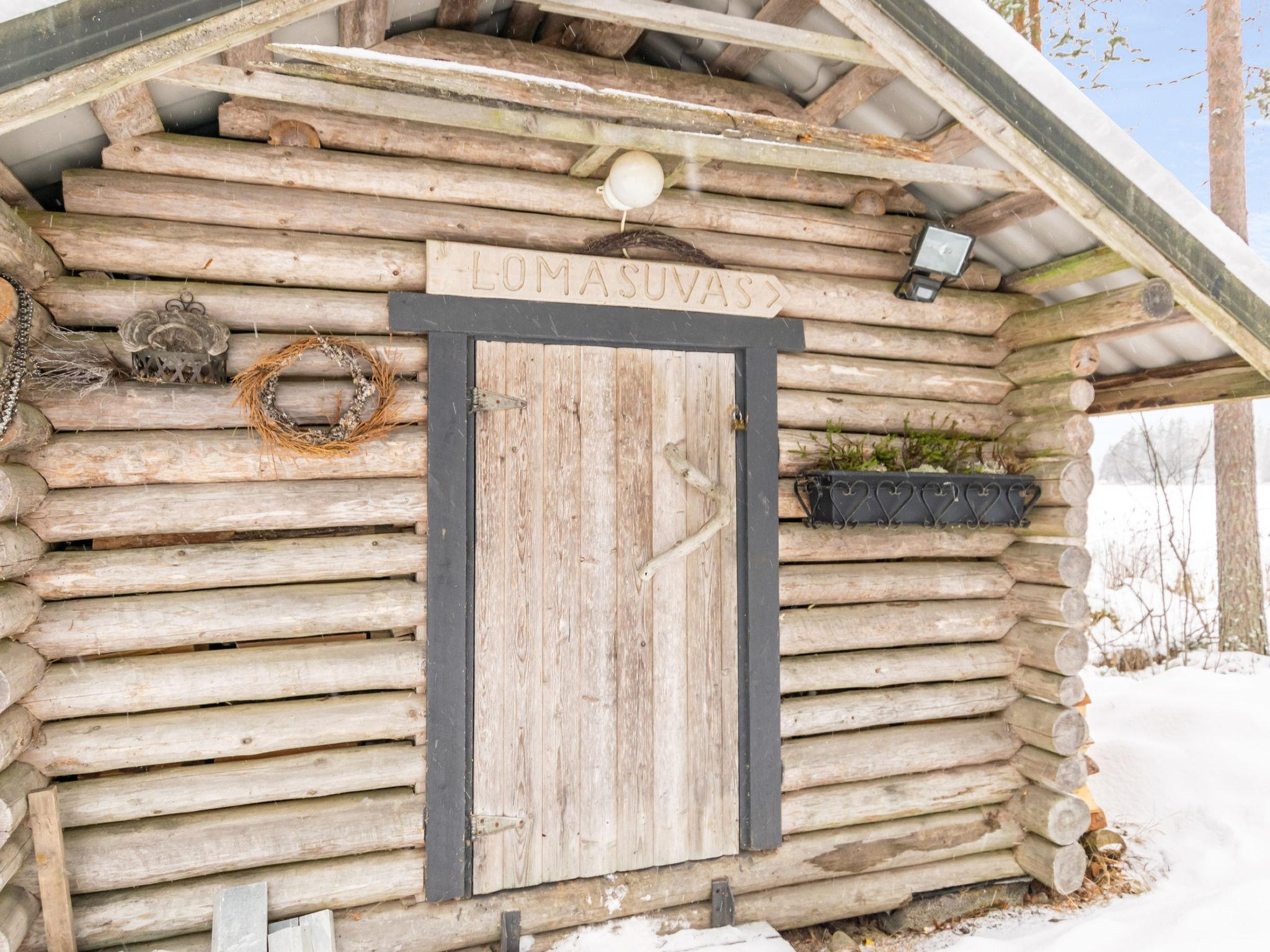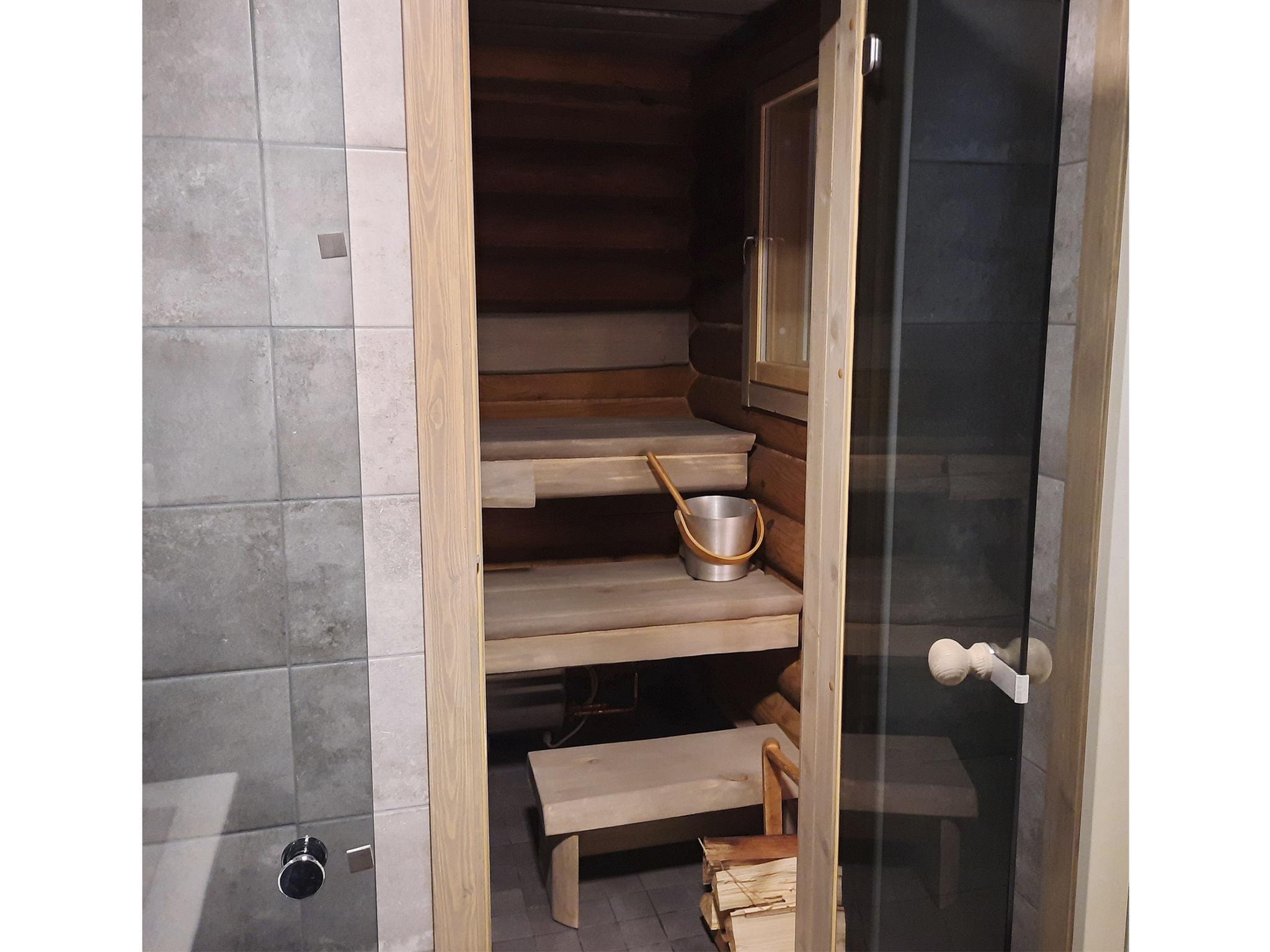 Log building 1994 (expanded 2022), living room - kitchen, a double bed 140 x 200 cm and a sofa bed (160 x 200 cm), washroom with shower and toilet, sauna (wood-burning stove).