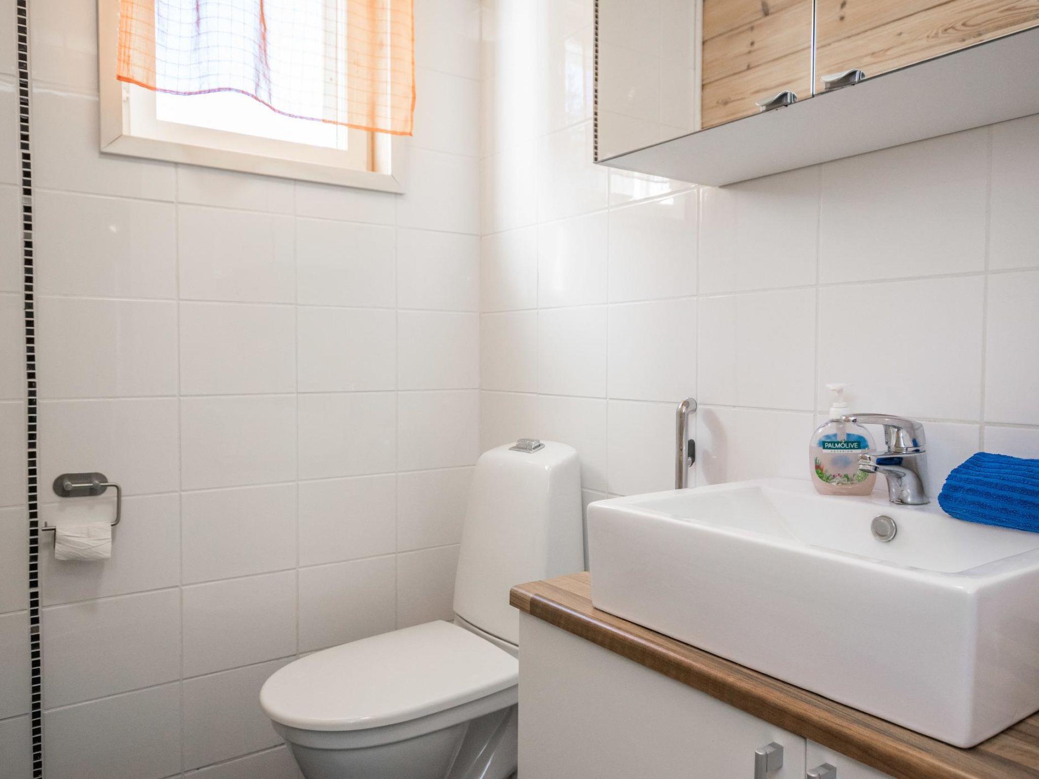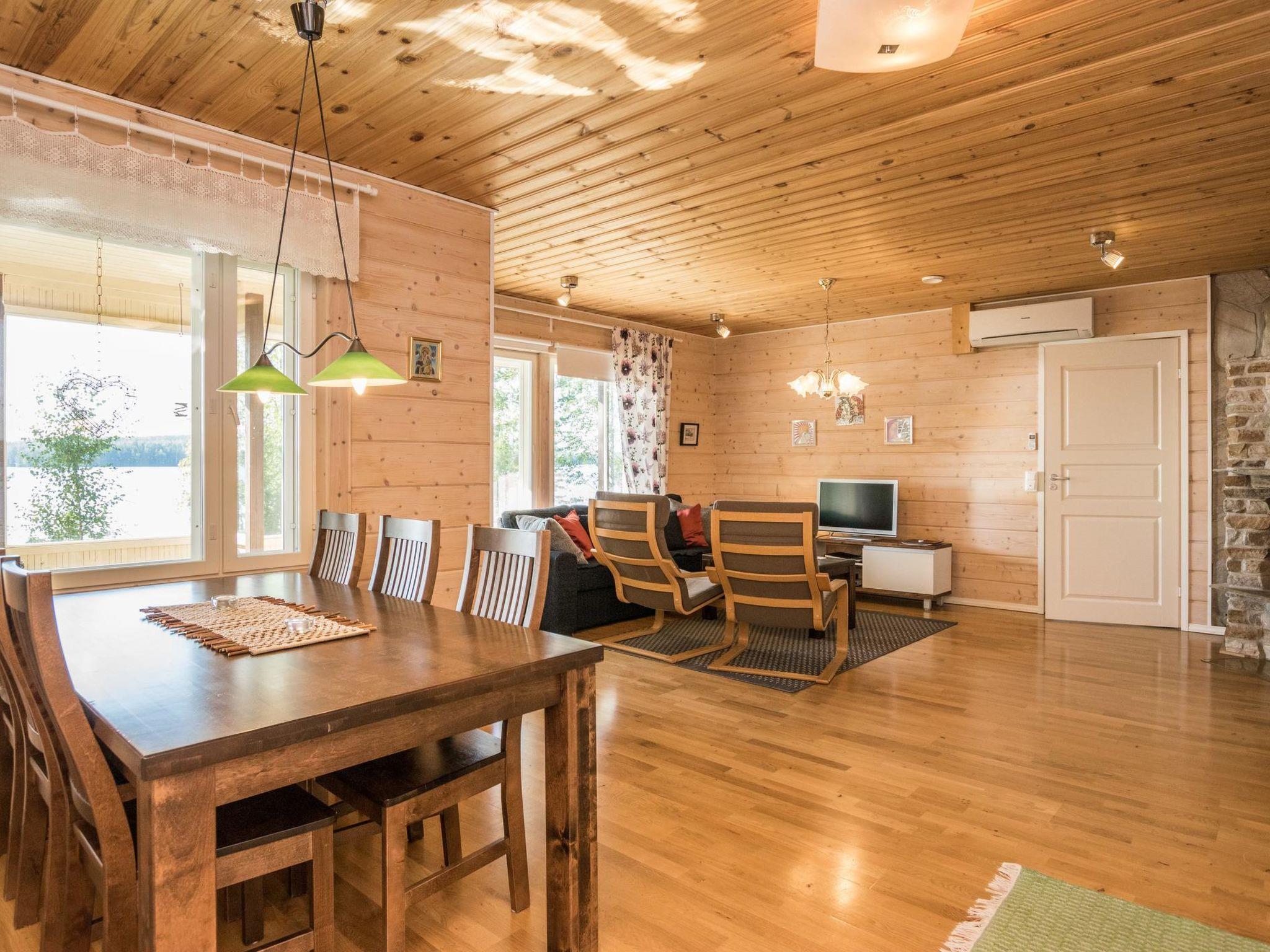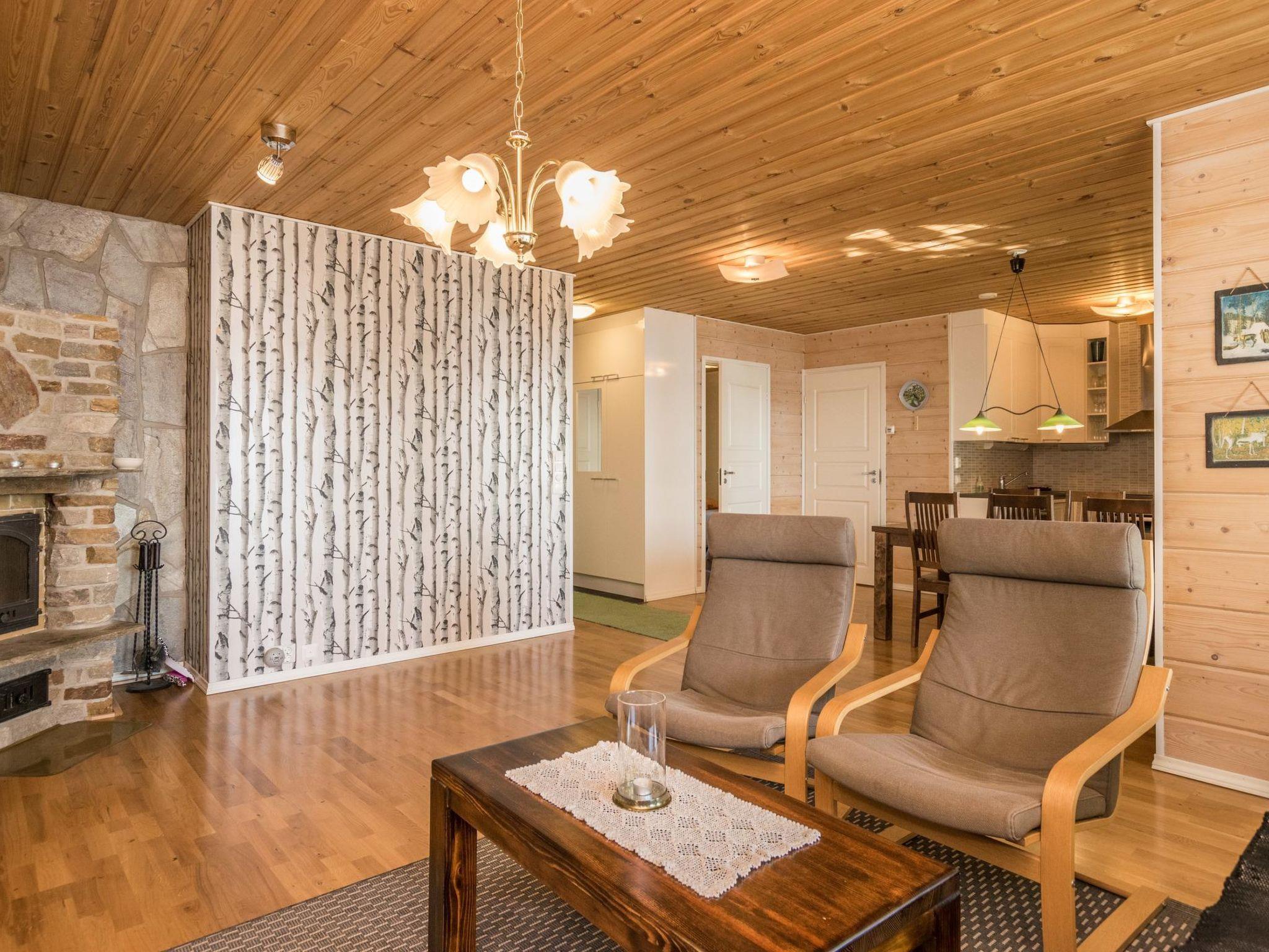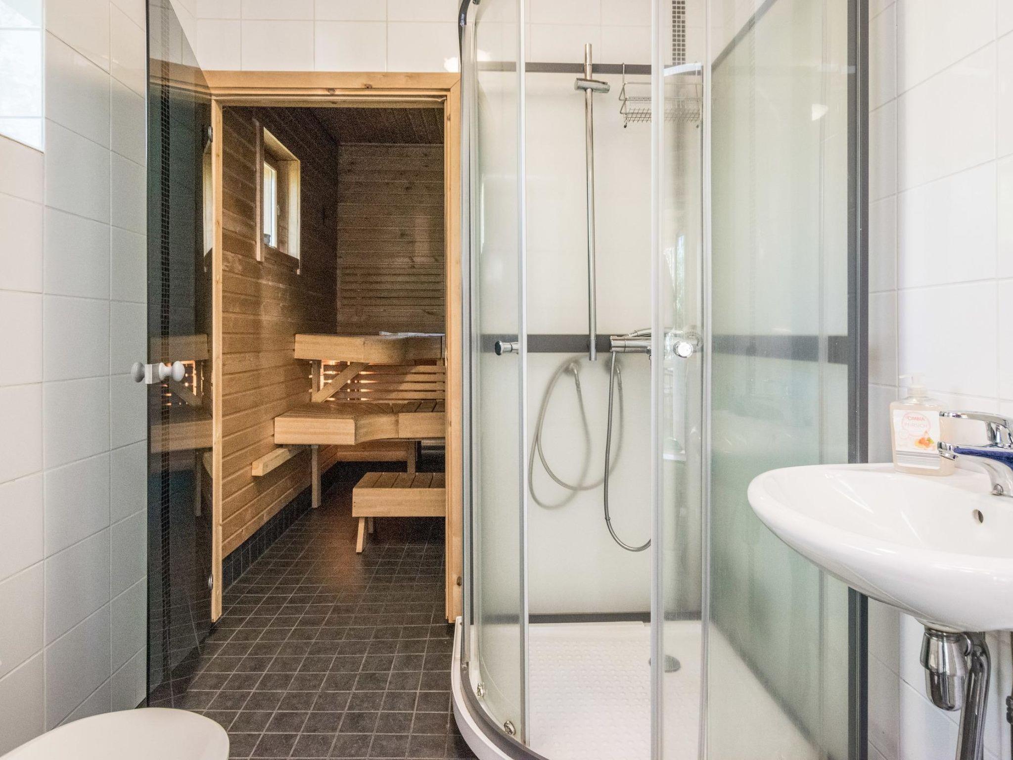 Wooden, inside log-paneled cottage built in 2013, combinated kitchen-living room with sofa bed for two, vestibule, bedroom with double bed and extra bed, bedroom with 2 beds, washroom with walk-in shower and toilet, wood heated sauna, utility/dressing room, spacious glass terrace with two seating groups.