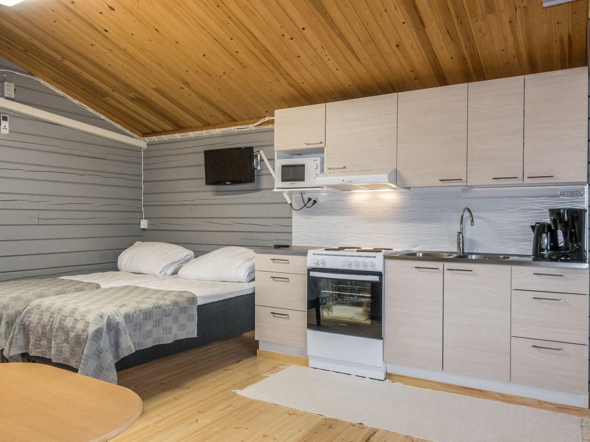Planed log cabin, built in 1990, completely renovated in 2023. Living room/kitchen with 2 beds and sofa, shower room, toilet, dressing area, small covered terrace on the river side.