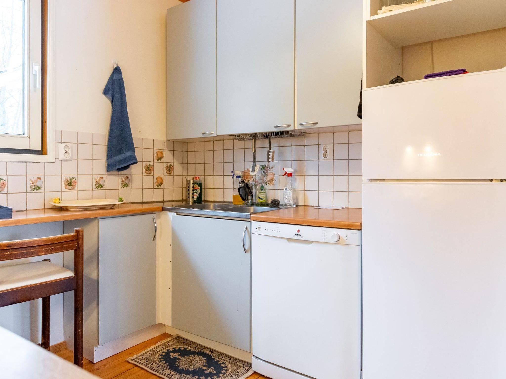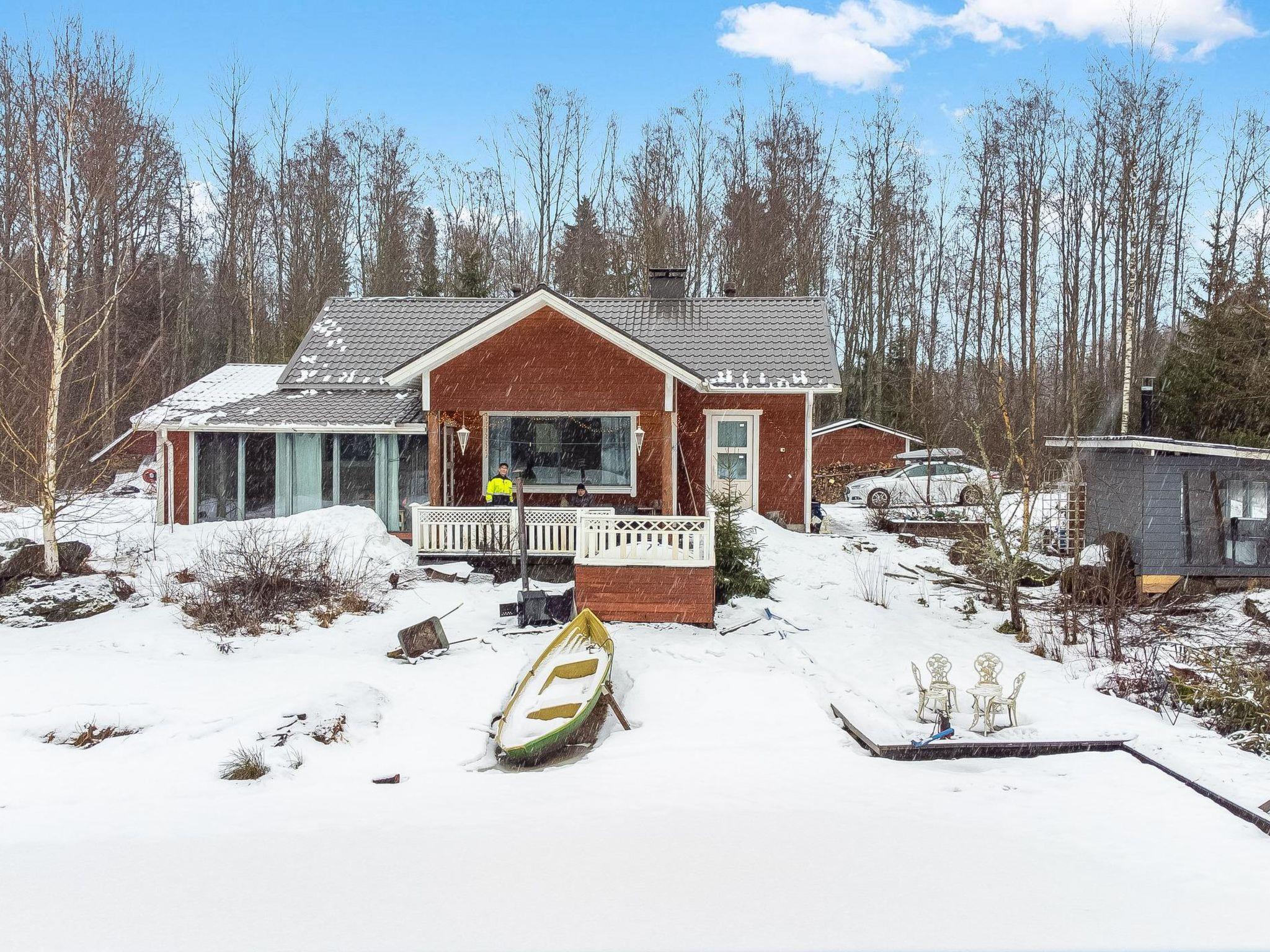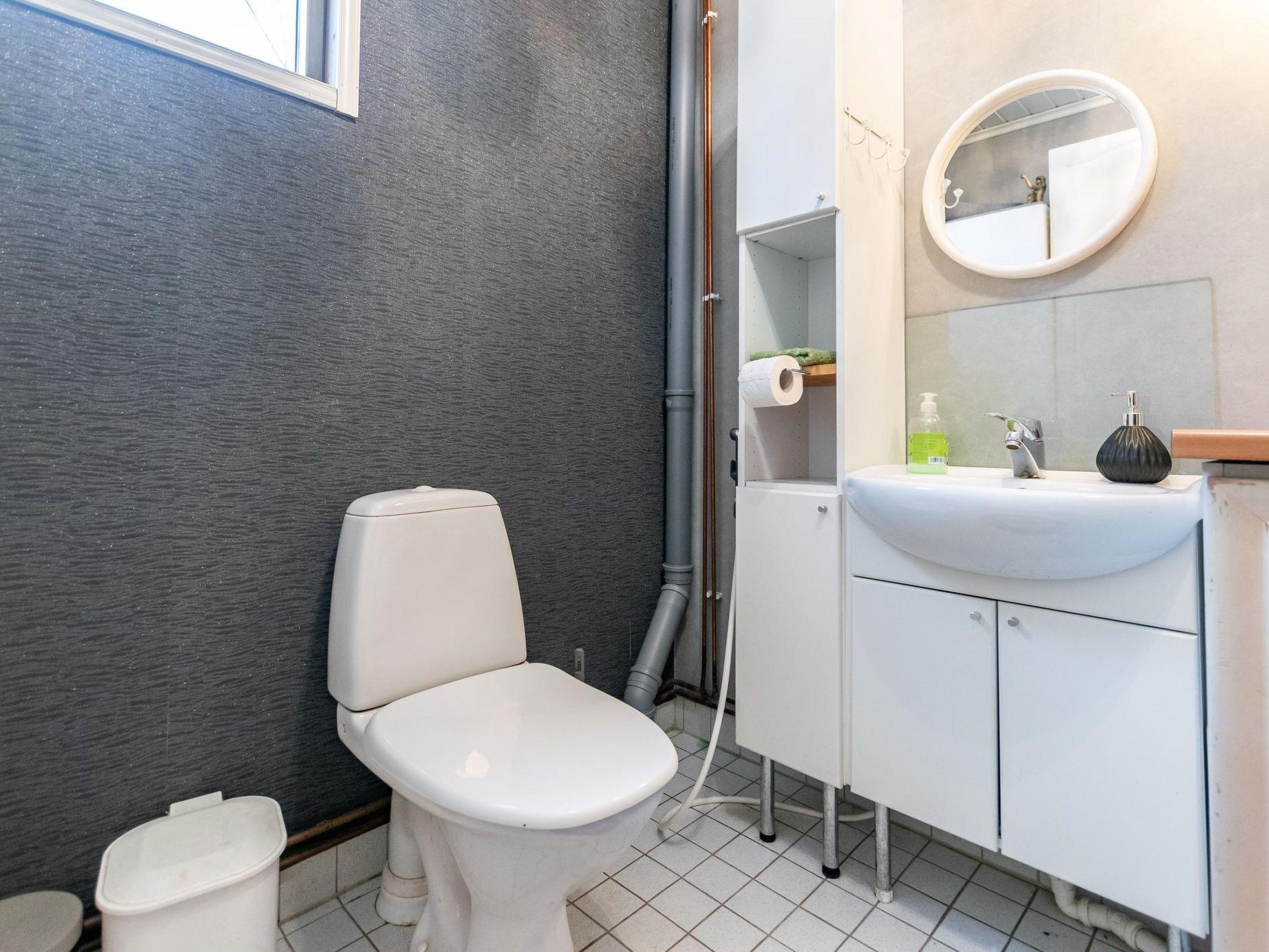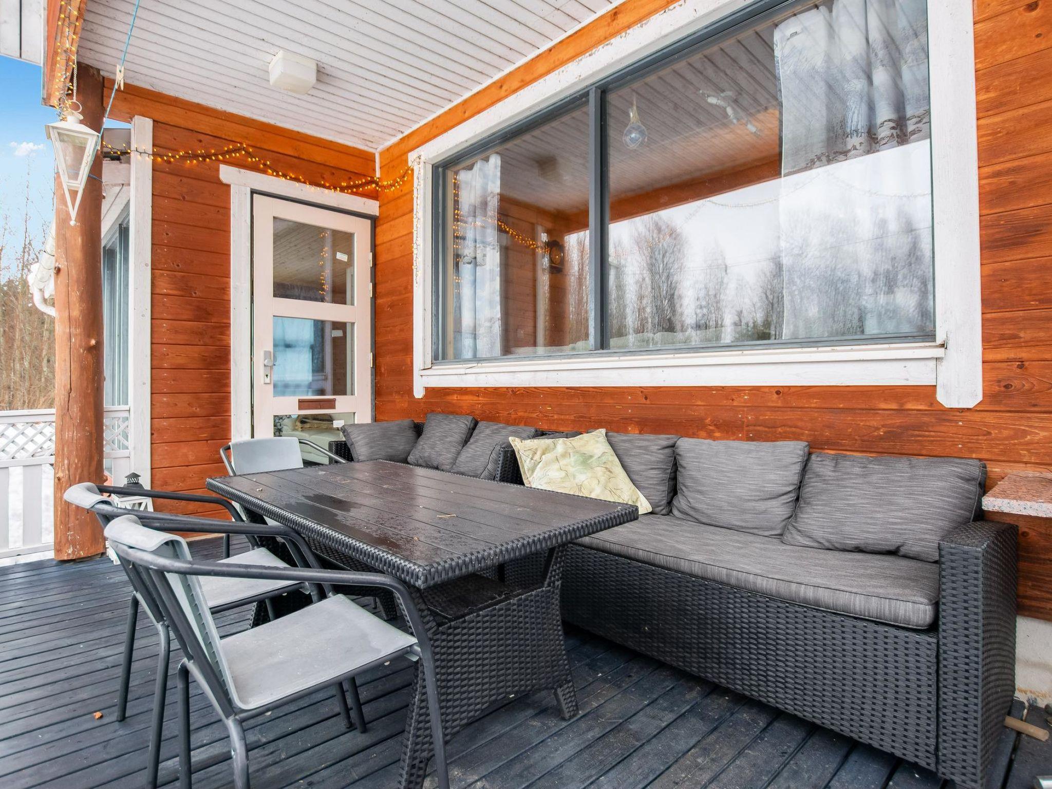 Washroom with a shower and access to the terrace. The sauna features a wood-heated sauna stove. Separate WC/utility room with a washing machine. The glazed porch has a sofa and chairs, as well as an additional 120x200 cm bed. This bed serves as an optional sleeping place and is not counted in the official accommodation capacity.