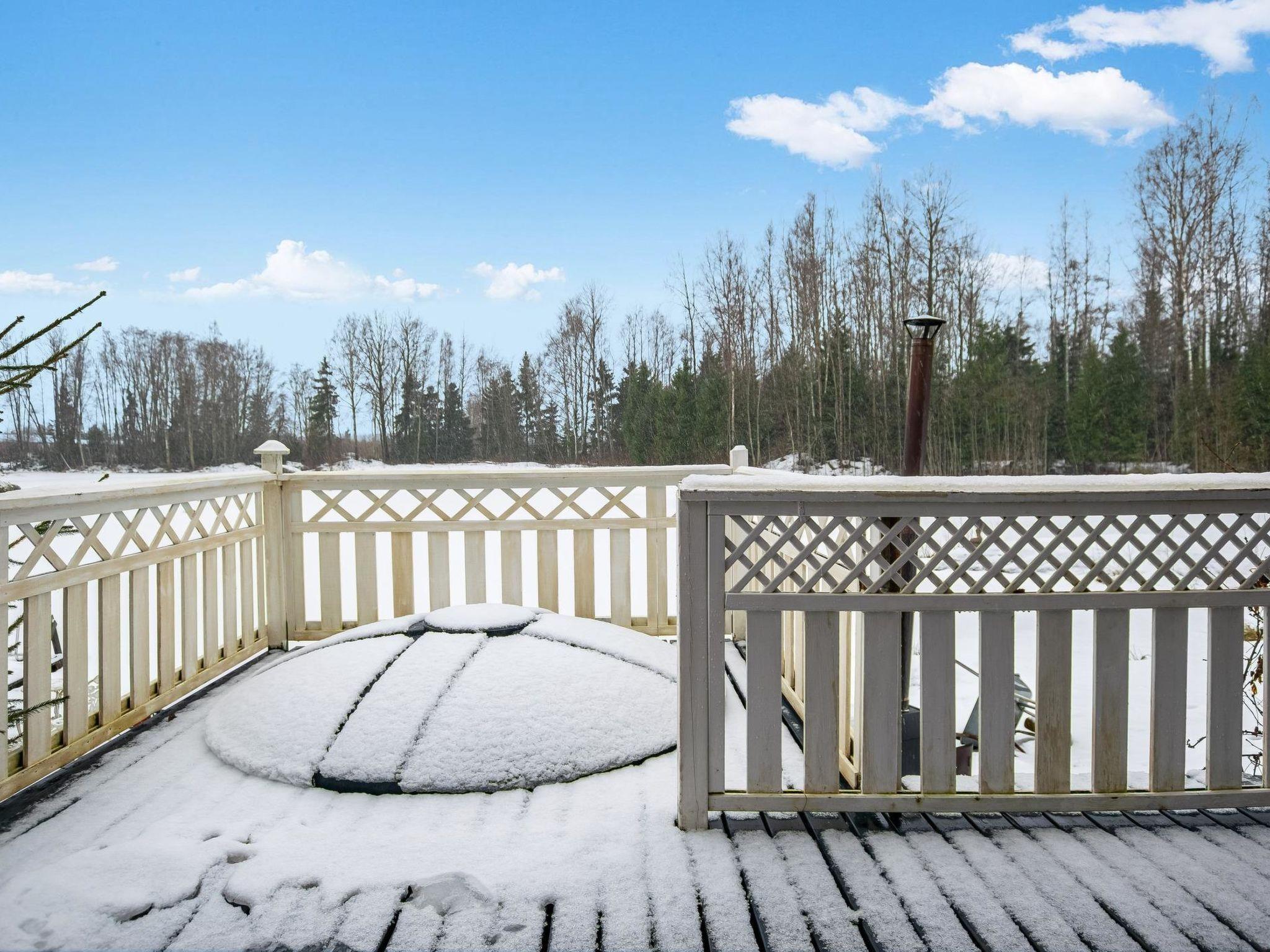 The cabin is located directly by the water, on the shore of a private pond. The terrace features a wood-heated hot tub available for rent at an additional cost. Next to the terrace, there is a grill hut with a grill.
