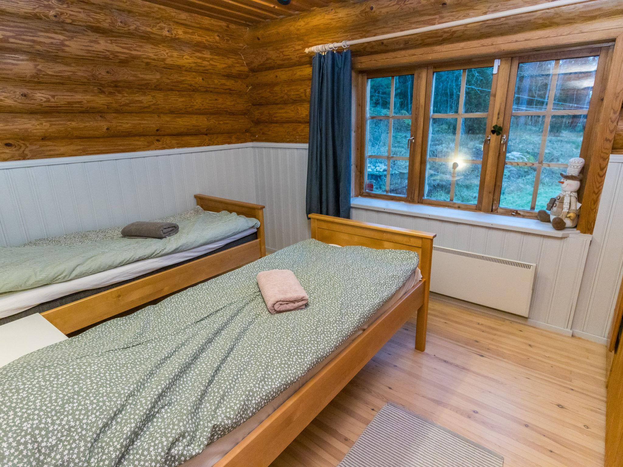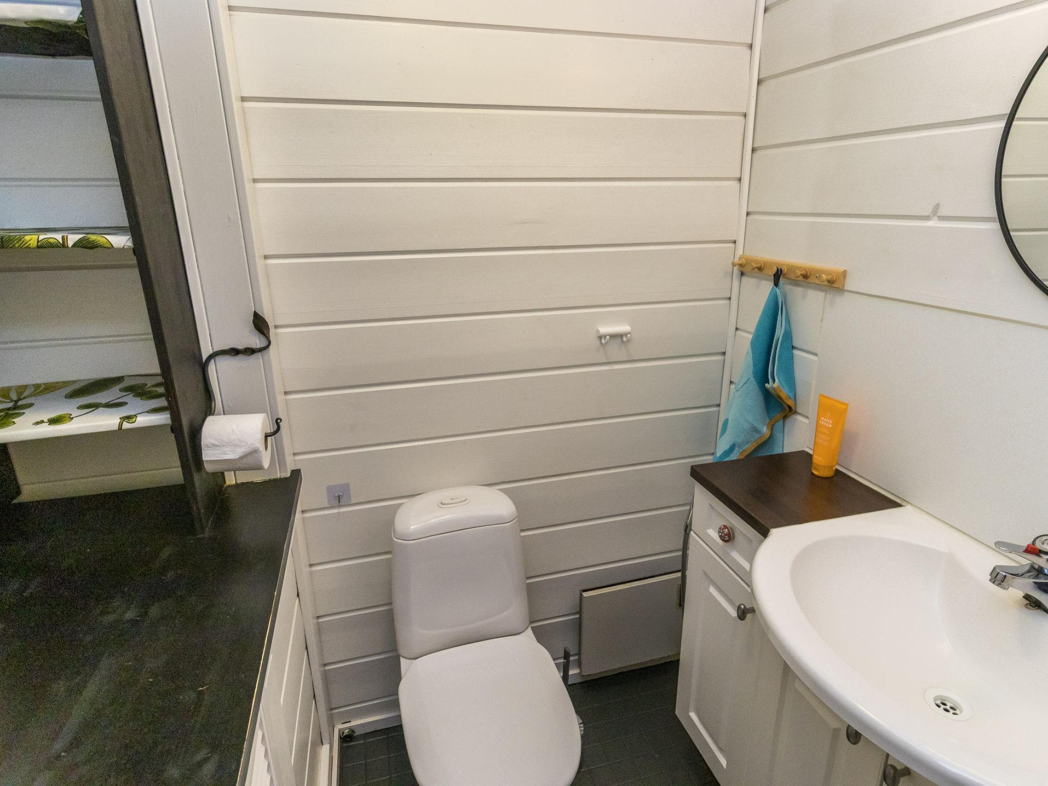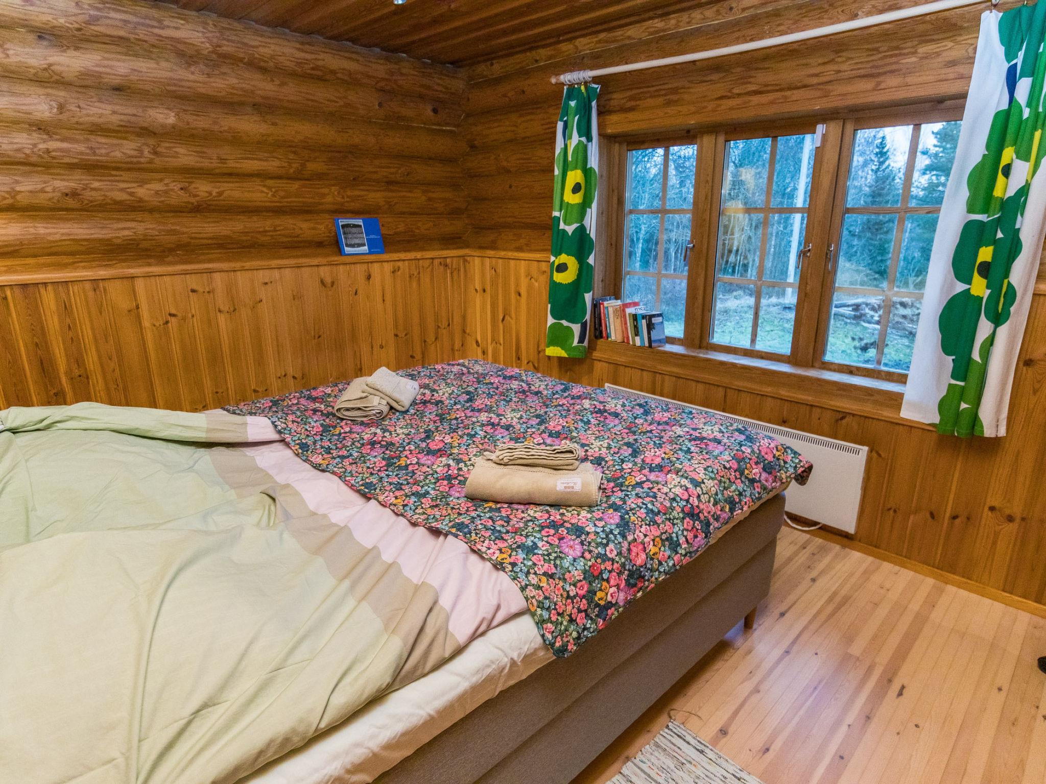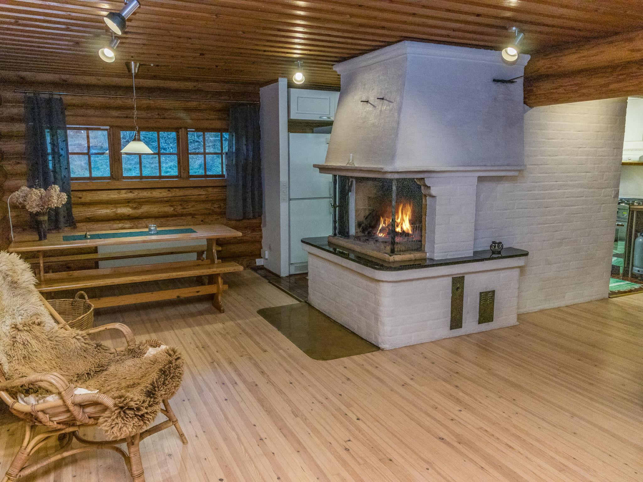 The cabin features a spacious living area with a dining space, a well-equipped kitchen, and two bedrooms — one with a double bed and the other with two separate beds. Additional facilities include a separate WC, a dressing room with a sofa bed that can be converted into an extra bed, a washroom with a shower, and a cozy wood-heated sauna. Outside, a campfire site invites you to enjoy evenings outdoors. Although the neighboring plot is close by, its limited use ensures a peaceful stay.