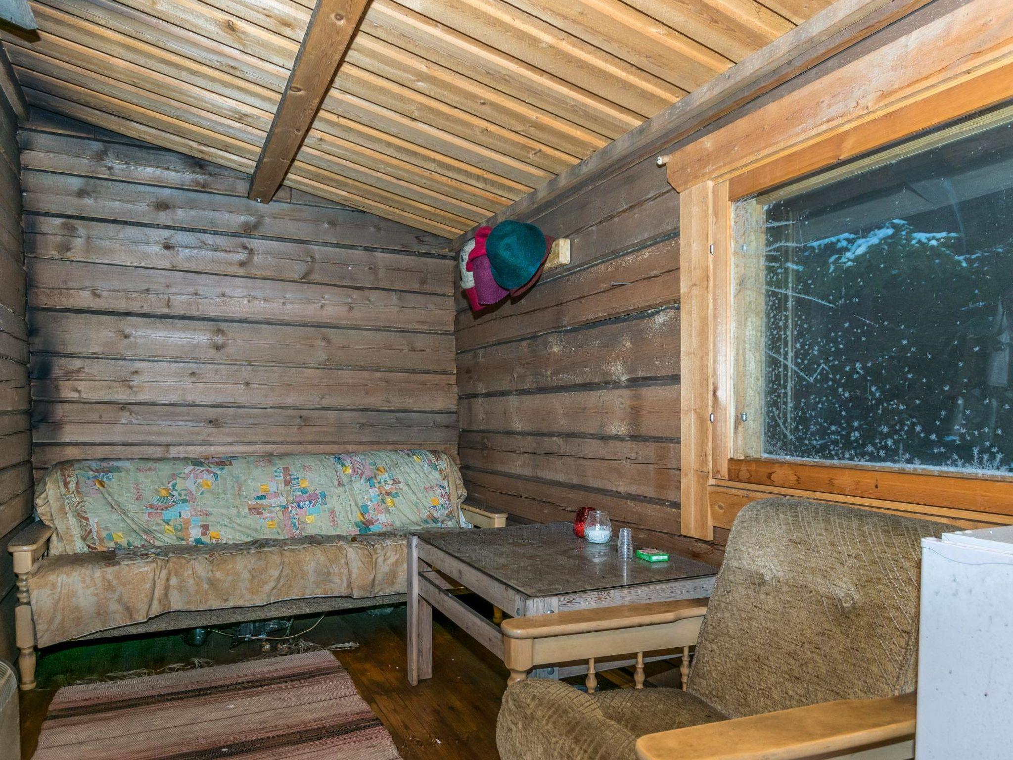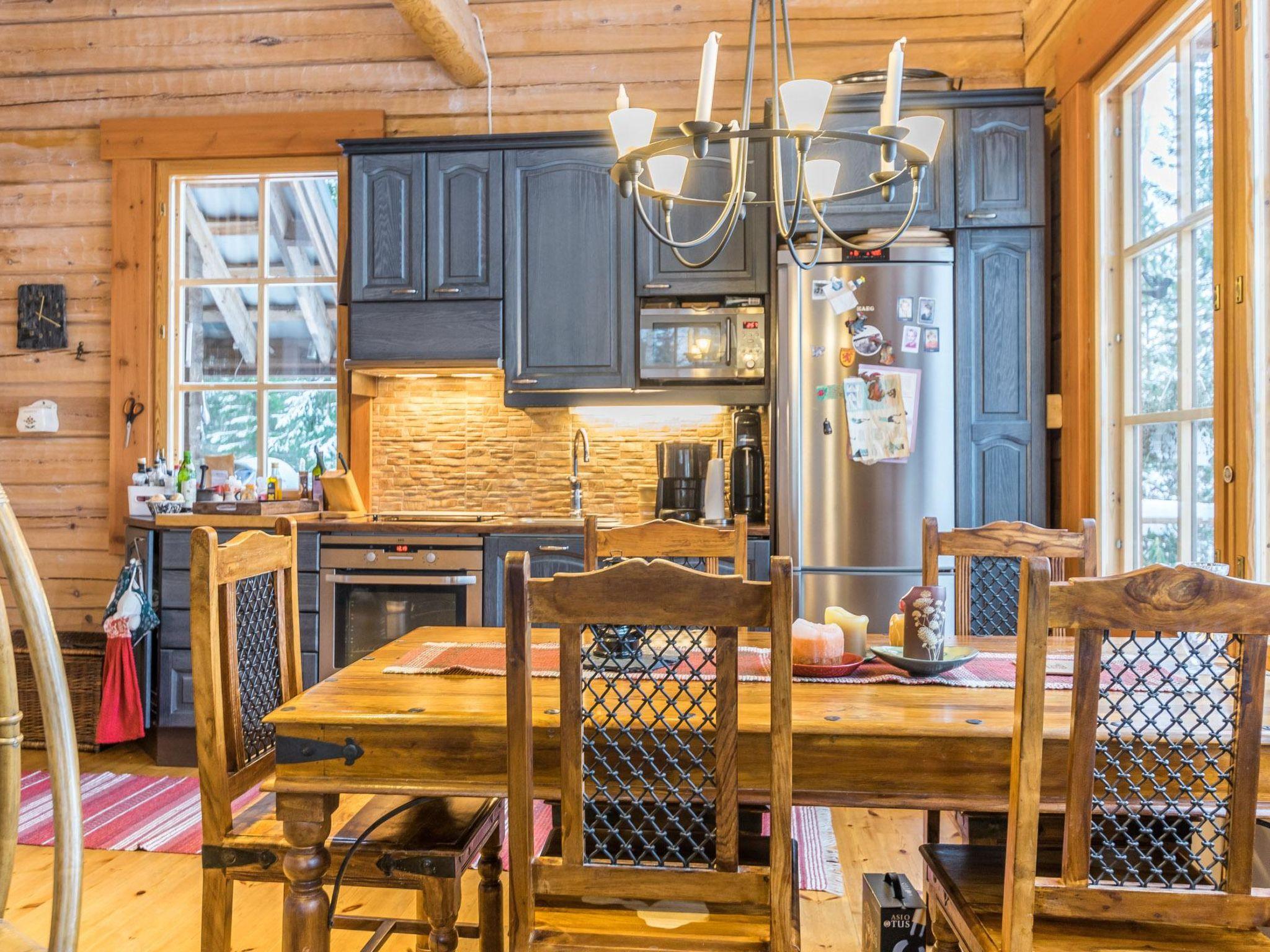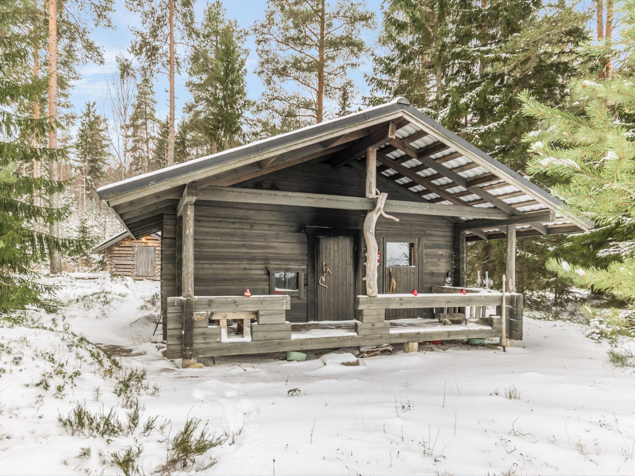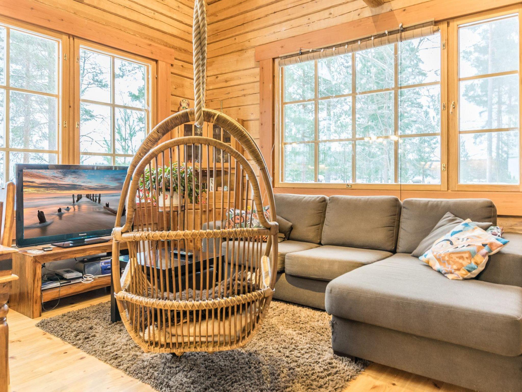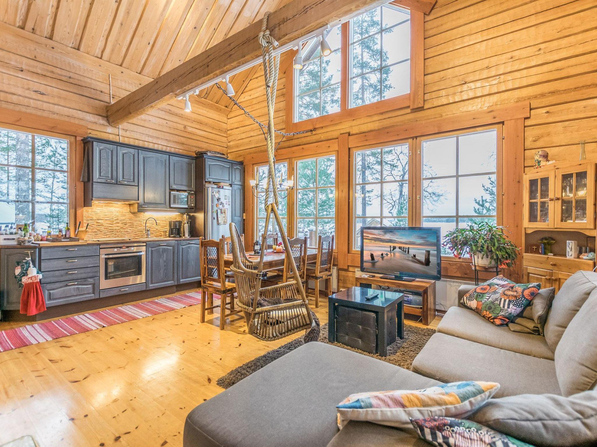 Log cabin with cozy decor and large windows offering a great view of Lake Keitele.