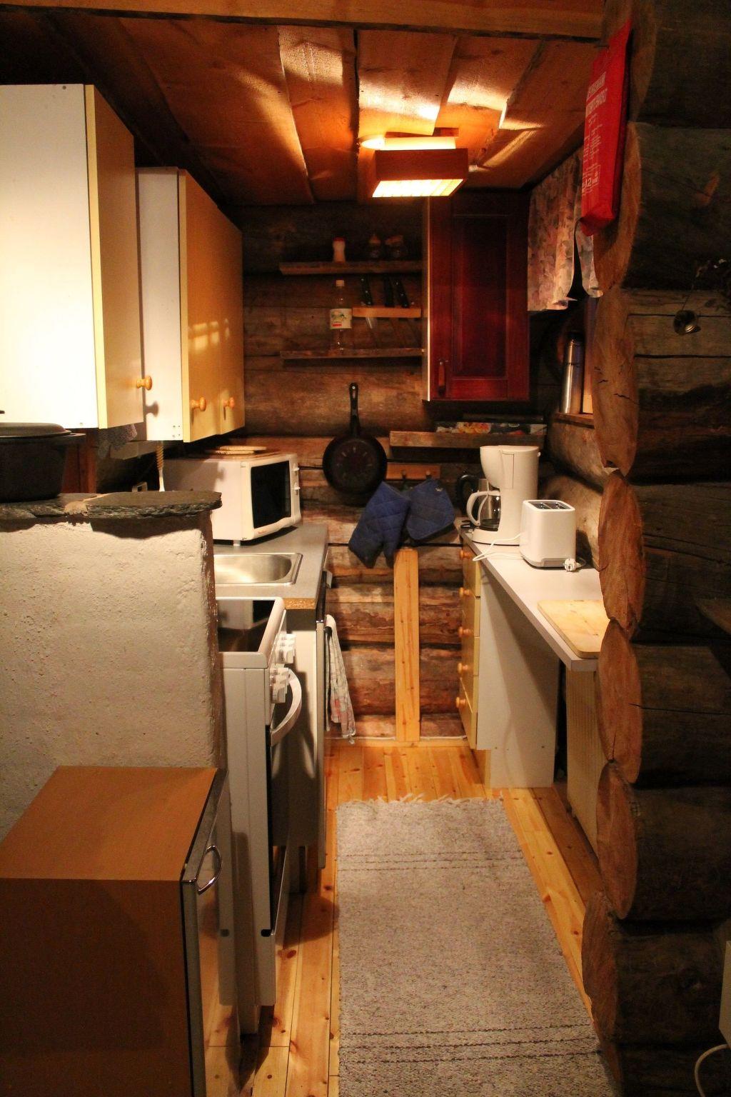 The wooden house with reliable electric heating was built in 1989 in a typical rustic and cosy Lapp style. It comprises a main floor and a mezzanine level with a light living and dining room, a fully-equipped small kitchen, two bedrooms and two additional sleeping areas, a bathroom with toilet. The living room provides a comfortable sofa, a wide flatscreen TV and a dining table with chairs. The large, open fireplace built into the wall enhances the cosy atmosphere and exudes pleasant warmth on cooler evenings. Of the bedrooms next to it, one is furnished with a spread double bed (160 x 200cm), the other with a bunk bed (2 x 90 x 190cm). The kitchen is equipped with an electric hob, oven, fridge with freezer compartment, microwave, kettle, toaster and coffee machine. The water has drinking water quality. The bathroom is fitted with a shower , a washbasin with a wall mirror and a toilet. After a long day in nature, you can relax in the wood-fired in-house sauna with ample space for four people. A wide wooden ladder leads up to the mezzanine level and the two additional sleeping areas with two double mattresses (140 x 200cm). Bed linen and towels are provided, but must be ordered in advance and payed in advance, before the arrival to the hut. Plenty of firewood is provided and is included in the rental price.
