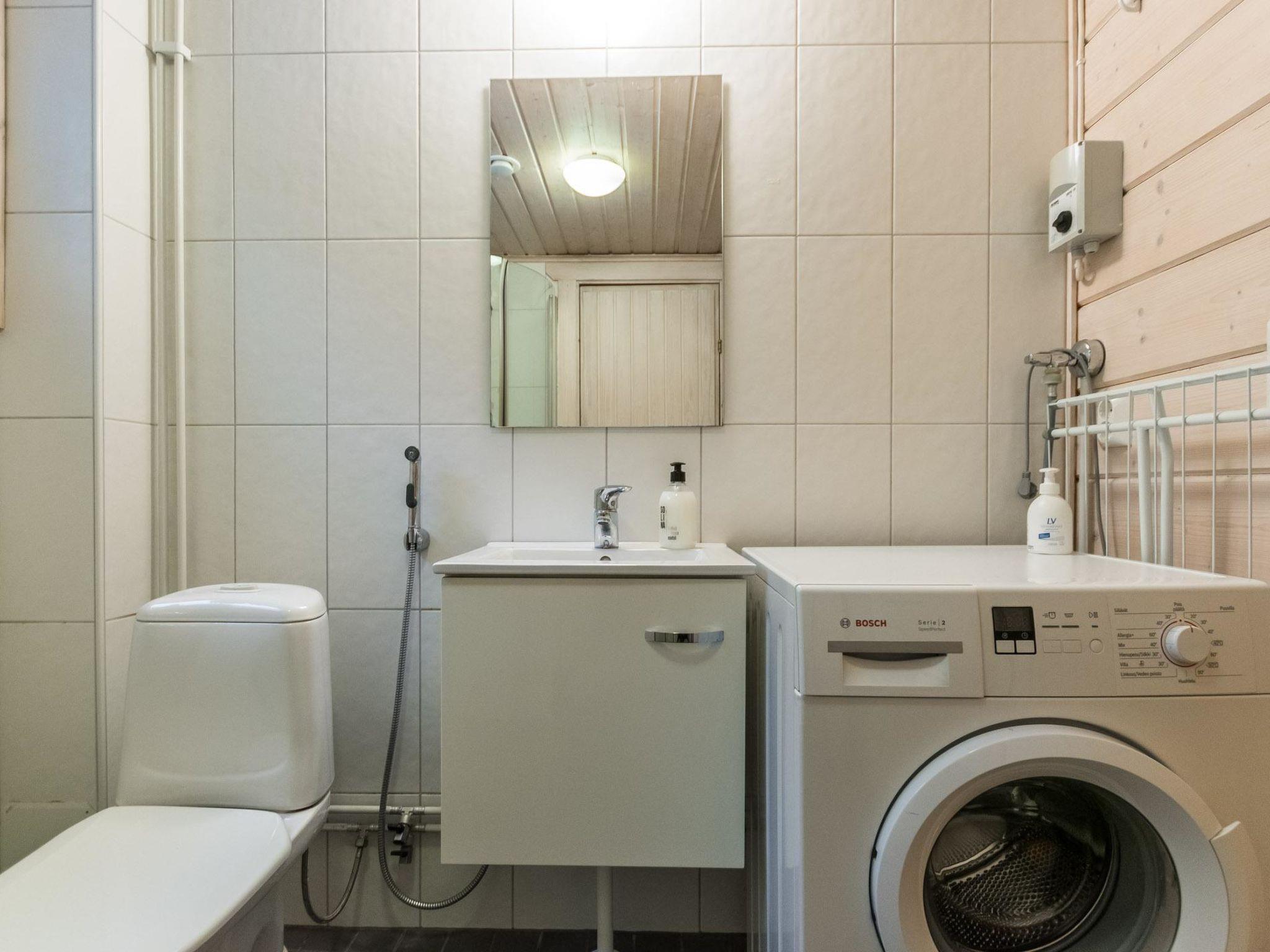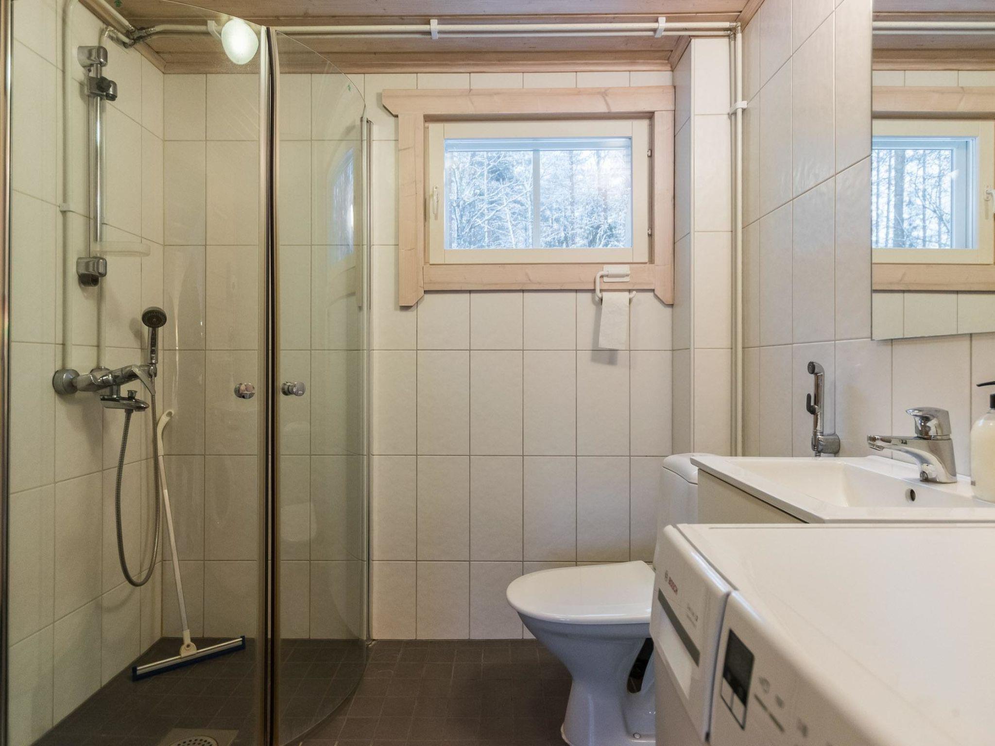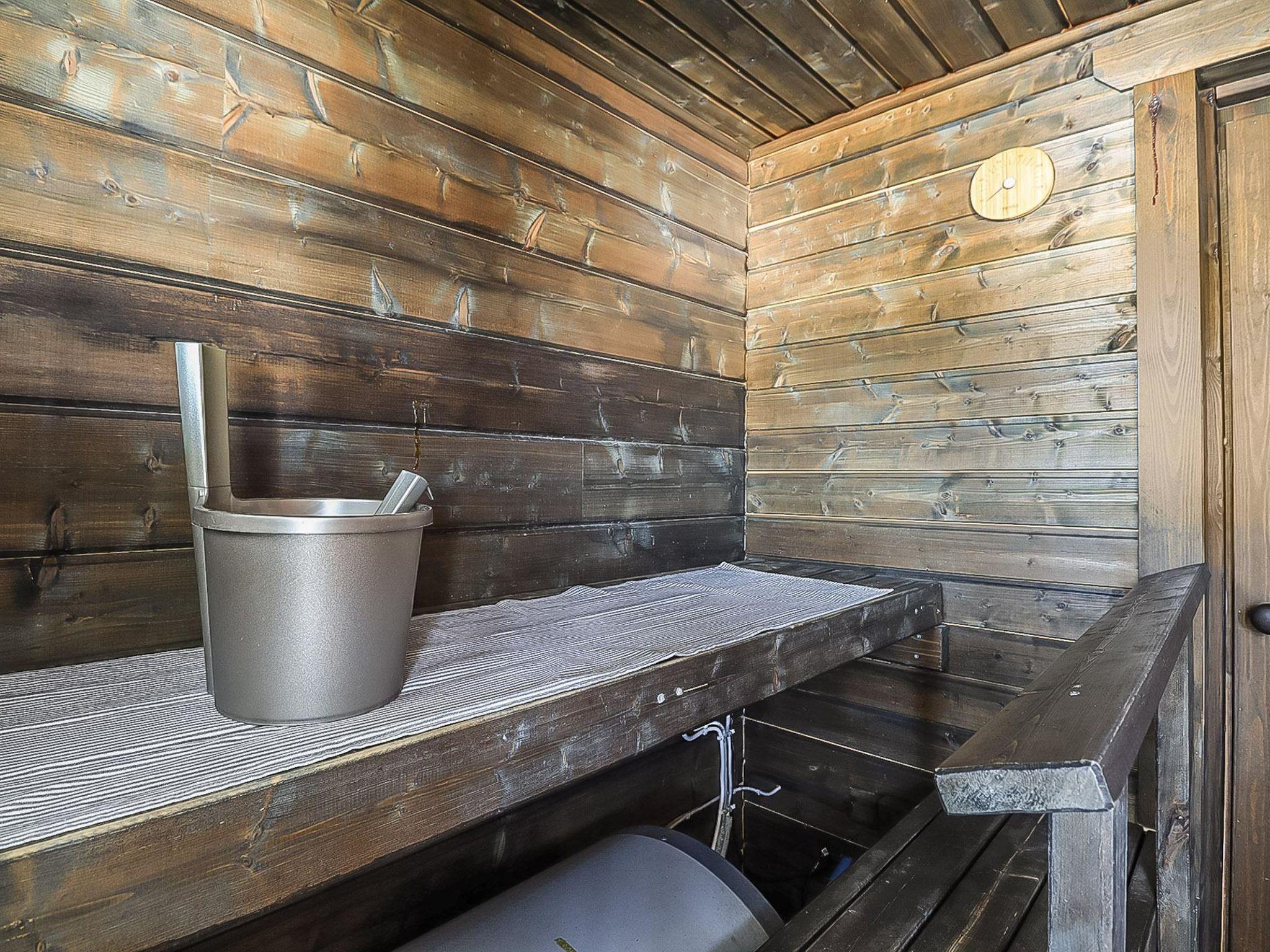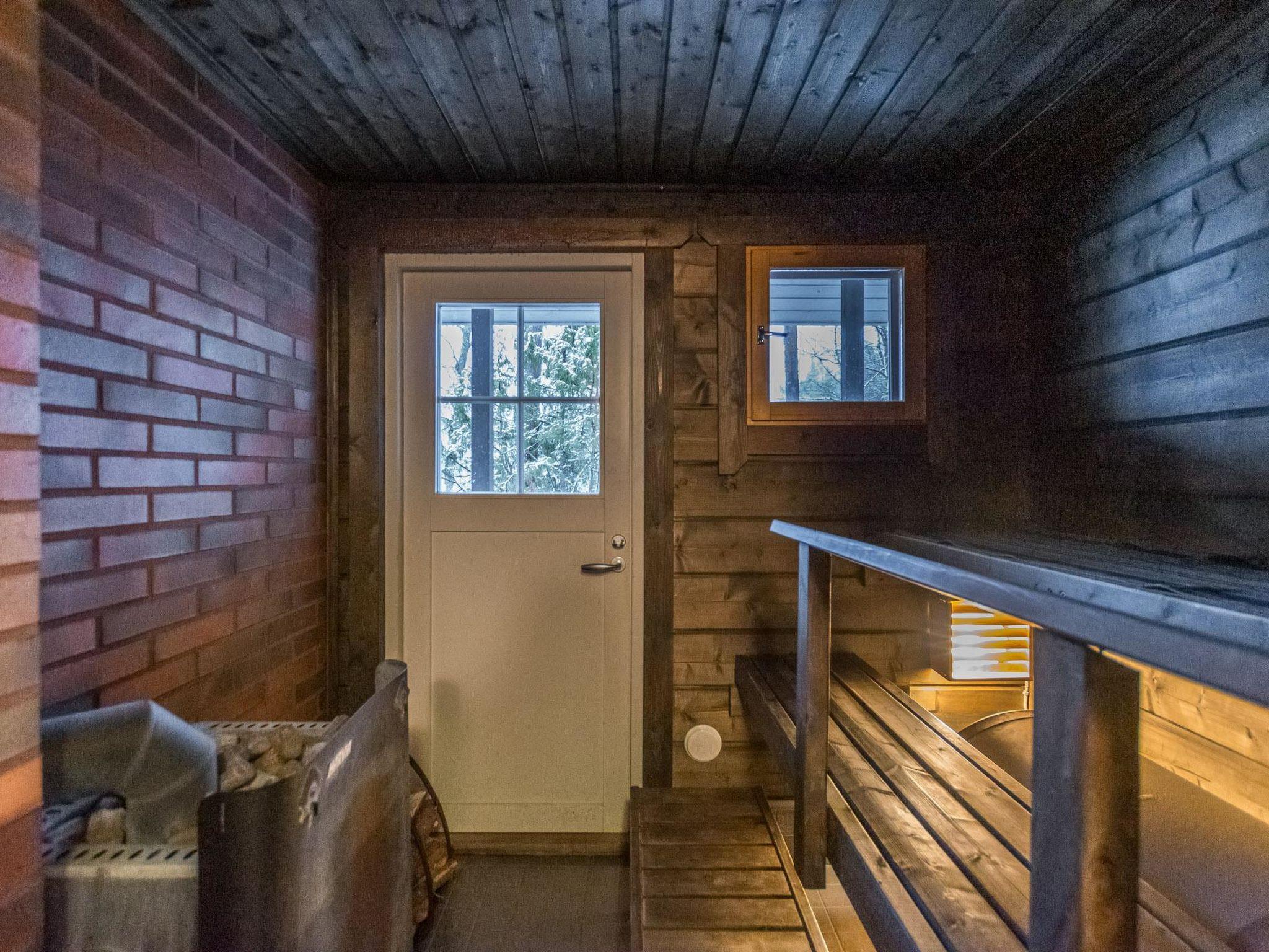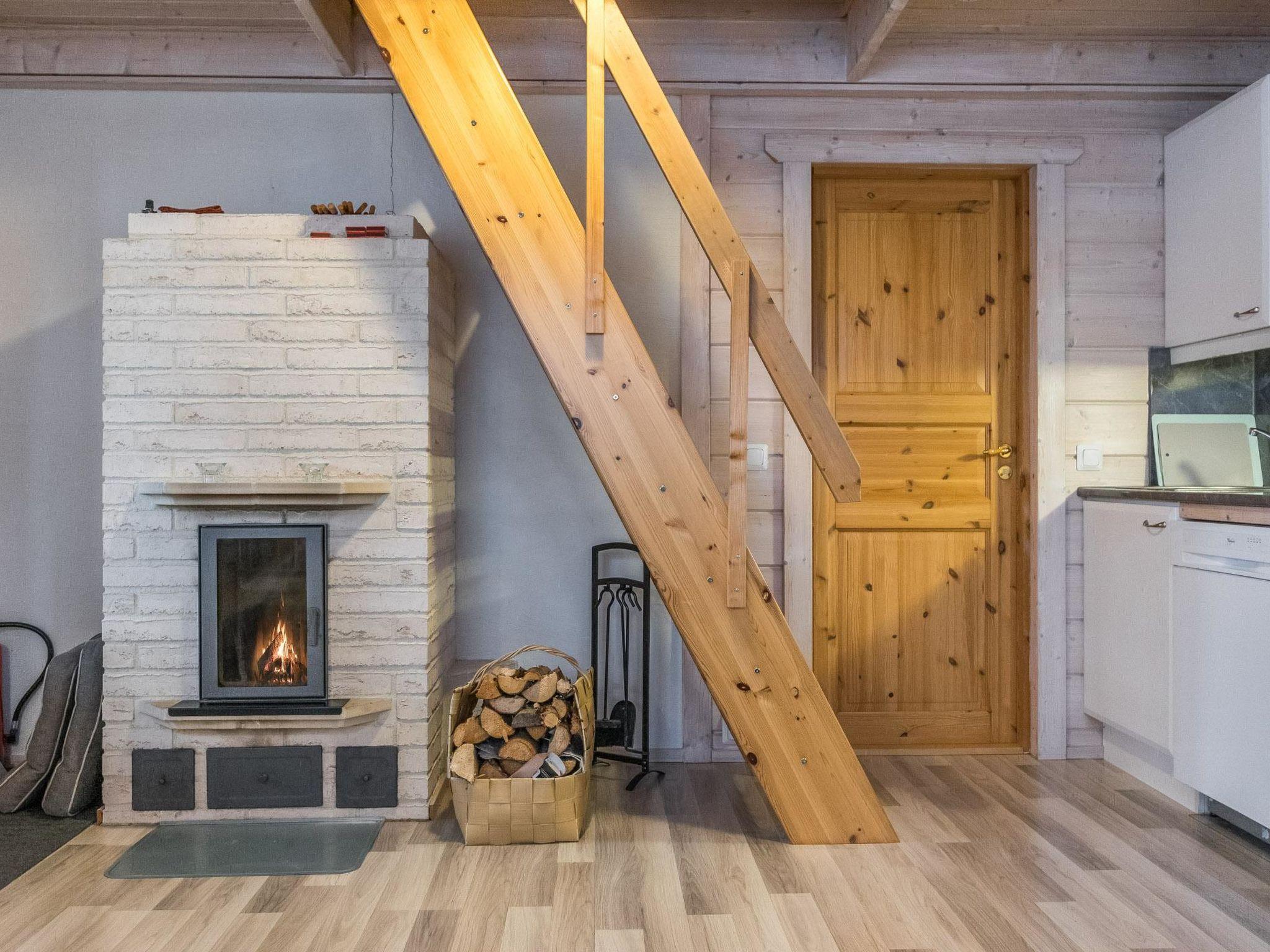 The cabin's living area features a dining table for four, a heat-storing fireplace, a living room/kitchen, a TV, and two armchairs. Access to a wood-heated sauna is available through the inside or from the terrace. The bathroom includes a shower, a WC, and a washing machine. The loft has four beds, and there is a child safety gate upstairs.