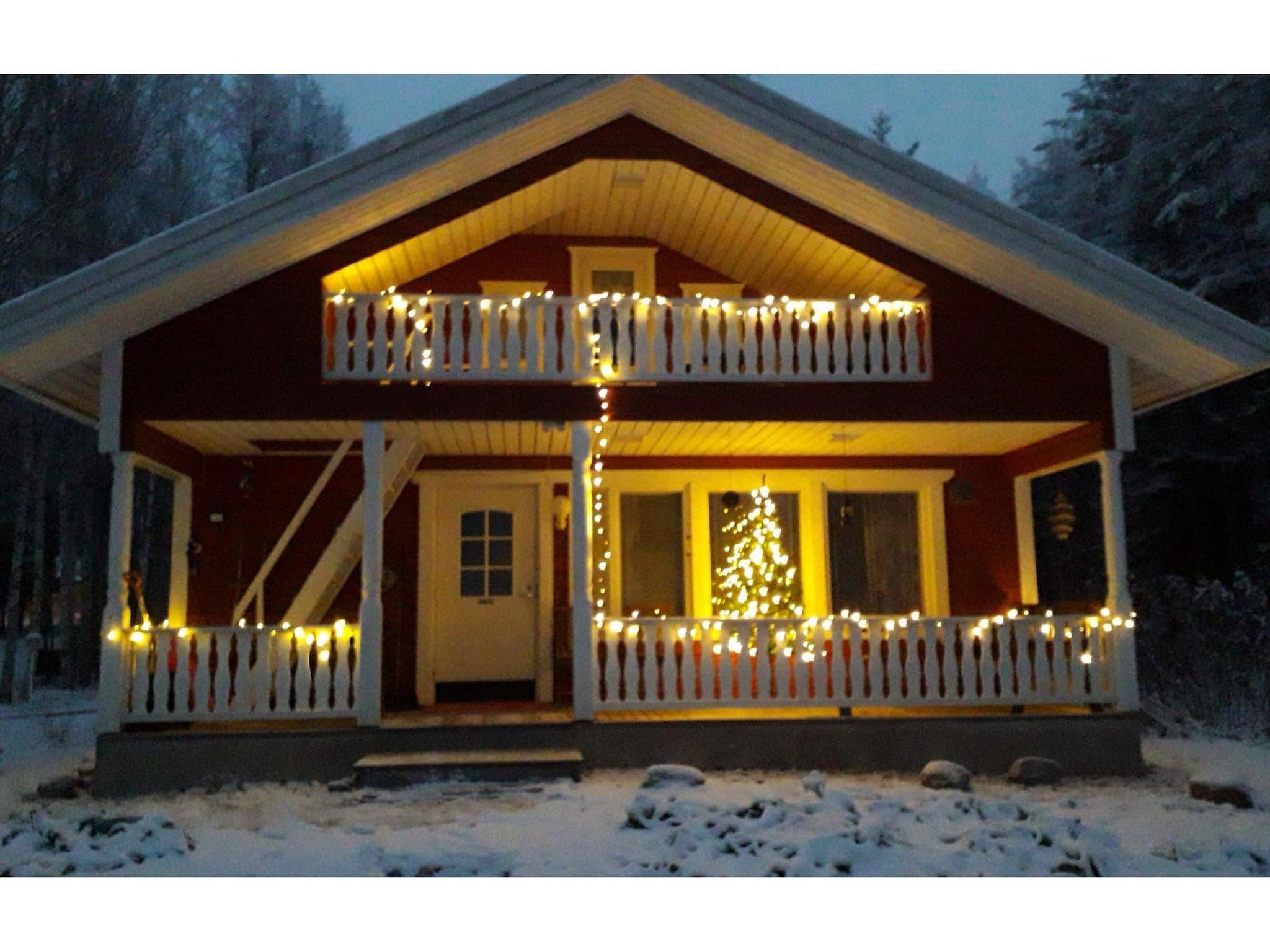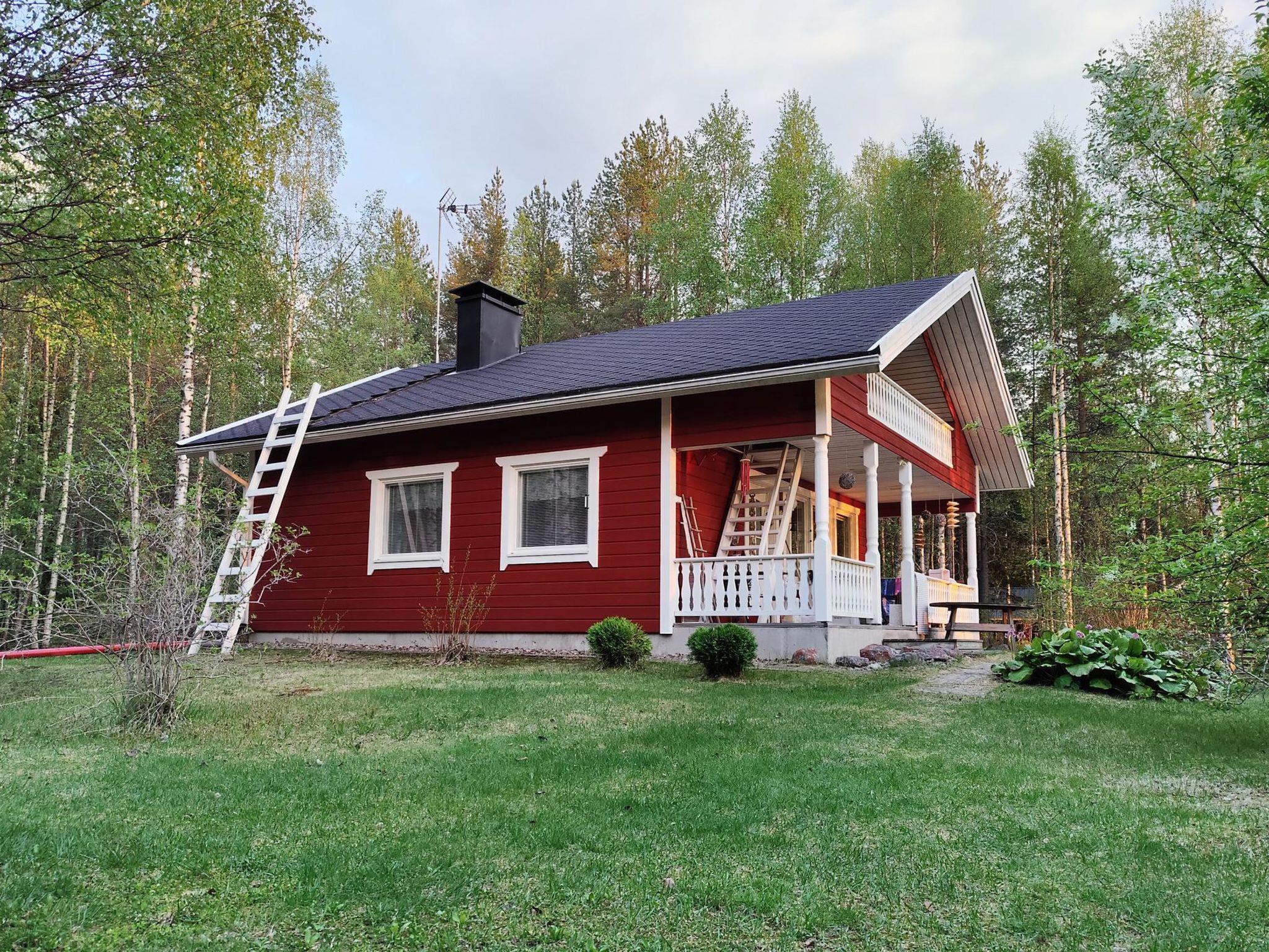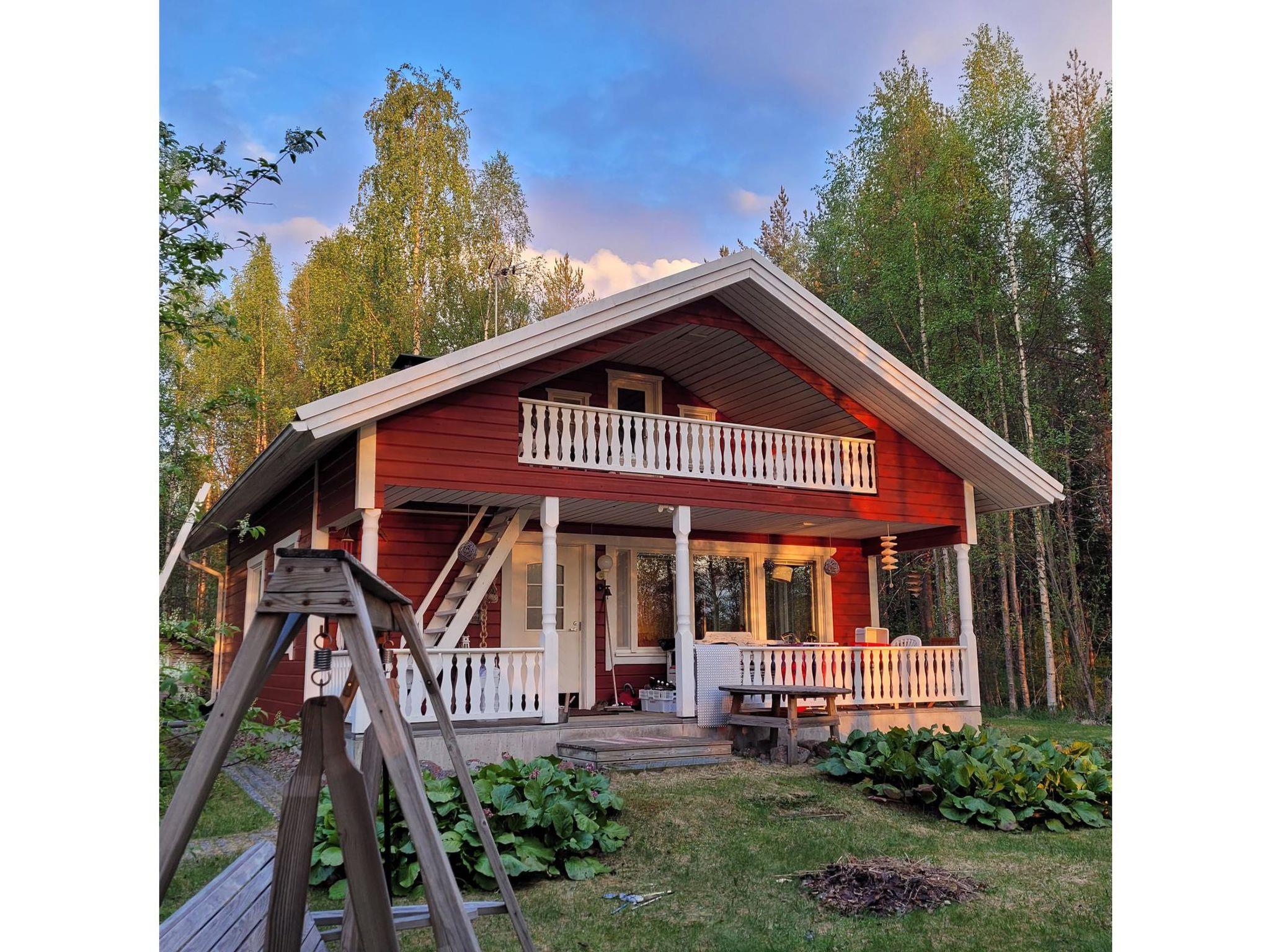 Log paneled cabin, built in 1997. Living room / kitchen with sofa bed, upstairs a double bed and two single beds (beds are 1 m wide) and sofa bed, steep stairs to the loft. Washroom / toilet, covered terrace and balcony. There is shower in the cabin, but no indoor sauna.