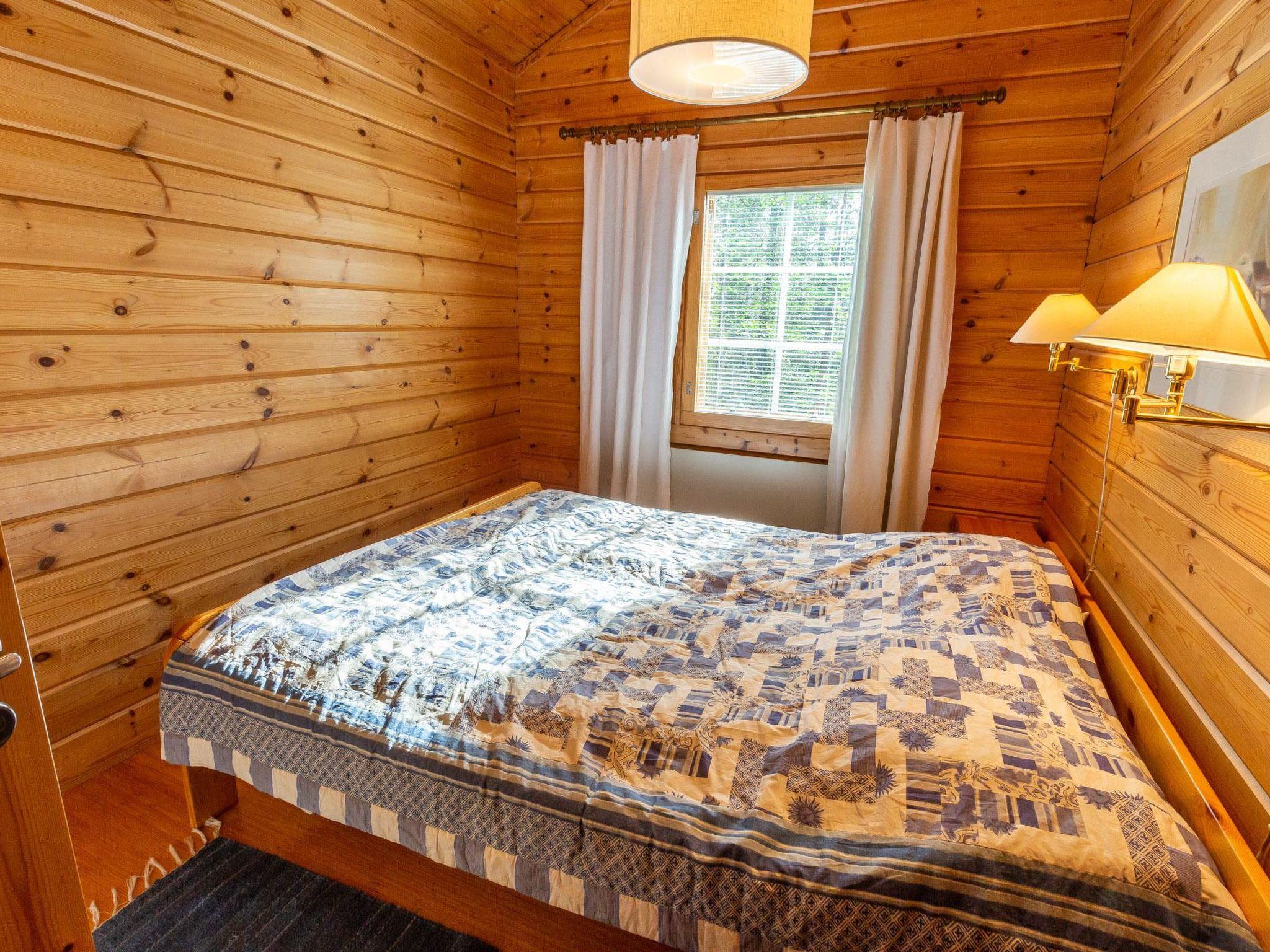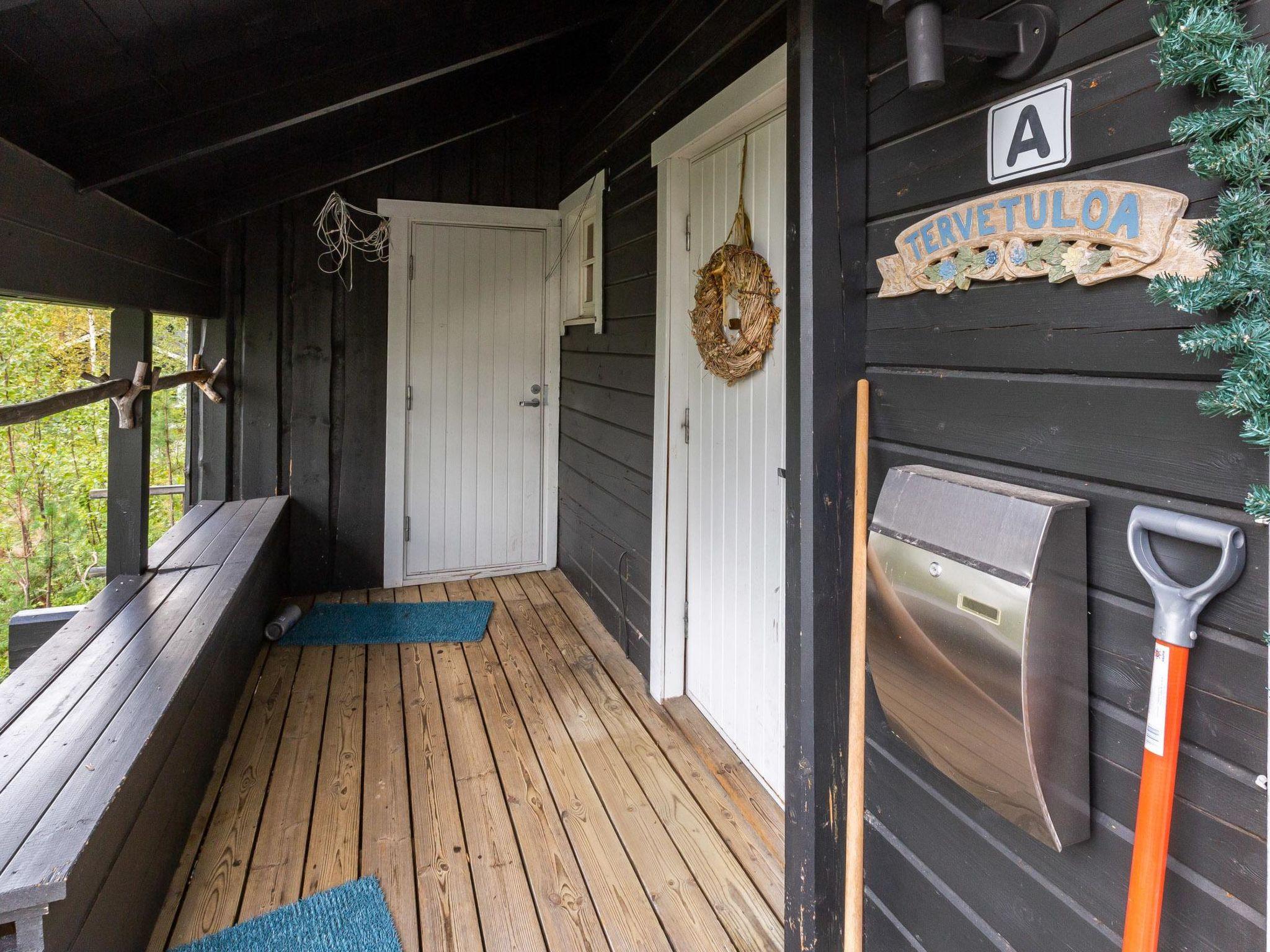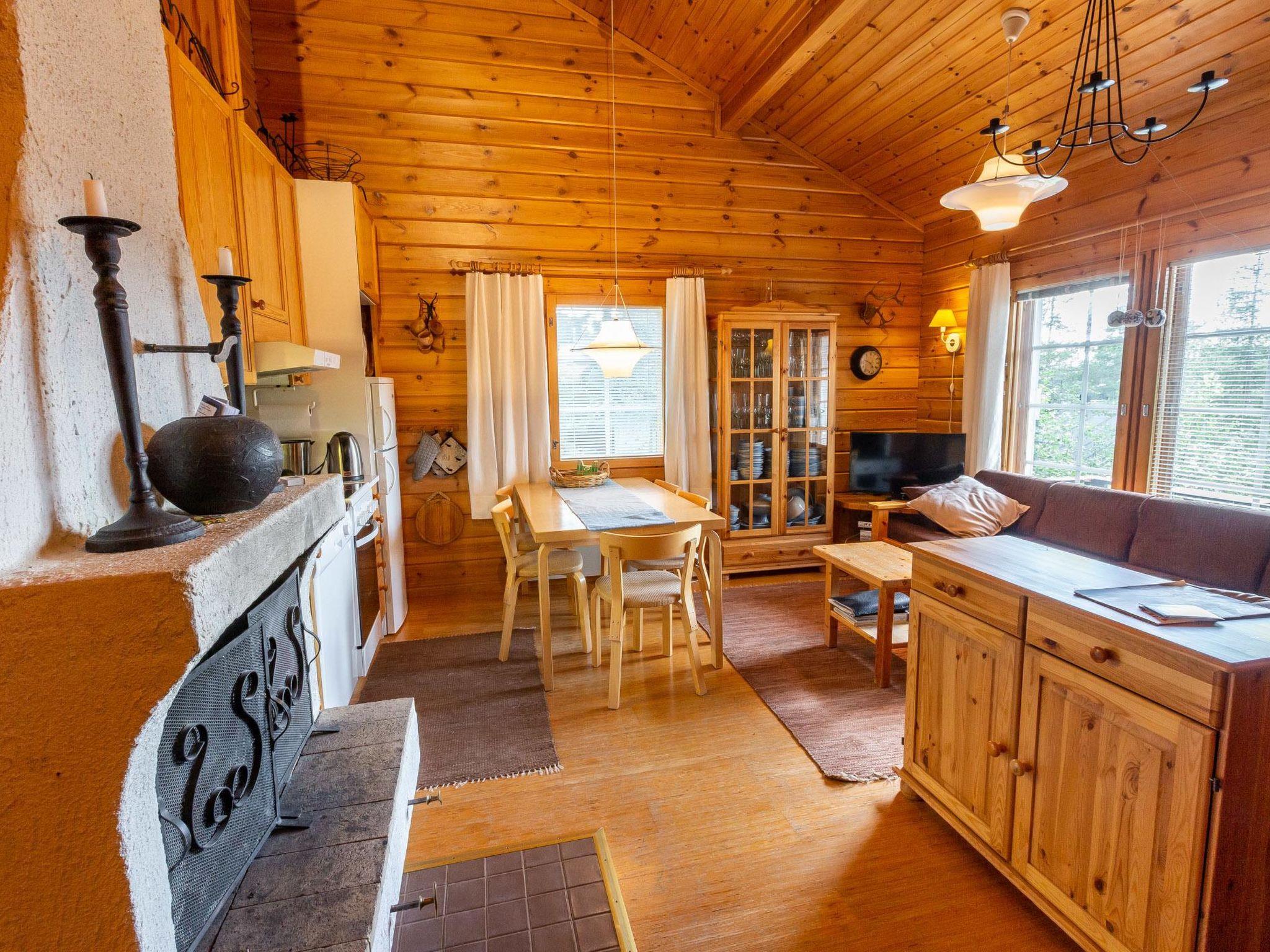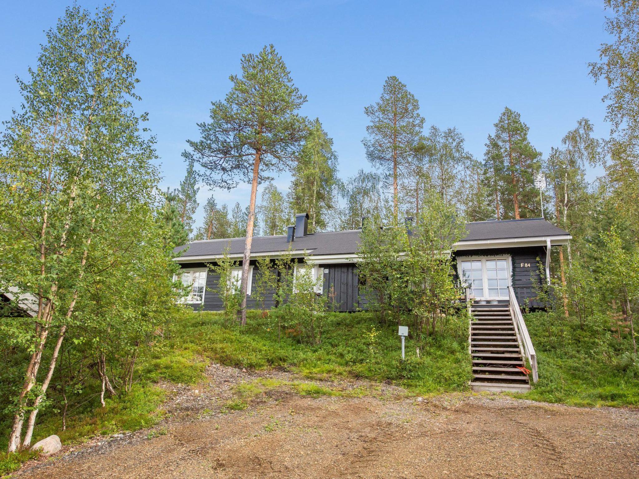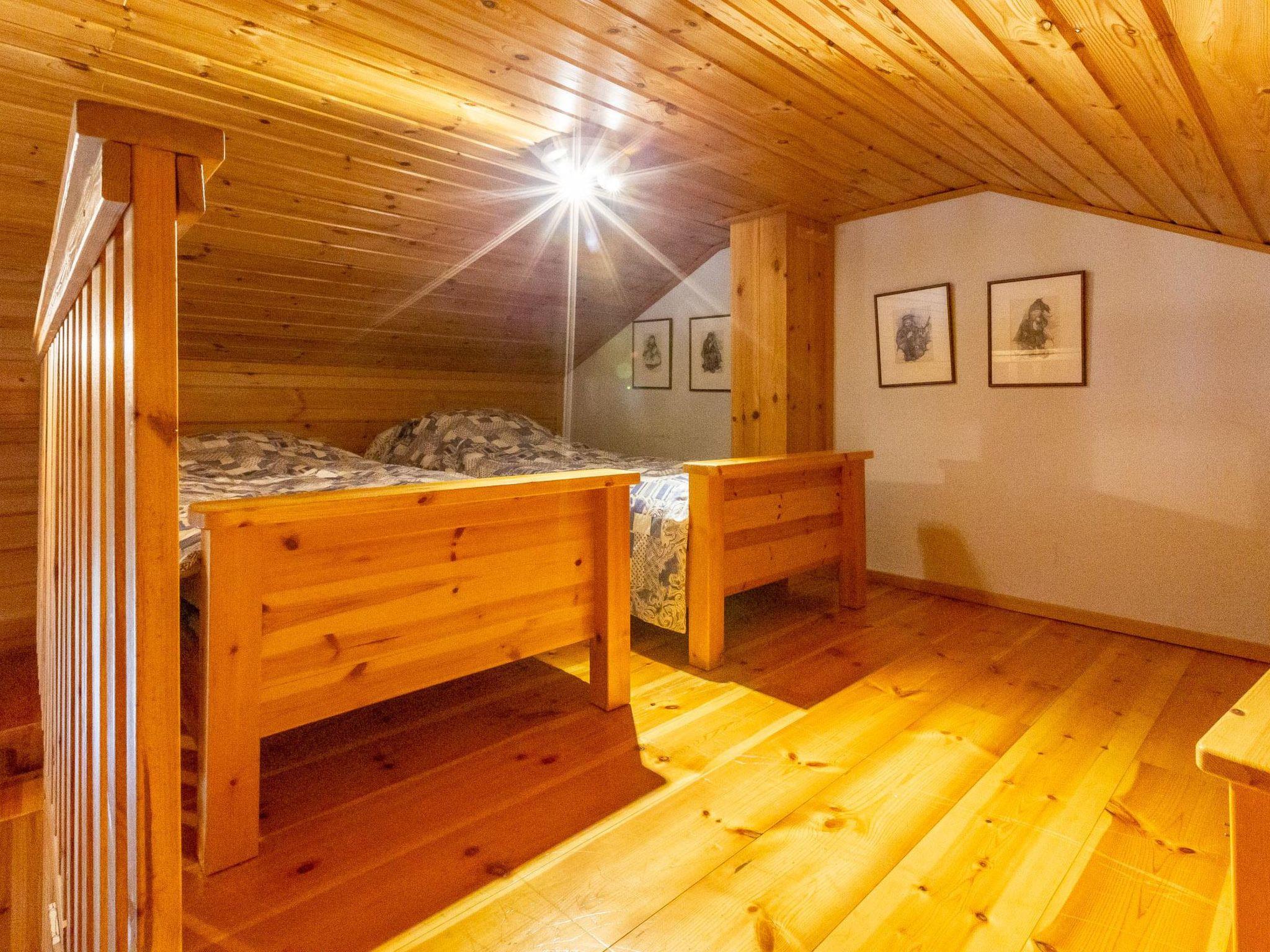 40 km North-East of Kolari, lake Ylläsjärvi 2,5 km, swimming beach 4 km. Log duplex apartment 1989. Livingroom/kitchen, two bedrooms, on with a double bed and one with a bunk bed, loft (9 m²) with 2 beds. Electric sauna, shower, separate toilet. Open porch.