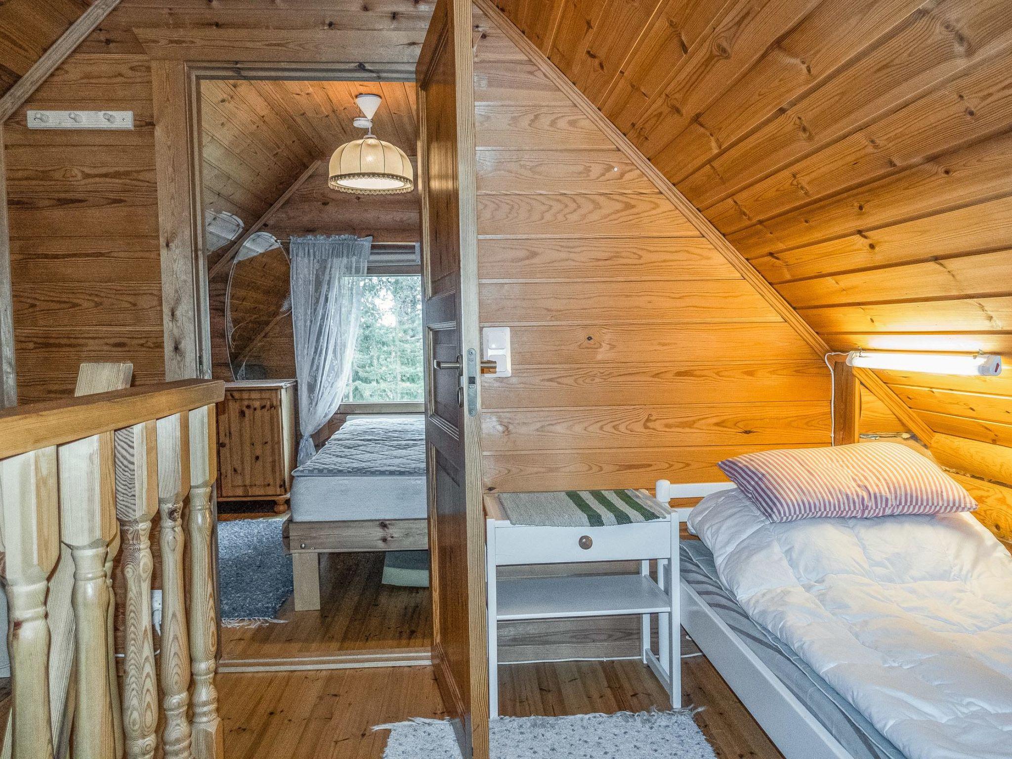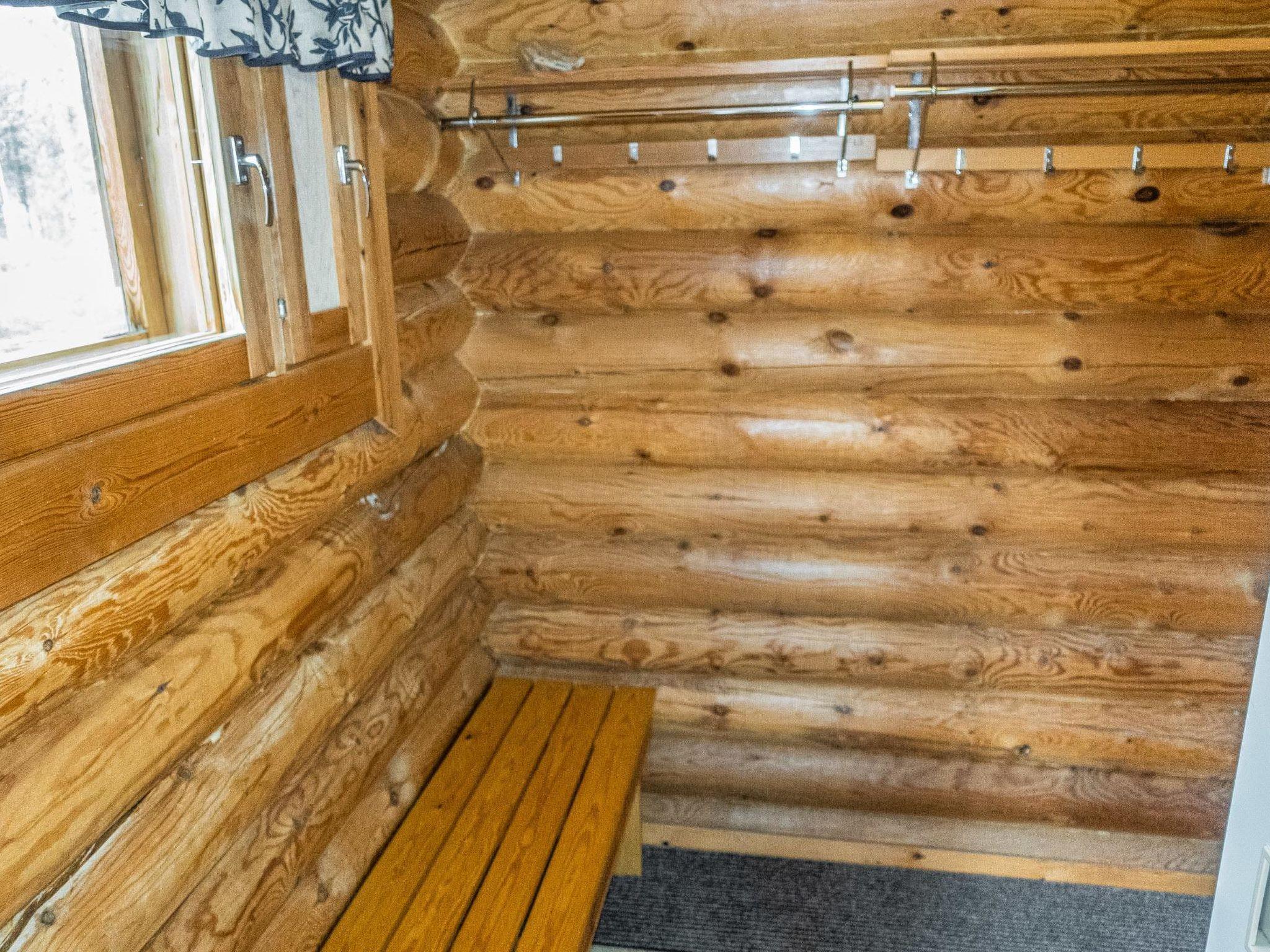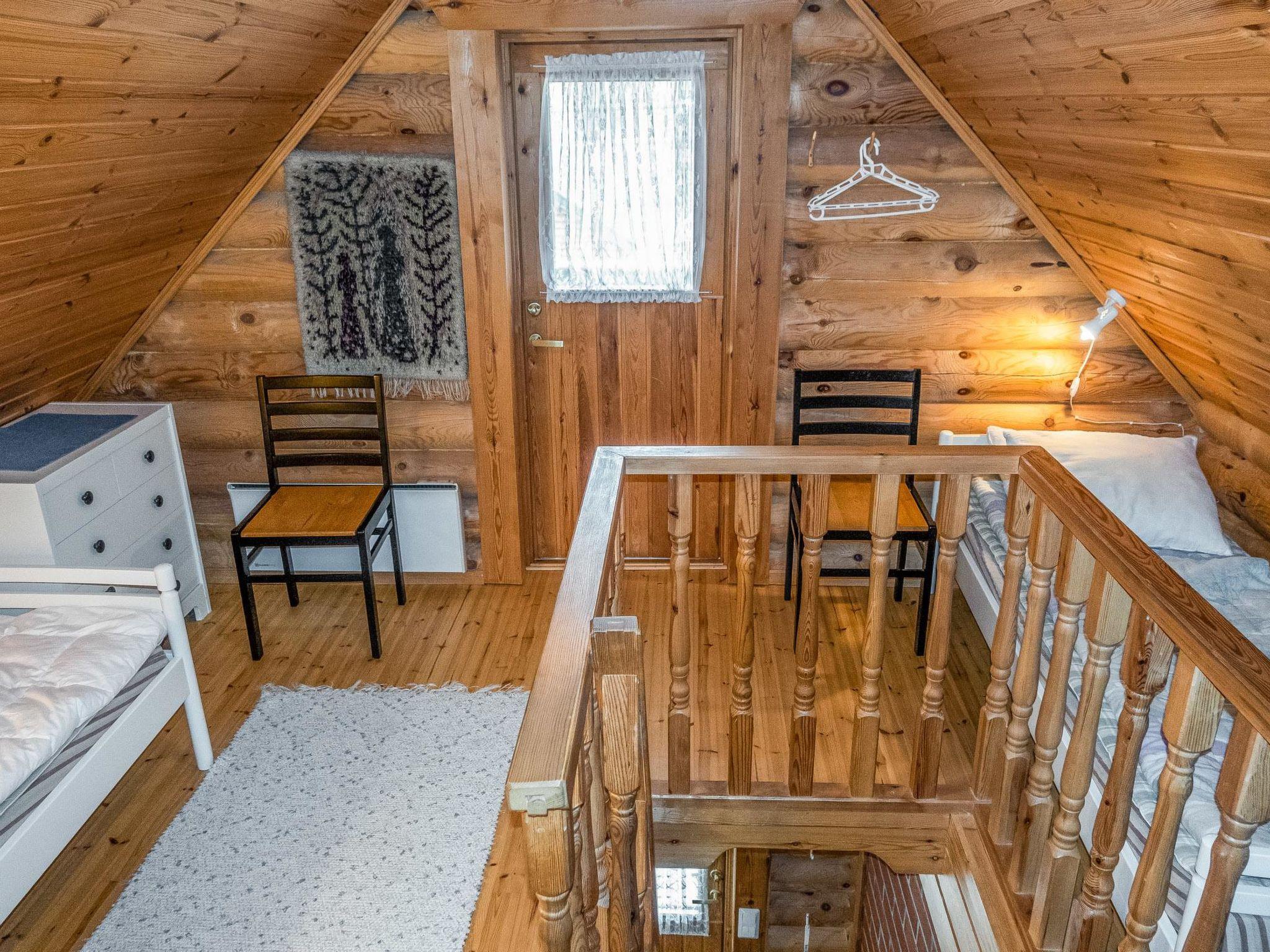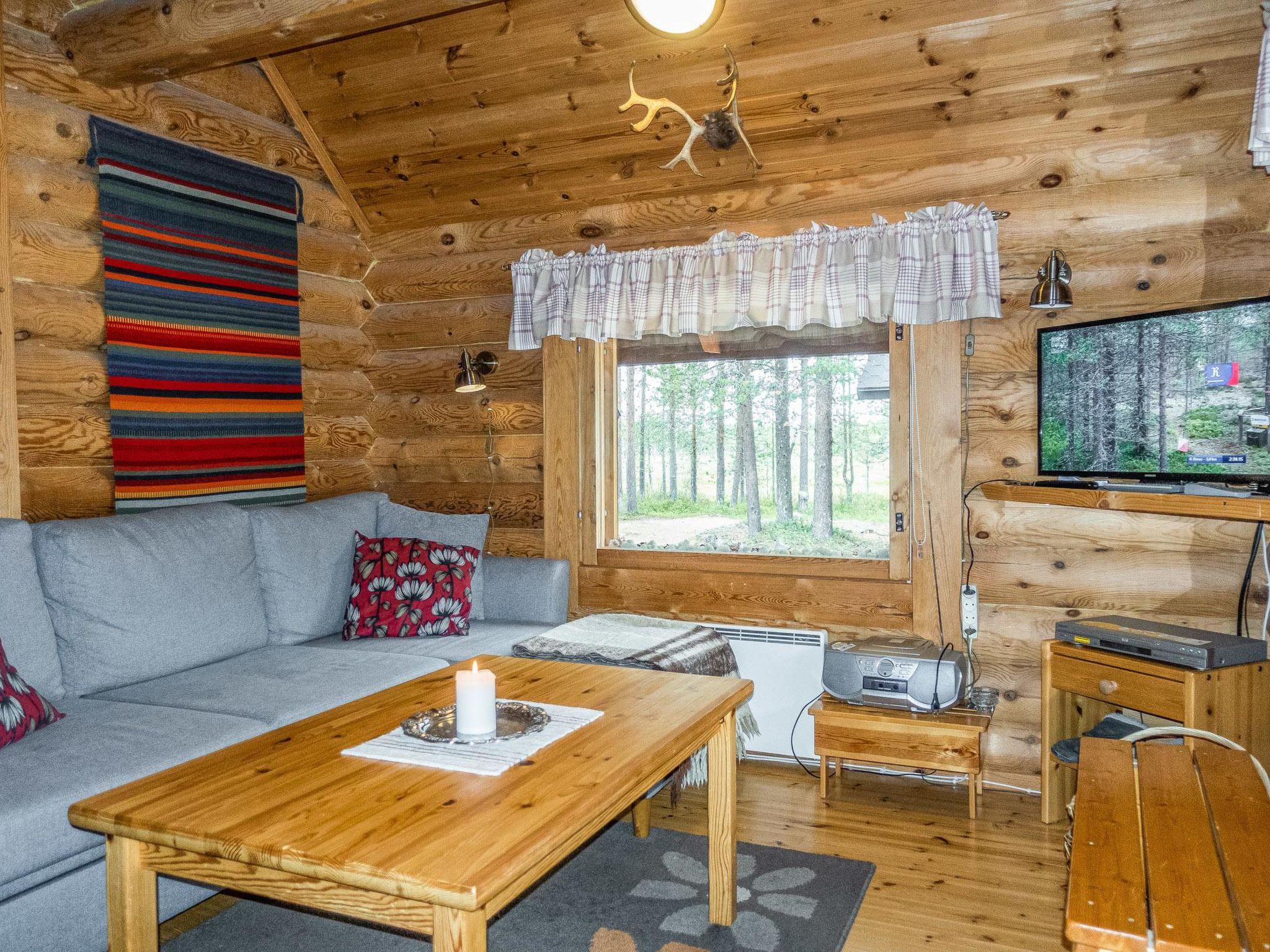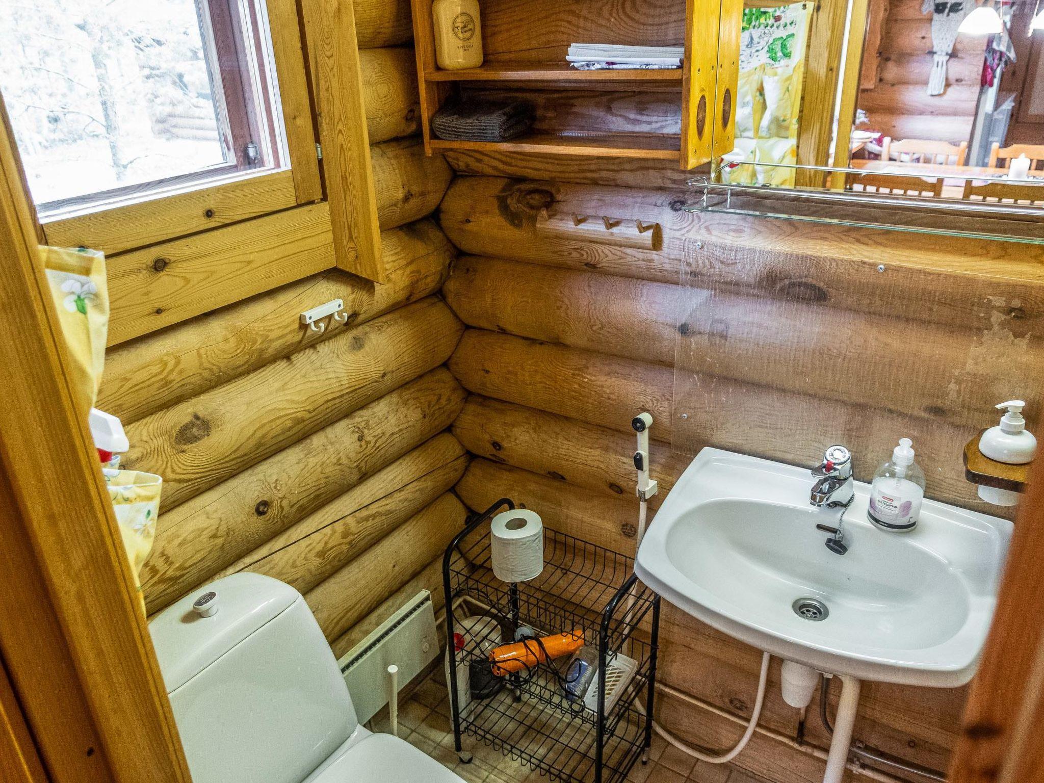 40km northeast of Kolari, lake Iso Ahvenlampi 300m, swimming beach 3km. Log cabin built in 1990. Kitchen-living room, upstairs (steep stairs) with one bedroom with a double bed, two separate beds in upstairs lobby, sofa bed in living room, separate wc, bathroom and sauna (electric), passage to bathroom and sauna through outside porch. Open porch. Downstairs 40 m² and upstairs 25 m².