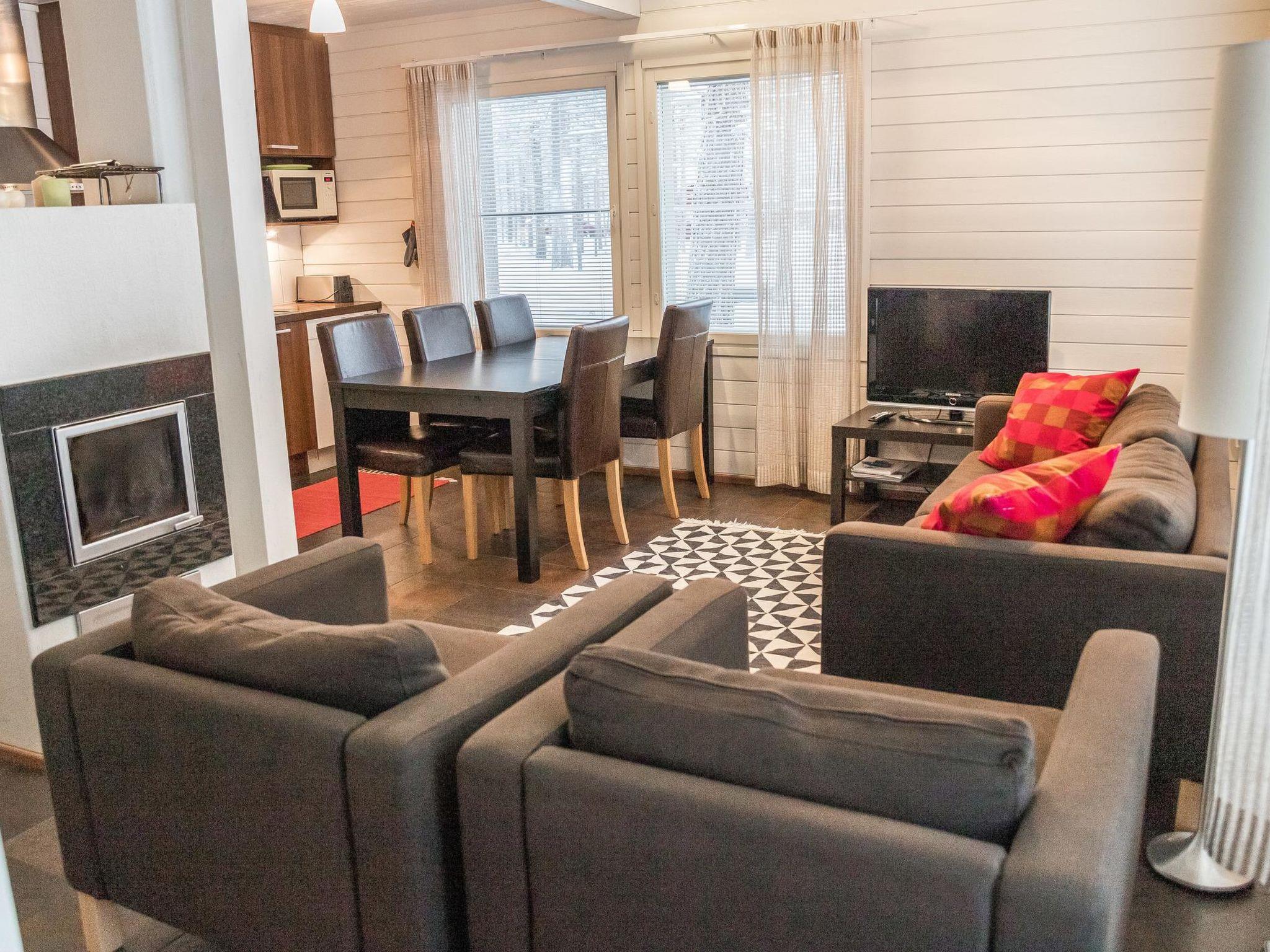 A duplex apartment located 165 km north of Rovaniemi in Maisematie area in Ylläsjärvi village. Combined living room-kitchen, two bedrooms - two beds in both rooms, two beds and mattress in loft (14 m²), sauna, washing room/toilet + one seperate toilet. Car shelter.