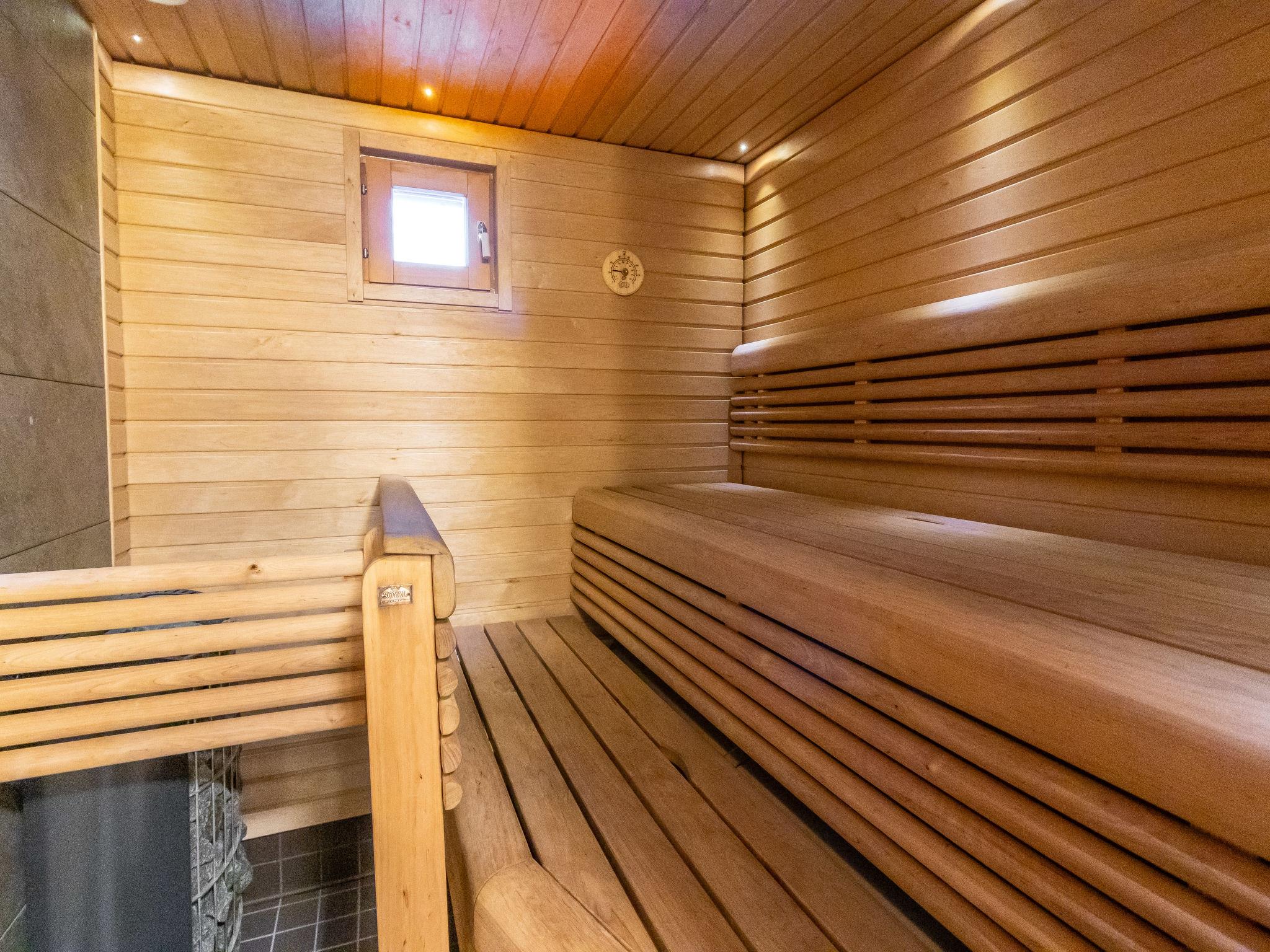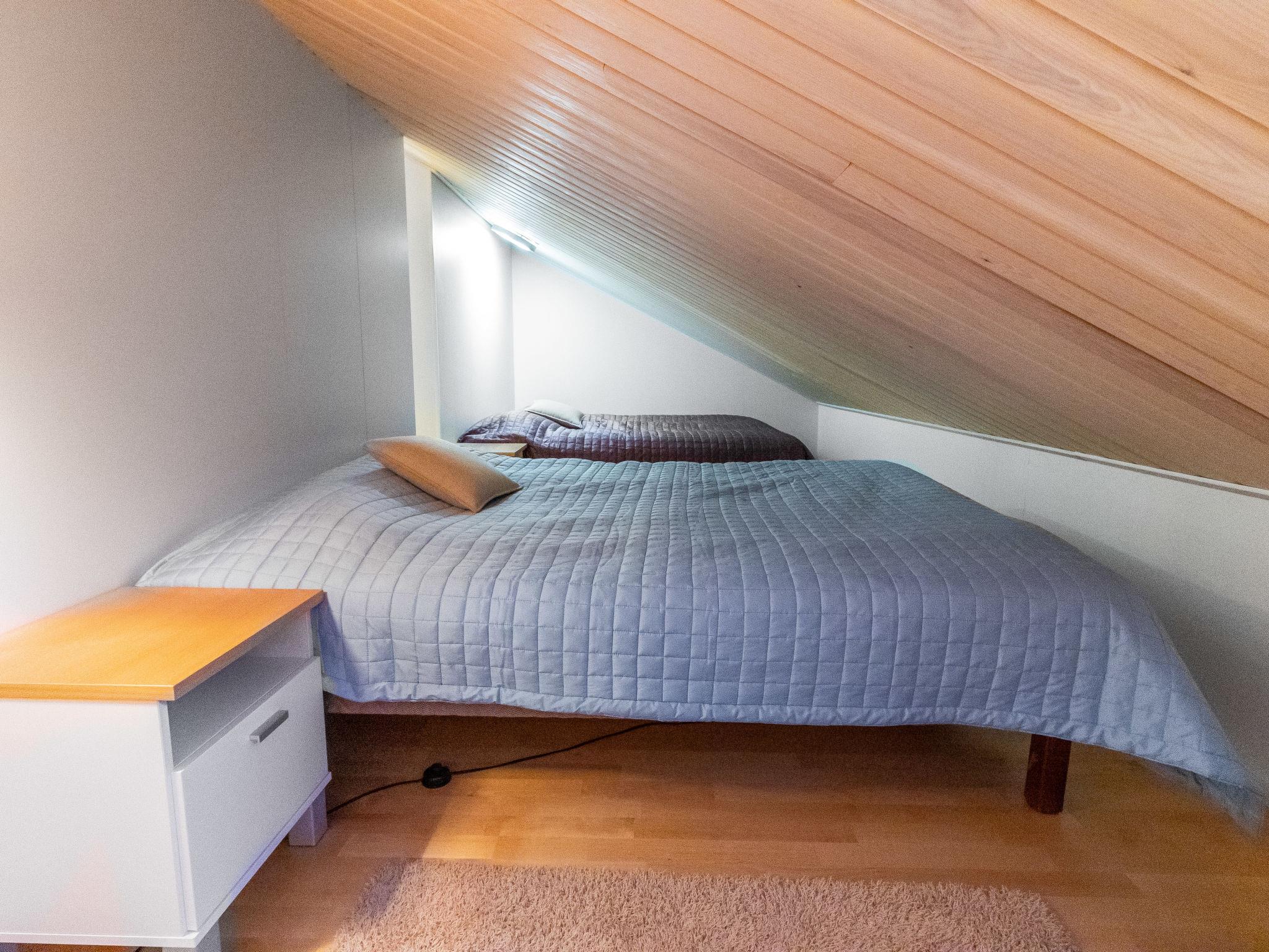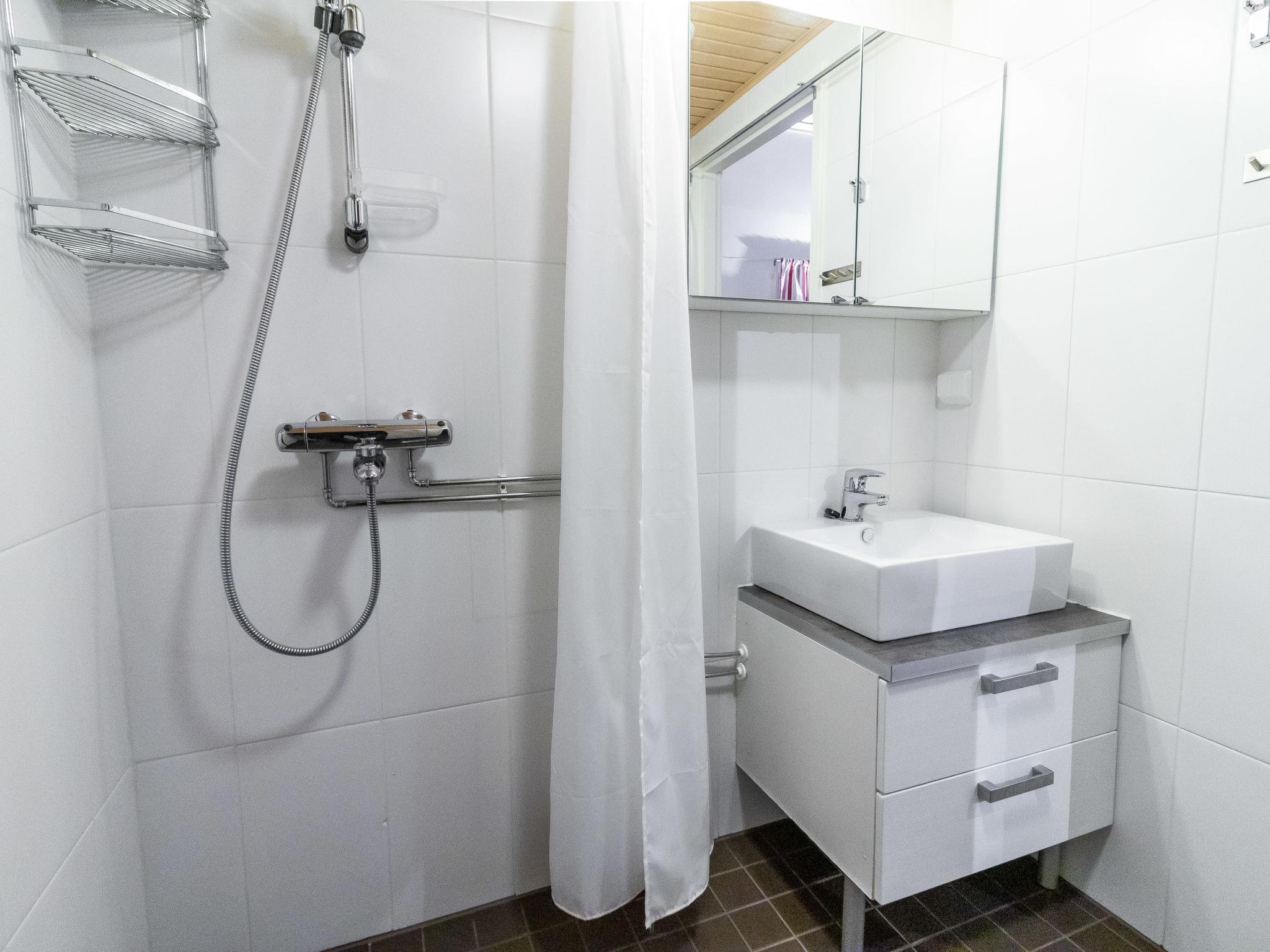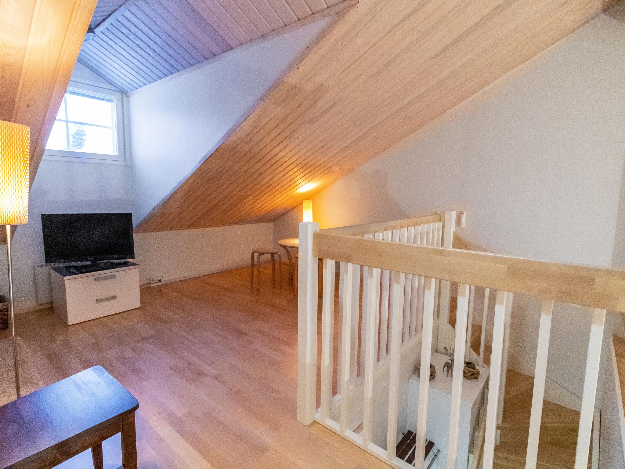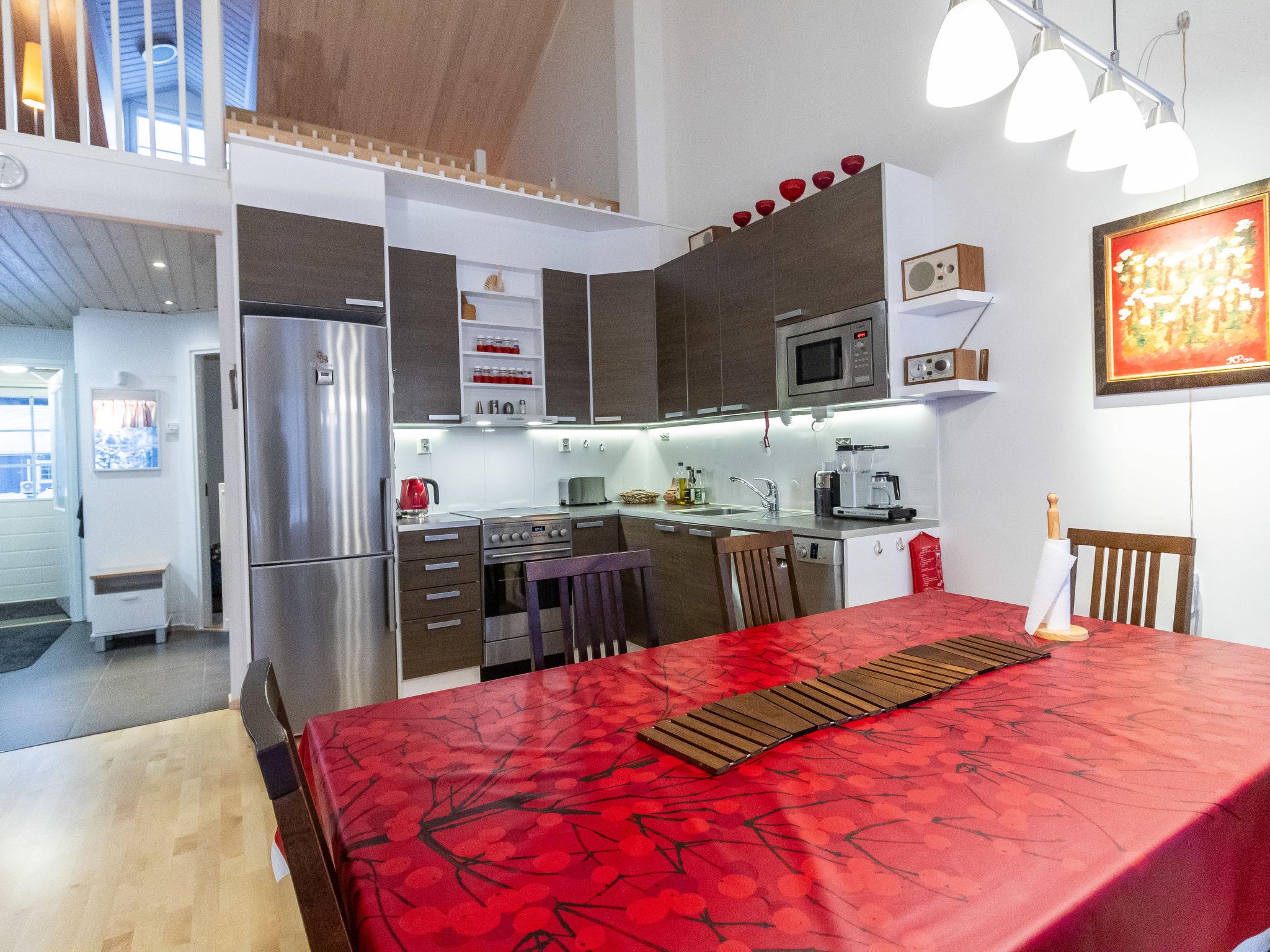 The well-equipped and spacious living room/kitchen provides a comfortable setting for spending time together and cooking. For relaxation, guests can enjoy an electric sauna and washroom facilities.