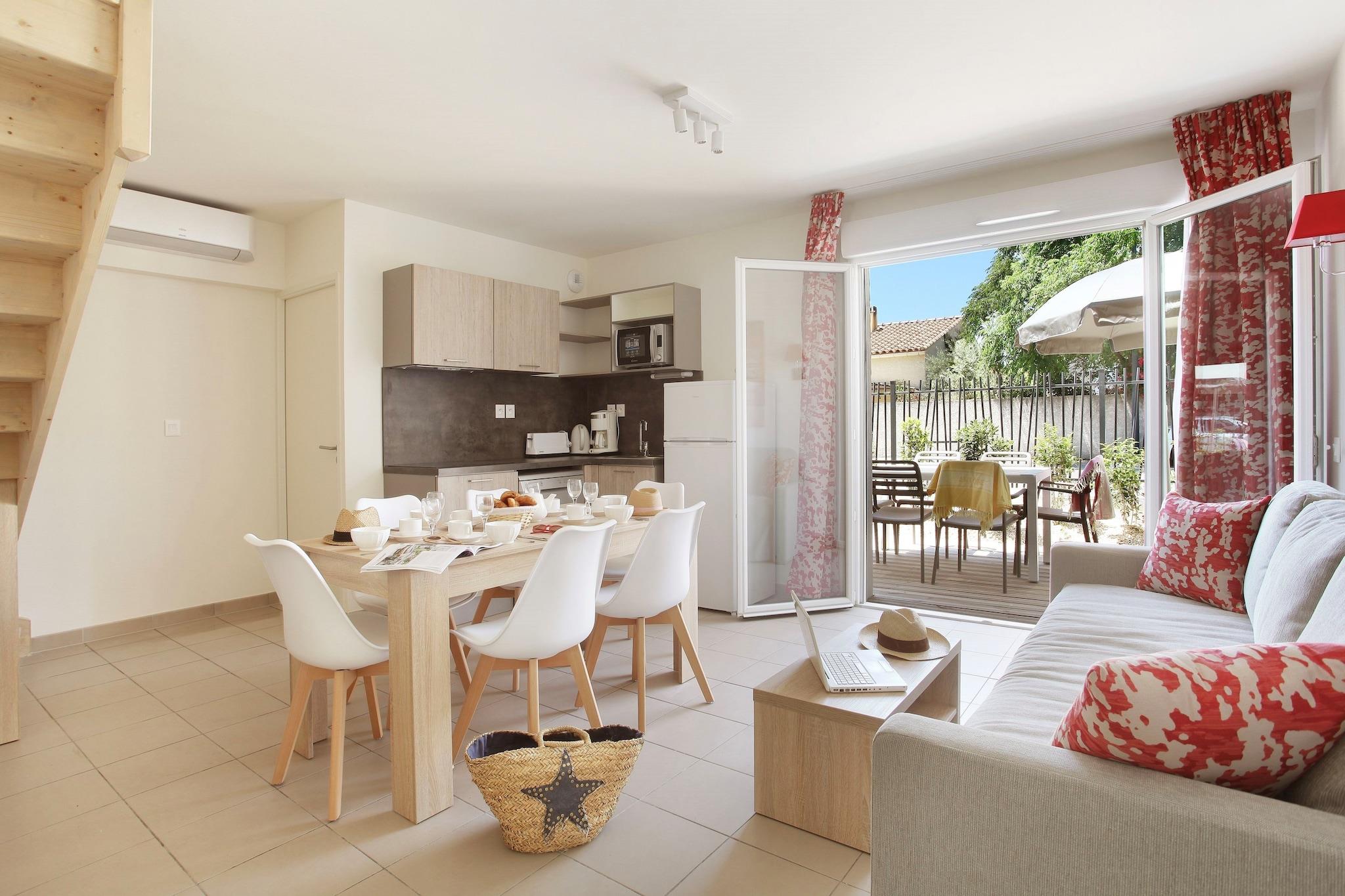 Velkommen til Fleur de Sel, et roligt ferieparadis beliggende i den fortryllende Camargue-region, kun få minutter fra den historiske befæstede by Aigues-Mortes. Gemt væk i en fredelig, bilfri park med grønne vandrestier, er vores moderne, airconditionerede etagelejligheder gennemtænkt designet til komfort og afslapning. Nyd et lyst opholdsområde med en dobbelt sovesofa, et fuldt udstyret tekøkken og en privat terrasse eller have - perfekt til udendørs spisning eller slappe af efter en dag med udforskning. Fleur de Sel tilbyder det bedste fra begge verdener: et stille gemmested tæt på det pulserende hjerte af Aigues-Mortes. Gå en tur i de brostensbelagte gader, spis på caféer på middelalderpladsen, eller udforsk de nærliggende saltsletter og flamingofyldte laguner. De solbeskinnede strande i Grau-du-Roi og Espiguette ligger kun en kort køretur væk, og de byder på gyldent sand og roligt middelhavsvand. Naturelskere kan vove sig gennem Camargue på hesteryg eller cykel og se vilde heste og unikke dyreliv. Kæledyr er velkomne hos Fleur de Sel! Gå en tur med din hund langs byens naturskønne kanalstier eller udforsk de kæledyrsvenlige strandzoner i Espiguette. Mange lokale restauranter har udendørs siddepladser, hvor hunde bliver mødt med vandskåle og mave. Uanset om det er en natursti, en morgenkaffe i solen eller gåture i solnedgangen ved strandengene, vil din firbenede rejsekammerat føle sig hjemme.