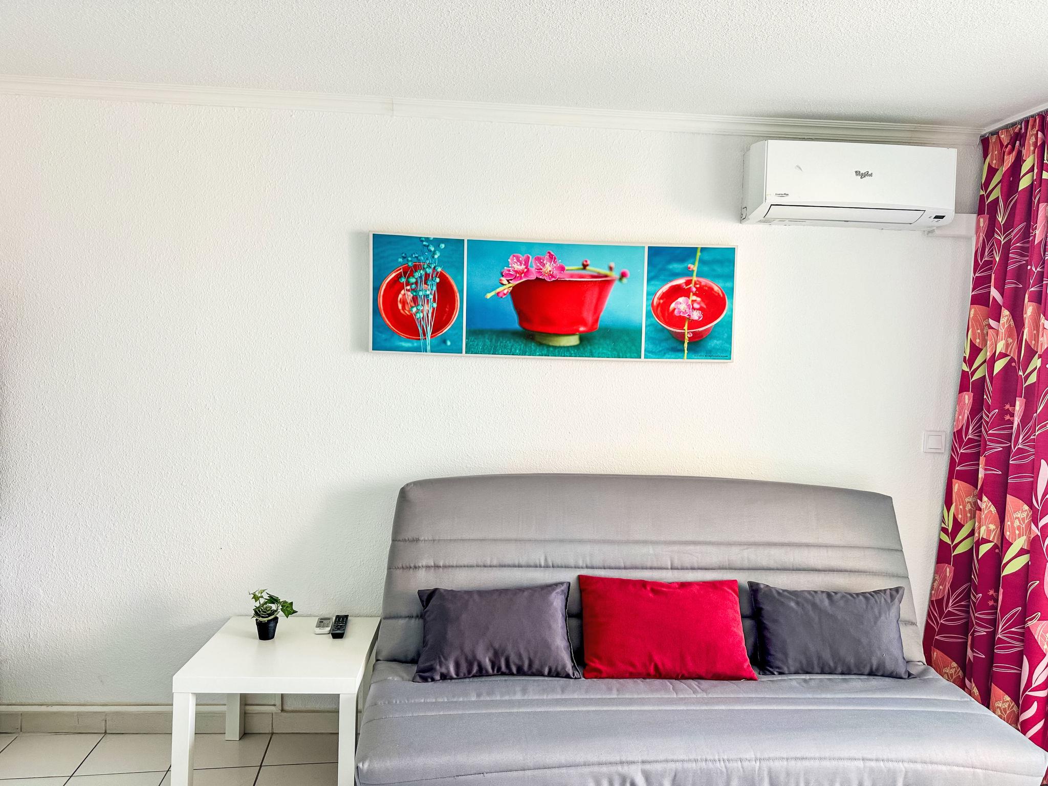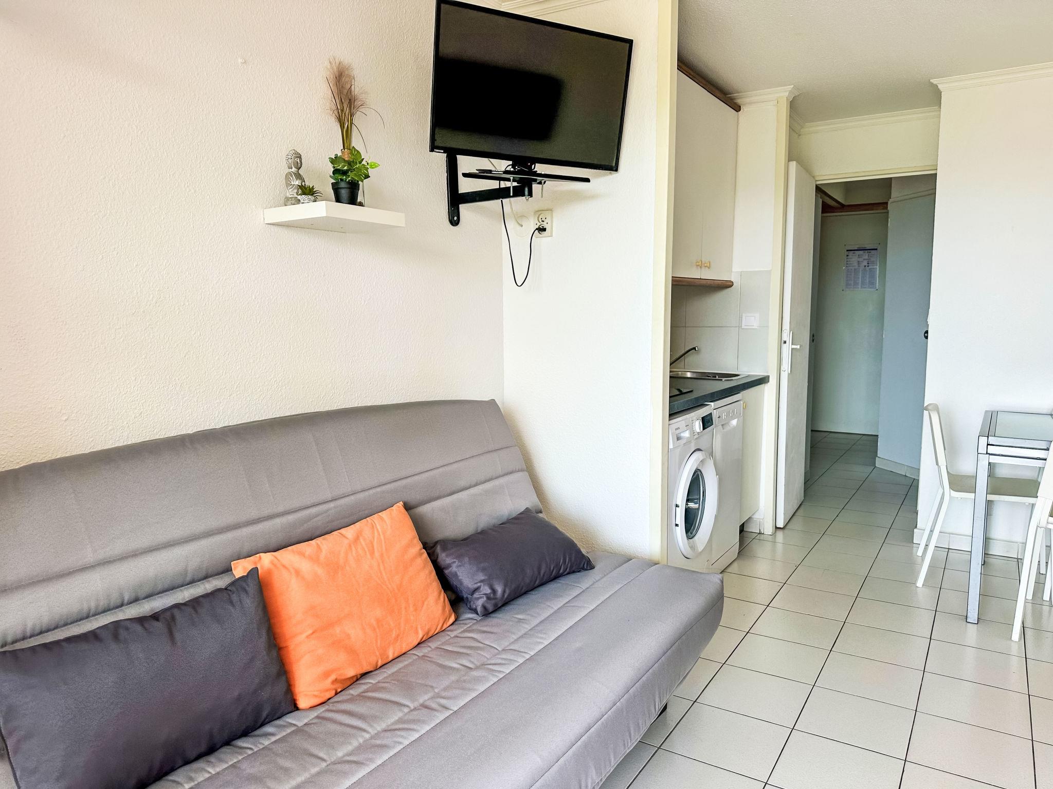 "Le Village (C9 279)", 1-room studio 27 m2 on 1st floor. Object suitable for 2 adults + 2 children. Living room with 1 sofabed (140 cm, length 190 cm), TV (flat screen). Exit to the terrace. Sleeping alcove with 1 x 2 bunk beds (90 cm, length 190 cm). Kitchenette (4 hot plates, oven, dishwasher, toaster, microwave, freezer, electric coffee machine, Capsules for coffee machine (Tassimo) extra). Shower/WC. Electric heating, air-conditioning. Terrace 8 m2. Terrace furniture. View of the mountains and golf course. Facilities: washing machine. Internet (WiFi, extra). Parking (1 car). Please note: non-smokers only. Smoke alarm. Instead of an enclosed bedroom, some sleeping areas are located in an open-plan area (gallery, alcove, etc.). Offer by a private individual according to Art. 155, IV of CGI.