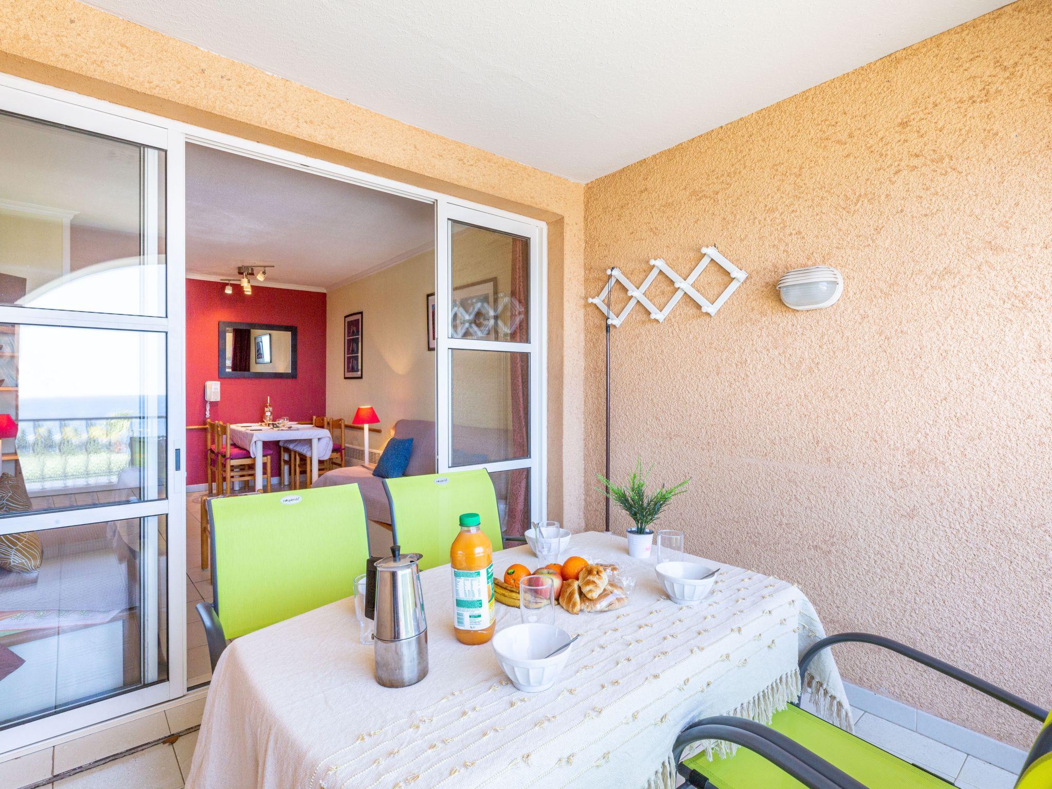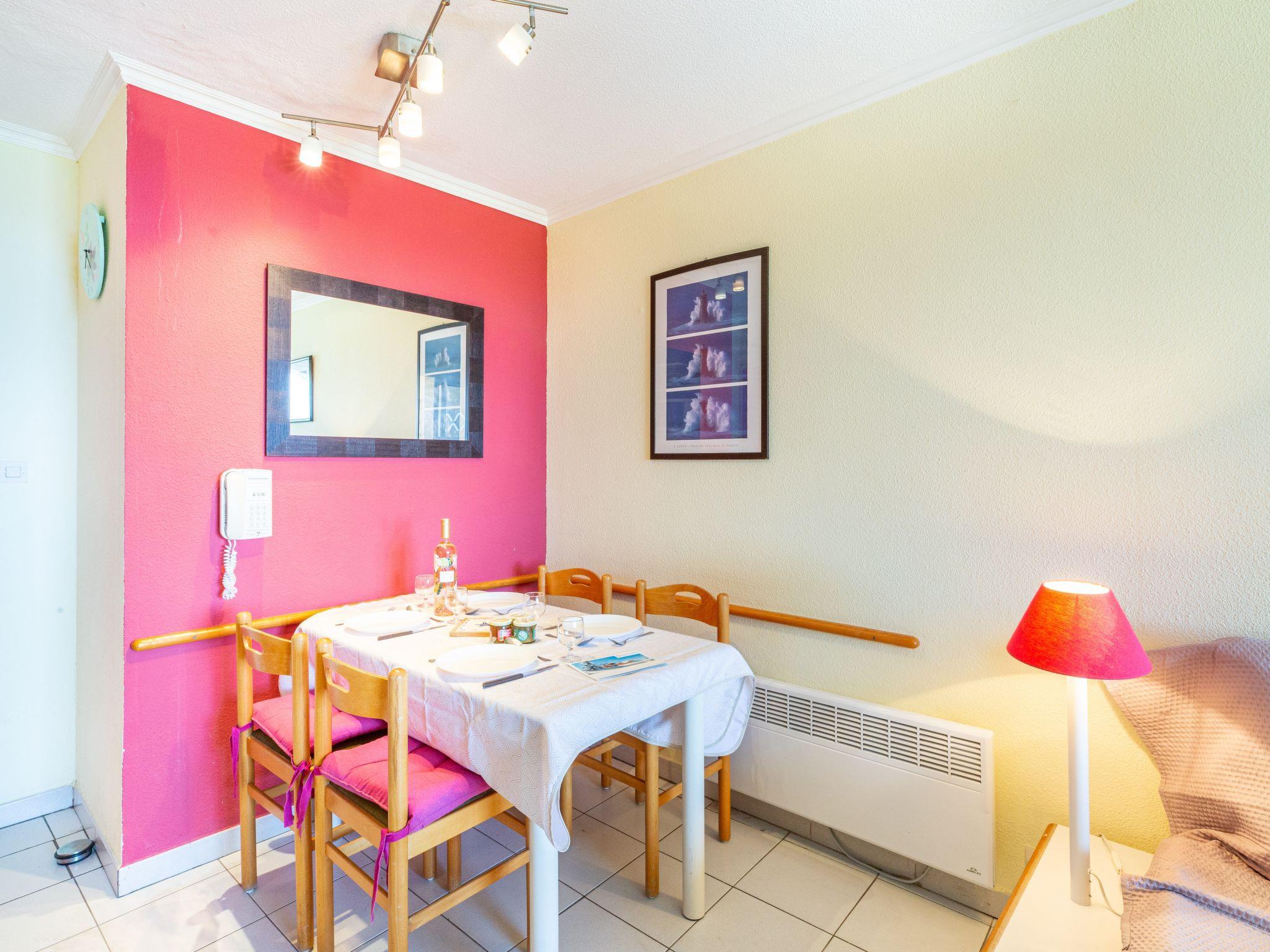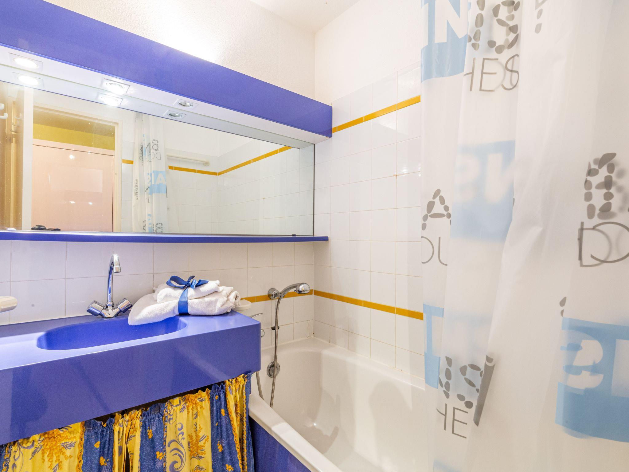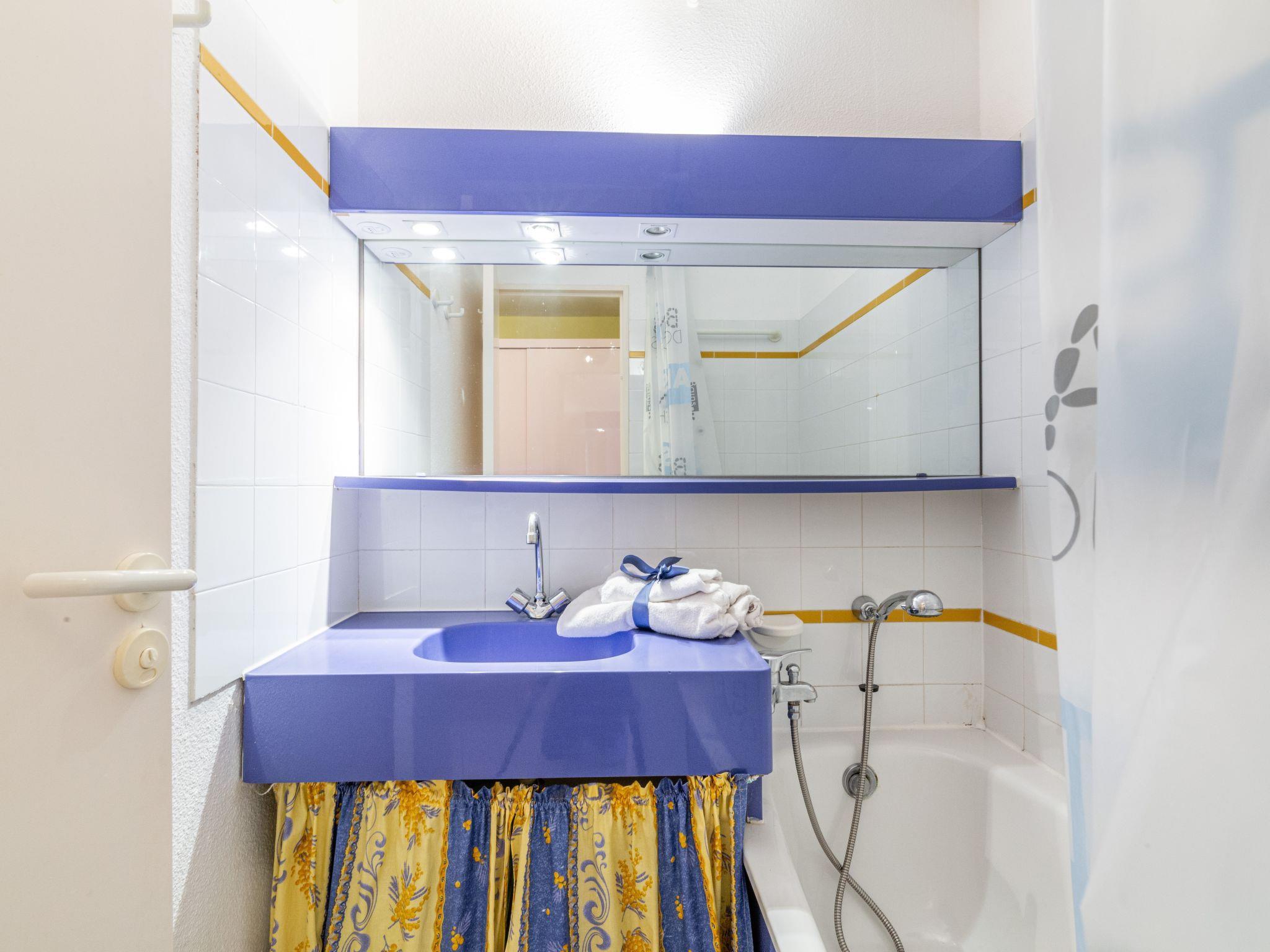 "Le Village (E1 214)", 2-room apartment 28 m2 on 1st floor. Living room with 1 sofabed (80 cm, length 190 cm), 1 pull-out bed (2 x 80 cm, length 190 cm), TV. Exit to the terrace. 1 room with 1 french bed (140 cm, length 190 cm). Kitchenette (4 hot plates, mini-oven, dishwasher, toaster, kettle, electric coffee machine). Bathroom, sep. WC. Electric heating. Terrace 9 m2, roofed. Terrace furniture. View of the sea and the swimming pool. Facilities: Internet (WiFi, extra). Parking (1 car). Please note: non-smokers only. 1 small pet/ dog allowed. Smoke alarm. Offer by a private individual according to Art. 155, IV of CGI.