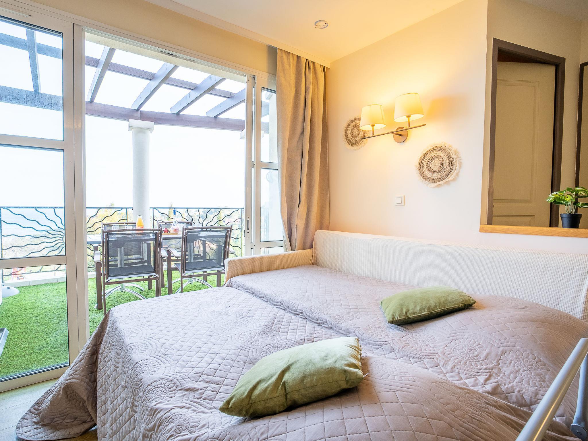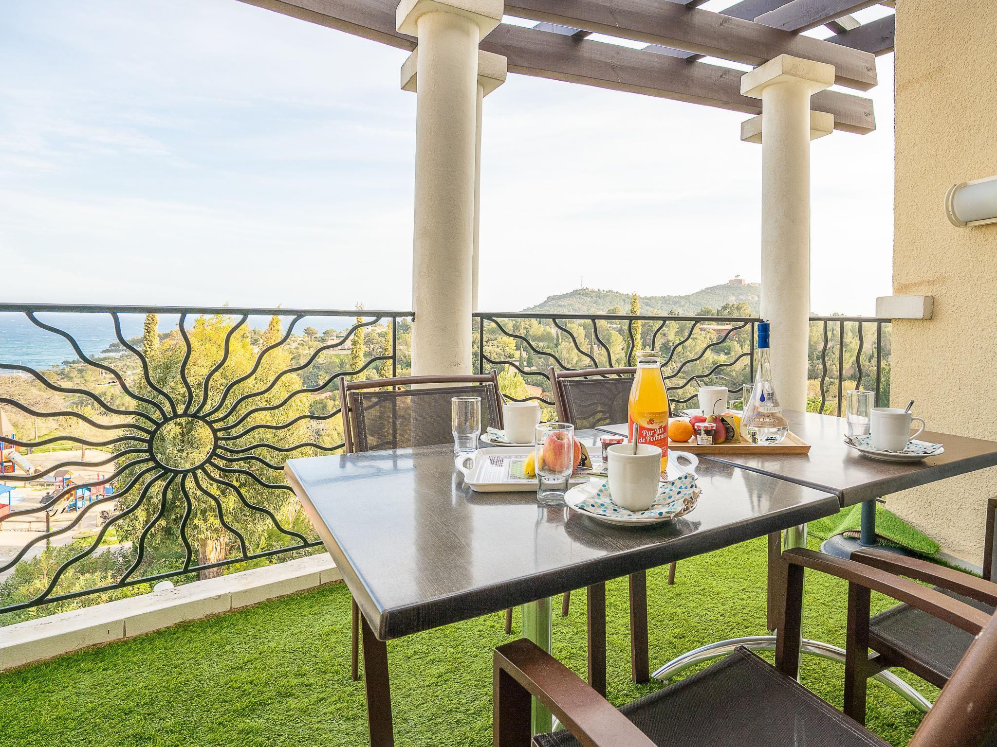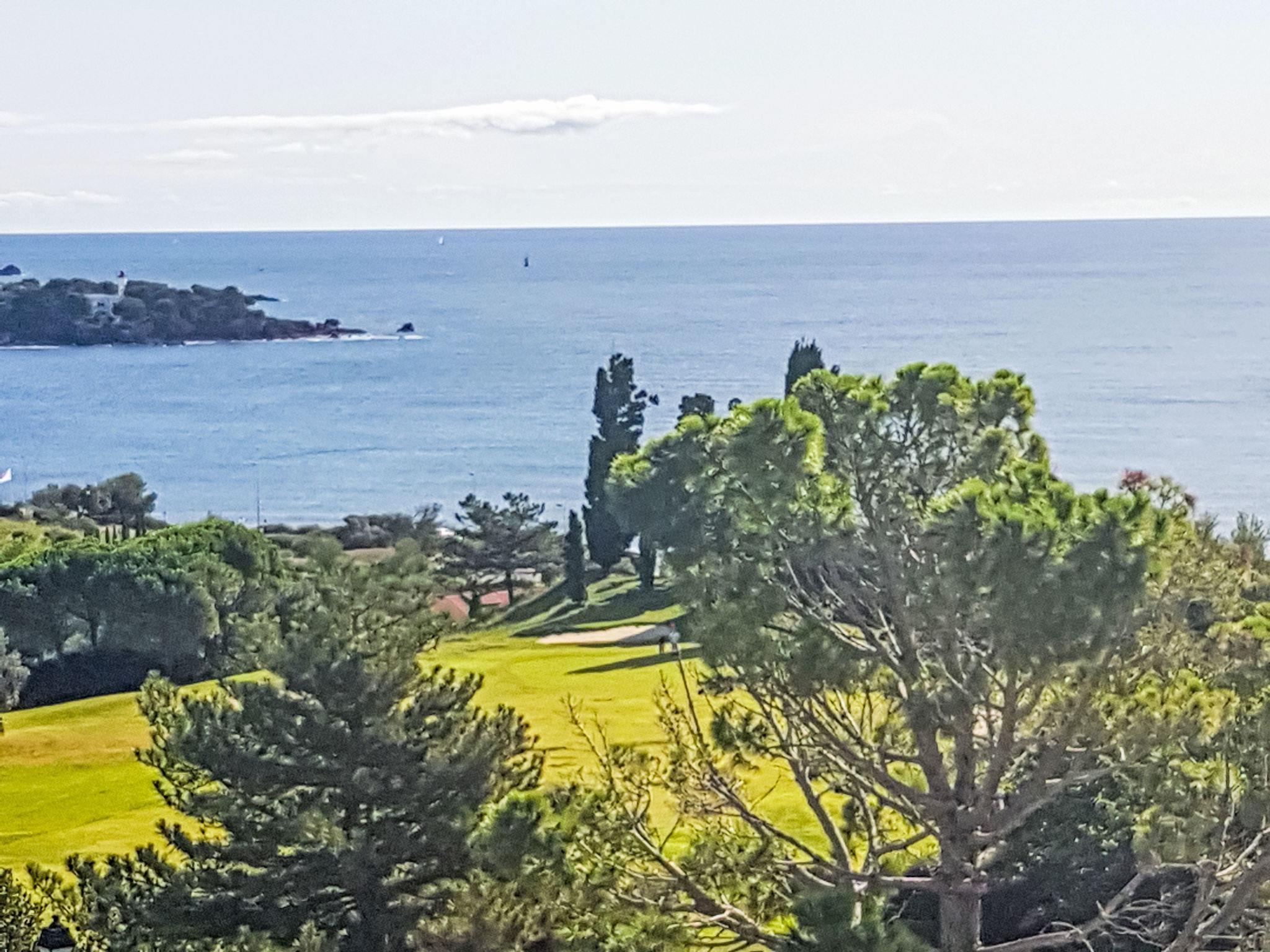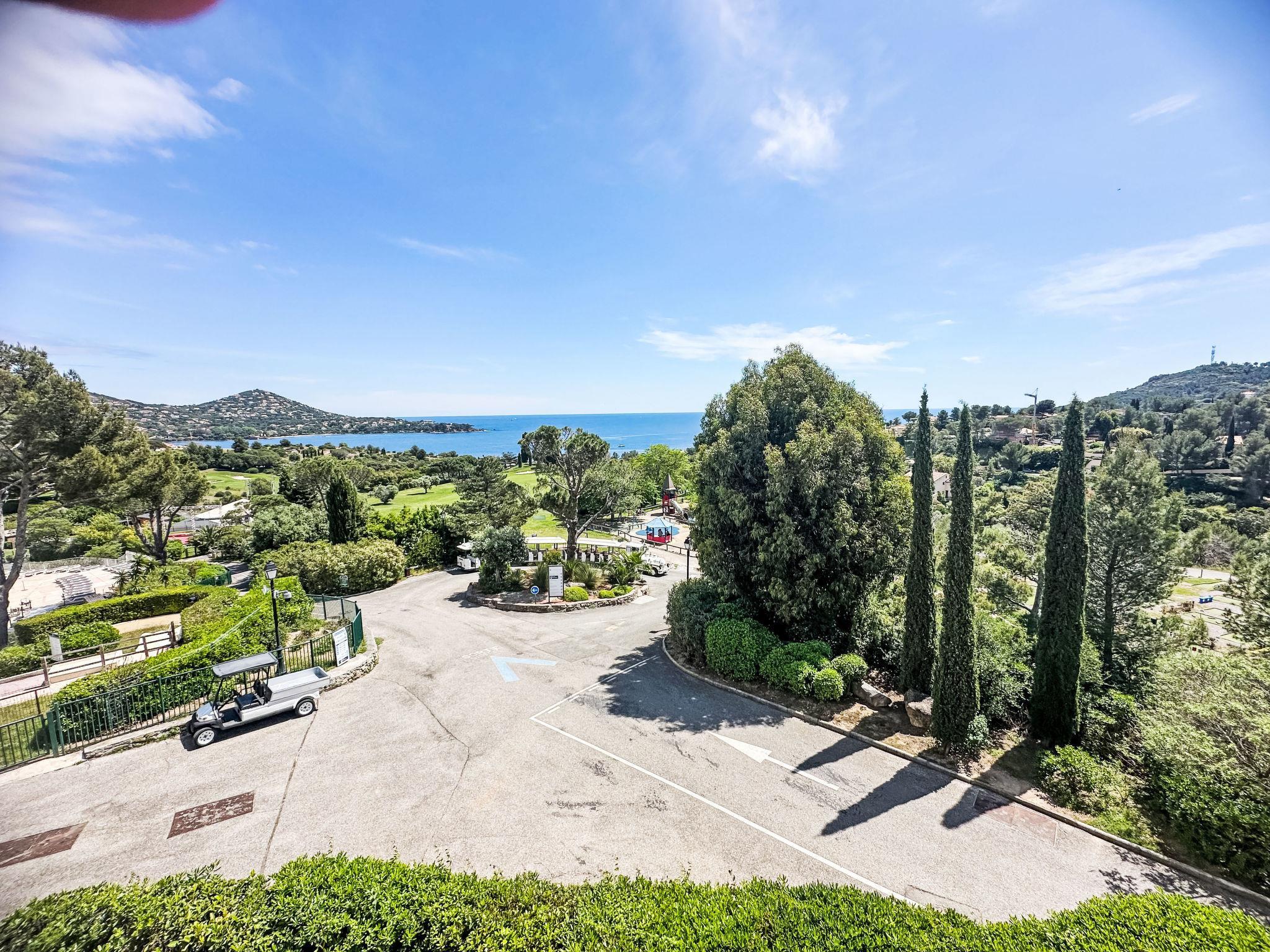 "L'Esquinade (FH206)", 2-room apartment 28 m2 on 1st floor. Very beautiful furnishings: living room with 1 pull-out bed (2 x 80 cm, length 190 cm), TV (flat screen). Exit to the terrace, south facing position and east facing position. 1 room with 1 french bed (140 cm, length 190 cm), TV (flat screen). Exit to the terrace. Kitchenette (4 hot plates, dishwasher, toaster, kettle, microwave, freezer, electric coffee machine, Capsules for coffee machine (TASSIMO) extra). Bathroom, sep. WC. Air-conditioning. Terrace 10 m2. Terrace furniture. Panoramic view of the sea, the swimming pool and golf course. Facilities: washing machine, hair dryer. Internet (WiFi, extra). Parking space n 2438 (roofed, 1 car), height 180 cm. Please note: non-smokers only. Smoke alarm. Offer by a private individual according to Art. 155, IV of CGI. U7GD7V