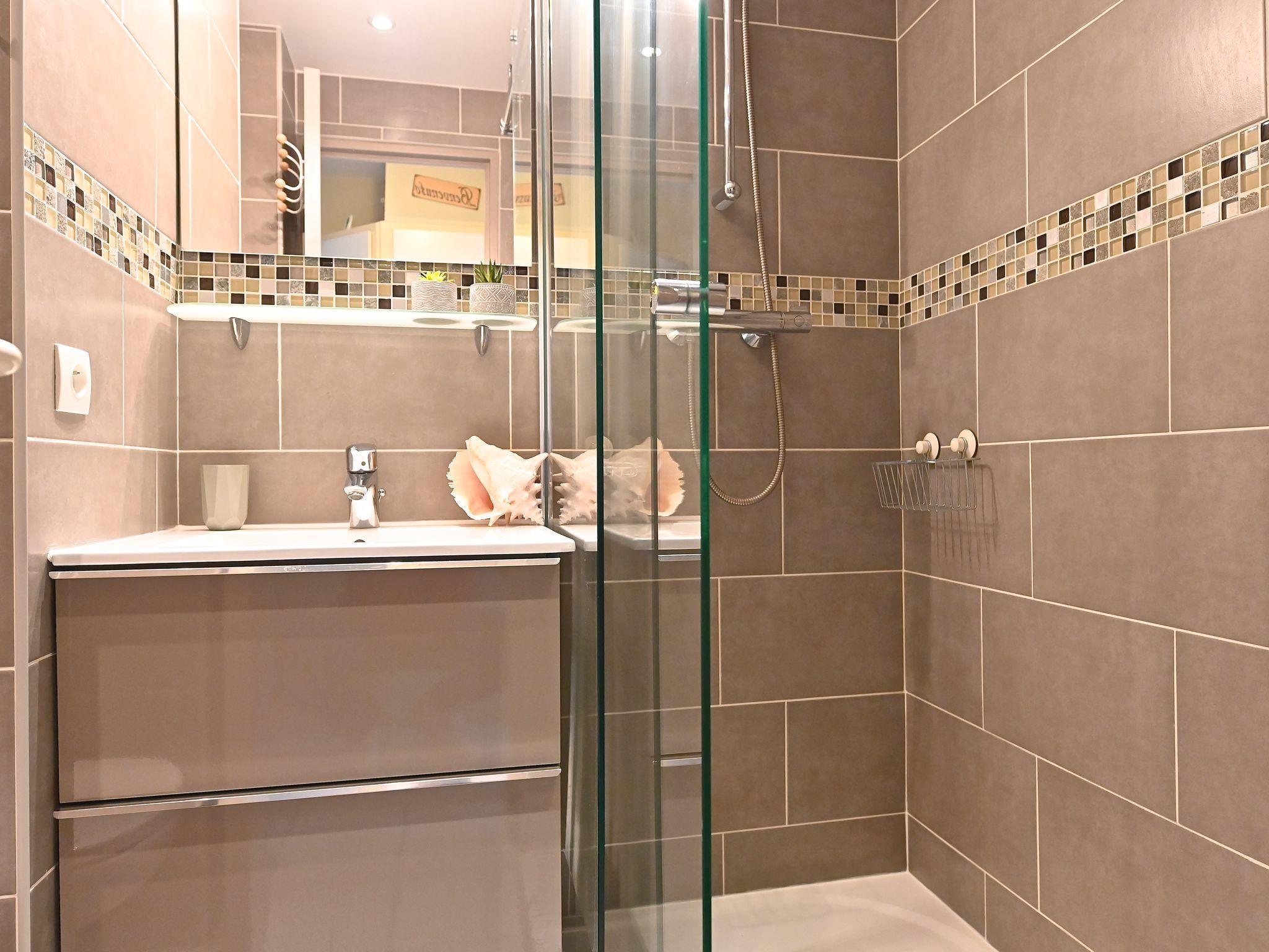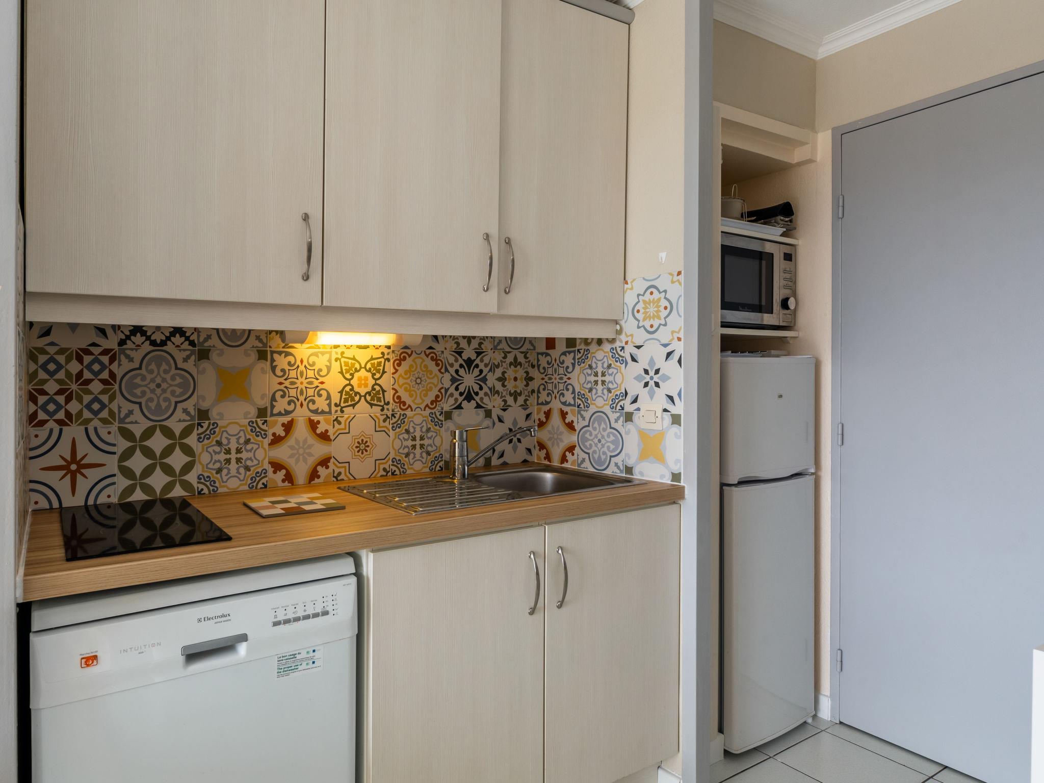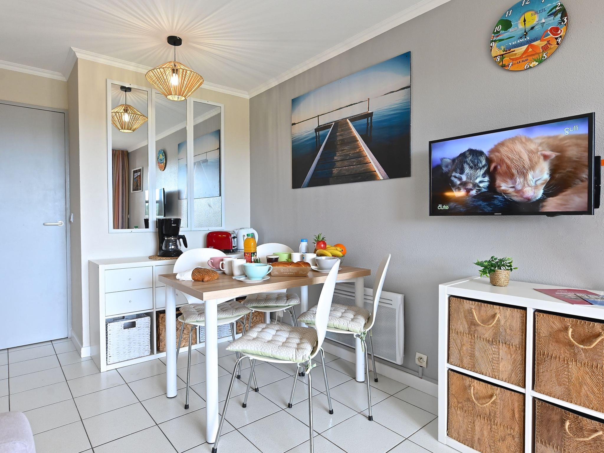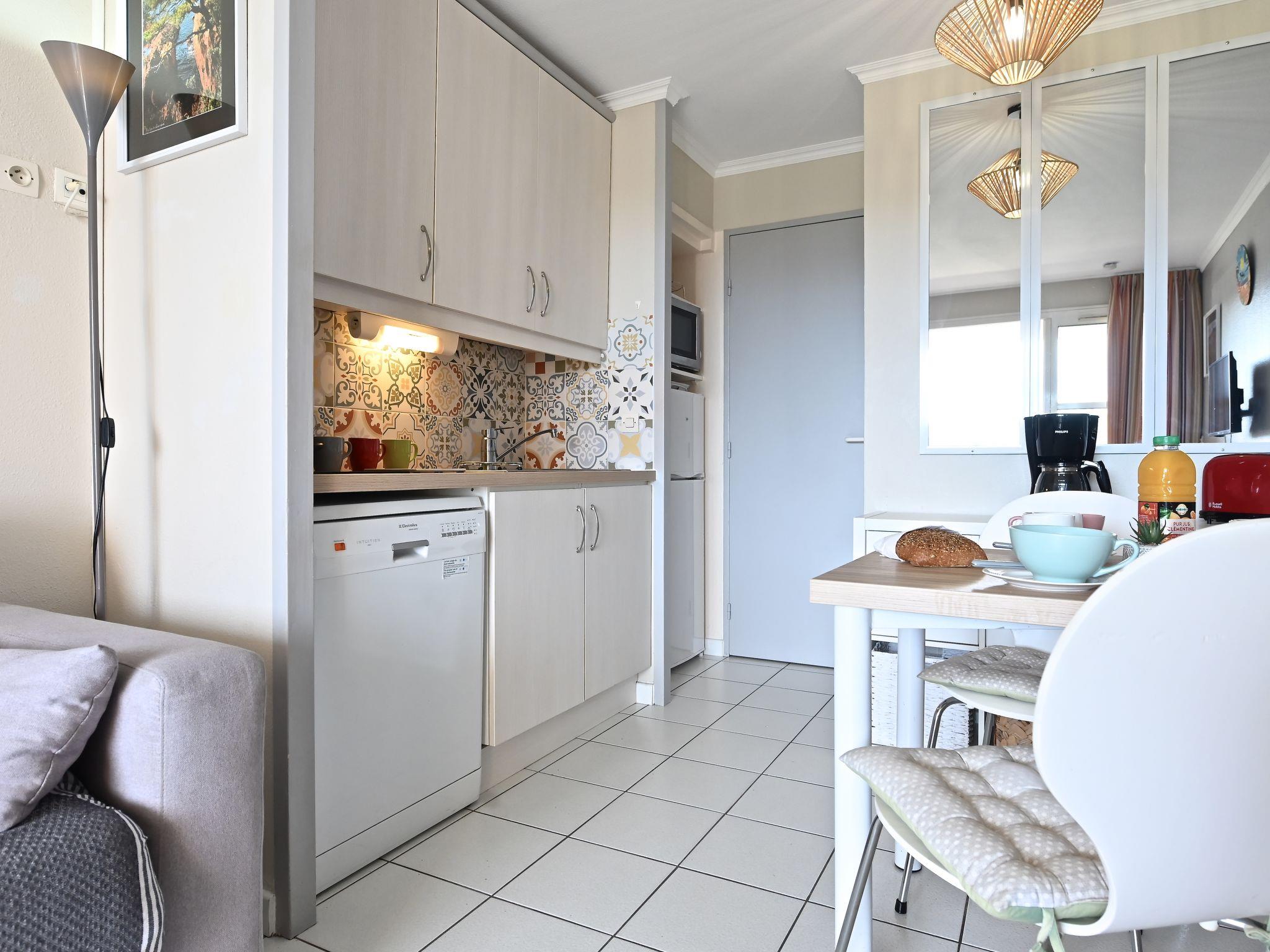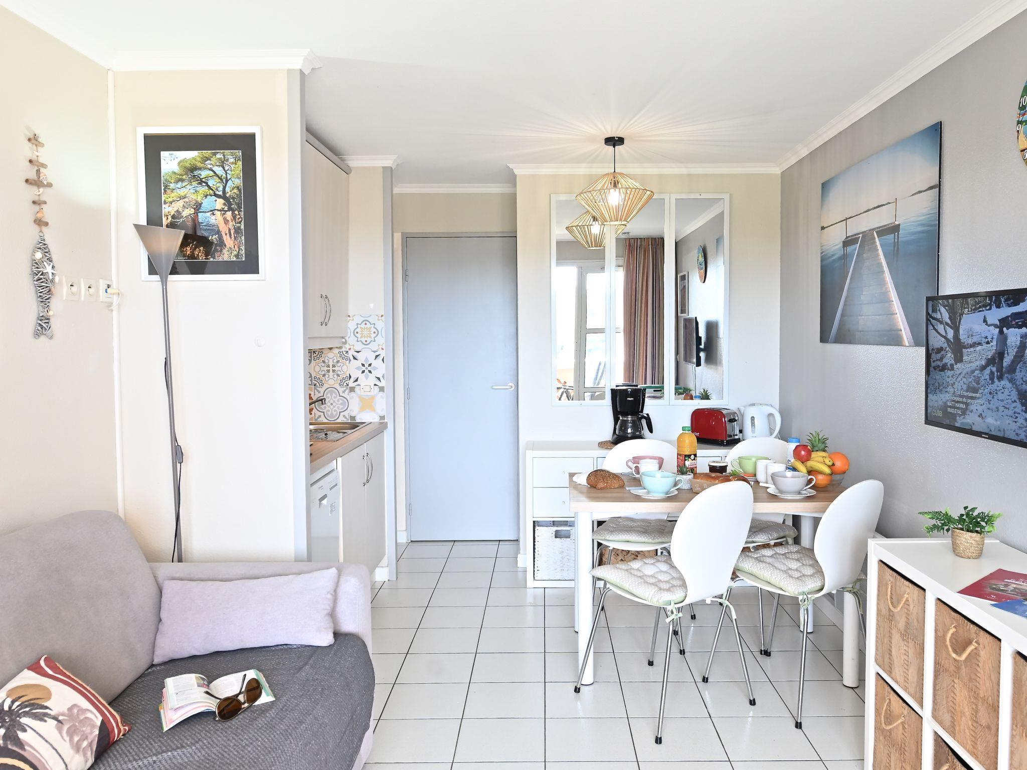 "L'Esquinade (F3 113)", 1-room studio 24 m2, on the ground floor. Bright, renovated in 2022, comfortable furnishings: living room with 1 sofabed (140 cm, length 190 cm), TV (flat screen), air conditioning and fan. Exit to the terrace. Alcove with 1 french bed (1 x 140 cm, length 190 cm). Kitchenette (2 hot plates, dishwasher, toaster, kettle, freezer, electric coffee machine, combination microwave). Shower/WC. Electric heating. Terrace 8 m2, roofed. Terrace furniture, electric barbecue. Beautiful view of the sea and golf course. Facilities: Internet (WiFi, extra). Parking (1 car). Please note: non-smokers only. 1 small pet/ dog allowed. Smoke alarm. Instead of an enclosed bedroom, some sleeping areas are located in an open-plan area (gallery, alcove, etc.). Offer by a private individual according to Art. 155, IV of CGI.