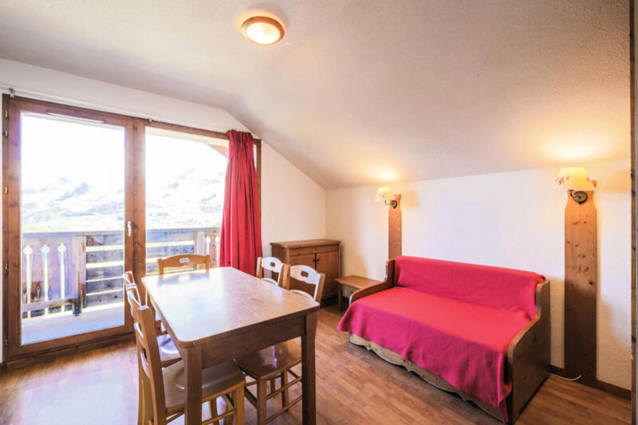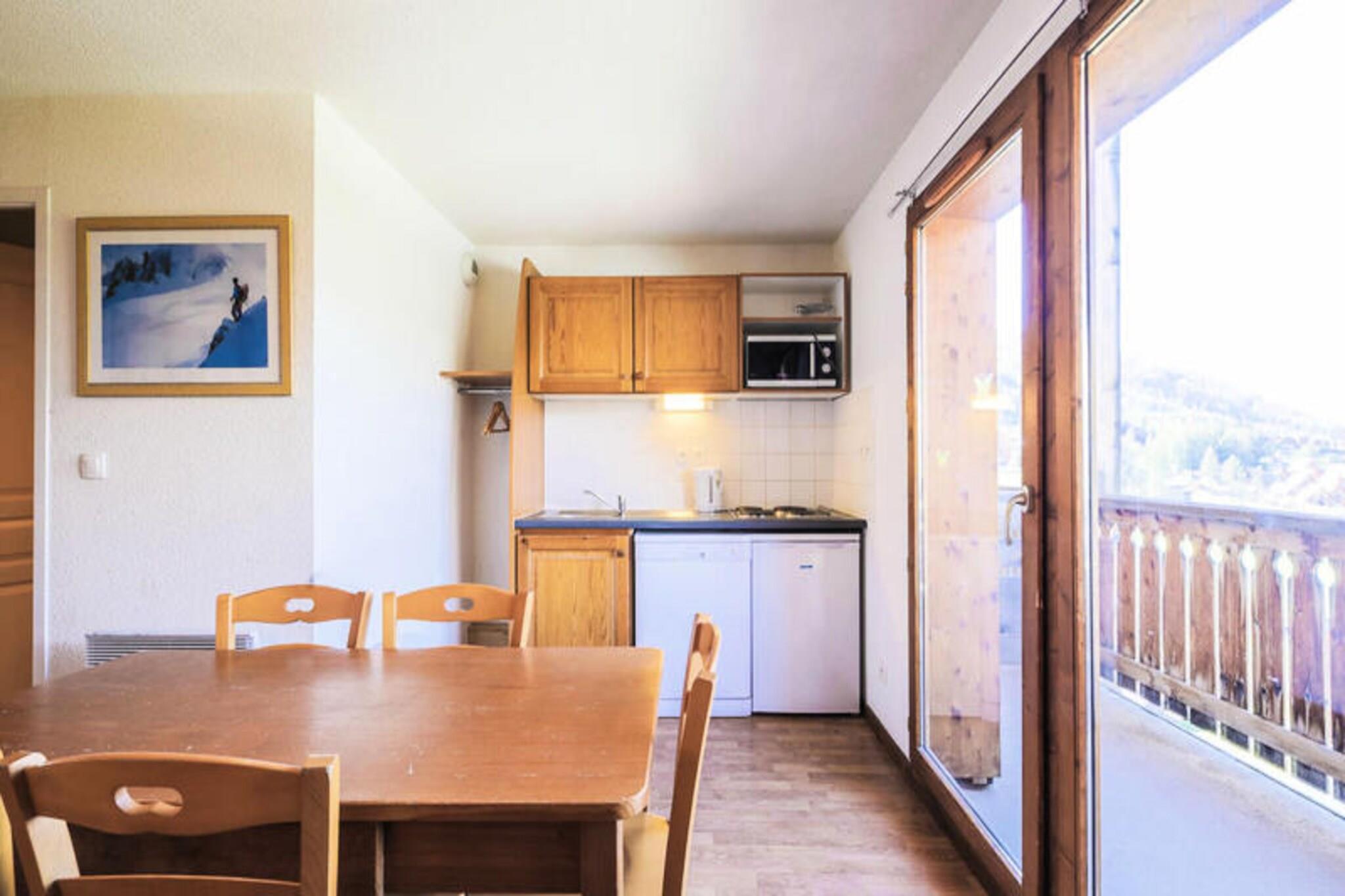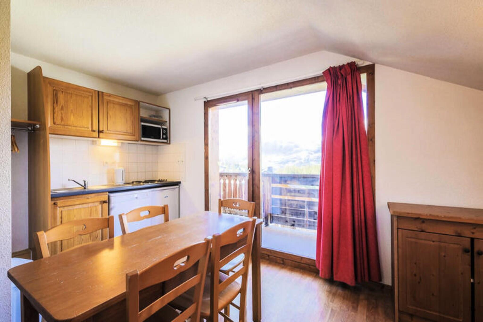 Denne hyggelige hytte på tredje sal giver et komfortabelt tilflugtssted med en sovesofa til to i opholdsrummet, en hytte med køjesenge og et soveværelse med to enkeltsenge. Hytten har også et badeværelse med badekar, et separat toilet og er kæledyrsvenlig mod et tillægsgebyr. Ekstra tjenester såsom sengetøj og håndklæder er tilgængelige efter anmodning, og gæster skal betale for slutrengøring. Beliggende i et fredeligt kvarter i La Joue du Loup, tilbyder chalet let adgang til de maleriske landskaber i de franske alper. Nyd den charmerende landsby med dens traditionelle alpine arkitektur, caféer, restauranter og butikker. Om sommeren kan gæsterne slappe af ved den udendørs swimmingpool, perfekt til at slappe af efter en dag med udforskning. Området byder på en rolig atmosfære, ideel for naturelskere. Hyttens åbne køkken, integreret med opholdsrummet, giver mulighed for nem tilberedning af måltider og socialt samvær. Et spisebord med seks stole giver rigelig plads til familiens måltider. Uanset om du laver mad eller slapper af, er denne lejlighed udstyret til et hyggeligt og behageligt ophold i bjergene.