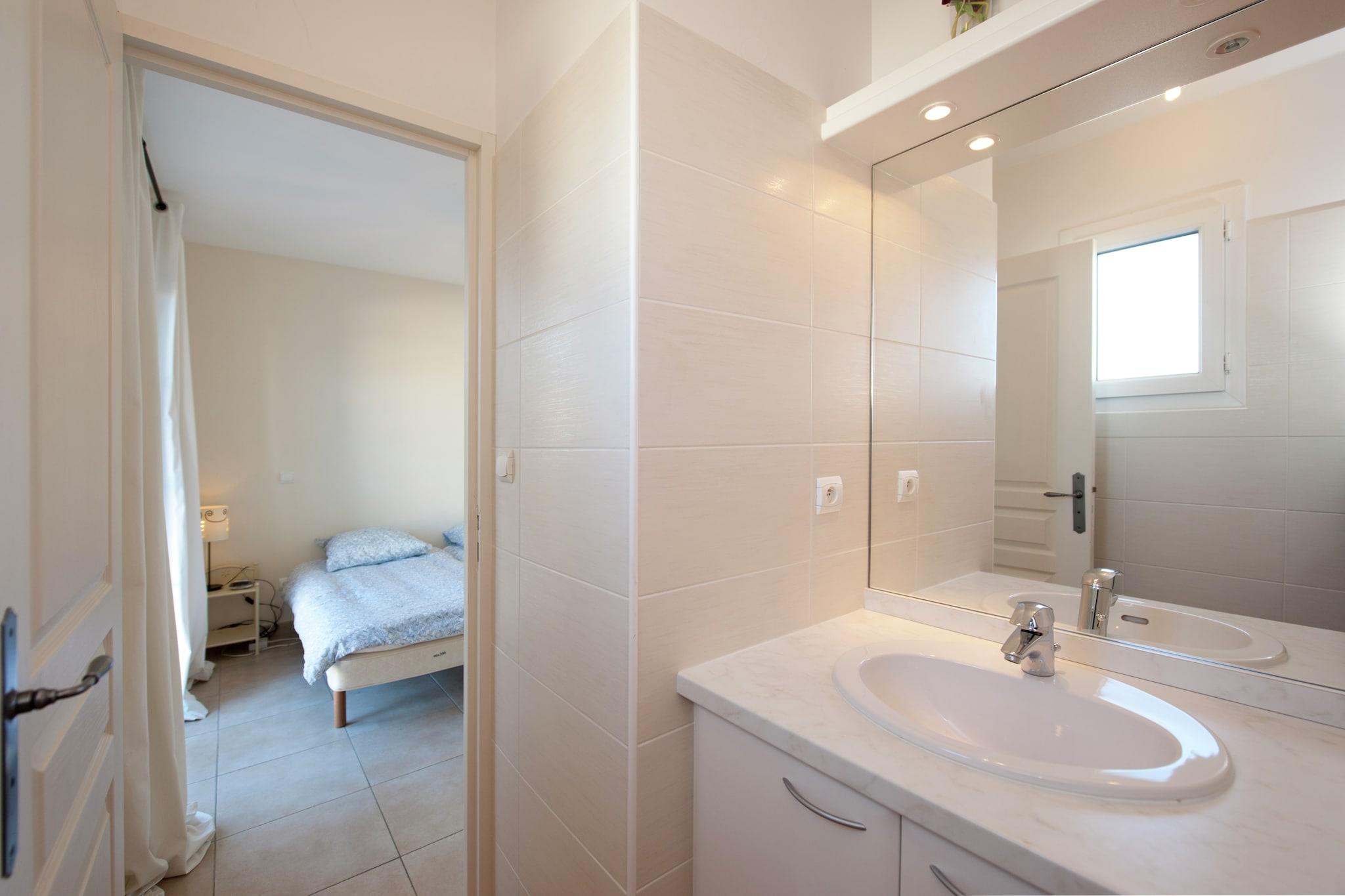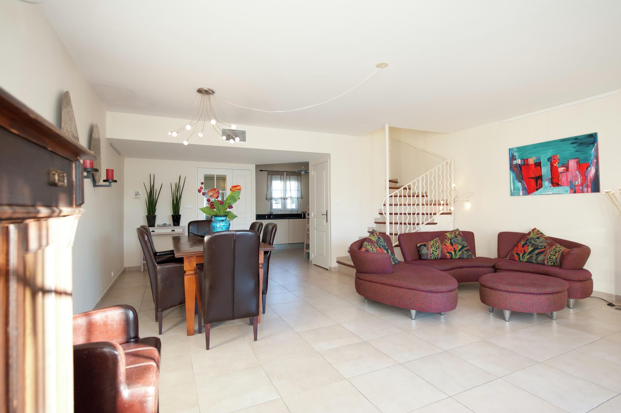 Stueetage: (entre, Stue(Fjernsyn(parabol), spisebord, sofahjørne, DVD-afspiller), åbent køkken(elkedel, ovn, mikrobølgeovn, opvaskemaskine , køle-fryseskab, vaskemaskine), toilet, klimaanlæg, terrasse) På 1. etage: (soveværelse(enkeltseng(90 x 200 cm), feltseng(90 x 200 cm)), soveværelse(køjeseng), Soveværelse med badeværelse(dobbeltseng(160 x 200 cm), bruser, håndvask), badeværelse(badekar med bruser, 2x håndvask), toilet, Repos, balkon, terrasse)