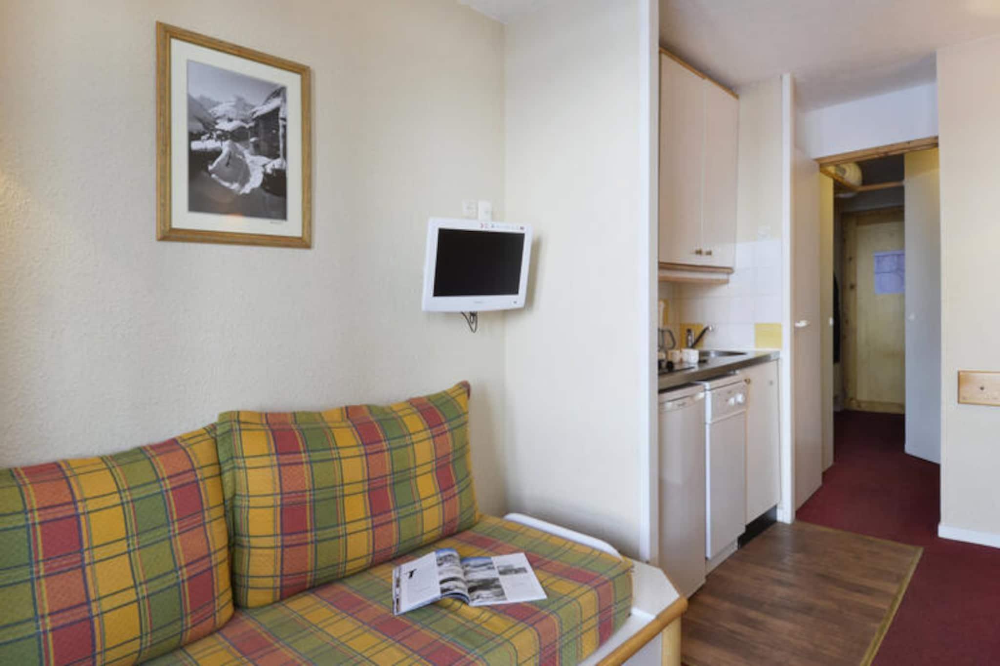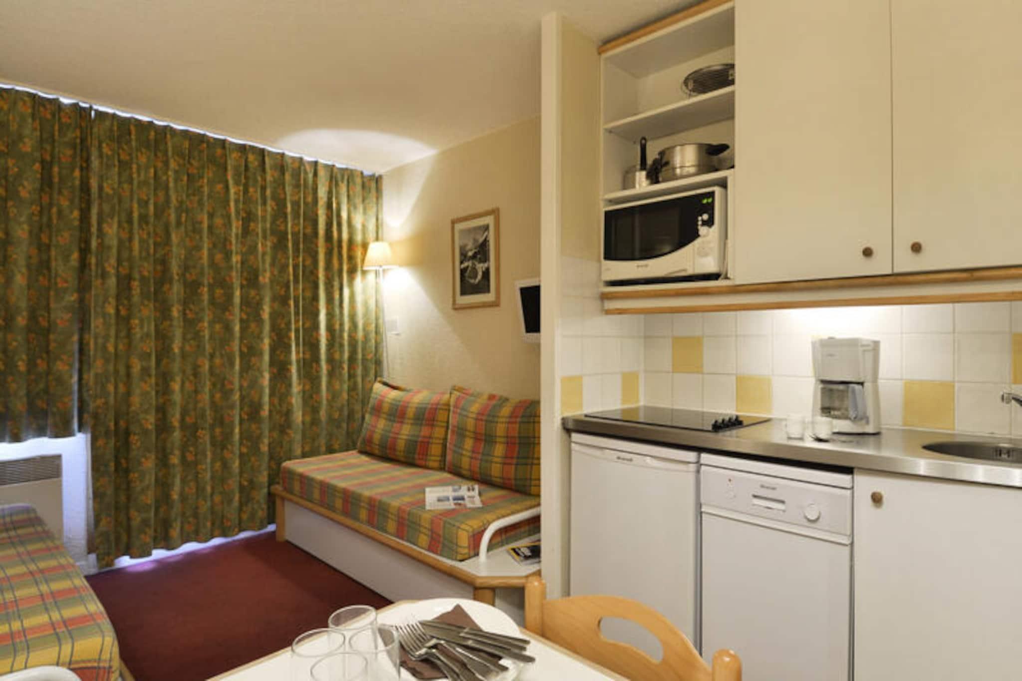 Højt over de maleriske skråninger i Belle Plagne tilbyder denne charmerende studiohytte et hyggeligt tilflugtssted for op til fire gæster. Beliggende i den øvre del af feriestedet har boligen direkte adgang til skiløjperne, hvilket gør den til en drømmedestination for vintersportsentusiaster. Forestil dig at træde ud af din dør og ud på den uberørte sne, klar til at bane dig vej gennem det betagende alpine landskab. Med sin sydvendte beliggenhed er lejligheden badet i sollys og tilbyder en fantastisk udsigt over pisterne lige fra dit vindue. Uanset om du er her for at stå på ski eller blot for at nyde den rolige bjergatmosfære, lover denne ejendom et mindeværdigt ophold. \n\nDet kompakte, men gennemtænkte design har 23 m² studiolejlighed en praktisk planløsning, der maksimerer komfort og bekvemmelighed. Det åbne køkken er udstyret med en 4-brænder keramisk kogeplade, kombiovn, køleskab og opvaskemaskine, hvilket gør madlavning til en leg. Stuen har to enkeltsofaer og en udtræksseng, mens soveområdet har hyggelige køjesenge, perfekt til familier eller små grupper. Et fladskærms-tv sørger for underholdning efter en dag på pisterne, og badeværelset har badekar og toilet til afslappende aftener. Selvom lagner og håndklæder ikke er inkluderet, er dyner tilgængelige, hvilket sikrer en varm og afslappende nats søvn. Betalt Wi-Fi og kæledyrsvenlig indkvartering bidrager til appellen ved dette indbydende sted. \n\nBeliggende kun 100 meter fra butikker og faciliteter, tilbyder boligen bekvemmelighed sammen med sin alpine charme. Underjordisk parkering med direkte adgang til bygningen er tilgængelig mod et gebyr, og individuelle skibokse gør opbevaring af dit udstyr problemfri. Udover skiløb forvandles Belle Plagne til et centrum for udendørsaktiviteter i sommermånederne, med vandrestier, mountainbikeruter og betagende udsigter, der venter på at blive udforsket. Uanset om du besøger stedet for en actionfyldt ferie eller en fredelig bjergflugt, er denne studiohytte den perfekte base for dine eventyr.