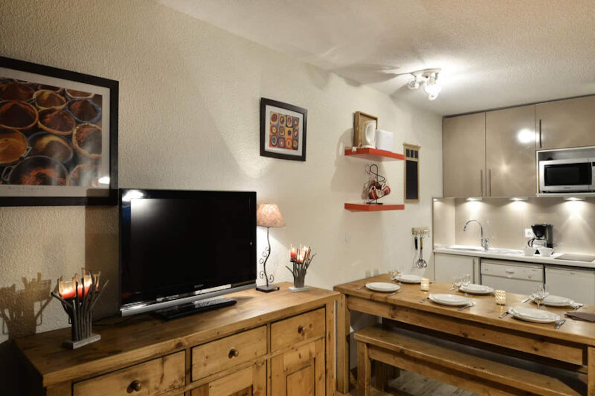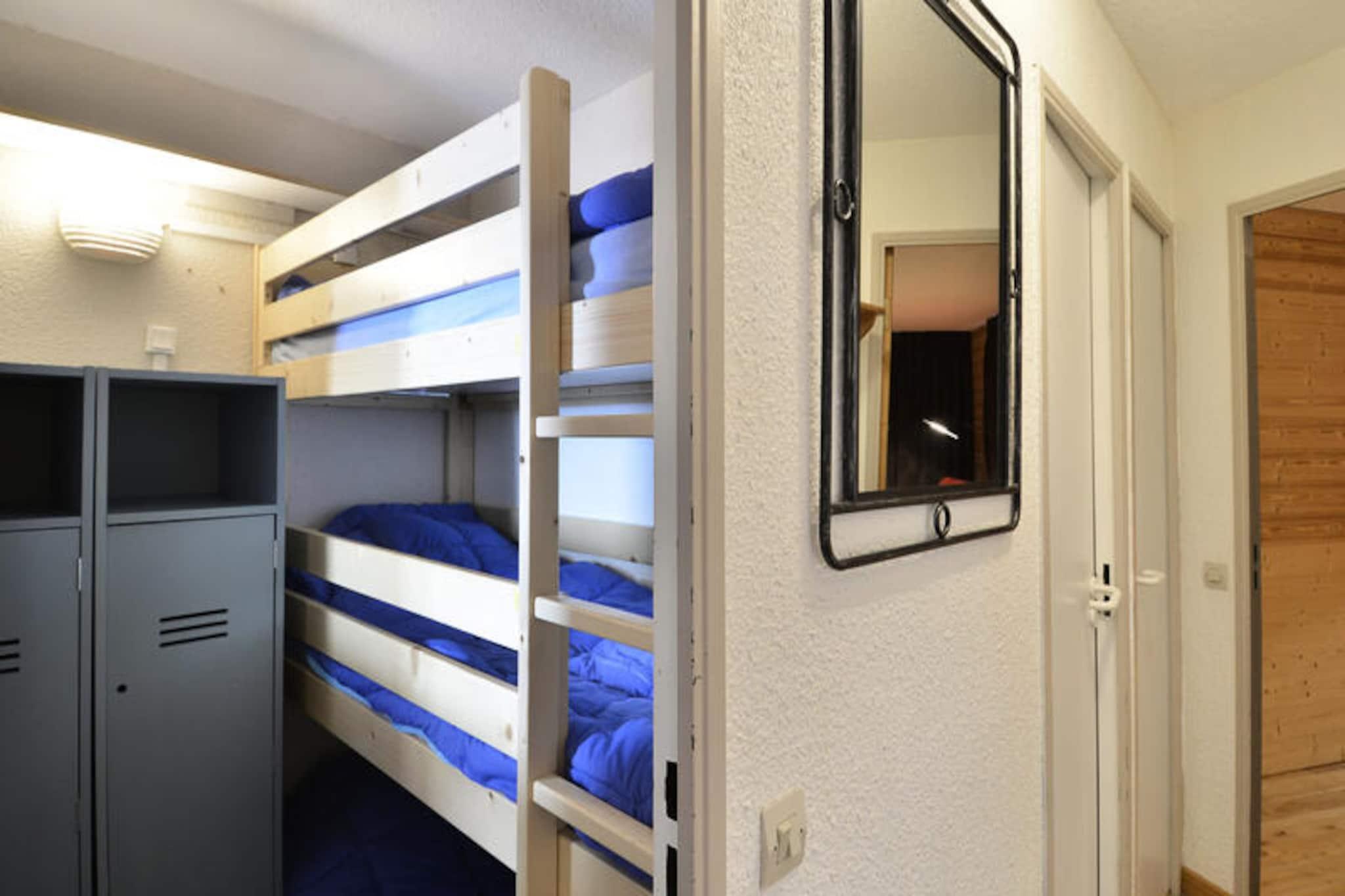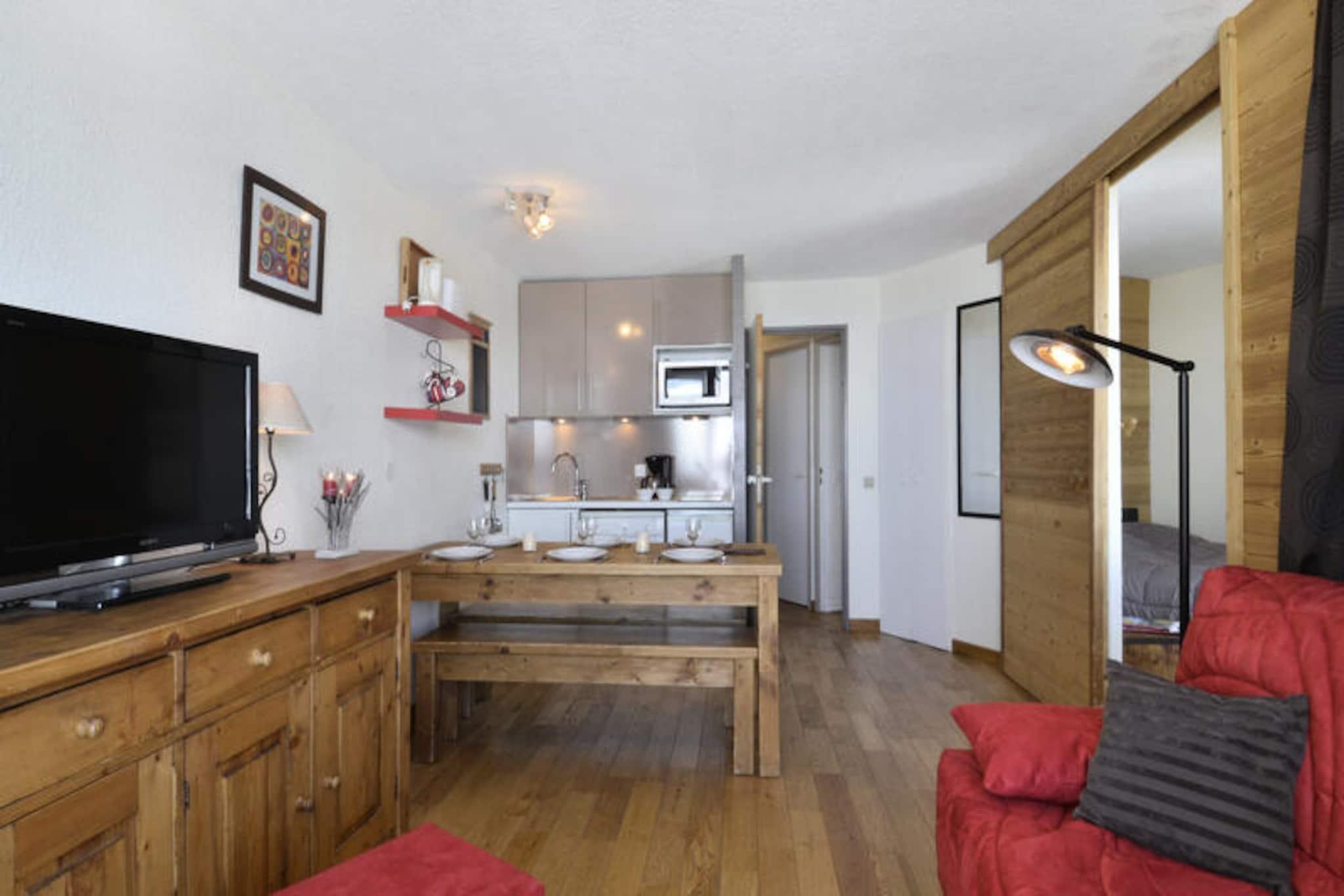 Højt over det fortryllende Belle Plagne-resort inviterer denne hyggelige lejlighed dig til at opleve magien i de franske alper. Forestil dig at vågne op til de solbeskinnede pister lige uden for dit vindue, med den uberørte sne, der kalder på en start på dagen. Uanset om du er her for spændende skieventyr eller et roligt bjergophold, tilbyder denne ejendom den perfekte balance mellem komfort og bekvemmelighed i et af regionens mest maleriske omgivelser. \n\nDenne nyrenoverede 36 m² store lejlighed i stueetagen er omhyggeligt designet til at rumme op til seks gæster. Stuen har en dobbelt sovesofa og et fladskærms-tv, hvilket skaber et indbydende rum at slappe af efter en dag på pisterne. Køkkenet, der er udstyret med keramisk kogeplade, mikrobølgeovn og opvaskemaskine, gør det nemt at tilberede måltider. To hyggelige soveværelser har en dobbeltseng og køjesenge, hvilket sikrer en afslappende nat for alle. Det moderne badeværelse med bruseniche og separat toilet bidrager til komforten, mens parketgulv giver en varm, alpin charme. \n\nBeliggende i den øverste del af resortet tilbyder boligen direkte adgang til pisterne, hvilket gør den til en drøm for skientusiaster. Butikker er bekvemt placeret kun 100 meter væk, og underjordisk parkering med direkte adgang til bygningen sikrer problemfri ankomst. For ekstra bekvemmelighed er der individuelle skibokse og betalt Wi-Fi på resortet. \n\nUanset om du udforsker Paradiski-området eller blot nyder den betagende udsigt, er denne lejlighed din port til uforglemmelige alpine minder. Med sin førsteklasses beliggenhed og gennemtænkte faciliteter er det det ideelle valg for familier, venner og alle, der søger skønheden i Belle Plagne.