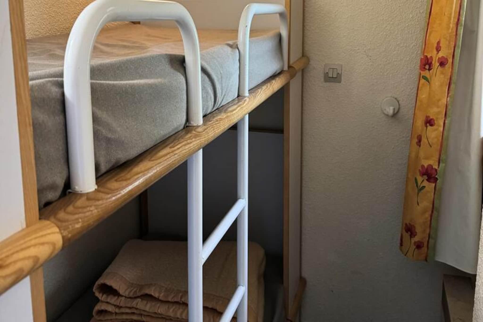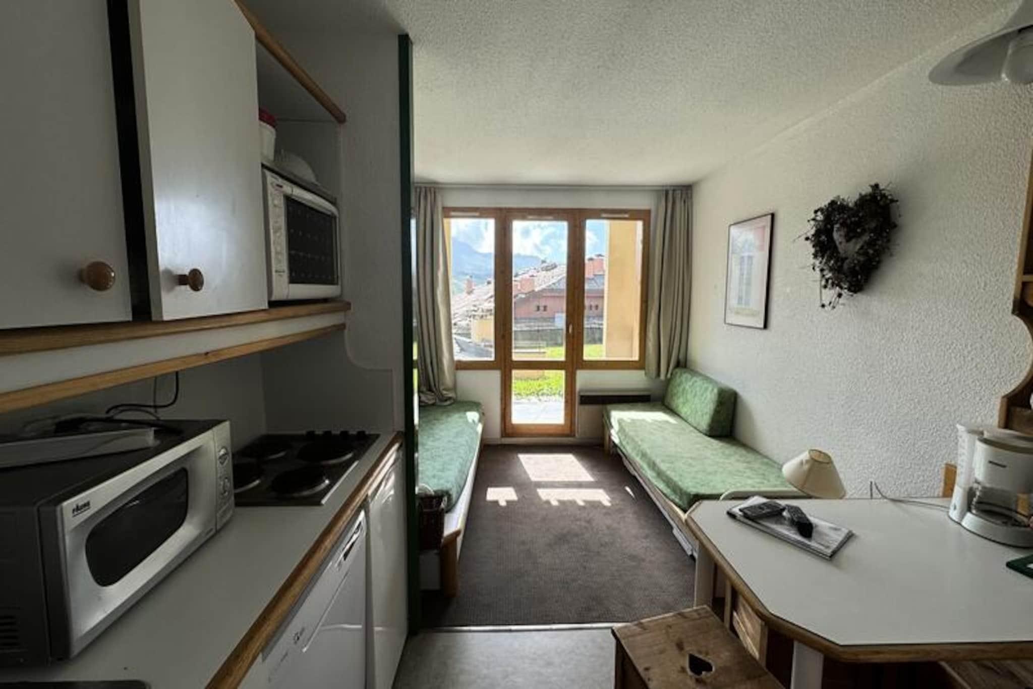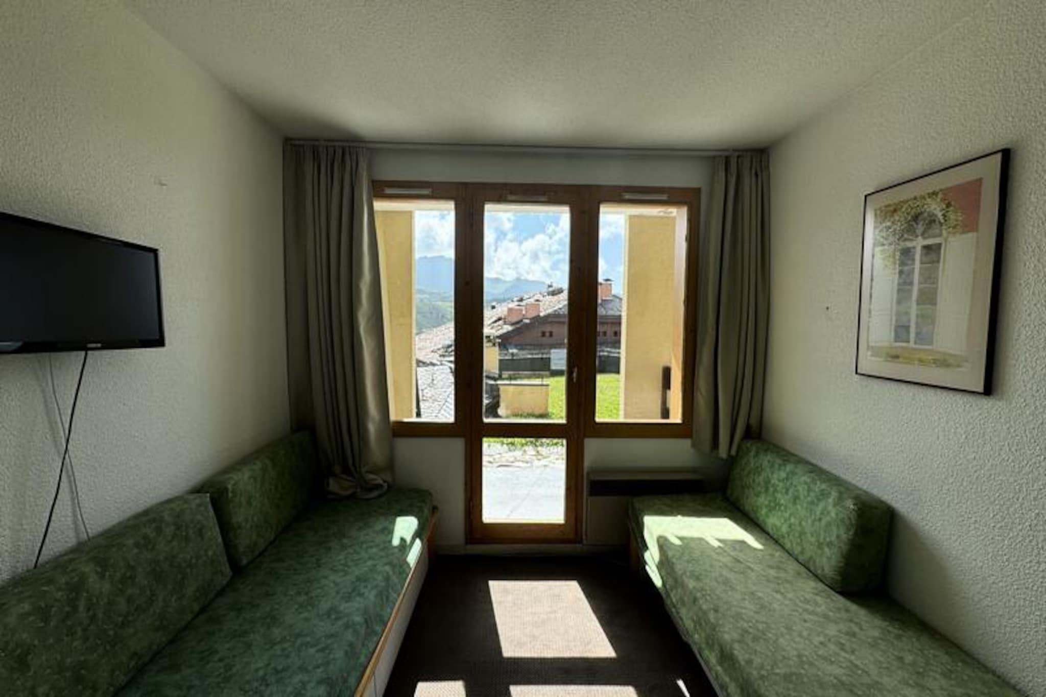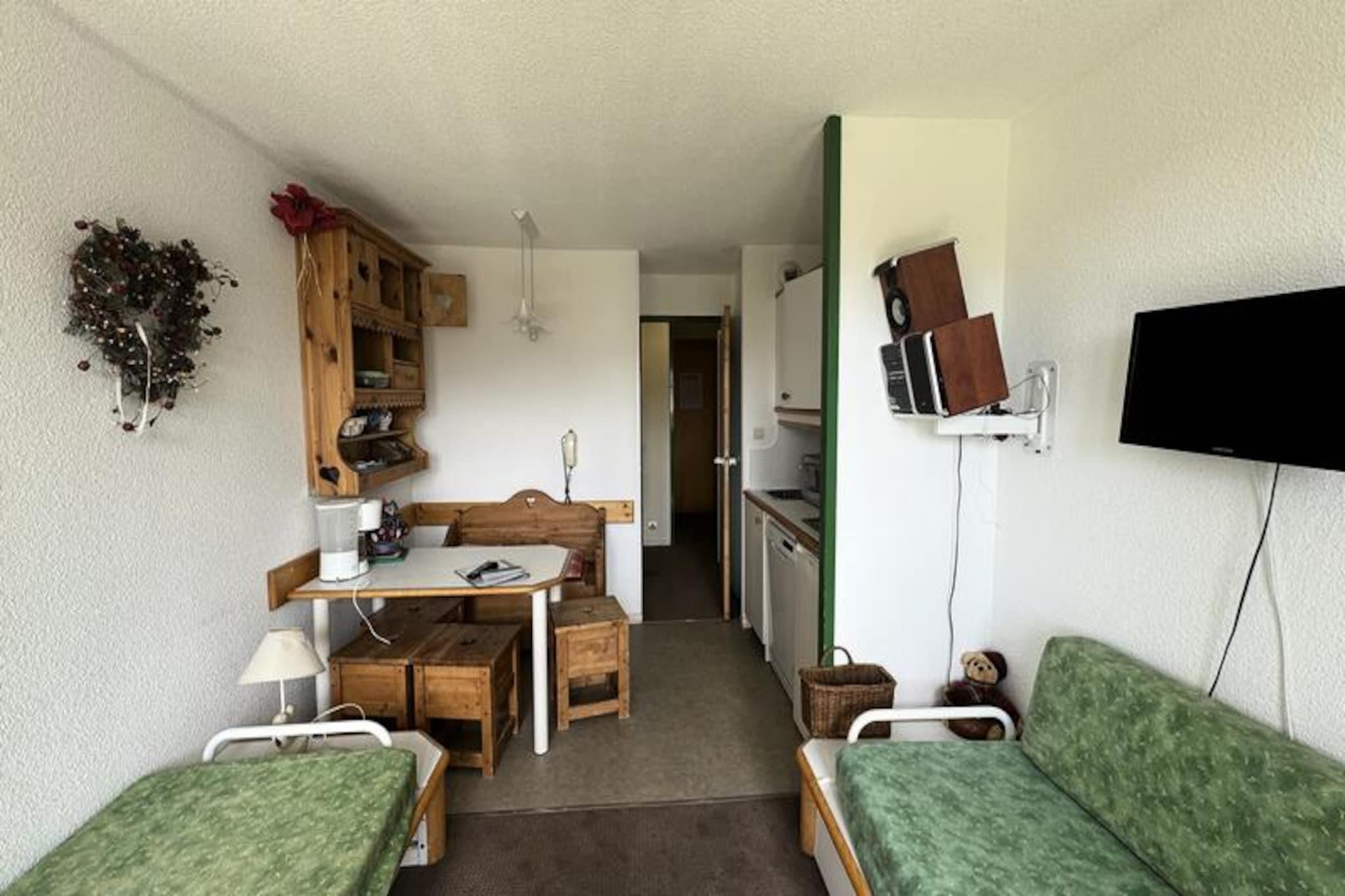 Højt over det charmerende Belle Plagne-skisportssted tilbyder dette hyggelige studie en plads på første række til det alpine eventyrland. Med direkte adgang til pisterne kan du træde ud af din dør og ud i den uberørte sne, klar til at udforske det store Paradiski-skiområde. Boligen, der ligger i den øvre del af skisportsstedet, kombinerer bekvemmelighed med en betagende udsigt over bjergene, hvilket gør det til et ideelt tilflugtssted for både vintersportsentusiaster og naturelskere. Fra din vestvendte balkon kan du nyde fredfyldte solnedgange over pisterne efter en spændende dag i sneen. Kompakt, men gennemtænkt designet, har dette 23 m² store studie komfortabel plads til op til 4 gæster. Opholdsstuen har to enkeltsenge og en udtræksseng, mens en hyggelig sovealkove tilbyder køjesenge, perfekt til familier eller små grupper. Køkkenet, der er udstyret med moderne apparater, herunder ovn, mikrobølgeovn, opvaskemaskine og køleskab, inviterer dig til at tilberede solide måltider efter en dag med eventyr. Et fladskærms-tv og en varm, indbydende atmosfære sikrer afslapning og komfort under dit ophold. Badeværelset har badekar og toilet, og der er tæpper til rådighed for din bekvemmelighed. Residensen kan prale af praktiske faciliteter såsom elevator, individuelle skibokse og betalt parkeringskælder med direkte adgang. Butikker, restauranter og resortfaciliteter ligger kun 100 meter væk, hvilket sikrer, at alt hvad du behøver er inden for rækkevidde. For ekstra bekvemmelighed er der betalt Wi-Fi tilgængeligt på resortet, så du kan holde dig forbundet, mens du nyder din alpine ferie. Uanset om du er her for at grave dig gennem frisk puddersne, nyde de fantastiske bjergudsigter eller blot slappe af i den friske alpeluft, tilbyder dette studie i Belle Plagne den perfekte base for uforglemmelige minder i hjertet af de franske alper.