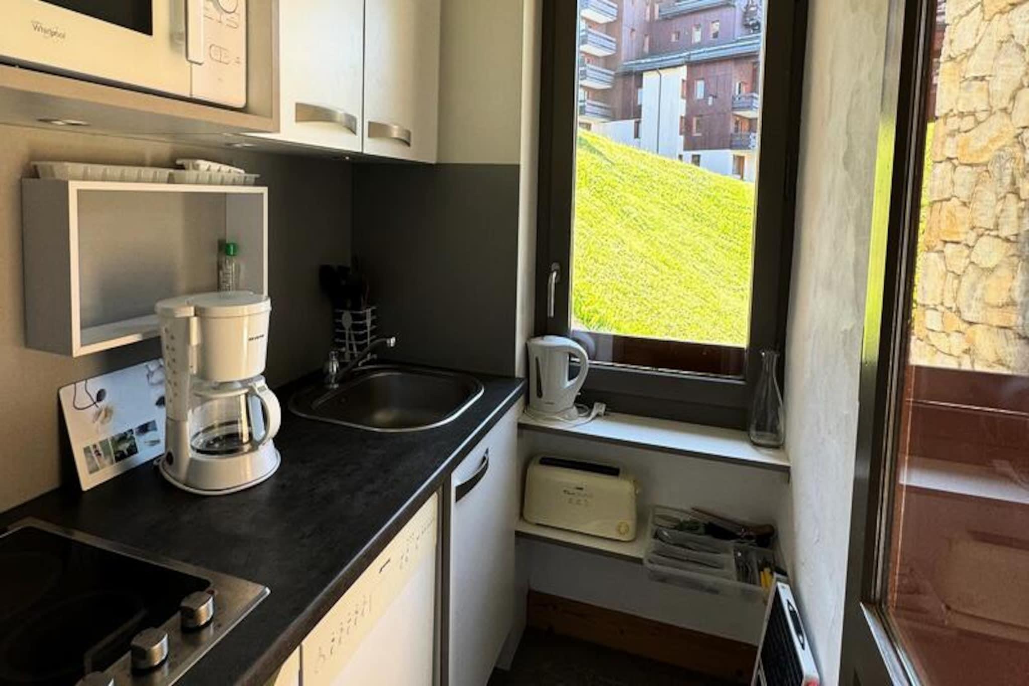 I hjertet af Belle Plagne, hvor charmen fra de franske alper møder moderne bekvemmeligheder, tilbyder dette hyggelige studie et perfekt tilflugtssted for både skientusiaster og bjergentusiaster. Forestil dig at vågne op til den fredfyldte skønhed af snedækkede pister, kun 50 meter fra din dørtrin, og starte din dag med den friske alpine luft og den betagende udsigt fra din sydøstvendte balkon. Uanset om du er her for spændende vintereventyr eller de rolige sommerlandskaber, placerer denne bolig dig i centrum af det hele. Studiet, der er omhyggeligt designet til 4 til 5 gæster, kombinerer komfort og praktisk anvendelighed i sin 28 m² store planløsning. Stuen har to enkeltsenge og en udtræksseng, suppleret af et fladskærms-tv til hyggelige aftener. En separat kahyt med to enkeltsenge giver ekstra privatliv, hvilket gør den ideel til familier eller små grupper. Køkkenet er udstyret med keramisk kogeplade, mikrobølgeovn/grillovn, køleskab og opvaskemaskine, hvilket sikrer, at du har alt, hvad du behøver for at tilberede solide måltider efter en dag på pisterne. Badeværelset har et badekar til afslappende bad, og det separate toilet øger bekvemmeligheden. Med alle butikker i nærheden og et skirum til dit udstyr finder du alt, hvad du behøver, inden for rækkevidde. Ejendommen tilbyder også betalt underjordisk parkering med direkte adgang, hvilket gør dit ophold problemfrit. Om vinteren er pisterne praktisk talt lige uden for døren, mens de alpine stier og det pulserende bjerglandskab om sommeren venter på at blive udforsket. Uanset om du søger en aktiv ferie eller en fredelig flugt, lover dette Belle Plagne-studie et mindeværdigt ophold i hjertet af Alperne, der blander komfort, bekvemmelighed og bjergenes magi.