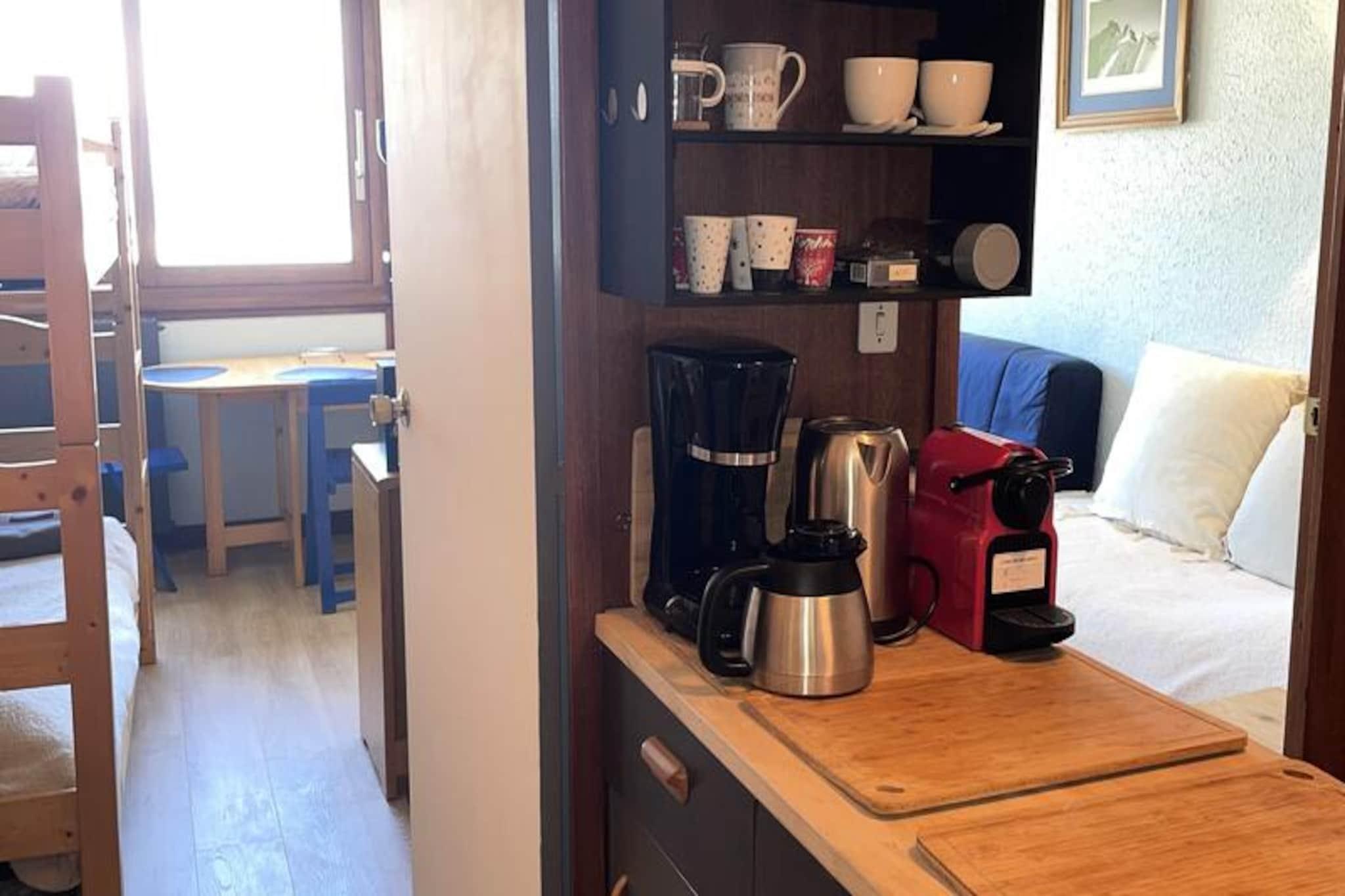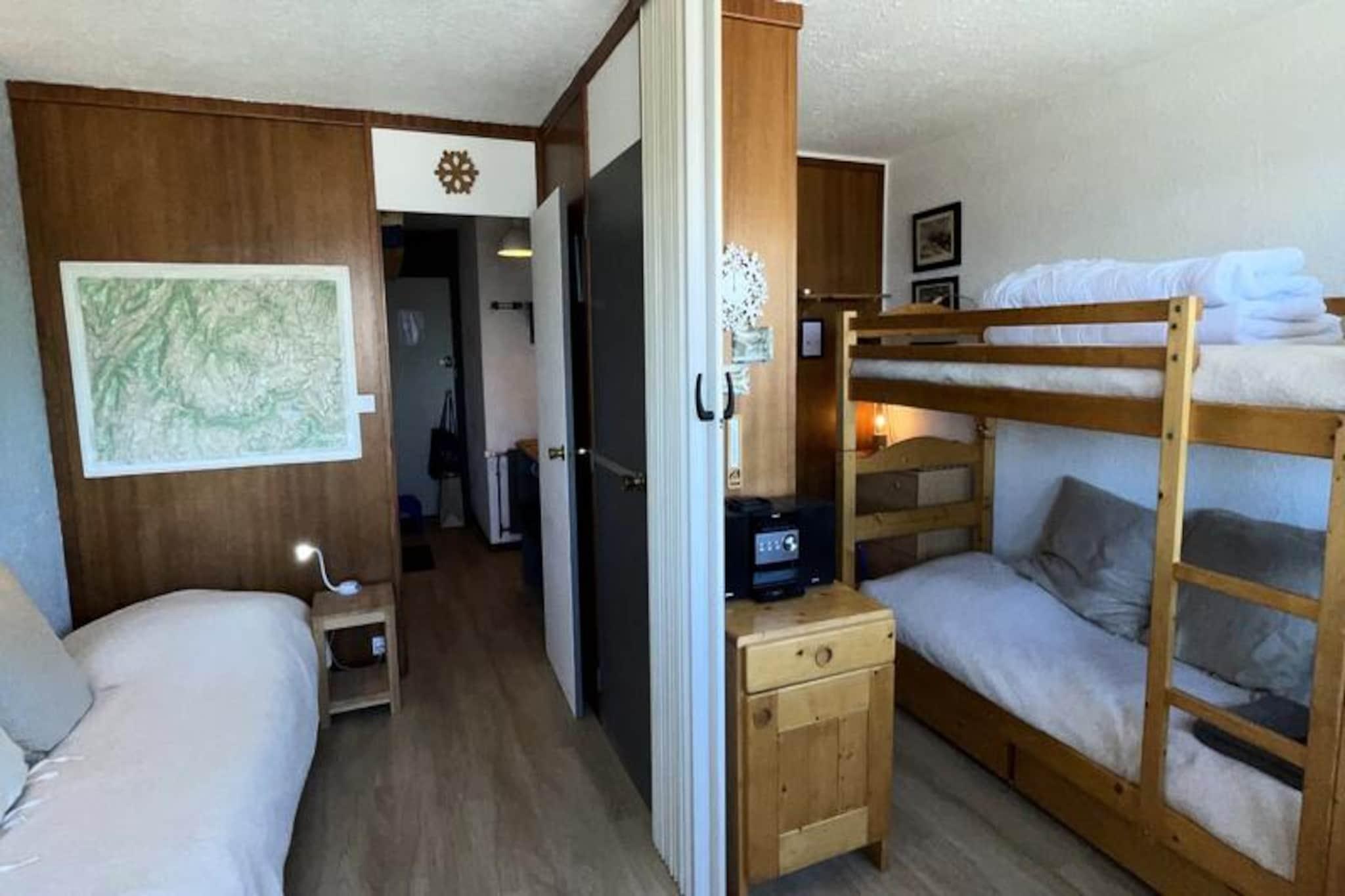 Højt over La Plagnes fortryllende skråninger tilbyder dette hyggelige studie i Vercors-residensen et ideelt tilflugtssted for både skientusiaster og bjergelskere. Med direkte adgang til snefronten og de pulserende Plagne Centre-gallerier placerer denne ejendom dig i hjertet af alpint eventyr. Uanset om du er her for at grave dig gennem uberørte pister eller blot nyde den fredfyldte udsigt over bjergene, lover denne residens et mindeværdigt ophold i de franske alper. Det 27 m² store studie er designet til at rumme op til fire gæster og er omhyggeligt indrettet med både komfort og praktisk anvendelighed i tankerne. Opholdsstuen, smart opdelt af et skydepanel, har to enkeltsenge og et sæt køjesenge, der sikrer afslappende nætter efter aktive dage. Køkkenet er fuldt udstyret med moderne faciliteter, herunder keramiske kogeplader, køleskab, mikrobølgeovn og endda en Nespresso-kaffemaskine til din morgenkaffe. Et fladskærms-tv og hyggelige dyner bidrager til den indbydende atmosfære, mens badeværelset har badekar og alle nødvendige faciliteter. Bemærk venligst, at sengelinned ikke er inkluderet, og kæledyr er ikke tilladt. Træd udenfor, og find dig selv kun få øjeblikke fra skilektioner, dagpleje og de livlige faciliteter i Plagne Centre. Det praktiske skirum sikrer, at dit udstyr altid er klar til det næste eventyr. Om sommeren forvandles området til et paradis for vandrere og naturelskere med betagende stier og panoramaudsigter, der venter på at blive udforsket. Uanset om du besøger stedet for vinterspænding eller sommerro, tilbyder dette studie den perfekte base for din alpine flugt.