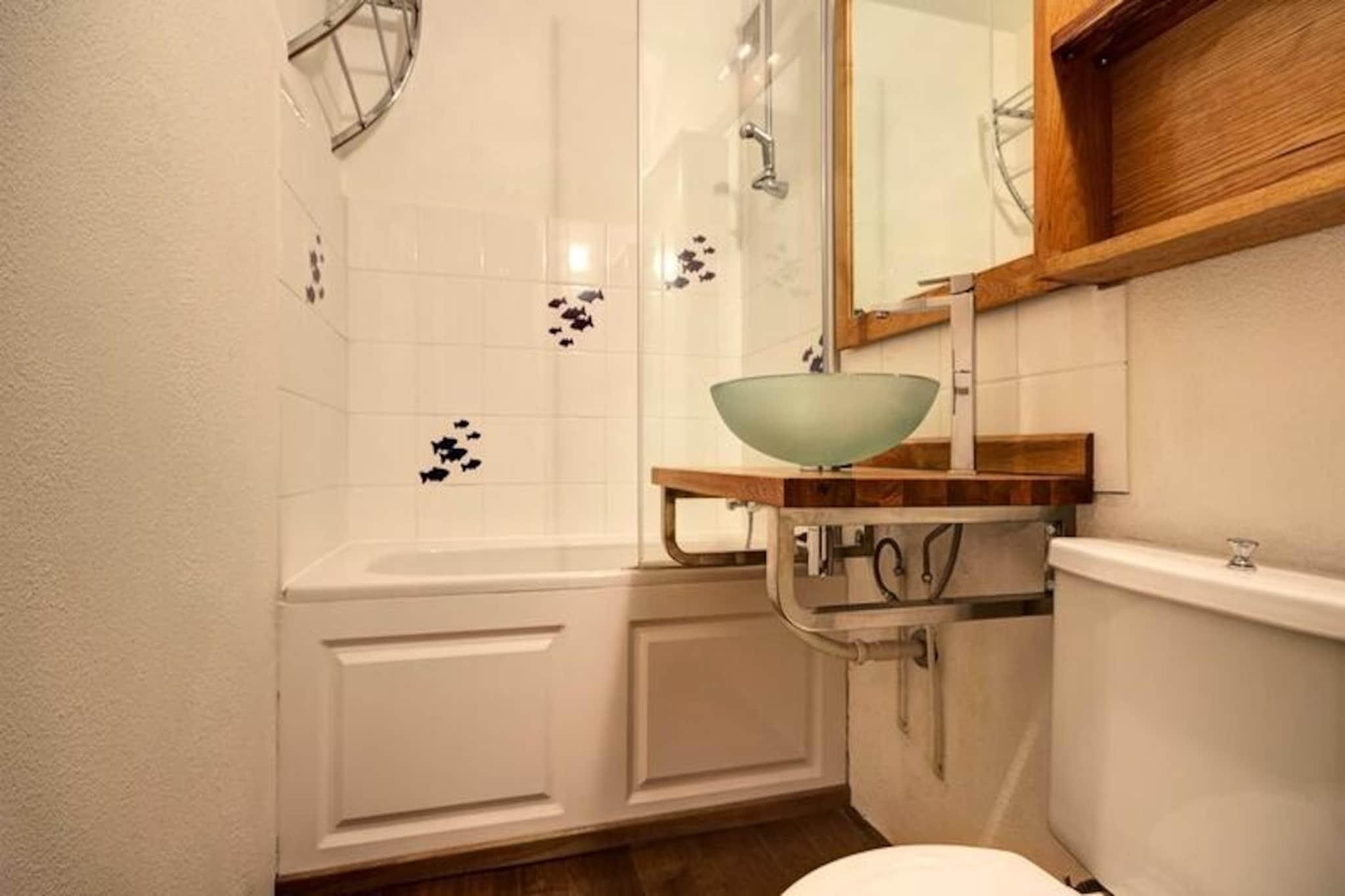 Højt over Tarentaise-dalen tilbyder dette charmerende studie i Plagne Centre et hyggeligt alpint tilflugtssted med en betagende udsigt over Mont Blanc. Uanset om du søger spændende skieventyr eller rolige bjergture, er denne bolig i stueetagen i Le Cerro Torre-komplekset perfekt placeret til at fordybe dig i de franske alpers skønhed. Forestil dig at vågne op til Mont Blancs majestætiske silhuet fra din nordvendte balkon, en rolig kulisse for dine morgener i bjergene. \n\nDet 22 m² store studie er designet til to gæster og kombinerer komfort og praktisk anvendelighed. Opholdsstuen har en sovesofa og en udtræksseng, der sikrer afslappende nætter efter dage fyldt med udendørs spænding. Det veludstyrede køkken inkluderer keramiske kogeplader, køleskab, mikrobølgeovn/grill og opvaskemaskine, hvilket gør det nemt at tilberede solide måltider. Et fladskærms-tv og en dvd-afspiller sørger for underholdning, mens badeværelset tilbyder et badekar til afslapning efter en dag på pisterne. Skientusiaster vil sætte pris på bekvemmeligheden ved skiboksen, der sikrer, at udstyret er klar til det næste eventyr. Bemærk venligst, at sengelinned ikke er inkluderet, og kæledyr er ikke tilladt.\n\nStudioet ligger ved udkørslen fra Plagne Centre nær Araucaria Hotel og er ideelt placeret til at udforske Paradiski-området, der er kendt for sine omfattende skiløjper og pulserende afterski-atmosfære. Om sommeren forvandles regionen til et paradis for vandrere og cyklister med stier, der fører til panoramaudsigter og alpine enge. Det nærliggende Aime 2000-område tilbyder yderligere aktiviteter og spisemuligheder, der sikrer, at hvert øjeblik af dit ophold er fyldt med opdagelser.\n\nUanset om du er tiltrukket af spændingen ved vintersport eller roen i sommerlandskaber, inviterer dette studie dig til at opleve Alpernes magi i komfort og stil. Lad Mont Blancs skønhed og Plagne Centres charme skabe uforglemmelige minder til din alpeferie.
