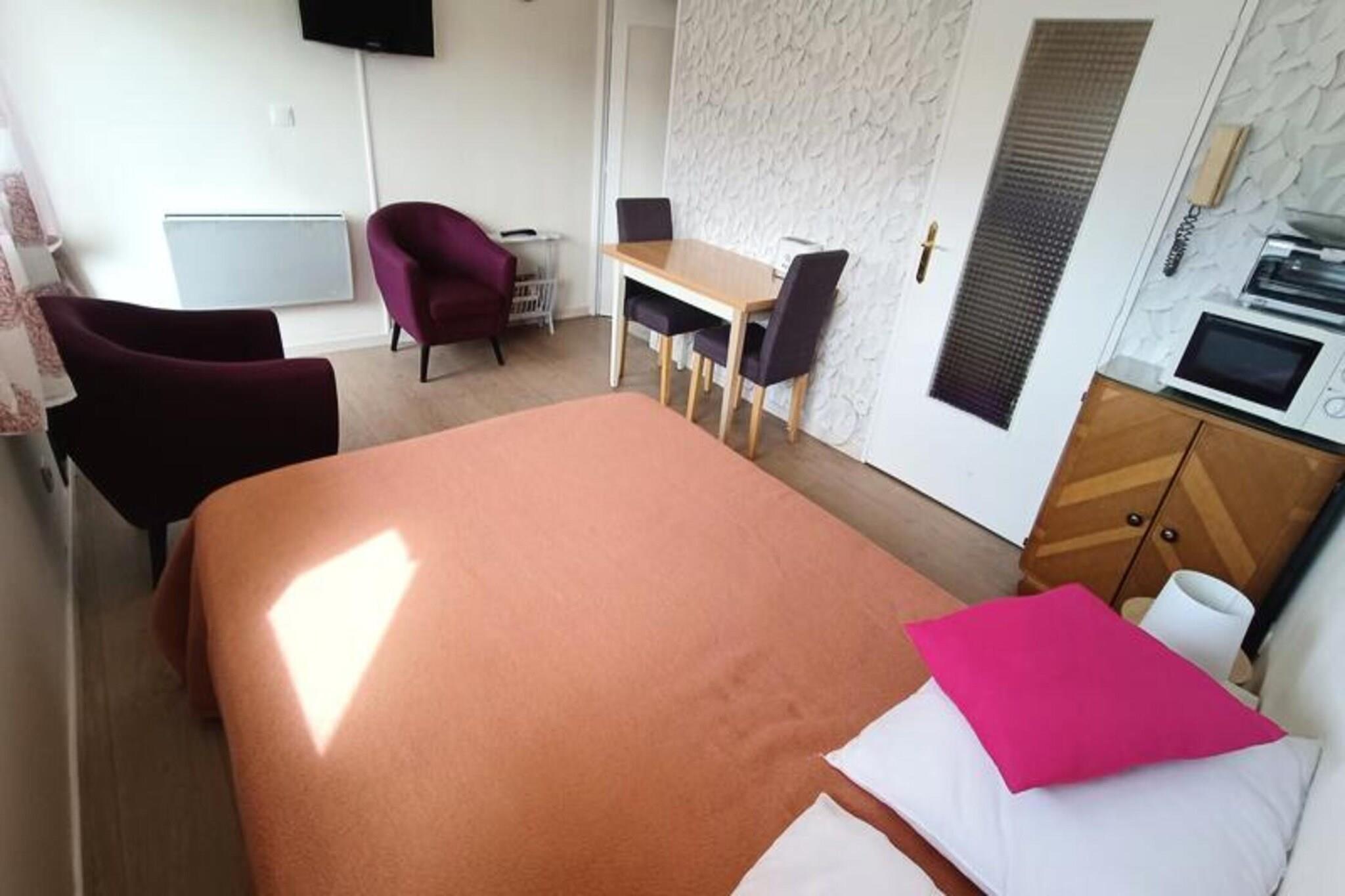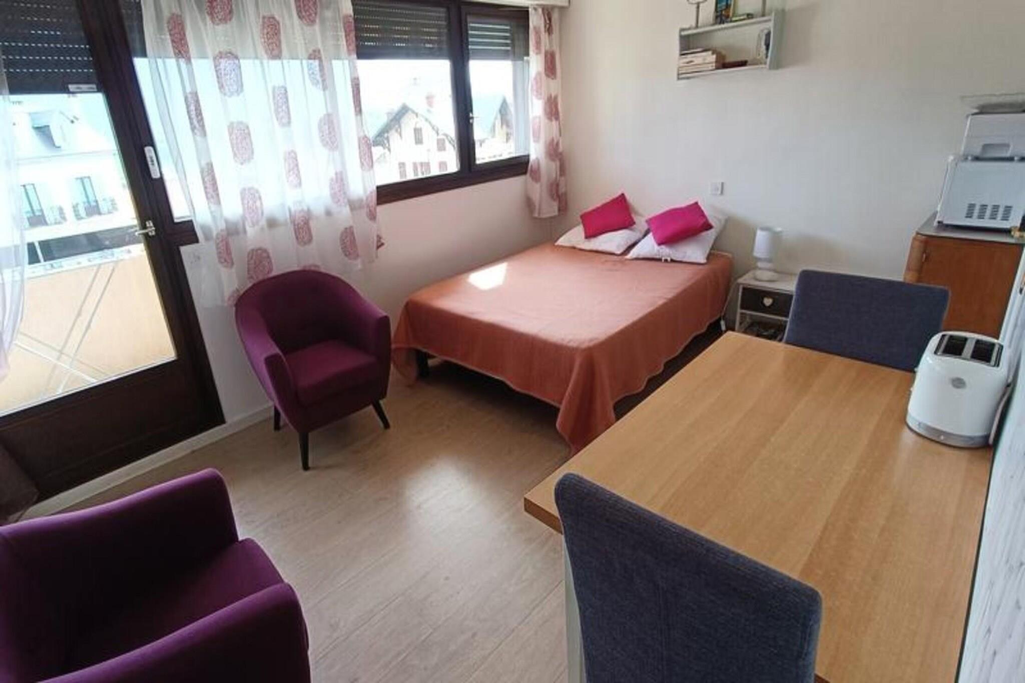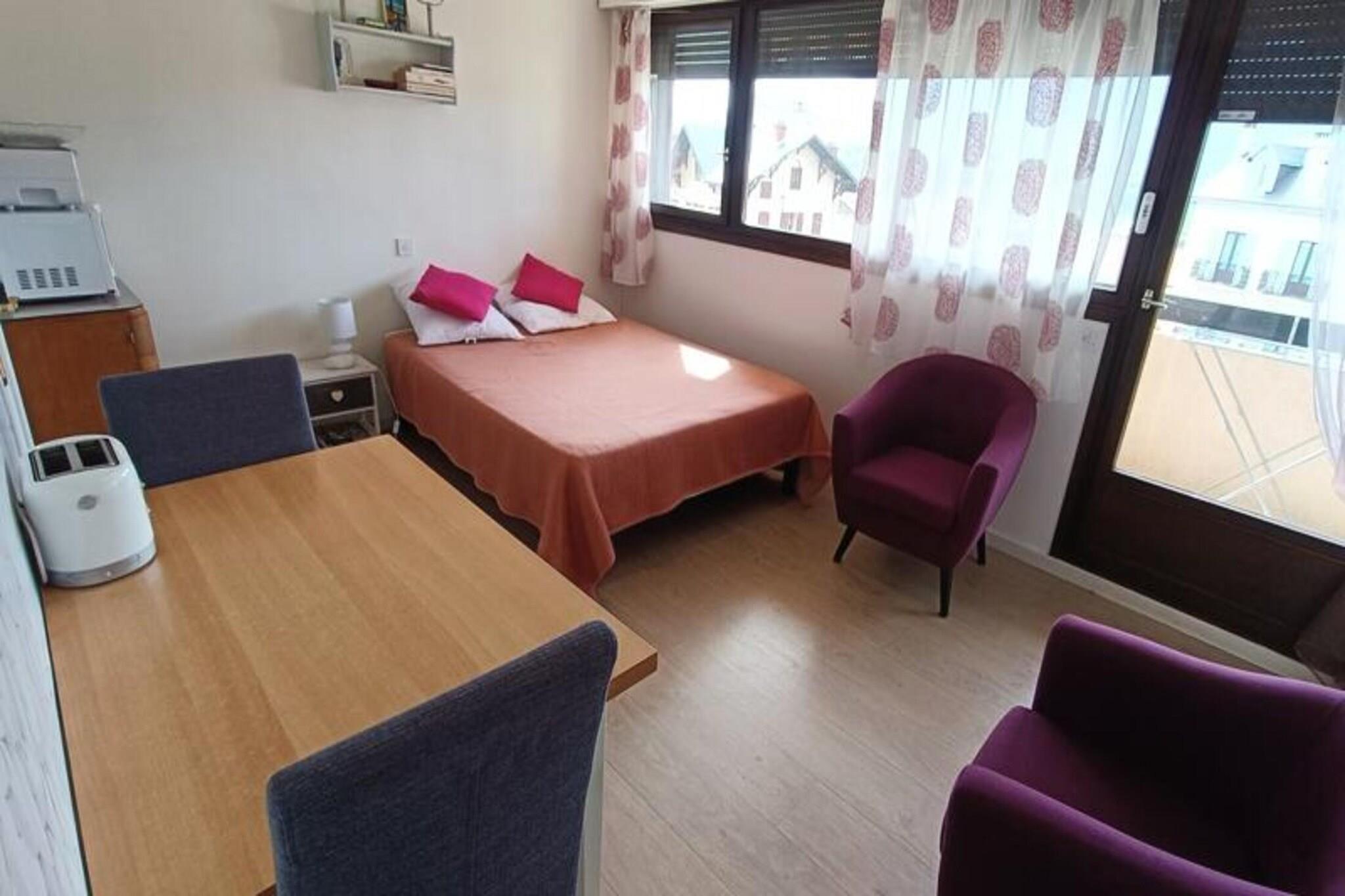 Denne dejlige studiolejlighed, ideel til 2 personer, tilbyder et behageligt ophold med en 140 cm seng, 2 lænestole og et fladskærms-tv i hovedrummet. Det har en møbleret balkon med udsigt mod vest. Lejligheden er klassificeret som 2* møbleret turistindkvartering. Kæledyr er ikke tilladt. Studiet inkluderer også et klædeskab/hylder til opbevaring og et separat toilet for ekstra bekvemmelighed. Et depositum på 305 EURO er påkrævet, med yderligere tjenester som sengetøj og rengøring til rådighed mod et ekstra gebyr. Denne lejlighed ligger kun 100 meter fra Chevalley Thermal Baths og 800 meter fra byens centrum og giver nem adgang til lokale attraktioner. Turistkontoret, kasinoet og togstationen ligger inden for gåafstand, mens Mont Revard ligger 20 km derfra. Gæsterne kan nyde det smukke omkringliggende område og udforske de nærliggende caféer, markeder og kulturelle steder på deres fritid. Tekøkkenet er udstyret med 2 elektriske kogeplader, en vask, miniovn, mikroovn, elektrisk kaffemaskine, kedel, brødrister og vigtigt køkkengrej. Badeværelset har badekar med håndvask, mens lejligheden også er udstyret med individuel elvarme, samtaleanlæg, elektriske rulleskodder og solgardiner. Parkering er forsynet med en udpeget plads på bagsiden af ??bygningen.
