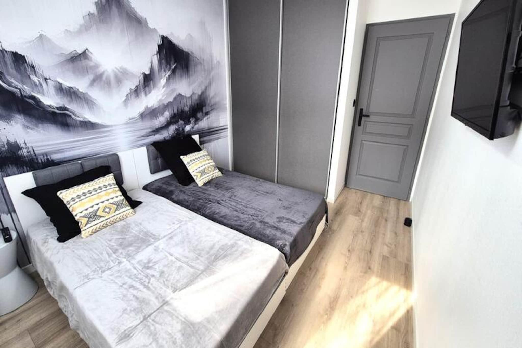 I hjertet af Aix-les-Bains inviterer Villa Lamartine dig til at opleve en raffineret livsstil i en nybygget bolig, der perfekt kombinerer moderne komfort med tidløs elegance. Beliggende i et renoveret kvarter nær byens centrum tilbyder denne prestigefyldte ejendom nem adgang til gågader, kulturelle vartegn og lokale faciliteter. Forestil dig at vågne op til det blide morgenlys, der strømmer ind gennem din østvendte balkon, klar til at udforske charmen ved denne pulserende kurby beliggende mellem bjergene og søen. \n\nDenne 4-stjernede møblerede lejlighed, der er klassificeret til op til fire gæster, kan prale af en rummelig planløsning på 56 m² designet til afslapning og bekvemmelighed. Den åbne opholdsstue har en hyggelig hjørnesofa, et fladskærms-tv og et fuldt udstyret køkken med high-end apparater, herunder opvaskemaskine, induktionskogeplade og Krups-kaffemaskine. To rolige soveværelser tilbyder afslappende tilflugtssteder, det ene med en queensize-seng og det andet med to enkeltsenge, begge suppleret med rigelig garderobeplads og loftsventilatorer. Det elegante badeværelse har bruseniche og håndklædetørrer, mens et separat toilet tilføjer ekstra praktisk funktionalitet. \n\nVilla Lamartines beliggenhed er uovertruffen – kun 400 meter fra turistkontoret, 800 meter fra togstationen og 900 meter fra Chevalleys termiske bade. Det glitrende vand i Bourget-søen ligger blot 2,5 km væk, mens Mont Revards betagende alpine udsigter venter kun 20 km fra din dørtrin. Uanset om du søger kulturel berigelse, wellnessoplevelser eller udendørs eventyr, er alt inden for rækkevidde. \n\nMed sikker adgang, elevatoradgang og en privat garageplads sikrer denne lejlighed et problemfrit ophold. Vælg Villa Lamartine for en sofistikeret ferie, der harmoniserer afslapning, udforskning og Aix-les-Bains' skønhed.